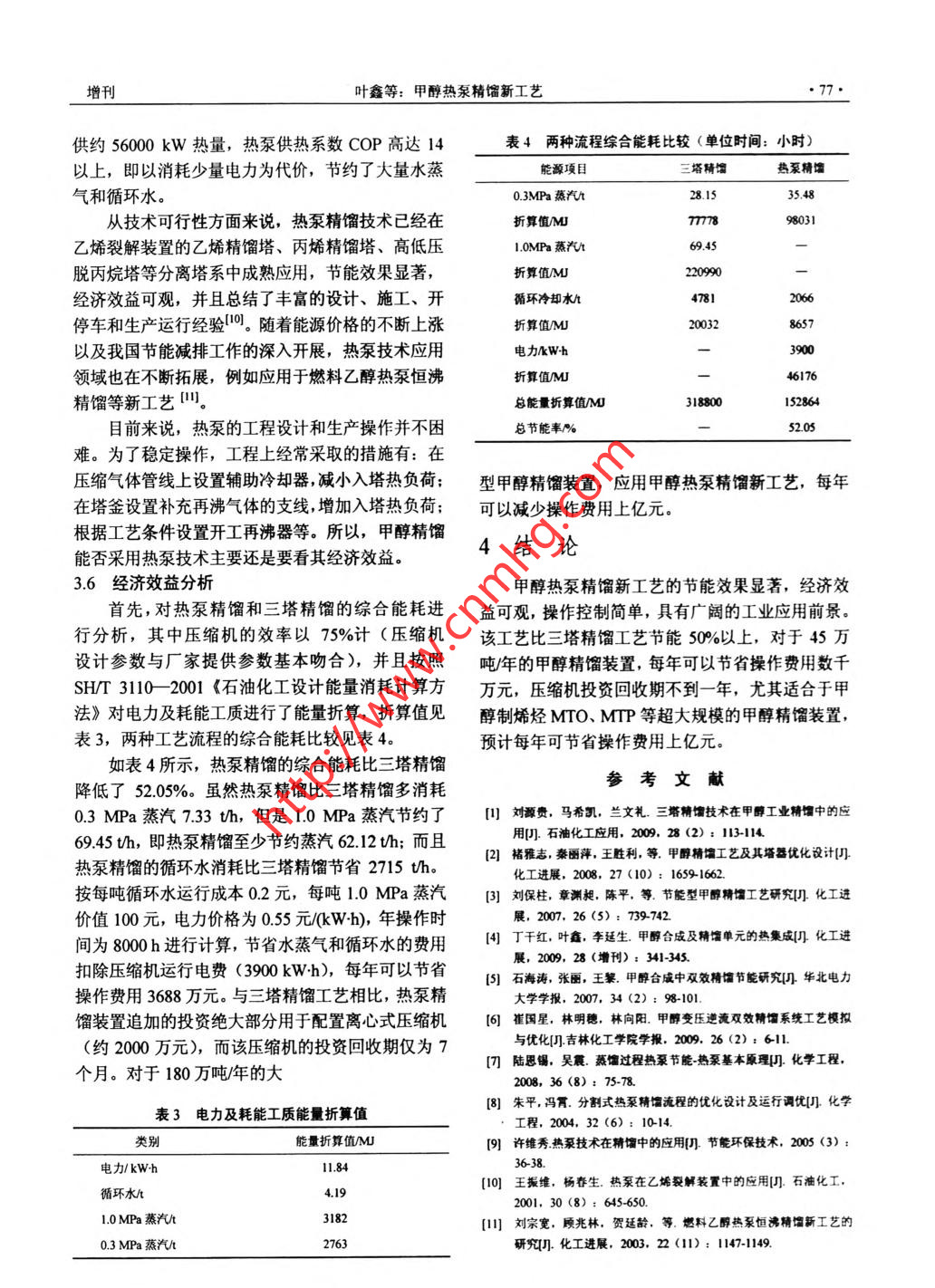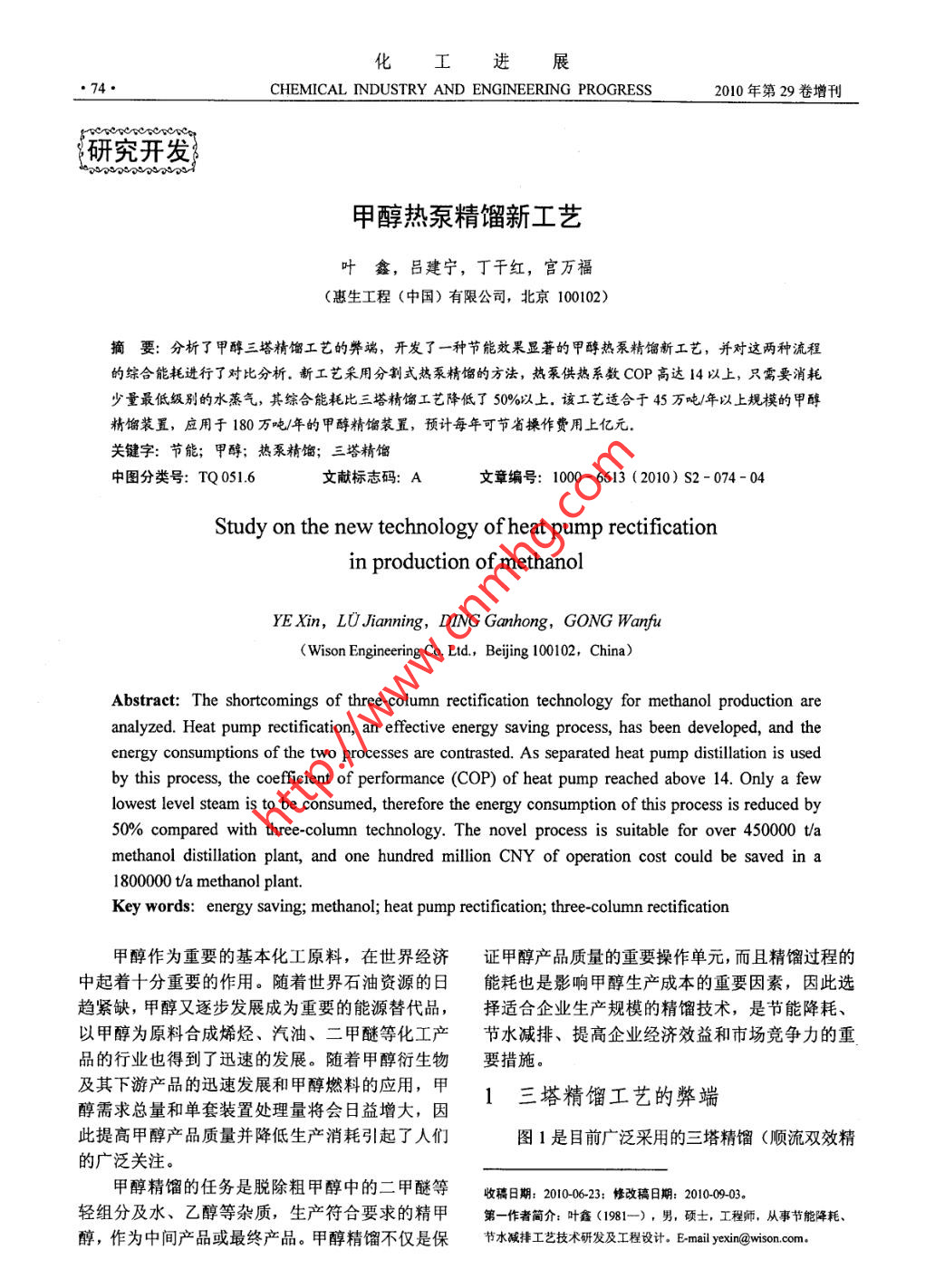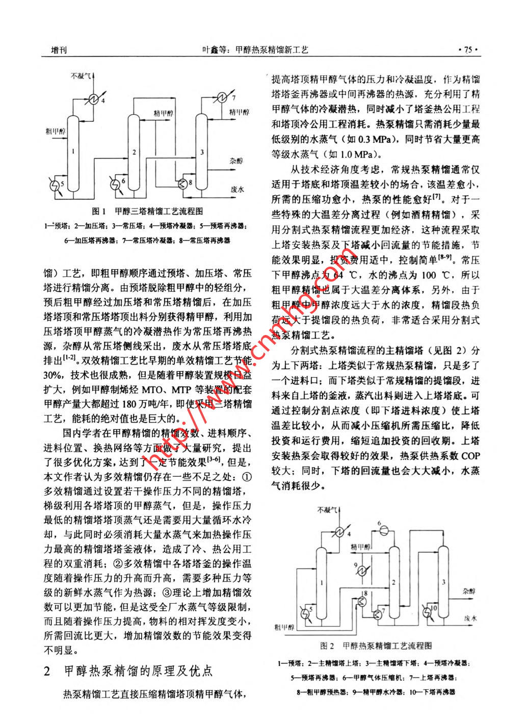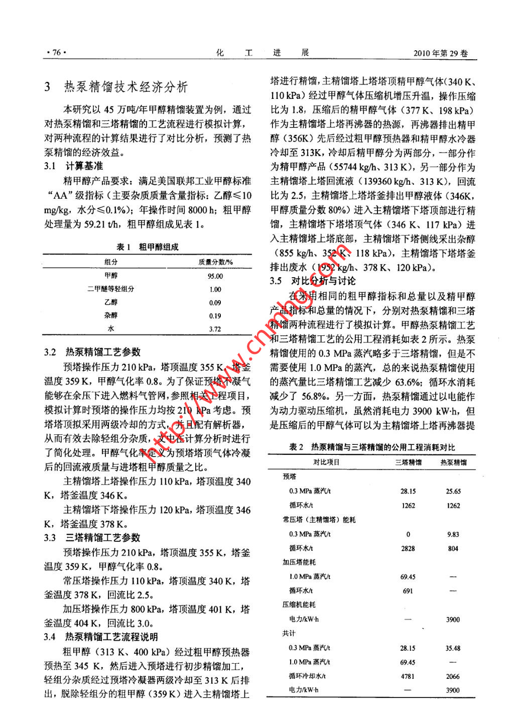 化I進(jìn)展●74.CHEMICAL INDUSTRY AND ENGINEERING PROGRESS2010年第29卷增刊研究開發(fā)甲醇熱泵精餾新工藝葉鑫, 呂建寧,丁干紅,宮萬福(惠生工程(中國)有限公司,北京100102)摘要:分析了甲醇三塔精餾工藝的弊端,開發(fā)了一種節(jié)能效果顯著的甲醇熱泵精餾新工藝,并對這兩種流程的綜合能耗進(jìn)行了對比分析.新工藝采用分割式熱泵精餾的方法,熱泵供熱系數(shù)COP高達(dá)14以上,只需要消耗少量最低級(jí)別的水蒸氣,其綜合能耗比三塔精餾工藝降低了50%以上。該工藝適合于45萬噸/年以上規(guī)模的甲醇精餾裝置,應(yīng)用于180萬噸/年的甲醇精餾裝置,預(yù)計(jì)每年可節(jié)省操作費(fèi)用上億元。關(guān)鍵字:節(jié)能;甲醇;熱泵精餾;三塔精餾中圖分類號(hào): TQ 051.6文獻(xiàn)標(biāo)志碼: A文章編號(hào): 1000- 6613 (2010) S2 -074- 04.Study on the new technology of heat pump rectificationin production of methanolYE Xin, LU Jianning, DING Ganhong, GONG Wanfiu .(Wison Engineering Co. Ltd,Beijing 100102, China)Abstract: The shortcomings of three-column rectification technology for methanol production areanalyzed. Heat pump rectification, an effective energy saving process, has been developed, and theenergy consumptions of the two processes are contrasted. As separated heat pump distillation is usedby this process, the coefficient of performance (COP) of heat pump reached above 14. Only a fewlowest level steam is to be consumed, therefore the energy consumption of this process is reduced by50% compared with three-column technology. The novel process is suitable for over 450000 t/amethanol distillation plant, and one hundred million CNY of operation cost could be saved in a1800000 t/a methanol plant.Key words: energy saving; methanol; heat pump rectification; three-column rectification甲醇作為重要的基本化工原料,在世界經(jīng)濟(jì)證甲醇產(chǎn)品質(zhì)量的重要操作單元,而且精餾過程的中起著十分重要的作用。隨著世界石油資源的日能耗也是影響甲醇生產(chǎn)成本的重要因素,因此選趨緊缺,甲醇又逐步發(fā)展成為重要的能源替代品,擇適合企業(yè)生產(chǎn)規(guī)模的精餾技術(shù),是節(jié)能降耗、以甲醇為原料合成烯烴、汽油、二甲醚等化工產(chǎn)節(jié)水減排、提高企業(yè)經(jīng)濟(jì)效益和市場競爭力的重.品的行業(yè)也得到了迅速的發(fā)展。隨著甲醇衍生物要措施。及其下游產(chǎn)品的迅速發(fā)展和甲醇燃料的應(yīng)用,甲1三塔精餾工藝的弊端醇需求總量和單套裝置處理量將會(huì)日益增大,因此提高甲醇產(chǎn)品質(zhì)量并降低生產(chǎn)消耗引起了人們圖1是目前廣泛采用的三塔精餾(順流雙效精的廣泛關(guān)注。甲醇精餾的任務(wù)是脫除粗甲醇中的二甲醚等收稿日期: 2010-06-23; 修改稿日期: 2010-09-03.輕組分及水、乙醇等雜質(zhì),生產(chǎn)符合要求的精甲第一-作者簡介:葉鑫(1981-),男,碩士,工程師,從事節(jié)能降耗、醇,作為中間產(chǎn)品或最終產(chǎn)品。甲醇精餾不僅是保節(jié)水減排工藝技術(shù)研發(fā)及工程設(shè)計(jì)。E.mail yexin@wison com.增刊葉鑫等:甲醇熱泵精餾新工藝●75.不凝氣|提高塔頂精甲醇?xì)怏w的壓力和冷凝溫度,作為精餾- 04塔塔釜再沸器或中間再沸器的熱源,充分利用了精精甲醇甲醇?xì)怏w的冷凝潛熱,同時(shí)減小了塔釜熱公用工程和塔頂冷公用工程消耗。熱泵精餾只需消耗少量最粗甲醇低級(jí)別的水蒸氣(如0.3 MPa),同時(shí)節(jié)省大量更高2|雜醇等級(jí)水蒸氣(如1.0MPa)。從技術(shù)經(jīng)濟(jì)角度考慮,常規(guī)熱泵精餾通常僅廢水適用于塔底和塔頂溫差較小的場合,該溫差愈小,所需的壓縮功愈小,熱泵的性能愈好7。對于一圖1甲醇三塔精餾工藝流程圖些特殊的大溫差分離過程(例如酒精精餾),采1-預(yù)塔: 2- 加壓塔: 3一常壓塔: 4- 預(yù)塔冷凝器: s-預(yù)塔再沸器:用分割式熱泵精餾流程更加經(jīng)濟(jì),這種流程采取6-加壓塔再沸器: 7一常壓塔冷凝器: 8常壓塔再沸器上塔安裝熱泵及下塔減小回流量的節(jié)能措施,節(jié)能效果明顯,投資費(fèi)用適中,控制簡單189。常壓餾)工藝,即粗甲醇順序通過預(yù)塔、加壓塔、常壓下甲醇沸點(diǎn)為64 C,水的沸點(diǎn)為100 C,所以塔進(jìn)行精餾分離。由預(yù)塔脫除粗甲醇中的輕組分,粗甲醇精餾也屬于大溫差分離體系,另外,由于預(yù)后粗甲醇經(jīng)過加壓塔和常壓塔精餾后,在加壓粗甲醇中甲醇濃度遠(yuǎn)大于水的濃度,精餾段熱負(fù)塔塔頂和常壓塔塔頂出料分別獲得精甲醇,利用加荷遠(yuǎn)大于提餾段的熱負(fù)荷,非常適合采用分割式壓塔塔頂甲醇蒸氣的冷凝潛熱作為常壓塔再沸熱熱泵精餾工藝。源,雜醇從常壓塔側(cè)線采出,廢水從常壓塔塔底分割式熱泵精餾流程的主精餾塔(見圖2)分排出-2。雙效精餾工藝比早期的單效精餾工藝節(jié)能為上下兩塔: . 上塔類似于常規(guī)熱泵精餾,只是多了30%,技術(shù)也很成熟,但是隨著甲醇裝置規(guī)模日益-一個(gè)進(jìn)料口;而下塔類似于常規(guī)精餾的提餾段,進(jìn)擴(kuò)大,例如甲醇制烯烴MTO、MTP等裝置的配套料來自上塔的釜液,蒸汽出料則進(jìn)入上塔塔底??杉状籍a(chǎn)量大都超過180萬噸/年,即使采用三塔精餾通過控制分割點(diǎn)濃度(即下塔進(jìn)料濃度)使上塔工藝,能耗的絕對值也是巨大的。國內(nèi)學(xué)者在甲醇精餾的精餾效數(shù)、進(jìn)料順序、溫差比較小,從而減