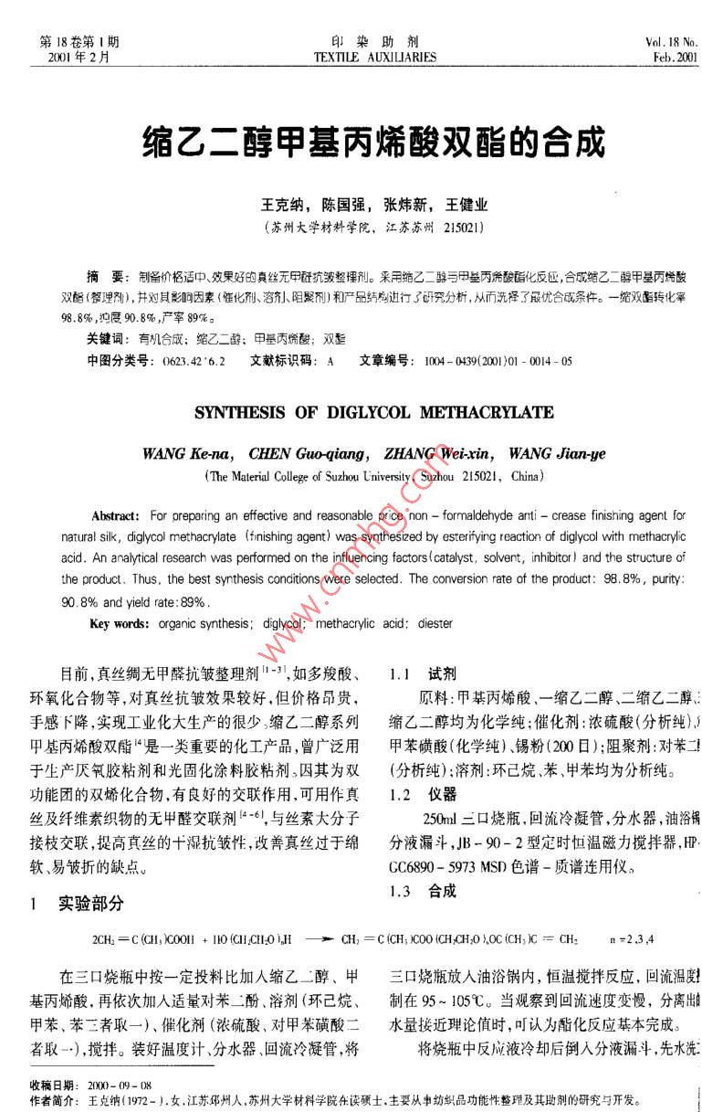 笫18卷笫1期Vol 18 No200年2月TEXTILE AUXILIARIEFeb 2001縮乙二醇甲基丙烯酸雙酯的合成王克納,陳國(guó)強(qiáng),張煒新,王健業(yè)(蘇州大學(xué)材料學(xué)院,江蘇蘇州215021)摘要:制價(jià)格適中效果好的真絲無(wú)甲酐抗皺埋劑。采閏縮乙二與壘丙憑酸酯化反匝,合成乙二酵甲墨丙烯酸雙釃(理劑),并彩因素{催化劑、溶劑陽(yáng)聚劑)和嚴(yán)品粒進(jìn)行了究分析,從而洗擇了最優(yōu)合成條。一縮雙酯轉(zhuǎn)化率98.8%,度90.8%,產(chǎn)宰89%。關(guān)鍵詞:有機(jī)合成;縮乙二醉;甲基丙烯酸;雙中圖分類(lèi)號(hào):0623.42“6.2文就標(biāo)識(shí)碼:A文章編號(hào):104-0439(200101-014-05SYNTHESIS OF DIGLYCOL METHACRYLATEWANG Ke-na, CHEN Guo-qiang, ZHANG Wei-xin, WANG Jian-ye(The Material College of Suzhou University, Suzhou 215021, China)Abstract: For preparing an effective and reasonable pr ice non-formaldehyde anti-crease finishing agent fornatural silk, diglycol methacrylate (finishing agent) was synthesized by esterifying reaction of diglycol with methacrylicthe product. Thus, the best synthesis conditions were selected. The conversion rate of the product: 98. 8%, purity90. 8% and yield rate: 89%Key words: organic synthesis; diglycol; methacrylic acid: diester目前,真絲綢無(wú)甲醛抗皺整理劑-3,如多羧酸1試劑環(huán)氧化合物等,對(duì)真絲抗皺效果較好,但價(jià)格昂貴原料:甲基丙烯酸、一縮乙二醇、二縮乙二醇手感下降,實(shí)現(xiàn)工業(yè)化大生產(chǎn)的很少縮乙二醇系列縮乙二醇均為化學(xué)純催化劑:濃硫酸(分析純甲基丙烯酸雙酯“是一類(lèi)重要的化工產(chǎn)品,曾廣泛用甲苯磺酸(化學(xué)純)、錫粉(200日);阻聚劑:對(duì)苯_于生產(chǎn)厭氧膠粘劑和光固化涂料膠粘劑。因其為雙(分析純):溶劑:環(huán)己烷苯、甲苯均為分析純。功能團(tuán)的雙烯化合物,有良好的交聯(lián)作用,可用作真1.2儀器絲及纖維素織物的無(wú)甲醛交聯(lián)劑-6,與絲素大分子250ml三口燒瓶,回流冷凝管,分水器,油浴鍋接枝交聯(lián),提高真絲的十濕抗皺性,改善真絲過(guò)于綿分液漏斗,JB-90-2型定時(shí)恒溫磁力攪拌器F軟、易皺折的缺點(diǎn)CC6890-5973MSD色譜-質(zhì)譜連用儀。1實(shí)驗(yàn)部分1.3合成2cH:=C(CH, lCOoll II0(CI CHIO ,H ->CH,=C(CH: )C00( 0 ),OC(CH,)C CH: n=2.34在三口燒瓶中按一定投料比加入縮乙二醇、甲三口燒瓶放入油浴鍋內(nèi),恒溫?cái)嚢璺磻?yīng),回流溫度基丙烯酸,再依次加入適量對(duì)苯二酚、溶劑(環(huán)己烷、制在95~105℃。當(dāng)觀察到回流速度變慢,分離出甲苯、苯三者取一)、催化劑(濃硫酸、對(duì)甲苯磺酸二水量接近理論值時(shí),叮認(rèn)為酯化反應(yīng)基本完成。者取-),攪拌。裝好溫度計(jì)、分水器、回流冷凝管,將將燒瓶中反應(yīng)液冷卻后倒入分液漏斗,先水洗收稿日期:20)-09-0作者筒介:王克納(1叨72-)女,江蘇邱州人,蘇州大學(xué)材料學(xué)院在讀願(yuàn)士,主要從事紡織品功能性整理及其助劑的研究與開(kāi)發(fā)。王克納等縮乙醇甲基丙烯酸雙酷的合成次,再用10%NaOH溶液洗滌以除去阻聚劑,并進(jìn)步中和過(guò)量酸,洗至反應(yīng)液呈尤色,p>10后再水洗2結(jié)果與討論至中性。最后減壓蒸餾除去溶劑,得到無(wú)色透明或淡2.1一縮乙二醇甲基丙烯酸雙酯的合成黃色液狀產(chǎn)品2.1.1投料比的選擇表1投料比對(duì)一編雙酯轉(zhuǎn)化率的影響屮基丙烯酸:縮乙二醇甲基丙烯酸縮乙二醇反成時(shí)間理論出水量實(shí)際出水敏轉(zhuǎn)化率摩爾比2.2:101.2750,1252,6:13.54.54.5汴:反中溶劑環(huán)已烷6m,催化劑濃硫酸147g,阻聚劑對(duì)苯二酚0.5g反應(yīng)中酸和醇摩爾比的理論投入量為2:1,酯烈,且有一定的脫水作用,一縮乙二醇先縮合成二縮化反應(yīng)中·方適當(dāng)過(guò)量有利∫反應(yīng)的進(jìn)行,考慮到價(jià)乙二醇再進(jìn)行酯化反應(yīng)而用對(duì)甲苯磺酸作催化劑的格等因索,采用甲基內(nèi)烯酸過(guò)量。若酸過(guò)量太多,不產(chǎn)品純度較好,達(dá)到90.8%色譜分析見(jiàn)圖1、圖2。僅造成原料的浪費(fèi),而且在后道L序堿洗時(shí)消耗大量的堿,對(duì)產(chǎn)品提純帶來(lái)困難。因此摩爾比初步定為22-26:1實(shí)驗(yàn)結(jié)果見(jiàn)表1當(dāng)摩爾比為22:1時(shí),反應(yīng)不完余并用速度較慢:摩爾比為24:1時(shí)反應(yīng)較好;摩爾比為26:1時(shí)反應(yīng)快,反應(yīng)完全,但浪費(fèi)原料,給后道提純T序增加負(fù)擔(dān)。選用摩爾比為24:1較為合適。2.1.2催化劑種類(lèi)的選擇在酸和醇摩爾比2.4:1、環(huán)已烷60nl、對(duì)苯二酚0.5g條件下,分別用相同量(約為酸的5%)的對(duì)甲苯磺酸與濃硫酸催化,轉(zhuǎn)化率均達(dá)到98.8%但濃硫酸5.∞5.506,∞6.507,00-7、8.∞)85腐蝕性較強(qiáng),對(duì)設(shè)備不利且操作中危險(xiǎn)性大,故選用2濃硫酸催化合成的一雙酯色譜圖對(duì)甲苯磺酸作催化劑。實(shí)驗(yàn)屮中曾根據(jù)文獻(xiàn)采用200目錫粉作為固體催化劑但由于反應(yīng)所需溫度較高,達(dá)120℃左右,反應(yīng)過(guò)程不易控制,在燒瓶壁上有大量棕褐色高聚物沉淀析出,產(chǎn)率較低,故不宜釆用。2.1.3溶劑的選擇實(shí)驗(yàn)屮溶劑主要是與酯化反應(yīng)生成的水形成共沸,使沸點(diǎn)降低,回流時(shí)通過(guò)分水器將水分出,有利于反應(yīng)向酯化方向進(jìn)行,使反應(yīng)完全。2Es 20's表2溶劑對(duì)一縮雙酯轉(zhuǎn