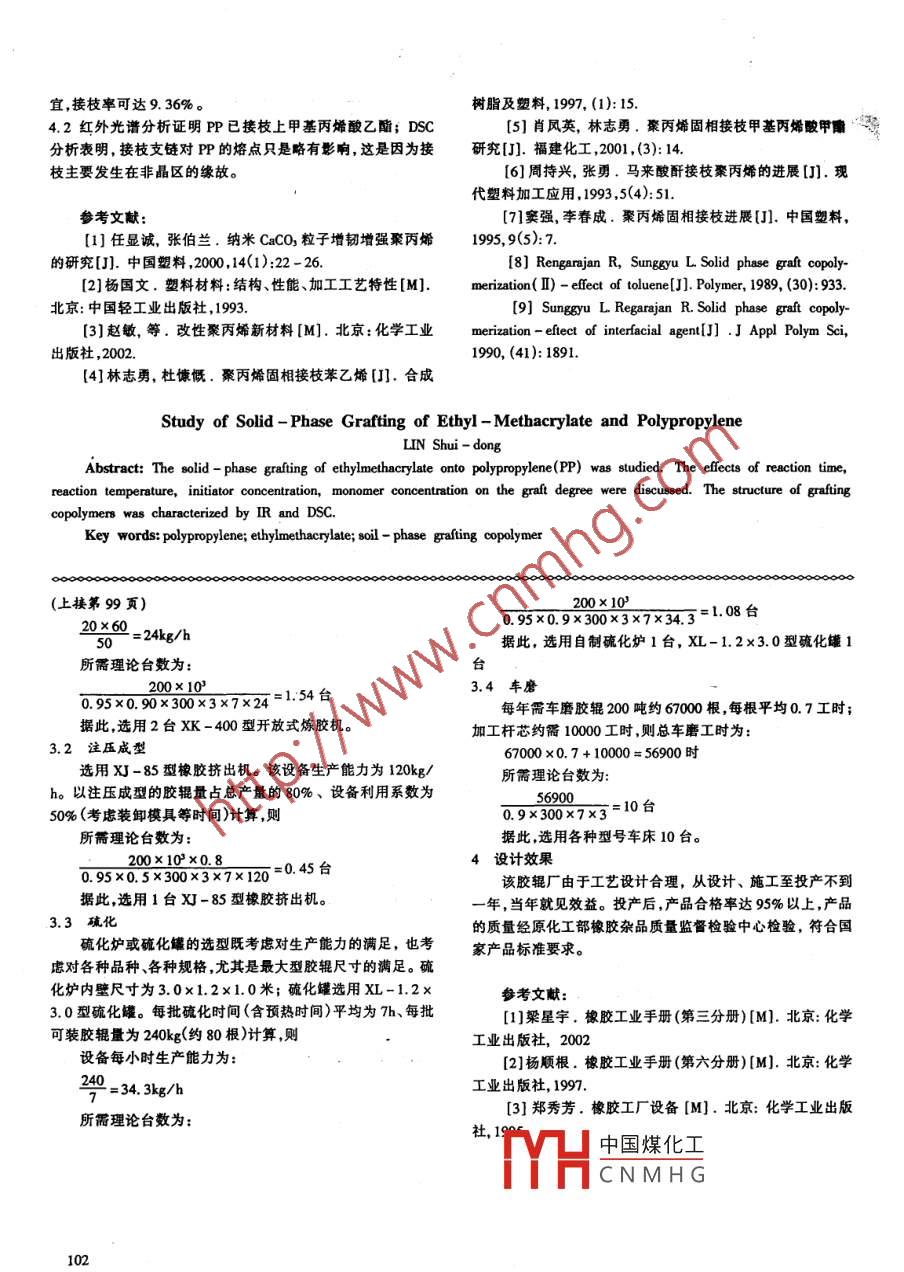 第23卷第3期龍巖學(xué)院學(xué)報2005年6月Vol 23 No. 3Joumal of Longyan UniversityJune 2005聚丙烯固相接枝甲基丙烯酸乙酯改性研究林水東(龍巖學(xué)院化學(xué)與材料工程系福建龍巖364000摘要:用固相接枝法制備聚丙烯接枝甲基丙烯酸乙酯共聚物,分析討論反應(yīng)時間、溫度、BPO濃度、單體濃度等條件對接枝率的影響,并用紅外光譜、差式掃描量熱儀對產(chǎn)物的結(jié)構(gòu)進(jìn)行表征。關(guān)鍵詞:甲基丙烯酸乙酯;聚丙烯;固相接枝中圖分類號:T0Q316.343文獻(xiàn)標(biāo)識碼:A文章編號:1672-044X(2005)03-0100-03前言率G:聚丙烯(PP)因比重小、價格低、易加工成型,耐應(yīng)力、耐WPP-I-EMA100%開裂性和耐磨性等性能優(yōu)異,而得到廣泛的應(yīng)用,是五大通用塑料之一。但它是非極性的結(jié)晶性高分子聚合物,染色性、式中,WP為PP的質(zhì)量。枯接性、抗靜電性、親水性、與其它極性聚合物和無機(jī)填料等24接枝物結(jié)構(gòu)分析的相容性、親和性都很差,進(jìn)一步的推廣應(yīng)用受到限制口-3。(1)紅外光譜法:經(jīng)丙酮抽提過的接枝物,采用熔融壓膜通過接枝引人極性基團(tuán),可增強(qiáng)PP的極性,從而改善上述性法制備薄膜,在PE983紅外光譜儀上進(jìn)行測試。(2)差示掃描能之不足。常用的接枝方法有:溶液接枝、熔融接枝、輻射接量熱分析:采用TA公司MDSC儀測試,先在M保護(hù)下以枝光引發(fā)接枝和固相接枝M。固相接枝是在上世紀(jì)80年0℃/min加熱到230℃并恒溫5min消除熱歷史再以10℃/代末發(fā)展起來的新方法,接枝反應(yīng)一般發(fā)生在聚烯烴的結(jié)晶mn降溫至室溫,最后以10℃/mim升溫到230℃并記錄結(jié)缺陷、結(jié)晶面及無定形域,是一種非均相化學(xué)接枝的局部果。改性方法,該法具有工藝條件要求不高,反應(yīng)在低溫70℃3討論分析0℃下進(jìn)行,聚合物降解少,使用溶劑少,且易被聚合物表3.1反應(yīng)時間對接技率的影響面所吸收、不用回收,設(shè)備簡單等優(yōu)點。本文用甲基丙烯酸乙在反應(yīng)溫度為80℃,EMA/PP=0.20,BPO/PP=1.0%酯(EMA)作單體對聚丙烯進(jìn)行固相接枝,尋找適宜的反應(yīng)溫的條件下進(jìn)行實驗度、反應(yīng)時間、單體濃度、引發(fā)劑濃度,并用紅外光譜、差式掃表1不同反應(yīng)時間下的接枝率量熱法表征接枝物的結(jié)構(gòu)。反應(yīng)時間(h)2實驗方法G%7.468.562.1實驗儀器藥品(1)P,粒狀(28-55目),巴陵石化公司產(chǎn)品;過氧化苯甲酰(BPo),化學(xué)純,上海中利化工,經(jīng)氯仿、甲醇重結(jié)晶后使用;甲基丙烯酸乙酯(EMA),化學(xué)純,經(jīng)減壓蒸餾后使用;二甲苯,分析純,廣東汕頭市西隴化工;丙酮,分析純,廣東汕頭市西隴化工。(2)KQ-100超聲波清洗機(jī)(江蘇昆山超聲有限公司);501型越級恒溫水浴鍋(上海試驗儀器廠);45t壓力成型機(jī)(上海第一橡膠儀器廠)。2.2聚丙烯固相接枝甲基丙烯酸乙酯的制備在錐形瓶中加人5000g的PP、2m二甲苯及適量的E圖1反應(yīng)時間對接枝率的影響MA和BPO,繼用帶通氮用橡膠管的雙孔塞塞緊瓶口,室溫下由表1和圖1可知,接枝率隨時間的延長而增大;但在通氮氣5min,夾緊橡皮管后超聲波處理60mn,再移入已升到反應(yīng)4h后接枝率增大趨勢減弱,所以4h是較適宜的反應(yīng)時相應(yīng)溫度的恒溫水浴中,反應(yīng)到規(guī)定時間,得接枝粗產(chǎn)物。2.3接枝率的測定接枝物用丙酮在索氏抽提器中抽提24h至恒重以除去dha3.2中國煤化工CNMHG0.20,B0/PP=1.0%均聚物烘干后得接技物稱重得wx,按下式計算接枝的條件下進(jìn)行實驗收稿日期:2004-10-25表2不同反應(yīng)溫度下的接枝率EMAzpp0.10.15"0:200.2反應(yīng)溫度(℃)703.116.737.467.72G%6.657.007.467.31峰nW*neT圖4單體用量對接枝率的影響圖2反應(yīng)溫度對接枝率的影響由表4和圖4可知,接枝率隨單體濃度的升高呈上升狀由表2和圖2可知,隨反應(yīng)溫度的升高,PP接枝率逐漸態(tài)。因單體濃度升高,滲透到PP中的單體也愈多,因此接枝上升,但80℃后卻略有下降。在自由基反應(yīng)中,反應(yīng)溫度對率就高。當(dāng)單體/PP大于0.15后,接枝率升高幅度減弱,因接枝率的影響取決于溫度對引發(fā)劑分解速度、對單體接枝速受到PP粒徑的影響。合適的EMA/PP質(zhì)量比為0.20。度以及對單體自聚速度的影響。反應(yīng)溫度低,引發(fā)劑分解速3.5接枝物結(jié)構(gòu)的分析度慢,反應(yīng)體系中自由基濃度低,則接枝率低;但反應(yīng)溫度高于80℃后,則因單體的自聚速度過快,導(dǎo)致接枝率反而有所下降。所以,合適的接枝反應(yīng)溫度為80℃。3.3BPo用量對接枝率的影響在反應(yīng)溫度為80℃,時間為4h,EMA/PP=0.20的條件下進(jìn)行實驗表3BPO用量不同的接技率BPO/PP(%)0.60.81.026.479.367.465.52圖5紅外光譜圖5為紅外光譜分析圖。由圖中對比可看出,接枝后的PP-g-EMA(接枝率為9.36%)聚合物(b)在波數(shù)為1725cm處出現(xiàn)很強(qiáng)的羰基特征吸收峰,這是由聚丙烯甲基丙烯酸乙酯接枝鏈所帶的羰基引起的。未接枝的聚丙烯(a)在1725cm-1只有很弱的吸收峰,這可能是所采用的聚丙烯已有一定程度的氧化所致。由此可知經(jīng)過固相接枝反應(yīng),確實可得到PP-g-EMA接枝產(chǎn)物。BPO(9)3.6DSC分析圖3BPO用量對接枝率的影響表5接枝率與熔點的關(guān)系由表3和圖3可知,隨BPO濃度的增大,接枝率上升;但05.469.36BPO/PP(質(zhì)量比)大于0.8%時,接枝率反而下降。因為BPoT