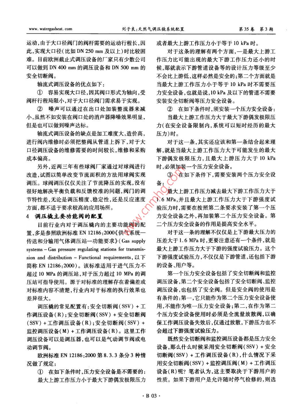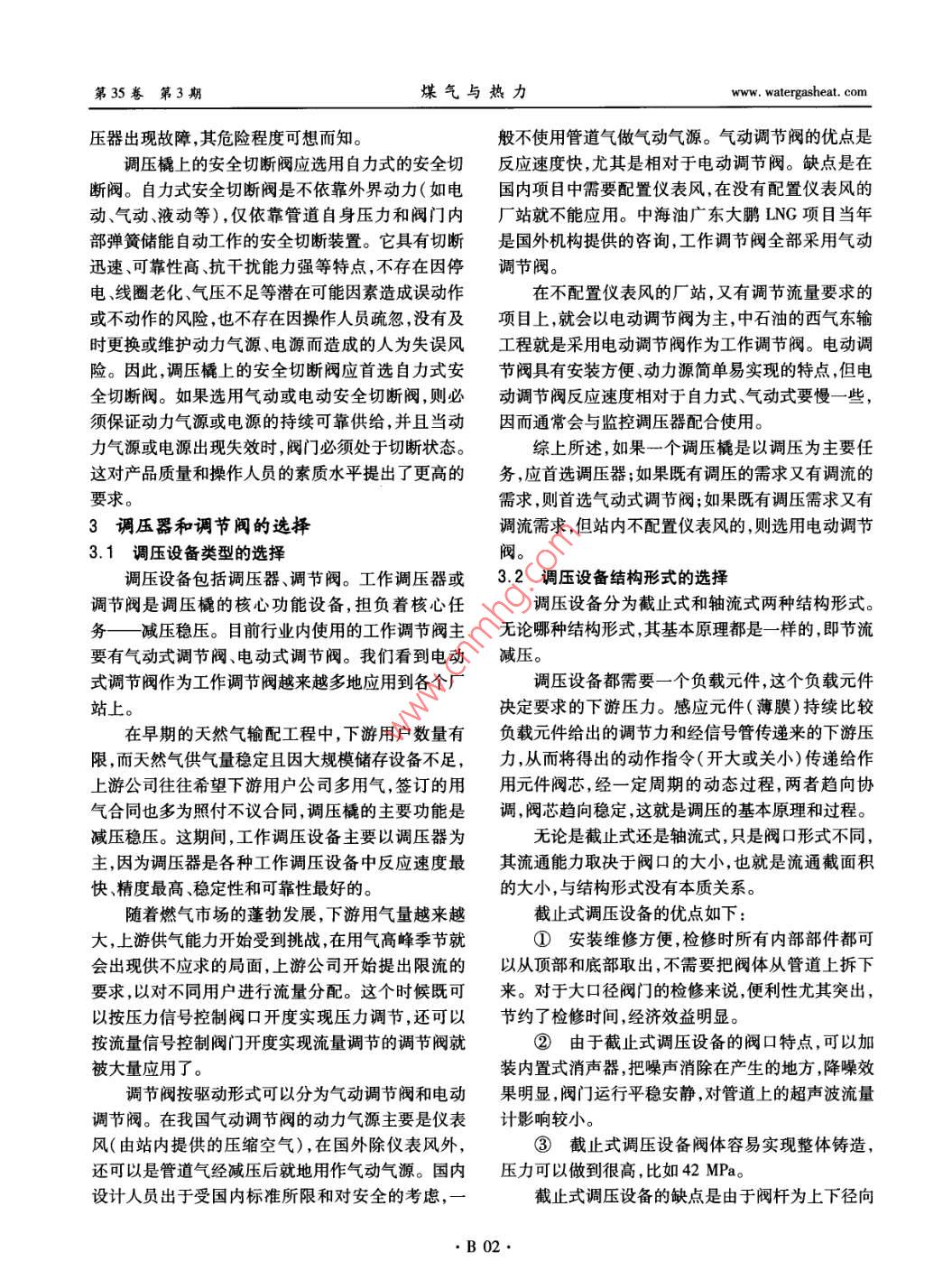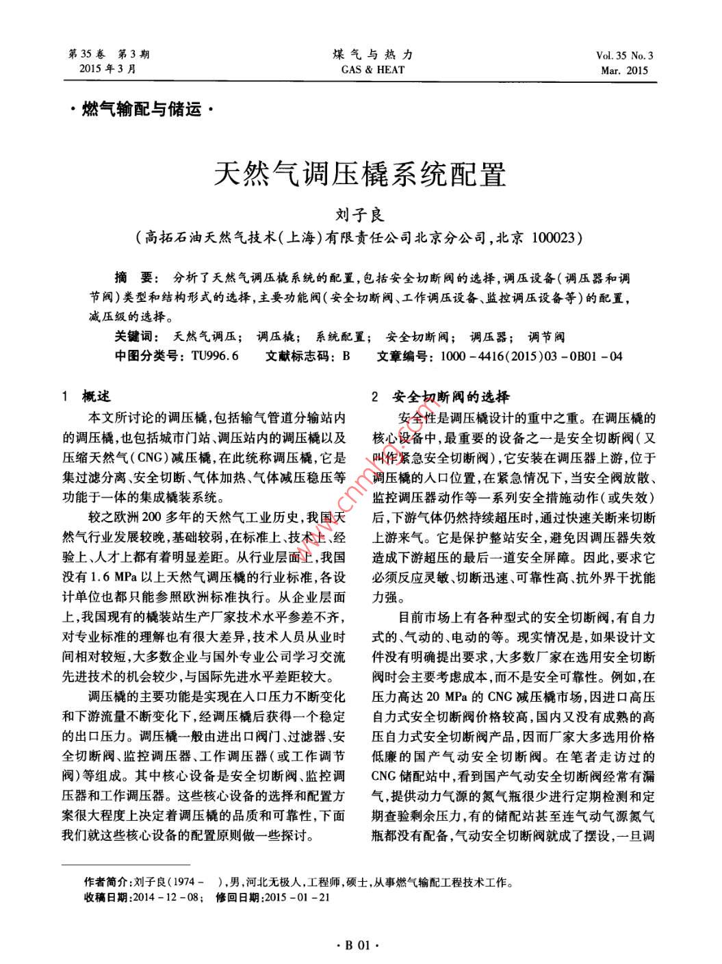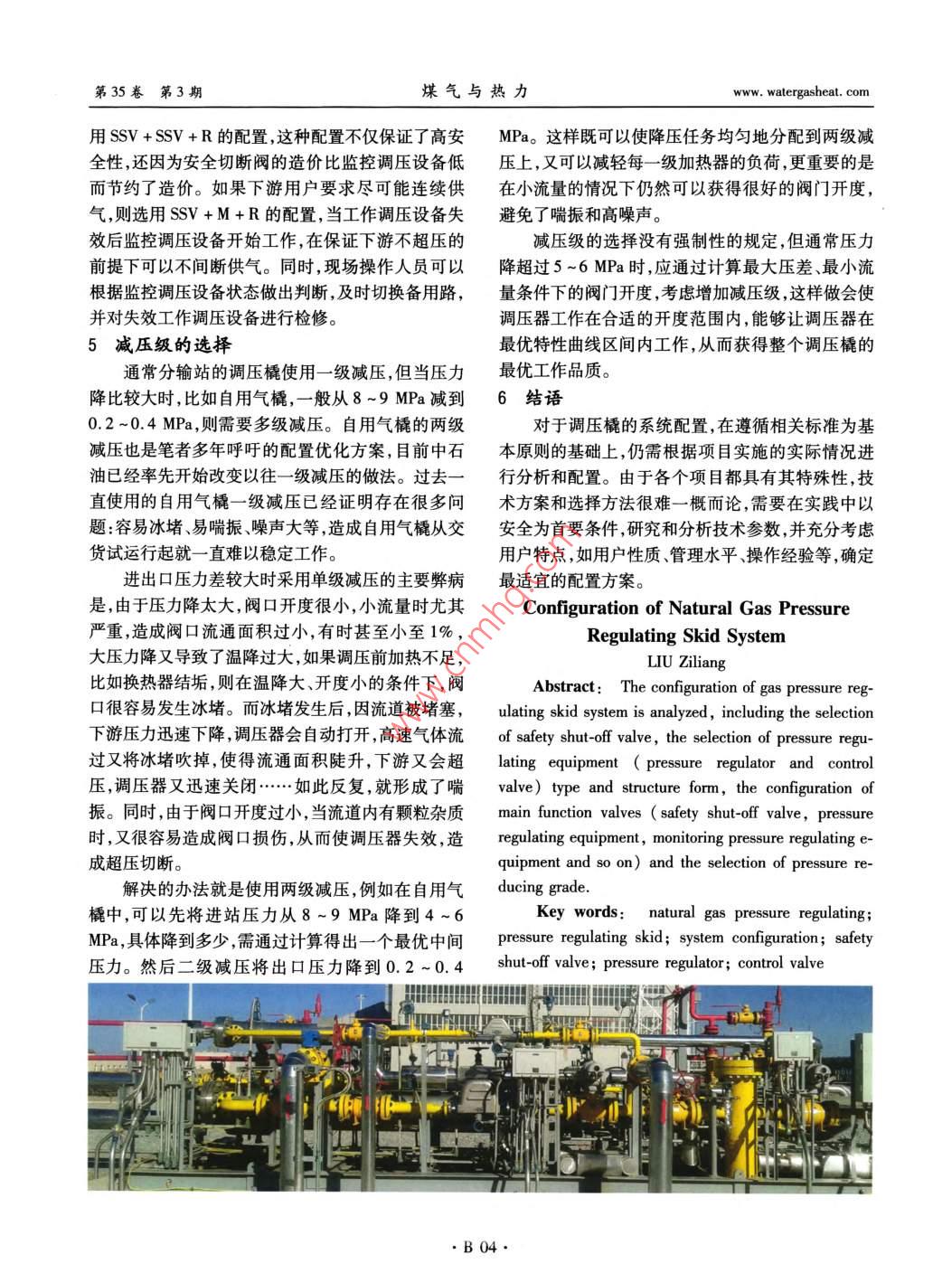第35卷第3期煤氣與熱力Vol 35 No. 32015年3月GAs heatMar.2015·燃?xì)廨斉渑c儲(chǔ)運(yùn)天然氣調(diào)壓橇系統(tǒng)配置劉子良(高拓石油天然氣技術(shù)(上海)有限責(zé)任公司北京分公司,北京100023)摘要:分析了天然氣調(diào)壓橇系統(tǒng)的配置,包括安全切斷閥的選擇,調(diào)壓設(shè)備(調(diào)壓器和調(diào)節(jié)閥)類型和結(jié)構(gòu)形式的選擇,主要功能閥(安全切斷閥、工作調(diào)壓設(shè)備、監(jiān)控調(diào)壓設(shè)備等)的配置減壓級(jí)的選擇。關(guān)鍵詞:天然氣調(diào)壓;調(diào)壓橇;系統(tǒng)配置;安全切斷閥;調(diào)壓器;調(diào)節(jié)閥中圖分類號(hào):TU996.6文獻(xiàn)標(biāo)志碼:B文章編號(hào):100-4416(2015)03-0B01-04概述2安全切斷閥的選擇本文所討論的調(diào)壓橇,包括輸氣管道分輸站內(nèi)安全性是調(diào)壓橇設(shè)計(jì)的重中之重。在調(diào)壓橇的的調(diào)壓橇,也包括城市門站、調(diào)壓站內(nèi)的調(diào)壓橇以及核心設(shè)備中,最重要的設(shè)備之一是安全切斷閥(又壓縮天然氣(CNG)減壓橇,在此統(tǒng)稱調(diào)壓橇,它是叫作緊急安全切斷閥),它安裝在調(diào)壓器上游,位于集過濾分離、安全切斷、氣體加熱、氣體減壓穩(wěn)壓等調(diào)壓橇的入口位置,在緊急情況下,當(dāng)安全閥放散、功能于一體的集成橇裝系統(tǒng)。監(jiān)控調(diào)壓器動(dòng)作等一系列安全措施動(dòng)作(或失效)較之歐洲200多年的天然氣工業(yè)歷史,我國(guó)天后,下游氣體仍然持續(xù)超壓時(shí),通過快速關(guān)斷來切斷然氣行業(yè)發(fā)展較晚基礎(chǔ)較弱,在標(biāo)準(zhǔn)上、技術(shù)上、經(jīng)上游來氣。它是保護(hù)整站安全,避免因調(diào)壓器失效驗(yàn)上、人才上都有著明顯差距。從行業(yè)層面上,我國(guó)造成下游超壓的最后一道安全屏障。因此,要求它沒有1.6MPa以上天然氣調(diào)壓橇的行業(yè)標(biāo)準(zhǔn),各設(shè)必須反應(yīng)靈敏、切斷迅速、可靠性高、抗外界干擾能計(jì)單位也都只能參照歐洲標(biāo)準(zhǔn)執(zhí)行。從企業(yè)層面力強(qiáng)。上,我國(guó)現(xiàn)有的橇裝站生產(chǎn)廠家技術(shù)水平參差不齊,目前市場(chǎng)上有各種型式的安全切斷閥,有自力對(duì)專業(yè)標(biāo)準(zhǔn)的理解也有很大差異,技術(shù)人員從業(yè)時(shí)式的、氣動(dòng)的、電動(dòng)的等。現(xiàn)實(shí)情況是,如果設(shè)計(jì)文間相對(duì)較短,大多數(shù)企業(yè)與國(guó)外專業(yè)公司學(xué)習(xí)交流件沒有明確提出要求,大多數(shù)廠家在選用安全切斷先進(jìn)技術(shù)的機(jī)會(huì)較少,與國(guó)際先進(jìn)水平差距較大。閥時(shí)會(huì)主要考慮成本,而不是安全可靠性。例如,在調(diào)壓橇的主要功能是實(shí)現(xiàn)在人口壓力不斷變化壓力高達(dá)20MPa的CNG減壓橇市場(chǎng),因進(jìn)口高壓和下游流量不斷變化下,經(jīng)調(diào)壓橇后獲得一個(gè)穩(wěn)定自力式安全切斷閥價(jià)格較高,國(guó)內(nèi)又沒有成熟的高的出口壓力。調(diào)壓橇一般由進(jìn)出口閥門、過濾器、安壓自力式安全切斷閥產(chǎn)品,因而廠家大多選用價(jià)格全切斷閥、監(jiān)控調(diào)壓器、工作調(diào)壓器(或工作調(diào)節(jié)低廉的國(guó)產(chǎn)氣動(dòng)安全切斷閥。在筆者走訪過的閥)等組成。其中核心設(shè)備是安全切斷閥、監(jiān)控調(diào)CNG儲(chǔ)配站中,看到國(guó)產(chǎn)氣動(dòng)安全切斷閥經(jīng)常有漏壓器和工作調(diào)壓器。這些核心設(shè)備的選擇和配置方氣,提供動(dòng)力氣源的氮?dú)馄亢苌龠M(jìn)行定期檢測(cè)和定案很大程度上決定著調(diào)壓橇的品質(zhì)和可靠性,下面期查驗(yàn)剩余壓力,有的儲(chǔ)配站甚至連氣動(dòng)氣源氮?dú)馕覀兙瓦@些核心設(shè)備的配置原則做一些探討。瓶都沒有配備氣動(dòng)安全切斷閥就成了擺設(shè),一旦調(diào)作者簡(jiǎn)介:劉子良(1974-),男,河北無極人,工程師,碩士,從事燃?xì)廨斉涔こ碳夹g(shù)工作。收稿日期:2014-12-08;修回日期:2015-01-21B01第35卷第3期煤氣與熱力www.watergasheat.com壓器出現(xiàn)故障,其危險(xiǎn)程度可想而知。般不使用管道氣做氣動(dòng)氣源。氣動(dòng)調(diào)節(jié)閥的優(yōu)點(diǎn)是調(diào)壓橇上的安全切斷閥應(yīng)選用自力式的安全切反應(yīng)速度快,尤其是相對(duì)于電動(dòng)調(diào)節(jié)閥。缺點(diǎn)是在斷閥。自力式安全切斷閥是不依靠外界動(dòng)力(如電國(guó)內(nèi)項(xiàng)目中需要配置儀表風(fēng),在沒有配置儀表風(fēng)的動(dòng)、氣動(dòng)液動(dòng)等),僅依靠管道自身壓力和閥門內(nèi)廠站就不能應(yīng)用。中海油廣東大鵬LNG項(xiàng)目當(dāng)年部彈簧儲(chǔ)能自動(dòng)工作的安全切斷裝置。它具有切斷是國(guó)外機(jī)構(gòu)提供的咨詢,工作調(diào)節(jié)閥全部采用氣動(dòng)迅速、可靠性高、抗干擾能力強(qiáng)等特點(diǎn),不存在因停調(diào)節(jié)閥。電、線圈老化、氣壓不足等潛在可能因素造成誤動(dòng)作在不配置儀表風(fēng)的廠站,又有調(diào)節(jié)流量要求的或不動(dòng)作的風(fēng)險(xiǎn),也不存在因操作人員疏忽,沒有及項(xiàng)目上就會(huì)以電動(dòng)調(diào)節(jié)閥為主,中石油的西氣東輸時(shí)更換或維護(hù)動(dòng)力氣