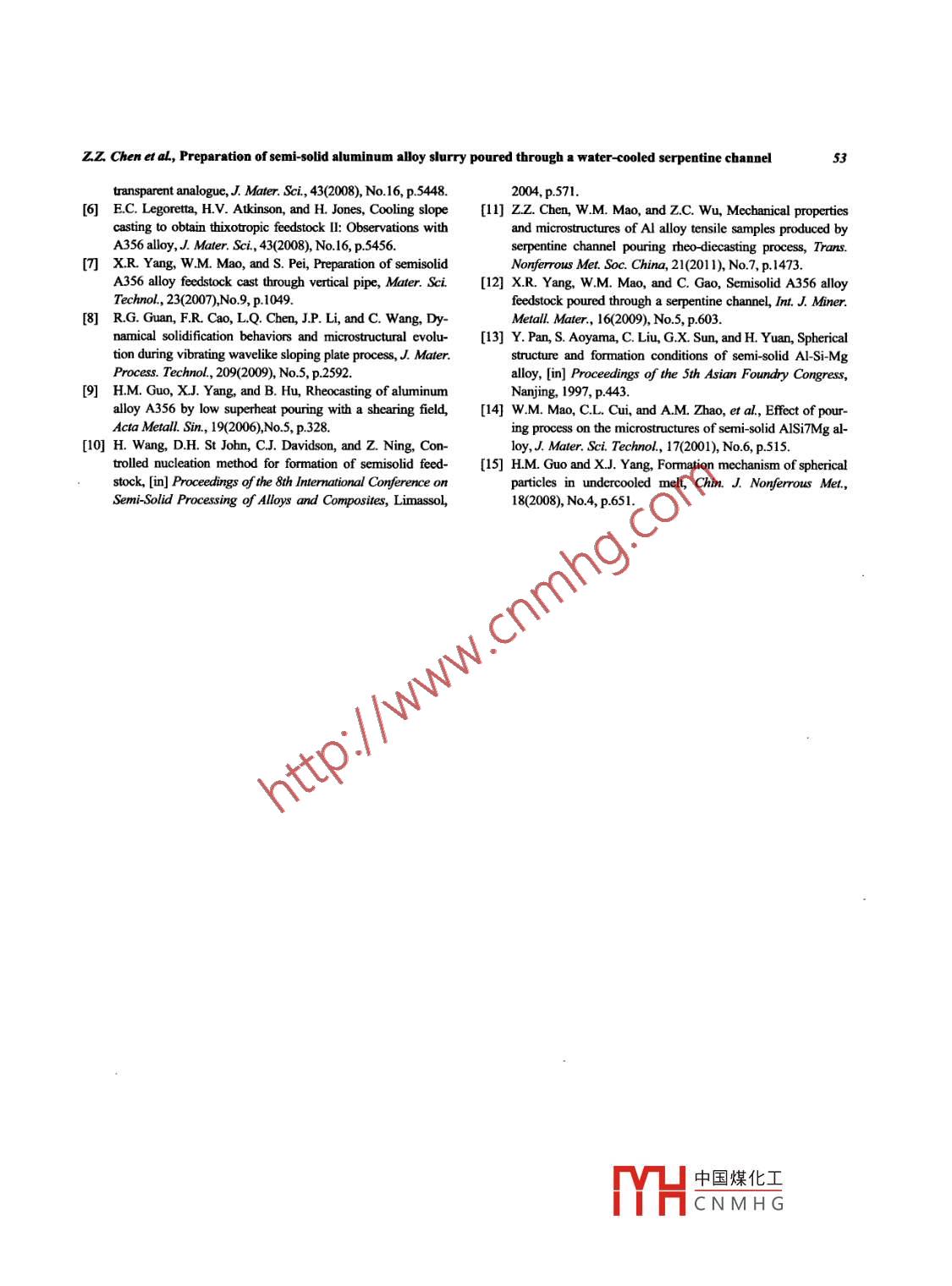International Journal of Minerals, Metallurgy and MaterialsVolume 19, Number 1, Jan 2012, Page 48DOI: 10.1007/s12613-012-0513-6Preparation of semi-solid aluminum alloy slurry poured througha water-cooled serpentine channelZheng zhou Chen, Wei -min Mao, and Zong -chuang WuSchool of Materials Science and Engineeing, University of Science and Technology Bejing, Beijng 10083, China(Received: 10 January 2011; revised: 17 February 201; accepted: 6 March 2011)Abstract: A water-cooled serpentine channel pouring process was invented to produce semi-solid A356 aluminum alloy slurry for rheocast-ing, and the effects of pouring temperature and circulating cooling water flux on the microstructure of the slurry were investigated. The論sults show that at the pouring temperature of 640-6809C and the circulating cooling water flux of 0.9 m'/hn, the semi-solid A356 aluminumalloy slurry with spherical primary a(AI) grains can be obtained, whose shape factors are between 0.78 and 0.86 and the grain diametercanreach 48-68 um.When the pouring temperatures are at 660-680C, only a very thin solidifed shell remains inside the serpentine channel andcan be removed easily. When the serpentine channel is cooled with circulating water, the microstructure of the semi-solid slurry can be im-proved, and the serpentine channel is quickly cooled to room temperature after the completion of one pouring. In terms of the productivity ofthe special equipment, the water-cooled serpentine channel is economical and fficient.Keywords: semi-solid slurry; aluminum alloys; microstructure; rheocastingf China (No.50774007), the National High-Tech Re-search and Development Program of China (No.2006AA03Z115), and the National Basic Research Priorities Program of China(No.2011CB606302-1.)1. Introductioninvented according to the theories of“controlling nucleationand inhibting dendrtes growth" and“promoting the earlyThe theo- diecasting technique of semi -solid metal (SSM)solidification nucleation” [10], which have one commonwas put forward and researched by Flemings in the earlymerit that a special stiring device is cancelled, so these1970s [1], but owing to the difficulties of preservation andpreparation processes are simple, inexpensive, and have atransportation of SSM slurry, its development was very slowbroad prospect for application.over a long period of time. Meanwhile, the studies of SSMforming technology were mainly focused on thixo-diecas-Before this study, the preparation technology of SSMslurry through a serpentine channel has been introducedting or thixo-forging. Fortunately, several novel preparationmethods of SSM slury have been developed in recent dec-[11-12]. In this paper, an innovative preparation techniqueades, so much attention has been focused on rheoformingof SSM slurry, water-cooled serpentine channel pouringtechnologies again. These preparation processes include theprocess, is presented, which can produce satisfactory SSMcooling slope casting process [2-3], damper cooling tubeslurry with a larger volume. At an appropriate pouring tem-method (DCT) [4], cooling slope casting [5-6], vertical pipeperature, no solidified shell can form in the serpentinepouring process [7], vibrating wavelike sloping plate proc-channel after the pouring process. Moreover, the serpentineess [8], and low superheat pouring with a shear fieldchannel can be fast cooled to room temperature, which can(LSPSF) [9]. These preparation processes may have beenpromote the preparation efficiency of the special equipment.Corresponding author: Zheng zhou ChenE-mail: chzz19710425@126 com◎University of Science and Technology Bejing and Springer Verlag Berlin Heidelberg 2012包Springer中國煤化工MHCNMH G50Im. J. Miner. Metall Mater, VoL.19, No.I, Jan 2012(a)(b200 um(d)(e)(fFig. 2. Effects of pouring temperature and cooling water flux on the microstructure of semi-solid A356 alloy quenched slurries: (田)680°C, 0.9 m/h; (b) 680°C, 0 m/h; (C) 660°C, 0.9 m/n; (d) 660°C, 0 m/mn; (e) 640°C, 0.9 m/h; (D 640°C, 0 m2/h.After pouring at 680 or 660°C for 12 s, it was found thatthe channel, which miglno solidified shell remained in the serpentine channel, butThe experimental results show that when the water cooledwhen the pouring temperature was decreased to 640°C, theserpentine channel is used to produce the semi-solid A356solidified shell formed in the serpentine channel, as shownAl-alloy slurry, if the pouring temperature is appropriate, notin Fig.3. The left shell (Fig. 3(a)) is formed under the con-only can the microstructure of the samples be improveddition of no cooling water and the right shell Fig. 3(b)) isduring a longer pouring time, but also can the volume offormed with a cooling water flux of 0.9 m'/h. At the sameTable 1. Characteristics of the samples prepared under vari-pouring temperature and in the same pouring time, the vol-ous conditionsume of the solidified shell with the cooling water flux of0.9Pouring temperaure/9C680 680 660 660 640 640m2/h is larger than that without any cooling water. If the liq-uid A356 alloy was poured at a lower temperature and theCooling water fux/ (m2.hr) 0.9 0 0.9 0 0.9 0channel was cooled by water, the serpentine channel couldOutlet temperaure/°C611 61260860960660Shape factor0.78 0.75 0.82 0.80 0.86 0.84provide high cooling strength on the alloy, and the primarya(AI) nuclei could easily grow and adhere on the surface ofGain diameter/ um70_ 56624856中國煤化工TYHCNMHGz.Z. Chen etal, Preparation of semi-solid aluminum alay slurry poured through a water-cooled serpentine channel51ciency of the serpentine channel is acceptable.The temperatur-time variation curves and the criticaltemperature data of the serpentine channel wall are shown inFig. 4(b) and Table 2 when there is no circulating water inthe cooling-jacket. Pouring at 640°C for 12 s, the tempera-ture of the channel wall is 306°C. Owing to a thicker solidi-fied shell remaining in the serpentine channel, the maximumtemperature of the channel