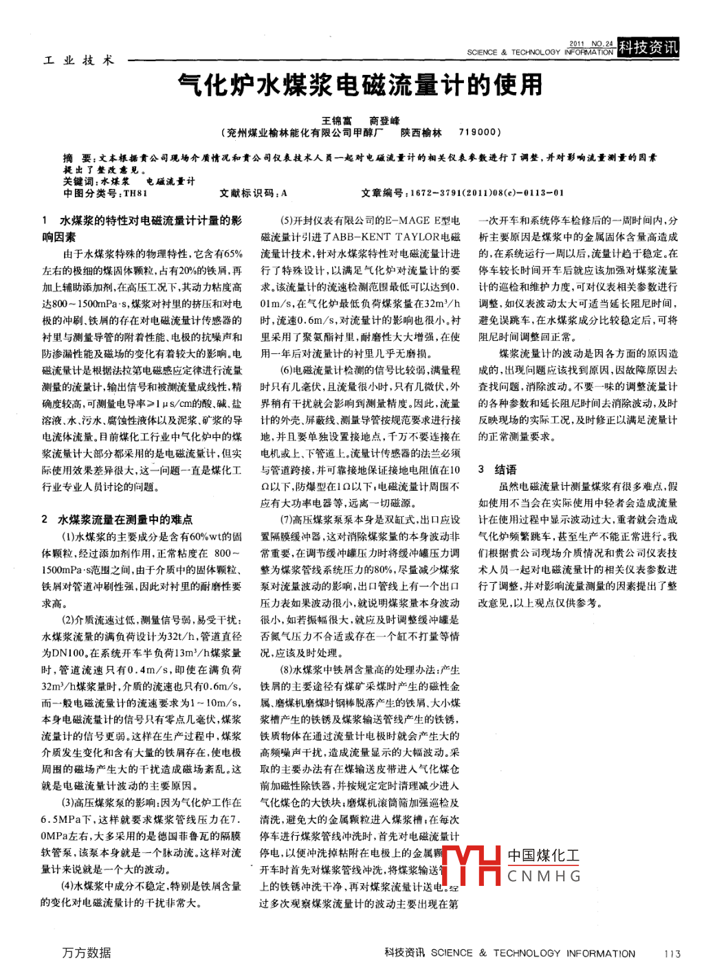 SCENCE & TCHNOLOY NCOMAN科技資訊工業(yè)技術(shù)氣化爐水煤漿電磁流量計(jì)的使用王錦富商登峰(兗州煤業(yè)榆林能化有限公司甲醇廠陜西榆林 719000)摘要:文本根據(jù)貫公司現(xiàn)場(chǎng)介質(zhì)情況和貴公司僅表技術(shù)人員一起對(duì)電磁流量計(jì)的相關(guān)儀袁參數(shù)進(jìn)行了調(diào)整,并對(duì)影響流量測(cè)量的因素提出了整改意見關(guān)鍵詞:水煤漿電磁流量計(jì)中圖分類號(hào):TH81文獻(xiàn)標(biāo)識(shí)碼:A文章編號(hào):1672-3791(2011)08(e)-0113-011水煤漿的特性對(duì) 電磁流量計(jì)計(jì)量的影(5)開封儀表有限公司的E -MAGE E型電一次開車和系統(tǒng)停車檢修后的-周時(shí)間內(nèi),分響因素磁流量計(jì)引進(jìn)了ABB-KENT TAYLOR電磁析主 要原因是煤漿中的金屬固體含量高造成由于水煤漿特殊的物理特性,它含有65%流量計(jì)技術(shù),針對(duì)水煤漿特性對(duì)電磁流量計(jì)進(jìn)的,在系統(tǒng)運(yùn)行一周以后,流量計(jì)趨于穩(wěn)定。在左右的極細(xì)的煤固體顆粒,占有20%的鐵屑,再行 了特殊設(shè)計(jì),以滿足氣化爐對(duì)流量計(jì)的要停 車較長(zhǎng)時(shí)間開車后就應(yīng)該加強(qiáng)對(duì)煤漿流量加上.輔助添加劑,在高壓工況下,其動(dòng)力粘度高求。該流量計(jì)的流速檢測(cè)范圍最低可以達(dá)到0.計(jì)的巡檢和維護(hù)力度,可對(duì)儀表相關(guān)參數(shù)進(jìn)行達(dá)800~ 1500mPa .s,媒漿對(duì)襯里的擠壓和對(duì)電01m/s, 在氣化爐最低負(fù)荷煤漿量在32m?/h調(diào)整,如儀表波動(dòng)太大可適當(dāng)延長(zhǎng)阻尼時(shí)間,極的沖刷、鐵屑的存在對(duì)電磁流量計(jì)傳感器的時(shí) ,流速0.6m/s,對(duì)流量計(jì)的影響也很小。襯避免誤跳 車,在水煤漿成分比較穩(wěn)定后,可將襯里與測(cè)量導(dǎo)管的附著性能、電極的抗噪聲和里采用了聚氨酯襯里,耐磨性大大增強(qiáng),在使阻尼時(shí)間調(diào)整回正常。防滲漏性能及磁場(chǎng)的變化有著較大的影響。電用一年后對(duì)流 量計(jì)的襯里幾乎無磨損。煤漿流量計(jì)的波動(dòng)是因各方面的原因造磁流量計(jì)是根據(jù)法拉第電磁感應(yīng)定律進(jìn)行流量(6)電磁流量計(jì)檢測(cè)的信號(hào)比較弱,滿量程成的,出現(xiàn)問題應(yīng)該找到原因,因故障原因去測(cè)量的流量計(jì),輸出信號(hào)和被測(cè)流量成線性,精時(shí)只有 兒毫伏,且流量很小時(shí),只有幾微伏,外查找問題 ,消除波動(dòng)。不要味的調(diào)整流量計(jì)確度較高,可測(cè)量電導(dǎo)率>1 us/cm的酸堿鹽界稍有干擾就會(huì)影響到測(cè)量精度。因此,流量的各種參數(shù)和延長(zhǎng)阻尼時(shí)間去消除波動(dòng),及時(shí)溶液、水、污水、腐蝕性液體以及泥漿礦漿的導(dǎo)計(jì)的外殼. 屏蔽線測(cè)量導(dǎo)管按規(guī)范要求進(jìn)行接反映現(xiàn)場(chǎng)的實(shí)際 工況,及時(shí)修正以滿足流量計(jì)電流體流量。目前煤化工行業(yè)中氣化爐中的煤地, 并且要單獨(dú)設(shè)置接地點(diǎn),千萬不要連接在的正常測(cè)量要求。漿流量計(jì)大部分都采用的是電磁流量計(jì),但實(shí)電機(jī)或上.下管道上.流量計(jì)傳感器的法蘭必須際使用效果差異很大,這一一問題一直是煤化工與管道跨接,并可靠接地保證接地電阻值在103結(jié)語行業(yè)專業(yè)人員討論的問題。Q以下,防燦型在10以下,電磁流量計(jì)周圍不雖然電磁流量計(jì)測(cè)量煤漿有很多難點(diǎn),假應(yīng)有大功率電器等,遠(yuǎn)離-切磁源。如使用不當(dāng)會(huì)在實(shí)際使用中輕者會(huì)造成流量2水煤漿流量 在測(cè)量中的難點(diǎn)(7)高壓煤槳泵泵本身是雙缸式,出口應(yīng)設(shè)計(jì)在使用過程中顯示波動(dòng)過大,重者就會(huì)造成(1)水煤漿的主要成分是含有60%wt的固置 隔膜緩沖器,這對(duì)消除煤漿量的本身波動(dòng)非氣化爐頻繁跳車,甚至生產(chǎn)不能正常進(jìn)行。我體顆粒,經(jīng)過添加劑作用,正常粘度在800 ~常重要,在調(diào)節(jié)緩沖罐壓力時(shí)將緩沖罐壓力調(diào)們根據(jù)貴公司現(xiàn)場(chǎng)介質(zhì)情況和貴公司儀表技1500mPa s范圍之間,由于介質(zhì)中的固體顆粒、整為煤漿管線系統(tǒng)壓力的80%,盡量減少煤漿術(shù)人員一起對(duì)電磁流量計(jì)的相關(guān)儀表參數(shù)進(jìn)鐵屑對(duì)管道沖刷性強(qiáng),因此對(duì)襯里的耐磨性要泵對(duì)流量波動(dòng)的影響,出口管線上有- -個(gè)出口行 了調(diào)整,并對(duì)影響流量測(cè)量的因素提出了整求高。壓力表如果波動(dòng)很小,就說明煤漿量本身波動(dòng)改意見,以上觀點(diǎn)僅供參考。(2)介質(zhì)流速過低,測(cè)量信號(hào)弱,易受干擾:很小, 如若振幅很大,就應(yīng)及時(shí)調(diào)整緩沖罐是水煤漿流量的滿負(fù)荷設(shè)計(jì)為32t/h,管道直徑否氮?dú)鈮?力不合適或存在一一個(gè)缸不打量等情為DN100。在系統(tǒng)開車半負(fù)荷13m/h煤漿量況,應(yīng)該及時(shí)處理。時(shí),管道流速只有0.4m/s,即使在滿負(fù)荷(8)水煤漿中鐵屑含量高的處理辦法:產(chǎn)生32m?/h煤漿量時(shí),介質(zhì)的流速也只有0.6m/s,鐵屑的主要途徑有煤礦采煤時(shí)產(chǎn)生的磁性金而一般電磁流量計(jì)的流速要求為1 ~ 10m/s,屬、 磨煤機(jī)磨煤時(shí)鋼棒脫落產(c