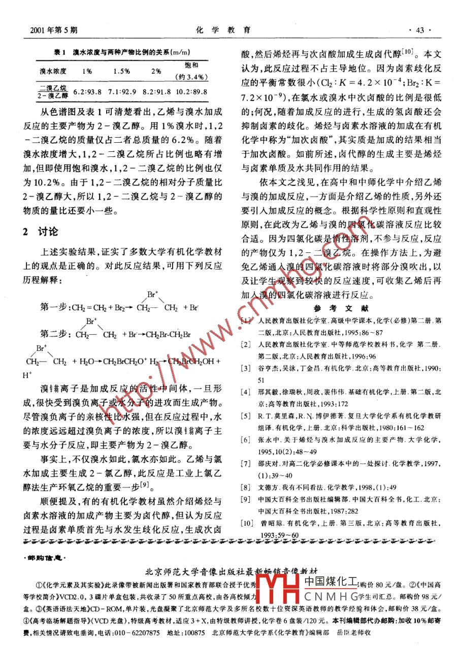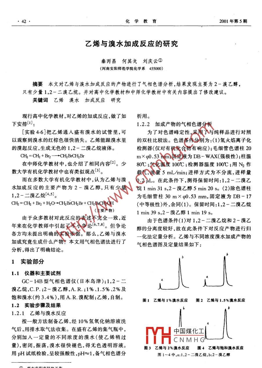 化學(xué)教育2001年第5期乙烯與溴水加成反應(yīng)的研究,秦丙昌何其戈劉慶云中(河南安陽師范學(xué)院化學(xué)系455000摘要本文對(duì)乙烯與澳水加成反應(yīng)的產(chǎn) 物進(jìn)行了氣相色譜分析,結(jié)果發(fā)現(xiàn)主要為2-澳乙醇,只有少量1,2-二澳乙烷。并對(duì)高中化學(xué)教材和中師化學(xué)教材中有關(guān)內(nèi)容提出了修改建議。關(guān)鍵詞乙烯澳水加成反應(yīng)研究現(xiàn)行高中化學(xué)教材,對(duì)乙烯的加成反應(yīng),做了如析用。下安排[1]:1.2.2加成產(chǎn) 物的氣相色譜分析[實(shí)驗(yàn)4-6]把乙烯通人盛有溴水的試管里,可.為了對(duì)色譜峰定性,采用了與純樣品進(jìn)行對(duì)照以觀察到溴水的紅棕色很快消失。乙烯能跟溴水里的雙柱比較法。色譜條件分別為:(1)氫火焰離子化的溴起反應(yīng),生成無色的1,2-二溴乙烷液體。檢測(cè):器(僅對(duì)有機(jī)化合物有響應(yīng));毛細(xì)管色譜柱20CH2 =CH2 + Br2 - +CH2BrCH2BrmX q0.53 mm;固定液為DB - WAX(強(qiáng)極性);柱溫在中師化學(xué)教材中,也介紹了相同內(nèi)容[2]。少80C ;氣化溫度100C;檢測(cè)器溫度100C;用N2作數(shù)大學(xué)有機(jī)化學(xué)教材中也有類似觀點(diǎn)[3]。載氣,流量5 mL/min;進(jìn)樣方式為不分流,進(jìn)樣量而在多數(shù)大學(xué)有機(jī)化學(xué)教材中,認(rèn)為乙烯與溴0.2 μL。在此條件下,測(cè)得保留時(shí)間:1,2-二溴乙水加成反應(yīng)的主要產(chǎn)物為2-溴乙醇,只有少量烷1 min31 s,2-溴乙醇5 min 20 s。(2)除 色譜柱1,2-二溴乙烷[4.5]。為毛細(xì)管柱30mXq0.53mm,固定液為DB-17CH2=CH2+ Br2 + H2O CH2BrCH2Br + CH2BrCH2OH(中等極性)外,余同(1)。保留時(shí)間:1,2-二溴乙烷(主要產(chǎn)物)1min39s,2-溴乙醇1min19s。由于眾多教材對(duì)此反應(yīng)的表述不完全一致,近由于色譜條件(1)對(duì)1,2-二溴乙烷和2-溴乙年來在化學(xué)教師中引起了不小爭(zhēng)論[6,7,8]。但爭(zhēng)論醇的分離度較好,故在此條件下對(duì)反應(yīng)產(chǎn)物進(jìn)行歸各方均未提出明確的實(shí)驗(yàn)依據(jù)。那么,乙烯與溴水一化法定量分析。 乙烯與不同濃度溴水加成產(chǎn)物的加成究竟生成什么產(chǎn)物?本文用氣相色譜法進(jìn)行了氣相色譜圖及定量結(jié)果如下:分析,得出了明確結(jié)論。1實(shí)驗(yàn)部分1.1儀器和主要試劑GC- 14B型氣相色譜儀(日本島津);1,2-二溴乙烷,C.P. ;2-溴乙醇,A. R.;1%、1.5%、.2%及飽和溴水(約3.4%),用A. R.溴配制;乙烯,自制。圈1乙烯與 1%澳水反應(yīng)圖2 乙烯與1.5%澳水反應(yīng)1.2 實(shí)驗(yàn)步驟及結(jié)果1.2.1乙烯 與溴水反應(yīng).按一般方法制備乙烯,經(jīng)10%氫氧化鈉溶液洗氣后,用排水取氣法收集。在盛有乙烯的集氣瓶中,中國煤化工分別加人一定量的不同濃度的溴水(使乙烯稍過量),密閉,振蕩,溴水很快褪色,得無色透明溶液。YHCNMHG圖4乙烯與飽和溴水反應(yīng)83 乙烯與2%澳水反應(yīng)用pH試紙檢驗(yàn),呈較強(qiáng)酸性,pH≈1,備氣相色譜分圖1~4中,a:1,2-二澳乙烷,b:2-溴乙醇①現(xiàn)在安陽市科協(xié)工作分方數(shù)據(jù)2001年第5期化學(xué)教育表1澳水濃度 與兩種產(chǎn)物比例的關(guān)系(m/m)酸,然后烯烴再與次鹵酸加成生成鹵代醇[10]。本文澳水濃度%1.5%2%認(rèn)為,此反應(yīng)過程不占主導(dǎo)地位。因?yàn)辂u素歧化反(約3.4%)應(yīng)的平衡常數(shù)很小(Cl2:K =4.2x 10~4;Br2:K=一次二解6.2:93.8 7.1:92.9 8.2:91.8 10.2:89.87.2x10~9),在氯水或溴水中次鹵酸的比例是很低從色譜圖及表1可清楚看出,乙烯與溴水加成的;何況,隨著加成反應(yīng)的進(jìn)行,生成的氫鹵酸還會(huì)反應(yīng)的主要產(chǎn)物為2-溴乙醇。用1%溴水時(shí),1,2抑制鹵素的歧化。烯烴與鹵素水溶液的加成在有機(jī)-二溴乙烷的質(zhì)量?jī)H占二者總質(zhì)量的6.2%。隨著化學(xué)中稱為“加次鹵酸”,其實(shí)質(zhì)是加成的結(jié)果相當(dāng)溴水濃度增大,1,2一二溴乙烷所占比例也略有增于加次鹵酸。如前所述,鹵代醇的生成主要是烯烴加,但即使用飽和溴水,1,2-二溴乙烷的比例也僅與鹵素單質(zhì)及水共同作用的結(jié)果。為10.2%。由于1,2-二溴乙烷的相對(duì)分子質(zhì)量比依本文之淺見,在高中和中師化學(xué)中介紹乙烯2-溴乙醇大,所以1,2-二溴乙烷與2-溴乙醇的.與溴的加成反應(yīng),一-方面是介紹乙烯的性質(zhì),另外還物質(zhì)的量比還要小一些。要引人加成反應(yīng)的概念。根據(jù)科學(xué)性原則和直觀性原則,在此改為乙烯與溴的四氯化碳溶液反應(yīng)比較2討論合適。因?yàn)樗穆然际嵌栊匀軇?不參與反應(yīng),反應(yīng)上述實(shí)驗(yàn)結(jié)果,證實(shí)了多數(shù)大學(xué)有機(jī)化學(xué)教材的產(chǎn)物僅為1,2-二溴乙烷。在操作方法上,為避上的觀點(diǎn)是正確的。對(duì)此反應(yīng)結(jié)果,可用下列反應(yīng)免乙烯通人溴的四氯化碳溶液時(shí)將部分溴吹出,以歷程解釋:及讓學(xué)生觀察到較快的反應(yīng)速度,可收集乙烯后再,Br'加入溴的四氯化碳溶液進(jìn)行反應(yīng)。第一步:CH2=CH2+Br→CH- CH2 +Br參考文獻(xiàn)Br+.[1] 人民教育出版社化學(xué)室.高級(jí)中學(xué)課本,化學(xué)(必修)第二冊(cè).第第二步: CH2- CH2 +Br→CH2Br-CH2Br二版,北京:人民教育出版社, 1995:86-87[2]人民教育 出版社化學(xué)室.中等師范學(xué)校教科書,化學(xué)第二冊(cè).Br*、