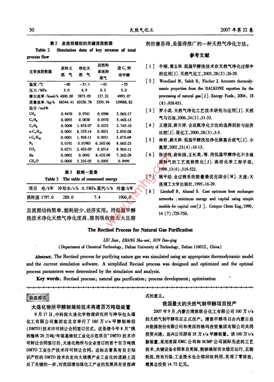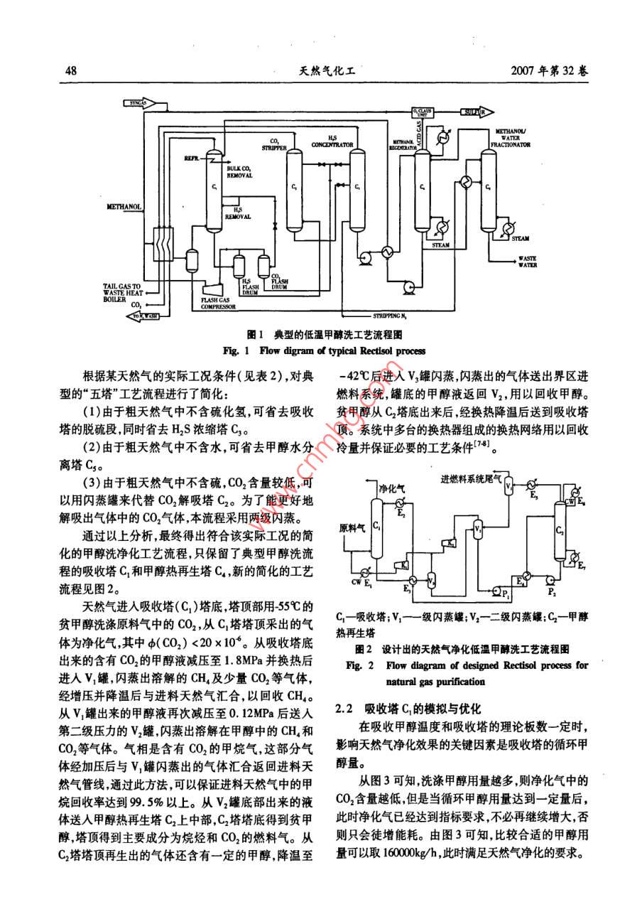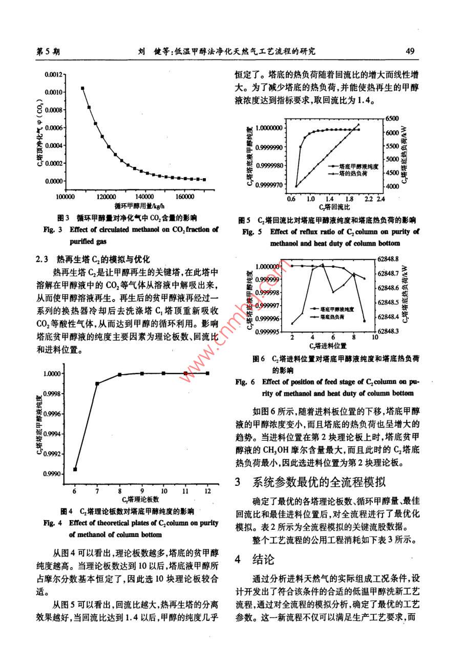 第5期劉健等:低溫甲醇法凈化天然氣工藝流程的研究低溫甲醇法凈化天然氣工藝流程的研究劉健,張述偉,孫道青(大連理工大學化工學院,遼寧大連116012摘要:利用合適的熱力學模型和通用流程模擬軟件,對天然氣低溫甲醇洗凈化工藝流程進行了模擬,設計出了簡化的甲醇洗工藝流程并進行了優(yōu)化。通過模擬分析確定了系統(tǒng)的最優(yōu)工藝參數關鍵詞:低溫甲醇洗;天然氣凈化;工藝開發(fā);優(yōu)化中圖分類號:TQ064文獻標識碼:B文章編號:1001-9219(2007)054704天然氣與煤炭、石油并稱為世界一次能源的三表1常用的吸收方法和低溫甲醇洗的比較大支柱隨著世界經濟的發(fā)展,石油危機的沖擊和 Table 1 Comparison between common absorption煤、石油所帶來的環(huán)境污染問題日益嚴重能源結構processes and Rectisol process逐步發(fā)生變化,天然氣的消費量急劇增長。天然氣凈化方法溫度壓力進口出口(CO2)吸收能x106力m3/m3作為優(yōu)質干凈的燃料和重要的化工原料,其應用越乙醇胺法(MEA)42.8201002018-25-來越引起人們的重視加快天然氣工業(yè)的發(fā)展已成為當今世界的趨勢。我國擁有較豐富的天然氣資低溫甲醇法-30--703.233NHD0--53.232源最近十年,我國天然氣產量增長迅速,開發(fā)應用的步伐正在加快。目前天然氣凈化過程中常用的方法大多采用溶天然氣凈化主要是指水分和酸性氣體的脫劑吸收法進行預處理再采用沸石分子篩吸附進行除。天然氣中的酸性氣體主要是指CO2和H2S等深度凈化。表1給出了幾種常用吸收方法和低溫甲醇洗技術的比較2。雜質氣體。氣體凈化方法有氣液吸收、氣固相催化從表1中可以看出低溫甲醇洗技術凈化氣體的轉化固體吸附、分子師分離膜分離等,但是用得最凈化度要優(yōu)于其他幾種吸收方法。在天然氣后續(xù)的為廣泛的還是氣液吸收。低溫甲醇洗技術就是一種液化過程中,溫度要降低到-135℃以下為防止天有效的氣體凈化的方法。本文以某天然氣為原料然氣中的H2O和CO2在此溫度下結冰而阻塞設備氣用通用化工流程模擬軟件模擬并設計出了符合管道,要求將原料天然氣中的ψ(H2O)降到0.1x實際工況的工藝流程對各系統(tǒng)參數進行了優(yōu)化凈10◆以下,d(CO2)降到(50-100)×10左右凈化化后的天然氣各項指標都達到了要求。要求比較苛刻,而采用低溫甲醇洗技術能滿足天然1低溫甲醇洗工藝介紹氣凈化的苛刻要求。低溫甲醇洗法是利用低溫下(-30℃~2天然氣低溫甲醇洗工藝流程的開發(fā)-70℃)甲醇溶劑的優(yōu)良特性脫除原料氣中的輕質設計油、CO2H2S硫的有機化合物和氰化物等的物理吸2.1工藝流程介紹收法。低溫甲醇洗法的特點:吸收能力大,氣體凈化低溫甲醇洗是一種技術先進和較為經濟的凈化度高出口氣中(CO2)可脫除至(10-20)×106,能方法,典型的低溫甲醇洗工藝流程如圖1所示該流將無機硫和有機硫脫除干凈(總硫小于0.1×10);程由5個塔構成,即吸收塔(C1)、CO2解吸塔作為吸收劑的甲醇易得,價格低廉;選擇性好,甲醇對(C2)、H2S濃縮塔(C3)、甲醇熱再生塔(C)和甲醇CO2H2SCOS的溶解度大但對H2、CO、CH的溶解水分離塔(C3)。根據原料氣組成及凈化度要求的度小;沸點低它的熱再生溫度低能耗低。不同低溫甲醇洗工藝流程變換形式多種多樣間但是都是在典型的低溫甲醇洗工藝流程基礎上新開電81:3減:181:預土生,發(fā)設計的。天然氣化工2007年第32卷METHANOI圖1典型的低溫甲醇洗工藝流程圖1 Flow digram ot typical Rectisol process根據某天然氣的實際工況條件(見表2),對典4℃后進入Ⅴ3罐閃蒸閃蒸出的氣體送出界區(qū)進型的“五塔”工藝流程進行了簡化燃料系統(tǒng),罐底的甲醇液返回V2,用以回收甲醇。(1)由于粗天然氣中不含硫化氫,可省去吸收貧甲醇從C2塔底出來后經換熱降溫后送到吸收塔塔的脫硫段,同時省去H2S濃縮塔C3。頂。系統(tǒng)中多臺的換熱器組成的換熱網絡用以回收(2)由于粗天然氣中不含水,可省去甲醇水分冷量并保證必要的工藝條件1離塔C5(3)由于粗天然氣中不含硫,CO2含量較低,可燃料系統(tǒng)尾氣凈化氣以用閃蒸罐來代替CO2解吸塔C2。為了能更好地通過以上分析最終得出符合該實際工況的筒t2解吸出氣體中的CO2氣體本流程采用兩級閃蒸?;募状枷磧艋に嚵鞒?只保留了典型甲醇洗流程的吸收塔C1和甲醇熱再生塔C4,新的簡化的工藝流程見圖2。天然氣進入吸收塔(C1)塔底,塔頂部用-55℃的貧甲醇洗滌原料氣中的CO2,從C1塔塔頂采出的氣C一吸收塔;Ⅴ1—一級閃蒸罐;V2一二級閃燕;C2一甲醇熱再生塔體為凈化氣其中d(CO2)<20x10°。從吸收塔底圖2設計出的天然氣凈化低溫甲醇洗工藝流程圖出來的含有CO2的甲醇液減壓至18MPa并換熱后rg2 low diagram of designed Rectisol process for進入V1罐,閃蒸出溶解的CH4及少量CO2等氣體,natural gas purification經增壓并降溫后與進料天然氣匯合,以回收CH4從V罐出來的甲醇液再次減壓至0.MPa后送入22吸收塔G的模擬與優(yōu)化第二級壓力的2罐閃蒸出溶解在甲醇中的CH4和在吸收甲醇溫度和吸收塔的理論板數一定時,C2等氣體。氣相是含有CO2的甲烷氣,這部分氣影響天然氣凈化效果的關鍵因素是吸收塔的循環(huán)甲體經加壓后與V,罐閃蒸出的氣體匯合返回進料天醇量。然氣管線通過此方法,可以保證進料天然氣中的甲從圖3可知洗滌甲醇用量越多,則凈化氣中的烷回收率達到995%以上。從V2罐底部出來的液CQ2含量越低,但是當循環(huán)甲醇用量達到