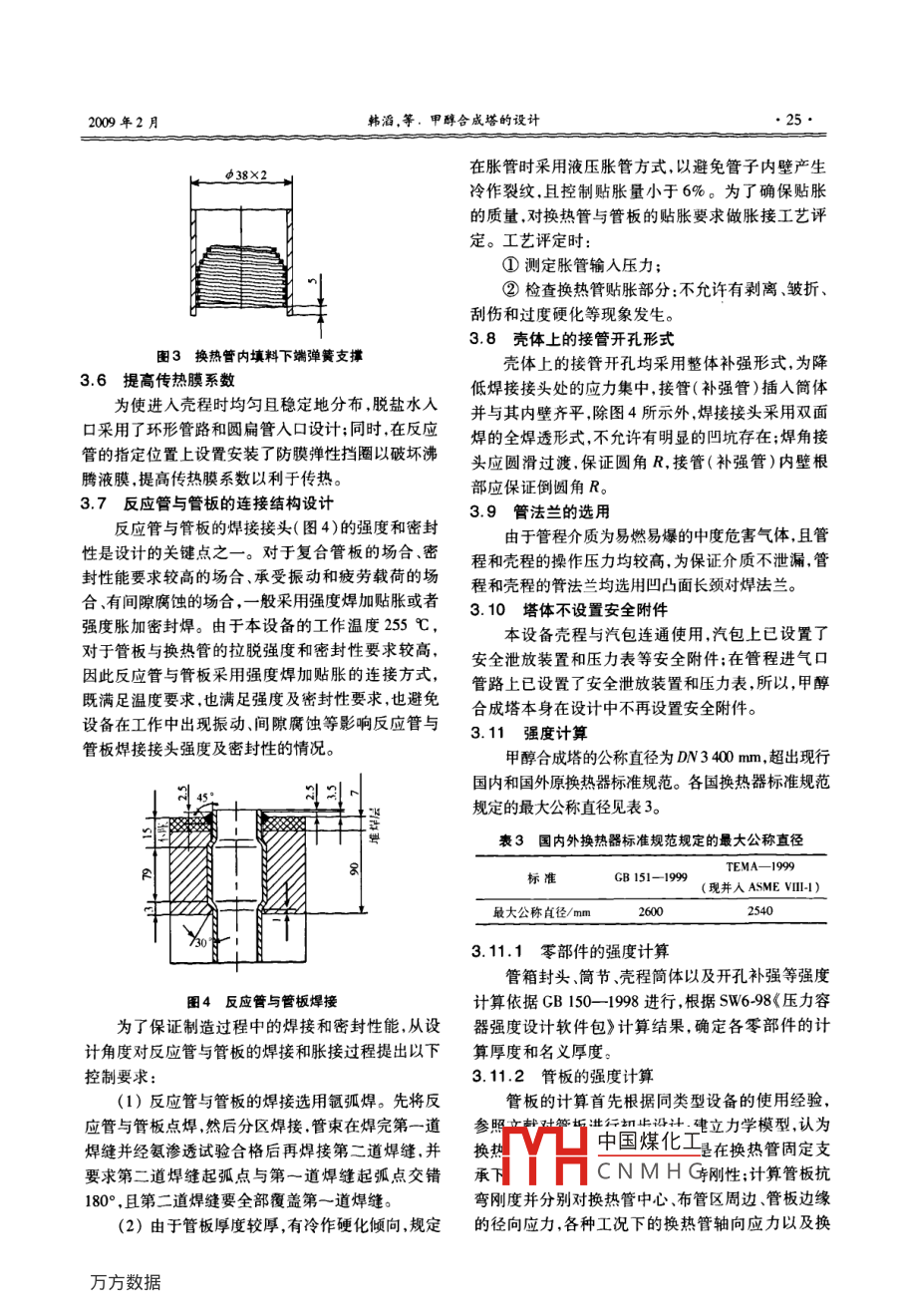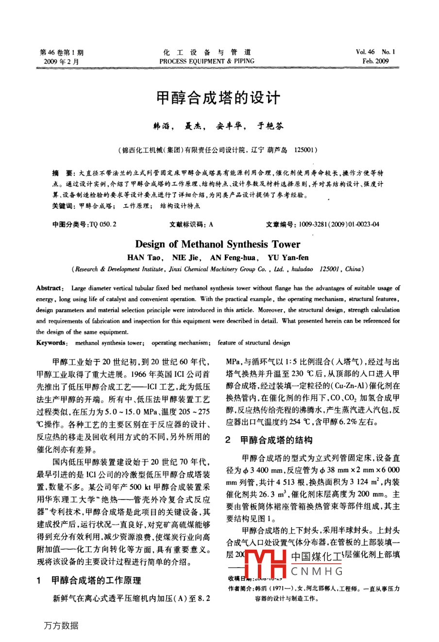 第46卷第1期化工設(shè)與管道Vol 46 No. 1009年2月PROCESS EQUIPMENT PIPINGFeb.2009甲醇合成塔的設(shè)計(jì)韓滔,聶杰,安豐華,于艷芬(錦西化工機(jī)械(集團(tuán))有限責(zé)任公司設(shè)計(jì)院,遼寧葫蘆島125001)摘要:大直徑不帶法蘭的立式列管固定床甲醇合成塔具有能源利用合理,催化劑使用壽命較長,操作方便等特點(diǎn)。通過設(shè)計(jì)實(shí)例,介紹了甲醇合成塔的工作原理、結(jié)構(gòu)特點(diǎn)、設(shè)計(jì)參數(shù)及材料選擇原則,并對(duì)其結(jié)構(gòu)設(shè)計(jì)、強(qiáng)度計(jì)算、設(shè)備制造檢驗(yàn)的要求等設(shè)計(jì)要點(diǎn)進(jìn)行了詳細(xì)介紹,為同類產(chǎn)品設(shè)計(jì)提供了參考經(jīng)驗(yàn)。關(guān)鍵詞:甲醇合成塔;工作原理;結(jié)構(gòu)設(shè)計(jì)特點(diǎn)中圖分類號(hào):TQ050.2文獻(xiàn)標(biāo)識(shí)碼:A文章編號(hào):1009-3281(2009)01-0023-04Design of Methanol Synthesis TowerHAN Tao, NIE Jie, AN Feng-hua, YU Yan-fenResearch Development Institute, Jinni Chemical Machinery Group Co., Ltd., huludao 125001, China)Abstract: Large diameter vertical tubular fixed bed methanol synthesis tower without flange has the advantages of suitable usage ofenergy, long using life of catalyst and convenient operation. With the practical example, the operating mechanism, structural featuresdesign parameters and material selection principle were introduced in this article. Moreover, the structural design, strength calculationand requirements of fabrication and inspection for this equipment were described in detail. What presented herein can be referenced forKeywords: methanol synthesis tower; operating mechanism; feature of structural design甲醇工業(yè)始于20世紀(jì)初,到20世紀(jì)60年代,MPa,與循環(huán)氣以1:5比例混合(人塔氣),經(jīng)過與出甲醇工業(yè)取得了重大進(jìn)展。1966年英國ICI公司首塔氣換熱并升溫至230℃后,從頂部的入口進(jìn)入甲先推出了低壓甲醇合成工藝—CI工藝,此為低壓醇合成塔,經(jīng)過裝填一定粒徑的(CuZn-A)催化劑在法生產(chǎn)甲醇的開端。所有中、低壓法甲醇裝置工藝換熱管內(nèi)在催化劑的作用下,CO、CO2加氫合成甲過程類似,在壓力為5.0~15.0MPa、溫度205~275醇,反應(yīng)熱傳給殼程的沸騰水,產(chǎn)生蒸汽進(jìn)入汽包反℃操作。各種工藝的主要區(qū)別在于反應(yīng)器的設(shè)計(jì)應(yīng)器出口氣溫度約254℃,含甲醇6.2%左右。反應(yīng)熱的移走及回收利用方式的不同,另外所用的2甲醇合成塔的結(jié)構(gòu)催化劑亦有差異國內(nèi)低壓甲醇裝置建設(shè)始于20世紀(jì)70年代,甲醇合成塔的型式為立式列管固定床,設(shè)備直最早引進(jìn)的是C公司的冷激型低壓甲醇合成塔裝徑為d3400m,反應(yīng)管為38mmx2mm×6000置數(shù)量不多。某公司年產(chǎn)500k甲醇合成裝置采mm列管共計(jì)4513根換熱面積為3124m2,內(nèi)裝用華東理工大學(xué)“絕熱—管殼外冷復(fù)合式反應(yīng)催化劑共263m催化劑床層高度為200mn。主器”專利技術(shù)甲醇合成塔是此項(xiàng)目的關(guān)鍵設(shè)備,其要由管板筒體裙座管箱換熱管束等部件組成其主建成投產(chǎn)后,運(yùn)行狀況一直良好,對(duì)兗礦高硫煤能夠要結(jié)構(gòu)見圖1。甲醇合成塔的上下封頭,采用半球封頭。上封頭得到充分有效利用,減少資源浪費(fèi)使煤炭行業(yè)向高合成氣入口處設(shè)置氣體分布器在管板的上部裝填附加值——化工方向轉(zhuǎn)化等方面,具有重要意義。層將該設(shè)備的主要設(shè)計(jì)過程進(jìn)行簡單的介紹。LLI中國煤化工層催化劑上部填CNMHG甲醇合成塔的工作原理收稿日作者簡介:韓滔(1971-)女河北邯鄲人,工程師。一直從事壓力新鮮氣在離心式透平壓縮機(jī)內(nèi)加壓(A)至8.2容器的設(shè)計(jì)與制造工作?;ぴO(shè)備與管道第46卷第1期裝耐火球φ8mm。下管板下面裝填耐火球φ25mm。比較合理,但是由于其直徑較大,如果采用法蘭連接將存在以下不利因素:(1)大直徑法蘭的密封性較難保證,若操作失誤易造成嚴(yán)重泄漏,且大直徑法蘭的成本造價(jià)高。(2)大直徑法蘭的密封墊片加工困難。為了防止設(shè)備工作過程中的密封泄漏,減少法蘭力矩對(duì)管板的影響降低制造成本,釆用不兼做法蘭的管板結(jié)構(gòu)最為合理。表2材料選擇零部件名稱料名稱球形封頭15 ArMoR(正火+回火)(包括沖壓減薄量)殼程筒體13 MnNiMoNbR(正火+回火)6=42管程筒體13 MnNiMoNbR(正火+回火)8=60+5堆焊不銹鋼反應(yīng)管雙相不銹鋼:瑞典 Sandvik公司的SAF2205上下管板13 MnNiMoNbr堆焊不銹鋼補(bǔ)強(qiáng)管鍛件MnMⅢ法蘭鍛件20MnMoⅢ圖1甲醇合成塔3甲醇合成塔的設(shè)計(jì)3.1設(shè)計(jì)參數(shù)主要設(shè)計(jì)參數(shù)如表表1甲醇合成塔技術(shù)參數(shù)技術(shù)參數(shù)項(xiàng)目管程設(shè)計(jì)壓力/MPa設(shè)計(jì)溫度/℃93400操作介質(zhì)合成氣(易燃易爆)沸騰水圖2管板與筒體焊接腐蝕裕度0焊接接頭系數(shù)1.03.4填料支撐彈簧的設(shè)計(jì)換熱面積/由于甲醇合成塔的反應(yīng)過程在裝填催化劑的換容器類別三類(A2)熱管中進(jìn)行,因此對(duì)換熱管中催化劑支承設(shè)計(jì)是相催化劑裝填量/m3當(dāng)重要的。錐形彈簧結(jié)構(gòu)裝拆容易,加工方便,阻力氧化鋁球裝填域/m320.9降較小,穩(wěn)定性好,能夠承受較大載荷,可以防止共設(shè)計(jì)使用壽命/a振現(xiàn)象發(fā)生。選用高溫下具