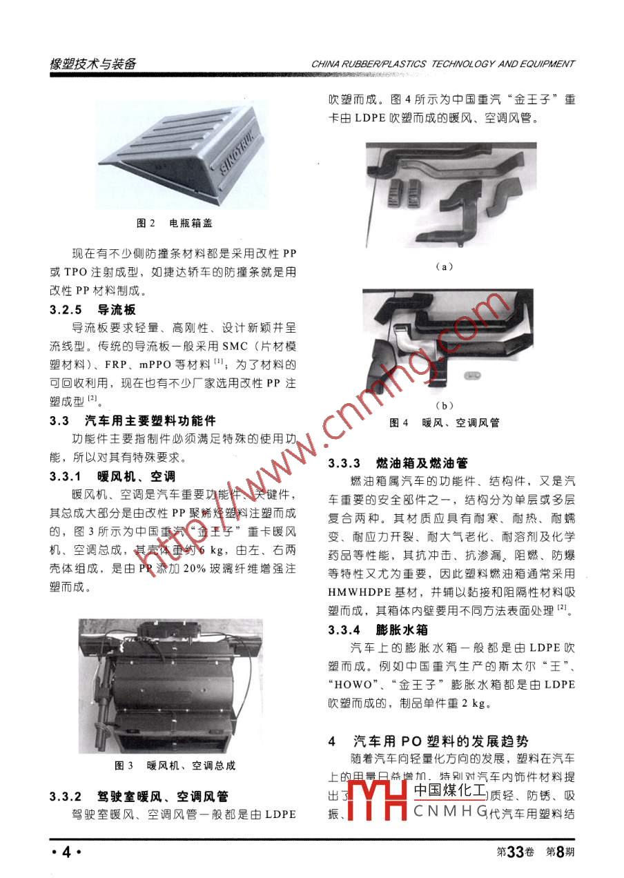 匚綜述與專論李光等·聚烯烴材料在汽車工業(yè)上的應(yīng)用及發(fā)展前景聚烯烴材料在汽車工業(yè)上的應(yīng)用發(fā)展前景李光耀,張霞,田雅萍(中國重汽濟(jì)南商用車有限公司,山東濟(jì)南250100)摘要:汽車用聚烯烴塑料零部件分為三類:內(nèi)飾件、外件和功能件,內(nèi)飾件主要有儀表板、車門內(nèi)板等:外面件主雯有保險杠、霙子板、電眍蓋等;功件主要有暖風(fēng)機(jī)、膨脈水稻、燃油箱及囂油管等。本文洋細(xì)介紹了聚烯烴(PO材料的分類、性能特點及其在汽車工業(yè)上的應(yīng)用狀況和發(fā)展前景關(guān)鍵詞:聚擇烴;汽車工業(yè):應(yīng)月;麗景中圖分類號:TQ325.1文獻(xiàn)標(biāo)識碼文章編號:1009-797X(2007)080001-06隨著中國經(jīng)濟(jì)持續(xù)高速的發(fā)展,中國汽車分為高密度聚乙烯(HDPE)和低密度聚乙烯工業(yè)正進(jìn)入一個快速發(fā)展的歷史時期.2005年(LDPE),PO塑料印烯烴的聚合物,是一類汽車銷售量達(dá)到575.8189萬輛,2006年銷售量最大、應(yīng)用最多的高分子材料;其中以聚乙汽車突破700萬倆,最終達(dá)721.5972萬輛。烯、聚丙烯最為重要。由于原料豐富、價格低預(yù)計2010年汽車產(chǎn)量將達(dá)到800萬-1000萬廉、容易加工成型、綜合性能優(yōu)良等特點,在輛之間,2020年國內(nèi)汽車需求量及產(chǎn)量將在現(xiàn)實生活中應(yīng)用最為廣泛,其在汽車上應(yīng)用也1400萬-1800萬輛之間,到時將超過美國成越來越重要,并有逐步擴(kuò)大之趨勢。為全球第一大汽車生產(chǎn)國。隨著汽車工業(yè)的發(fā)PO塑料具有以下特性展,節(jié)能、質(zhì)輕、高速、美罵、環(huán)保、乘坐舒(1)密小。PO塑料的密度通常在適及安全可靠對汽車的要求越釆越重要。當(dāng)前,0.83-096gcm3之間,是除木材外較為輕質(zhì)世界汽車材料技術(shù)發(fā)展的主要方向是輕量化、的材料,當(dāng)將其制成泡沫時,其密度更低,可環(huán)?;?減輕汽車自身的重量是降低汽車排放達(dá)0.010-0.050g/cm3之間,而綱的密度為是喜燃燒效率的最有效描施之一。汽車的自重78g/cm2,鋁的為27g/cm3,玻璃2.6g/cm,每減少10%,燃油的消耗可降低6%~8%,為此陶瓷4.0gcm3。每100kg的望料可替代其也降低整車成本及其重量,增加汽車的有效載荷材料750-850kg,可減少汽車自重,增加有效增加望料類材料在汽車中的使用量便成為關(guān)鍵,載荷。聚烯烴(PO)塑料作為通用塑料中最為普通的(2)物理、化學(xué)等綜合性能良好。手感好類,其在汽車上的應(yīng)用則更舉足輕重。耐磨,對電、熱、聲都有艮好的緦緣性能,透1聚烯烴(PO)塑料分類及特點作者簡介:李光耀(1967-)高級工程師,主要PO塑料是通用塑料的一種,它主要包括從事汽車內(nèi)飾件、外飾件等非金屬產(chǎn)品的研究與開發(fā)工作已發(fā)聚乙烯(PE).聚丙躇(PP)和POE、EⅤA中國煤化工…山東省優(yōu)秀科技學(xué)術(shù)論MMA等高級烯烴聚合物。聚乙烯(PE)又CNMHG2007年第33卷綠塑技術(shù)與裝備CHINA RUBBERPLASTCS TECHAOLOGY AND EQUIPMENT明度高、透氣率高,可被廣泛地用來制造電絕外飾件和功能件緣材料,絕緣保溫材料;耐化學(xué)腐蝕性好,對內(nèi)飾件酸、碼、鹽等化學(xué)物質(zhì)的腐蝕均有抵抗能力。輛汽車最容易出彩的是內(nèi)飾件,因為汽(3)著色性好??砂葱枰瞥筛鞣N各樣的車的外觀是給別人看的,而人們真正享受的是頤色,有黑、灰、白、桃木紋等。汽車的內(nèi)飾,內(nèi)飾強(qiáng)調(diào)觸覺、手感、舒適性和(4)加工性能好。可通過擠出、吹塑和注可視性等,內(nèi)飾產(chǎn)品主要包括以下幾個方面:射等工藝加工成管、板、薄膜及纖維,復(fù)雜的3.1.1儀表板制品可一次成型,能采用各種成型法大批量生儀表板是汽車上主要內(nèi)飾件,壁薄,體積大產(chǎn),生嚴(yán)效率高,成本較低,經(jīng)濟(jì)效益顯著,上面開有很多方孔、圓孔等儀表孔,且結(jié)構(gòu)形如果以單位體積計算,生產(chǎn)塑料制件的費(fèi)用僅狀較為復(fù)雜的零部件,目前使用的儀表板可分為有色金屬的1/10為硬儀表板和軟儀表板兩種(5)環(huán)保、節(jié)約能源??苫厥绽?是滿硬儀表板常用于輕、小型貨車、大貨車和客足人類可持續(xù)發(fā)展戰(zhàn)略可大力推廣的材料,每車上,一般采用PP、PC、ABS、ABS/PC等100km節(jié)油在0.5L以上。次性注射成型(。這種儀表板表面有花紋,尺6)價格低廉。目前,市場上PP的價寸很大,無蒙皮,表面質(zhì)量要求很高,要求材格是8000元/t,而其他塑料一般都不低于料耐濕、耐熱,剛牲好不易變形。但由于采用10000元A,有些塑料材料的價格甚至已達(dá)多點注射成型,易形成流痕和黏接痕,同時添40000~50000元/t以上。加色母不均,容易產(chǎn)生色差,因此表面需經(jīng)涂7)缺點:收縮率大,吸水性強(qiáng),尺寸穩(wěn)裝才能使用,且最好選用亞光漆涂裝。歐洲及定性差,難以制得高精度制品,易燃,燃燒時日本的汽車儀表板大都選用以增強(qiáng)PP或ABS/產(chǎn)生大量黑煙和有毒氣體,長期使用易老化、PC注塑成型易變形;但通過改性可降低其缺陷軟質(zhì)儀表板由表皮、骨架材料、緩沖材料等構(gòu)成。骨架一般選用價格低廉的改性PP聚烯2汽車用聚烯烴塑料的概況烴塑料。表皮則采用PⅤc/ABS或PVC片材,PO在汽車工業(yè)上應(yīng)用源自20世紀(jì)50年代并帶有皮紋,其加工工藝是先將表皮真空吸塑已經(jīng)有50多年的歷史了,它在汽車減