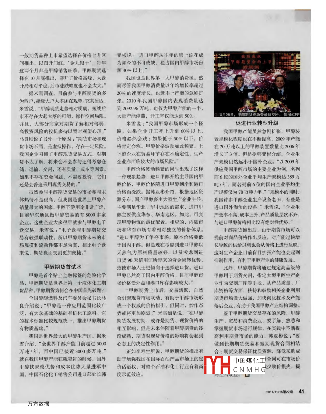 觀察甲醇:期貨劍出價(jià)格穩(wěn)甲醇期貨交易推出,一方面有助于規(guī)范甲醇市場(chǎng),引導(dǎo)企業(yè)進(jìn)行產(chǎn)業(yè)升級(jí),另一方面有助于增強(qiáng)我國(guó)在國(guó)際石油產(chǎn)品市場(chǎng)上的定價(jià)話語權(quán)■文/本刊記者石杏茹3月開始放出消息至今,市場(chǎng)人士火熱的心逐漸變冷的時(shí)候,甲醇期貨10月28日終于在鄭州商品交易所鄭重推出早在2006年,推出PTA期貨的同時(shí),鄭交所已經(jīng)在研究甲醇走勢(shì),2007年,將其確定為研究重點(diǎn)對(duì)象,2009年完成合約及制度規(guī)則設(shè)計(jì)初稿,2010年10月正式向中國(guó)證監(jiān)會(huì)申請(qǐng)甲醇期貨立項(xiàng)。中國(guó)石油和化學(xué)工業(yè)聯(lián)合會(huì)副會(huì)長(zhǎng)李壽生表示,推出甲醇期貨品種,對(duì)促進(jìn)我國(guó)石化產(chǎn)業(yè)發(fā)展與市場(chǎng)體系建設(shè)具有重大深遠(yuǎn)意義甲醇期貨為何會(huì)在今年10月底推出,推出后對(duì)甲醇市場(chǎng)將產(chǎn)生什么影響,本刊記者做了調(diào)查穩(wěn)字當(dāng)頭避炒10月28日,甲醇1203主力合約以99元/噸開盤,高于掛牌基礎(chǔ)價(jià)30元/噸,盤中最高價(jià)為3220元/噸,最低下探至3130元/噸,報(bào)收3139元/噸各合約共計(jì)成交43742手,收盤持倉(cāng)總量為3872手。截至11月上句,甲醇期貨價(jià)格一直在每噸3000多元,接近于甲醇現(xiàn)貨的價(jià)格徘徊,沒有出現(xiàn)新品種上市給市H中國(guó)煤化工CNMHG分析師米雪剖析甲醇期貨的出現(xiàn),將促使產(chǎn)品定價(jià)逐漸規(guī)范供圖CFP為了避免參與主體少,盤中流動(dòng)性不足般期貨品種上市希望選擇在價(jià)格上升區(qū)亞彬說:“進(jìn)口甲醇從往年的錦上添花成間推出,以圖開門紅。“金九銀十’,每年為如今的不可或缺,穩(wěn)占國(guó)內(nèi)甲醇市場(chǎng)份這兩個(gè)月都是甲醇銷售旺季。甲醇期貨選額40%以上?!睋裨?0月底推出,避開了價(jià)格高峰,大盤我國(guó)也是世界第一大甲醇消費(fèi)國(guó)。然開局相對(duì)平穩(wěn),后市漲跌幅度也不會(huì)太大而盡管我國(guó)甲醇消費(fèi)量以年均增長(zhǎng)率超過據(jù)米雪調(diào)查,目前參與甲醇期貨的多20%的速度增長(zhǎng),也趕不上產(chǎn)能的急劇擴(kuò)為散戶,超級(jí)大戶大多還在觀望。究其原因,張。2010年我國(guó)甲醇國(guó)內(nèi)表觀消費(fèi)量達(dá)米雪說:“甲醇現(xiàn)貨走勢(shì)相對(duì)明朗,短線后到209296萬噸,也僅為甲醇產(chǎn)能的一半市不存在大起大落的可能,操作空間局限。大量產(chǎn)能停滯,開工率僅能達(dá)到50%。月28日,甲期貨成功登費(fèi)鄭所供圍cF并且,大部分商家對(duì)期貨了解相對(duì)薄弱,米雪說:“我國(guó)甲醇市場(chǎng)形成一個(gè)怪促進(jìn)行業(yè)轉(zhuǎn)型升級(jí)高投資風(fēng)險(xiǎn)的投機(jī)多持以暫時(shí)觀望心理?!比?。如果企業(yè)開工率上升到60%以上,我國(guó)甲醇產(chǎn)能雖然急劇擴(kuò)張,甲醇裝馬良則說了另外一個(gè)原因:“期貨市場(chǎng)和現(xiàn)價(jià)格必然會(huì)跌;如果低于50%以下,價(jià)置規(guī)?;潭纫苍诓粩嗵岣?2009年產(chǎn)能貨市場(chǎng)不同,是虛擬操作,存在一定風(fēng)險(xiǎn)。格肯定會(huì)漲。甲醇價(jià)格波動(dòng)如此頻繁,上在20萬噸以上的甲醇裝置數(shù)量比2006年我國(guó)企業(yè)習(xí)慣了甲醇現(xiàn)貨交易方式,對(duì)期下游企業(yè)在貿(mào)易環(huán)節(jié)存在不確定性,生產(chǎn)增長(zhǎng)了3倍。但是據(jù)韓亞彬介紹,企業(yè)生貨不太了解,將來會(huì)不會(huì)參與還得考慮倉(cāng)企業(yè)亦面臨較大的市場(chǎng)風(fēng)險(xiǎn)?!碑a(chǎn)規(guī)模仍然遠(yuǎn)小于國(guó)外企業(yè)?!耙?00年儲(chǔ)、運(yùn)輸、交割,還有質(zhì)量、成本等因素。甲醇價(jià)格波動(dòng)頻繁的同時(shí)出現(xiàn)了這樣供應(yīng)我國(guó)甲醇市場(chǎng)的主要企業(yè)為例,名列如果不存在資金問題,不需要投資,它們一種現(xiàn)象趨勢(shì),進(jìn)口甲醇開始主導(dǎo)國(guó)內(nèi)甲前6位的國(guó)外企業(yè)平均生產(chǎn)規(guī)模達(dá)389萬還是會(huì)普遍采用現(xiàn)貨交易的?!贝純r(jià)格,甲醇價(jià)格隨進(jìn)口甲醇到岸和港口噸/年,而名列前6位的國(guó)內(nèi)企業(yè)平均生雖然參與甲醇期貨交易的市場(chǎng)參與主價(jià)格而漲跌。據(jù)韓亞彬介紹,根據(jù)地區(qū)資產(chǎn)規(guī)模僅為78萬噸/年。”“規(guī)模小的同時(shí),體熱情不是很高,但我國(guó)是世界上甲醇產(chǎn)源分布,國(guó)產(chǎn)甲醇多由大型生產(chǎn)企業(yè)主導(dǎo),我國(guó)許多甲醇企業(yè)生產(chǎn)設(shè)備老舊,有些是銷量最大的國(guó)家,甲醇下游用途非常廣泛,主要滿足華北、華中地區(qū)的需求,進(jìn)口甲進(jìn)口國(guó)外淘汰的設(shè)備?!泵籽┱f,“企業(yè)生目前華東地區(qū)做甲醇貿(mào)易的有8000多家醇主要供應(yīng)華東、華南地區(qū)。如此,可實(shí)產(chǎn)效率不高、成本上升、產(chǎn)品質(zhì)量層次不齊,企業(yè)。這些企業(yè)大多很早就參與甲醇電子現(xiàn)甲醇物流的最優(yōu)配置。相應(yīng)的,內(nèi)陸市與進(jìn)口甲醇價(jià)格相比沒有絕對(duì)性優(yōu)勢(shì)?!北P交易。米雪說:“電子盤與甲醇期貨交場(chǎng)和華東市場(chǎng)有著相