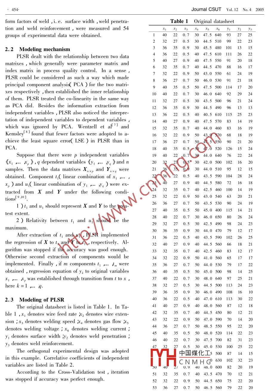 Vol.12 No. 4J. CENT. SOUTH UNIV. TECHNOL.Aug.2005Article ID :1005 - 9784( 2005 )04 - 0453 - 06Analysis and application of partial least squareregression in arc welding processYANG Hai-lan( 楊海瀾),CAI Yan(蔡艷),BAO Ye-feng( 包曄峰) ZHOU Yun(周昀)( Institute of Weld Engineering , Shanghai Jiaotong University , Shanghai 200030 , China )Abstract : Because of the relativity among the parameters , partial least square regressior( PLSR )was applied to build themodel and get the regression equation. The improved algorithm simplified the calculating process greatly because of the re-duction of calculation. The orthogonal design was adopted in this experiment. Every sample had strong representation ,which could reduce the experimental time and obtain the overall test data. Combined with the formation problem of gas met-al arc weld with big current , the auxiliary analysis technique of PLSR was discussed and the regression equation of form fac-tors( i. e. surface width , weld penetration and weld reinforcement ) to process parameters( i. e. wire feed rate , wire exten-sion , welding speed , gas flow , welding voltage and welding current )was given. The correlativity structure among variableswas analyzed and there was certain correlation between independent variables matrix X and dependent variables matrix Y.The regression analysis shows that the welding speed mainly influences the weld formation while the variation of gas flow incertain range has lttle influence on formation of weld. The ftting plot of regression accuracy is given. The ftting quality ofregression equation is bascally satisfactory.Key words : PLSR ; regression modeling ; formation of weldCLC number : TG409Document code : A1 INTRODUCTIONdimension while modeling ,so the characteristics ofmultivariate data could be observed on 2-dimensionalAr+ CO2 gas shielded weld was one of the mainplane. After PLSR analysis , not only the regressionwelding methods in production. The problem was howmodel could be obtained , but also the correlation ato make sure the shape and size of weld beam meet re-mong variables and the similarity among sample pointsquirements. Generally , formation of weld was denotedcould be observed , which made the analytical contentby surface width , weld penetration and weld reinforce-of data system more plentiful and gave the more de-ment. There were too many factors , which influencedtailed and practical explanation to the regression mod-the formation of weld. In Ar + CO2 gas shielded weld ,elf6]. In this paper , we took the formation of gas metalit mainly depended on welding current , welding voltageare weld( GMAW ) welding with big current for exam-and welding speed ete1].ple , then the specific analysis and application processBecause of the strong coupling among process pa-of PLSR were described in detail. Finally , the regres-rameters and large numbers of random and uncertainsion model of form factors to process parameters wasfactors , it is diffcult to build the model about arcgiven.welding process. The partial least square regression( PLSR ) was a new multivariate statistical analysis2 EXPERIMENTALmethod , which emphasized on the regression modelingof multiple dependent variables to multiple independent2.1 Experimental procedurevariables23].Especially for the relativity problem a-Inversion power supply with constant voltage out-mong multiple variables , its analysis results were moreput , rated current of 1 500 A was used in the experi-reliable and integral. Besides , PLSR could implementment. The feed rate was adjustable from 0. 5 tothe comprehensive application of various multivariate50 m/ min. Bead-on-plate weld with d1. 2 mm weldingstatistical analysis methods. The regression modelingwire was taken on steel plate. Shielding gas was mainlydata simplification and relativity analysis were includedAr中國煤化工2. To get rid of the 0x-in single algorithm , which greatly facilitated the multi-ide:MHCNMHthe plates were sandedvariate system analysis45]. PLSR reduced theoy the scounng wileel Deiore weld. After weld , the①Received date. : 2004 -07 - 28 ; Accepted date :2004 - 10 -07Correspnde&帶ANG Hai-lan , Doctoral candidate ;Tel : + 86-21 62932585 ; E-mail : yh12005@ sjtu. edu. cn, 454.Jourmal CSUT Vol. 12 No.4 2005form factors of weld ,i. e. surface width , weld penetra-Table 1 Original datasheettion and weld reinforcement , were measured and 54x_x2X3x4xsx6yYz Y:groups of experimental data were obtained. .40220.73047.564093272:32270.53044.551094)22223336350.93045.548010113152. 2 Modeling mechanism36220.54047.56101112622PLSR dealt with the relationship between two data20 18matrixes , which generally were parameter matrix and2350.74044.5470881617index matrix in process quality control. In a sense ,32220.95043.055024 19PLSR could be considered as such a way which made36270.75046.0530912118principal component analysis( PCA ) for the two matri-40 3:0.5 50 47.5 500 114 17 20xes respectively , then established the inner relationship040220.73046.0640922924of them. PLSR treated the co-linearity in the same way32 2).5 30 43.5 500124as PCA did. Besides the information extraction from136350.93044.5490961313independent variables , PLSR also noticed the interpre-tation of independent variables to dependent variables,40270.94047.5570831419which was ignored by PCA. Wentzell et alf7] and32 35 0.7 40 44.0 46016Kemsley8J found that fewer factors were adopted to a-1632220.95043.0570681819chieve the least square error( LSE ) in PLSR than in1736270.75047.5550902120PCA.1840350.55047.05201261524Suppose that there were p independent variables940220.73044.06407622224{x .. x},q dependent variables {y1 .. vq }and n).5 3042.0500 102 16 20samples. Then the data matrixes Xnxp and Ywere2136350.93044.0510951215obtained. Component 1( linear combination of x ...,xp ) and u( linear combination of y ... dyq ) were ex-40270.94044.5580721618tracted from X and Y under the following condi-232 352532220.95043.054063202ltior36270.75043.553090