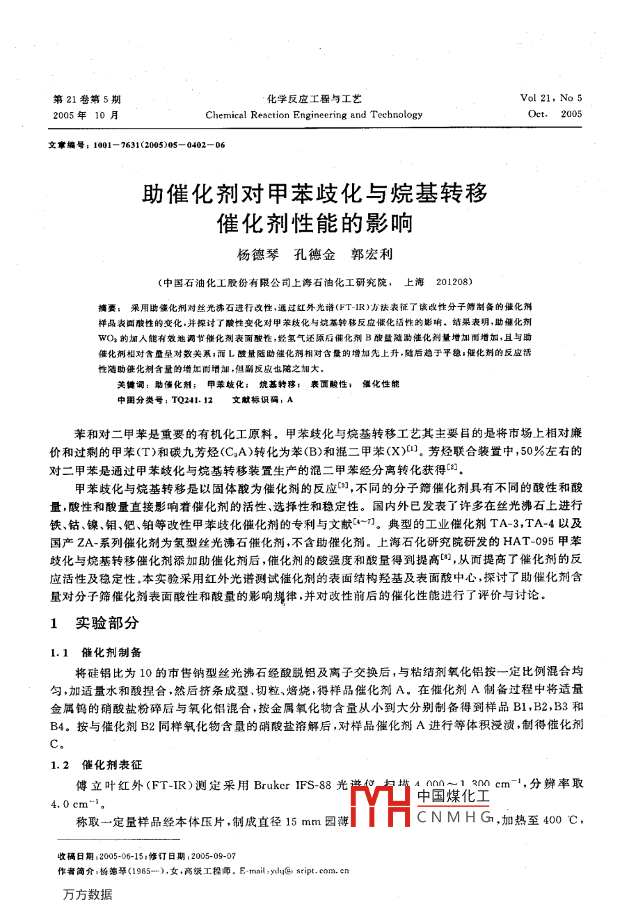 第21卷第5期化學反應工程與工藝Vol 21, No 52005年10月Chemical Reaction Engineering and TechnologyOct.2005文章編號;1001-763102005)05-0402-06助催化劑對甲苯歧化與烷基轉移催化劑性能的影響楊德琴孔德金郭宏利中國石油化工股份有限公司上海石油化工研究院,上海201208)要:采用助催化劑對絲光沸石進行改性,通過紅外光譜(FT-IR)方法表征了該改性分子篩制備的催化劑樣品表面酸性的變化,并探討了酸性變化對甲苯垓化與烷基轉移反應催化活性的影響。結果表明,助催化劑wo3的加人能有效地調(diào)節(jié)催化劑表面酸性,經(jīng)氫氣還原后催化劑B酸量隨助催化劑量增加而增加,且與助催化劑相對含量呈對數(shù)關系;而L酸量隨助催化劑相對含量的增加先上升,隨后趨于平穩(wěn);催化劑的反應活性隨助催化劑含量的增加而增加,但副反應也隨之加大。關鍵詞:助催化劑;甲苯歧化;烷基轉移:表面酸性;催化性能中圖分類號:TQ241.12文獻標識碼:A苯和對二甲苯是重要的有機化工原料。甲苯歧化與烷基轉移工藝其主要目的是將市場上相對廉價和過剩的甲苯(T)和碳九芳烴C2A)轉化為苯(B)和混二甲苯(X)口。芳烴聯(lián)合裝置中,50%左右的對二甲苯是通過甲苯歧化與烷基轉移裝置生產(chǎn)的混二甲苯經(jīng)分離轉化獲得2甲苯歧化與烷基轉移是以固體酸為催化劑的反應,不同的分子篩催化劑具有不同的酸性和酸量,酸性和酸量直接影響著催化劑的活性選擇性和穩(wěn)定性。國內(nèi)外已發(fā)表了許多在絲光沸石上進行鐵鈷、鎳鉬、鈀、鉑等改性甲苯歧化催化劑的專利與文獻-7。典型的工業(yè)催化劑TA-3,TA-4以及國產(chǎn)ZA-系列催化劑為氫型絲光沸石催化劑,不含助催化劑。上海石化研究院研發(fā)的HAT095甲苯歧化與烷基轉移催化劑添加助催化劑后,催化劑的酸強度和酸量得到提高,從而提高了催化劑的反應活性及穩(wěn)定性。本實驗采用紅外光譜測試催化劑的表面結構羥基及表面酸中心,探討了助催化劑含量對分子篩催化劑表面酸性和酸量的影響規(guī)律,并對改性前后的催化性能進行了評價與討論。1實驗部分1.1催化劑制備將硅鋁比為0的市售鈉型絲光沸石經(jīng)酸脫鋁及離子交換后,與粘結劑氧化鋁按一定比例混合均勻,加適量水和酸捏合,然后擠條成型、切粒、焙燒,得樣品催化劑A。在催化劑A制備過程中將適量金屬鎢的硝酸鹽粉碎后與氧化鋁混合,按金屬氧化物含量從小到大分別制備得到樣品B1,B2,B3和B4。按與催化劑B2同樣氧化物含量的硝酸鹽溶解后,對樣品催化劑A進行等體積浸漬,制得催化劑12催化劑表征傅立葉紅外(FT-IR)測定采用 Bruker IFs88光A~1n0cm-1,分辨率取中國煤化工4.0cm稱取一定量樣品經(jīng)本體壓片,制成直徑15m園薄YHCNMHG,加熱至400C,收稿日期:2005-06-15;修訂日期:2005-09-07作者簡介:楊德琴(1965—),女,高級工程師, E-mail:ylu@ sript,com,cn第21卷第5期楊德琴等,助催化劑對甲苯歧化與烷基轉移催化劑性能的影響403抽真空脫水3h,降至室溫后測試樣品表面OH基團,然后在200C下進行吡啶吸附,程序脫附溫度為150~440℃,脫附速率6C/min,每間隔50℃進行原位IR掃描,獲得不同脫附溫度下的原位IR譜帶實驗以吡啶為吸附劑,在不同脫附溫度下,用原位IR-TPD方法對樣品表面B酸中心(1543cm-1),L酸中心(1450cm-1)進行表征13催化劑反應活性評價催化劑反應活性在固定床反應器上進行評價。催化劑裝填量5g,流程如圖1。反應原料為工業(yè)級甲苯(T)與碳九芳烴(C3A),T/CA=60/40mass)。反應原料在反應器內(nèi)預熱、汽化、加熱后在催化劑床層發(fā)生甲苯歧化與烷基轉移反應。液體芳烴原料和液體反應產(chǎn)物組成采用氣相色譜分析方法。使用氫火焰離子化檢測器,修正面積歸一法定量圖1反應裝置流程簡圖催化劑反應性能以甲苯轉化率,CA轉化Fig 1 Schematic Diagram of Reaction Syster率,總轉化率及苯和C3A選擇性表示,計算公H2 cylinder: 2-desiccatori 3-feed stock: 4-electronic scale5-feed pump: 6-reactor: 7-product triturium: 8-rotameter式如下:甲苯轉化率(x7)=反應掉的甲苯質量進反應器的甲苯質量×100%CBACA轉化率(xcA)=進反應器的CA質量×100%總轉化率(x)=反應掉的甲苯和CA質量和×100%生成的苯和C8A質量和苯和CA選擇性(S)=反應掉的甲苯和CA質量和×100%2實驗結果和討論2.1助催化劑對催化劑表面酸性的影響2.1.1助催化劑對催化劑B酸中心的影響圖2為樣品A,B2,C的IR圖譜,各樣品經(jīng)脫水后均出現(xiàn)3610cm1吸收譜帶,該譜帶歸屬氫型絲光沸石中的B酸中心,即與骨架鋁相連OH基團(S-OHA1)910。絲光沸石經(jīng)不同元素改性均會引起其酸量的改變。圖2表明,金屬助催化劑的加入加強了中國煤化工3610cm-譜帶強度,但鎢的兩種不同加入方式34003300對譜帶強度的影響程度不同。A,B2,C三樣品IRCNMHG圖譜中的OH基團峰面積相對值分別為100,圖2樣品IR譜圖117,164。以浸漬方式制備的樣品C譜帶強度高Fig 2 IR Spectra of Samples404化學反應工程與工藝2005年10月于混合方式制備的樣品B2。這可能是因為浸漬方式可使WO3比較均勻地分布到絲光沸石微孔內(nèi)部,而機械混合方式則較難使WO3均勻地分布到絲光沸石內(nèi)表面122.1.2助催化劑含量對催化劑酸性的影響圖3為助催化劑添加量對催化劑表面OH影響。圖4為助催化劑添加量與催化劑B酸中心的關系。由圖3和圖4可知,當助催化劑相對添加量小于20%時,隨著鎢加入量的增加,3610cm-1譜帶強度明顯加強,催化劑表面B酸中心量增加;鎢相對添加量20%時,