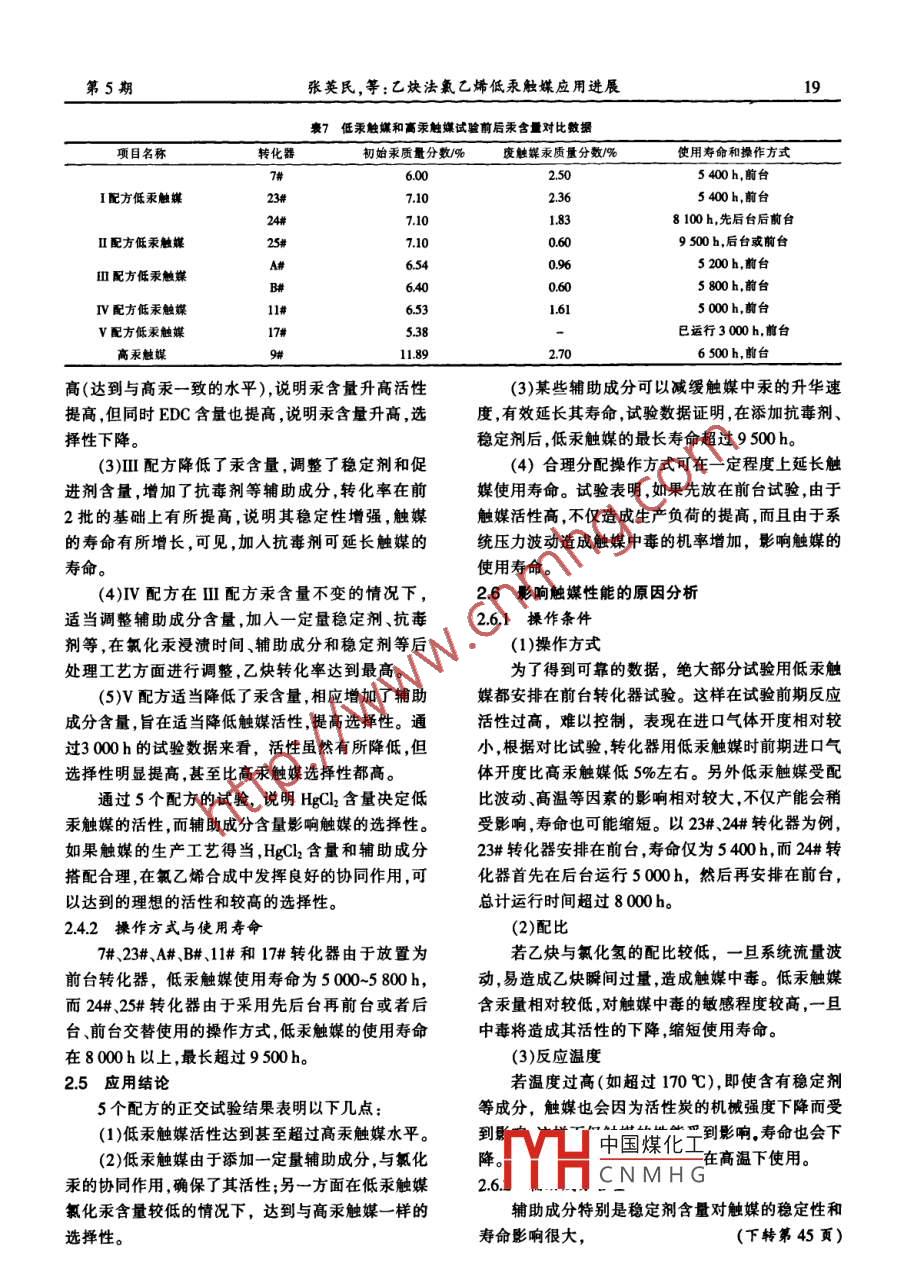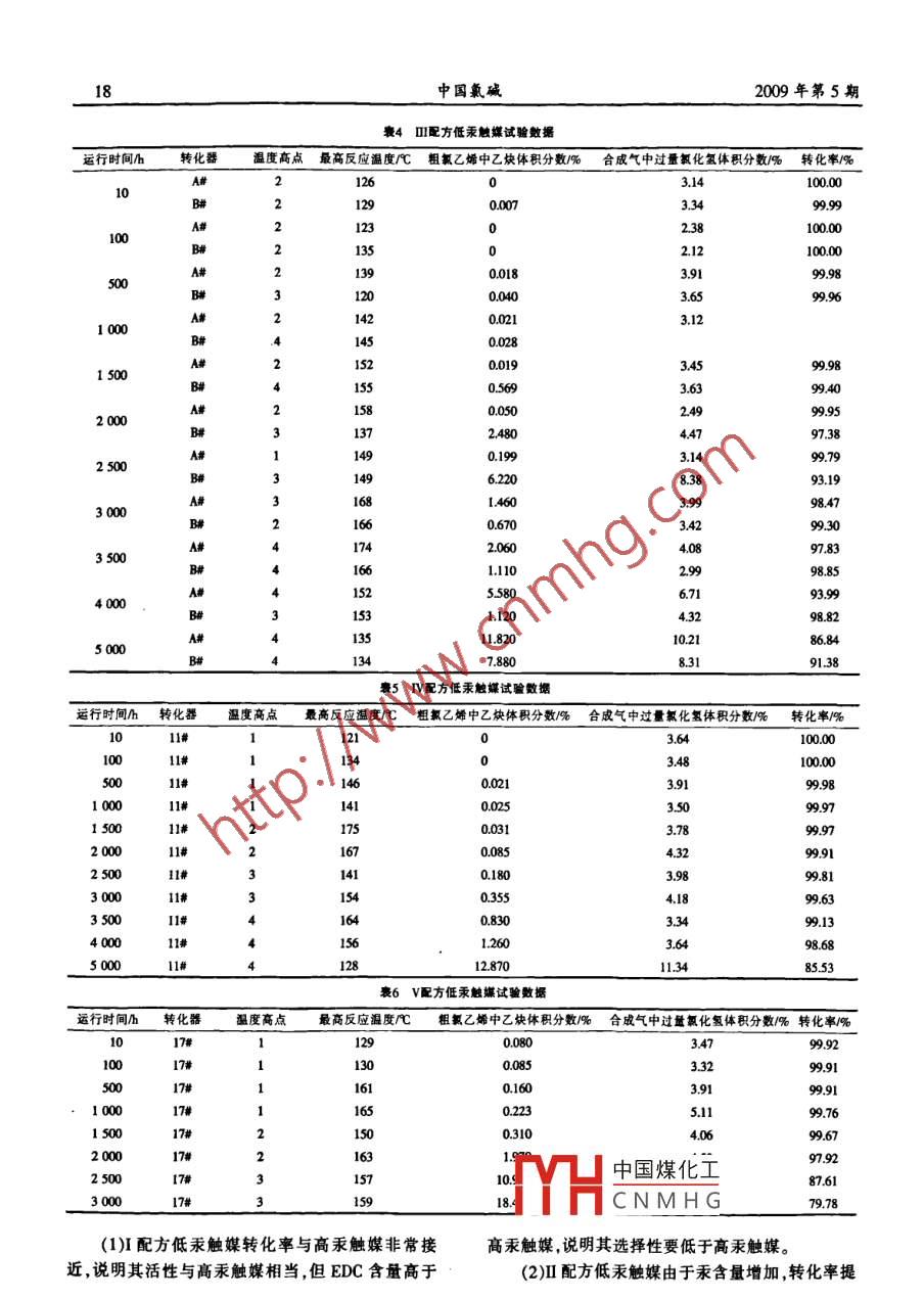第5期中國氯堿No.52009年5月China Chlor-AlkaliMay,2009乙炔法氯乙烯低汞觸媒應(yīng)用進(jìn)展張英民,郎需霞,梁錫偉,梁興(青島海晶化工集團(tuán)有限公司,山東青島266042)摘要:介紹了乙炔法氯乙烯合成中低汞觸媒的試用情況。與高汞觸媒進(jìn)行性能比較,分析了影響觸媒性能的因素。應(yīng)用情況表明,采用合理的配方及合適的操作條件,低汞觸媒可以代替高汞觸媒。關(guān)鍵詞:PVC;乙炔法;氯乙烯;低汞觸媒;應(yīng)用中圖分類號:TQ325.3文獻(xiàn)標(biāo)識碼:B文章編號:1009-1785(2009)05 -0016 -04Development of application of low mercury catalyst of vinylchloride by acetylene methodZHANG Ying min, LANG Xu xian, LIANG Xi -wei, LIANG Xing(Qingdao Hajing Chemical and Industry Group, Qingdao 266042, China)Abstract: The tryout status of low mercury catalyst in synthesis of vinyl chloride by acetylene method wasintroduced, and capacity of low and high mercury catalyst was compared. The influential factors of capacity ofcatalyst were analysed. High mercury catalyst was replaced by low mercury catatlyst with the rational formulaand feasible operation station.Key words: PVC; acetylene method; vinyI chloride; low mercury catalyst; application1國內(nèi)外低汞 .無汞觸媒的開發(fā)概況工藝,含汞觸媒失去市場而未進(jìn)一步研究。 近幾年目前,中國乙炔法PVC產(chǎn)能達(dá)到1 200萬t/a。隨著中國電石法市場的發(fā)展,該公司在以前的基礎(chǔ)汞觸媒是乙炔法氯乙烯合成中的催化劑,隨著國際上繼續(xù)進(jìn)行試驗,并取得突破性進(jìn)展:(1)肯定了新社會對汞消耗及汞污染的重視和關(guān)注,開創(chuàng)新的治型無汞觸媒使用壽命要比汞觸媒長(具體使用壽命.理方法,減少汞的使用和排放,成為我國乙炔法聚氯尚需驗證);(2)最初無汞觸媒的價格為高汞觸媒的乙烯發(fā)展的必由之路。根據(jù)粗略統(tǒng)計計算,2007年10倍,經(jīng)過攻關(guān),已降至5倍左右。乙炔法生產(chǎn)聚氯乙烯汞用量約650t,占國內(nèi)汞總用1.2 國內(nèi)低汞觸媒的開發(fā)情況量的50%;如果不能改變現(xiàn)狀,到2010年,PVC行2000年,國內(nèi)開始進(jìn)行新型低汞觸媒和無汞觸業(yè)對汞的需求量將達(dá)到1 000t,越來越多的乙炔法:媒的開發(fā)與研究。其中,河北石家莊科創(chuàng)助劑有限PVC企業(yè)將因為觸媒供應(yīng)不足而不得不關(guān)停。公司在觸媒開發(fā)研究方面走在全國前列。該公司1.1 國外無汞觸媒的開發(fā)情況2005年開始新型環(huán)保低汞觸媒產(chǎn)品的開發(fā),產(chǎn)品先中國PVC行業(yè)的飛速發(fā)展引起全世界的廣泛后在錦化集團(tuán)、海晶化工、新疆天業(yè)、河北盛華等企關(guān)注,在汞觸媒的研究方面,表現(xiàn)突出的是總部設(shè)在業(yè)投人使用,應(yīng)用后生產(chǎn)運(yùn)行穩(wěn)定、易于控制,各項揶威的世界級承包商和技術(shù)供應(yīng)商阿克克瓦納公指標(biāo)均達(dá)到了設(shè)計要求,獲得-致好評。在國內(nèi)尚未司,其創(chuàng)始人JOHNBROWN曾是無汞觸媒的發(fā)明推中國煤化工好低汞觸媒的開發(fā)人。該公司在20世紀(jì)80年代對含汞觸媒進(jìn)行過研和內(nèi)消耗和排放。YHCNMH.究,1995年開始研究無汞觸媒(完全無汞),1996年2做麗化L1低水融樂腔m進(jìn)展在試驗裝置中進(jìn)行3個月的試驗(1 個轉(zhuǎn)化器),盡2.1低汞觸媒試驗情況管取得非常滿意的成果,但由于國外淘汰了乙炔法海晶化工從2006年9月15日開始,先后進(jìn)行第5期張英民,等:乙炔法氯乙烯低汞觸媒應(yīng)用進(jìn)展17了6個批次5種配方產(chǎn)品的應(yīng)用試驗(見表1),經(jīng). V配方:2008 -04-03- -09-18共運(yùn)行3000 h過多次調(diào)整參數(shù)和指標(biāo),產(chǎn)品配方和操作方式不斷以上。改進(jìn)和完善,取得令人滿意的效果。2.3 生產(chǎn)數(shù)據(jù).2.2 試驗時間2.3.1培養(yǎng)期試驗數(shù)據(jù)I配方:2006- -09-15- -2007-05- -20(5400h);I配方~V配方低汞觸媒培養(yǎng)期試驗數(shù)據(jù)匯總1配方重復(fù)性試驗:2006-12-09- 2007- -08 -02見表2(9#為高汞觸媒,對比試驗)。(5 400h)(23#),2.3.2正常反 應(yīng)期試驗數(shù)據(jù)2006- -12- _09- 2007- -12-12(8100 h)(24#);II配方低汞觸媒培養(yǎng)期后試驗數(shù)據(jù)見表3。II配方:2007-04- -23- 2008 -06-16 (9 500 h)II配方低汞觸媒培養(yǎng)期后試驗數(shù)據(jù)見表4。(25#);IV配方低汞觸媒培養(yǎng)期后試驗數(shù)據(jù)見表5。II配方:2007- 08-03- -2008-03-10 (5 200 h)V配方低汞觸媒培養(yǎng)期后試驗數(shù)據(jù)見表6。(A#),汞含量分析數(shù)據(jù)見表7。.2007-08- -03- -2008 -04-16(5 800 h)(B#);2.4 試驗分析IV配方:2007- -09 -25- -2008-04 -26 (5 000 h)2.4.1配方與產(chǎn) 品性能(11#);表2~表7數(shù)據(jù)表明以下幾點(diǎn):表1低汞觸媒汞含 分析數(shù)掘匯總生產(chǎn)批號觸媒用量水分/% 氧化錄質(zhì)量分?jǐn)?shù)/% 試驗轉(zhuǎn)化器 轉(zhuǎn) 化器規(guī)格/mm備注2006- 09-15- 2007-05-20I.06.007102 400前臺2006-12-09- 2007-12-1217.1023#.24#前、后臺2006 09-15- 200-06-16高汞2.511.899#2007-04 -23- 2008-06 -16n8.07.1025#前或后臺2007-07-11- -2008- -04-1613.00.156.54A#、阱03 5002007-09- _25- -2008 04 -26IV0.136.5311#2008- 04- -03至今v0.25.3817#.18#前后臺t2 培養(yǎng)期低汞觸媒試驗記錄配方轉(zhuǎn)化器1點(diǎn)溫度2點(diǎn)溫度 3點(diǎn)溫度 4 點(diǎn)溫度1-4點(diǎn)平均 CH2質(zhì)量 EDC質(zhì)量 HCI 質(zhì)量閥門開度轉(zhuǎn)化事C溫度/C分?jǐn)?shù)/%分?jǐn)?shù)/% .1%741346231040.1920.2522.37