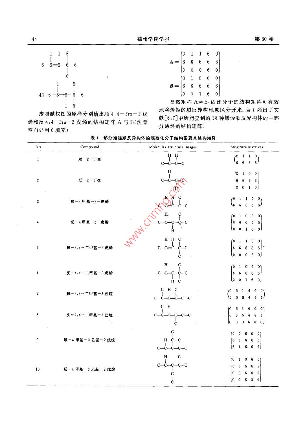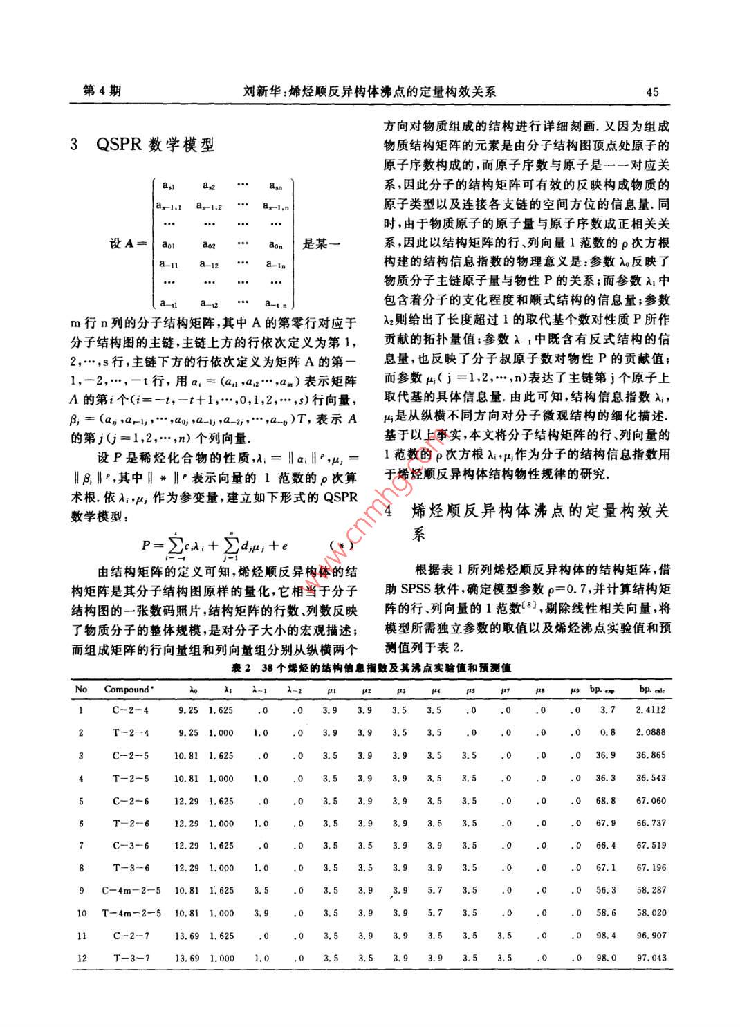 14德州學(xué)院學(xué)報第30卷6(011601A=6666601060)6.666600160]顯然矩陣A≠B,因此分子的結(jié)構(gòu)矩陣可有效按照賦權(quán)圖的原樣分別給出順4,4-2m-2戊地將烯烴的順反異構(gòu)現(xiàn)象區(qū)分開來. 表1列出了文烯和反4,4- 2m-2戊烯的結(jié)構(gòu)矩陣A與B(注意獻(xiàn)[6,7]中所能查到的38種烯烴順反異構(gòu)體的一-部空白處用0填充)分烯烴的結(jié)構(gòu)矩陣.表」部分烯烴順反異構(gòu)體的規(guī)范化分子結(jié)構(gòu)圉及其結(jié)構(gòu)矩陣NcCompoundMolecular structure imagesStructure matrixes1順-2-丁烯.c-c-C-c(6.6)H2反-2-丁烯C--C-C-C(0100)6666|(001o順-4甲基-2-戊婿HHC(°11ε)cocbc反-4甲基-2-戊烯(00100)aH5順-4,4-二甲基-2戊烯.C-0C-C-C00060)反-4,4-二甲基-2戊婼順-2,4-二甲基-3己烷CHCc-c(°6160°)cH反-2.4一二甲基-3已烷00060o)順-4甲基-3乙基-2戊烷(66666,HC10反-4甲基-3乙基-2戊烷C-C-C-C00600]第4期劉新華:烯烴順反異構(gòu)體沸點的定量構(gòu)效關(guān)系5方向?qū)ξ镔|(zhì)組成的結(jié)構(gòu)進(jìn)行詳細(xì)刻畫.又因為組成3 QSPR數(shù)學(xué)模型物質(zhì)結(jié)構(gòu)矩陣的元素是由分子結(jié)構(gòu)圖頂點處原子的原子序數(shù)構(gòu)成的,而原子序數(shù)與原子是一一對應(yīng)關(guān)as1as2 .. as系,因此分子的結(jié)構(gòu)矩陣可有效的反映構(gòu)成物質(zhì)的8--1.1 ag-1.2 " ag-1,n原子類型以及連接各支鏈的空間方位的信息量.同時,由于物質(zhì)原子的原子量與原子序數(shù)成正相關(guān)關(guān)設(shè)A=| aolao是某一系,因此以結(jié)構(gòu)矩陣的行、列向量1范數(shù)的ρ次方根構(gòu)建的結(jié)構(gòu)信息指數(shù)的物理意義是:參數(shù)λ。反映了物質(zhì)分子主鏈原子量與物性P的關(guān)系;而參數(shù)入:中包含著分子的支化程度和順式結(jié)構(gòu)的信息量;參數(shù)m行n列的分子結(jié)構(gòu)矩陣,其中A的第零行對應(yīng)于λ2則給出了長度超過1的取代基個數(shù)對性質(zhì)P所作分子結(jié)構(gòu)圖的主鏈,主鏈上方的行依次定義為第1,貢獻(xiàn)的拓?fù)淞恐?參數(shù)λ-1中既含有反式結(jié)構(gòu)的信2...s行,主鏈下方的行依次定義為矩陣A的第-息量,也反映了分子叔原子數(shù)對物性P的貢獻(xiàn)值;1,-2...-t行,用a; = (an ,a*.,an)表示矩陣而參數(shù)μ;( j =1,2,.",n)表達(dá)了主鏈第j個原子上A的第i個(i=-t,-t+...,0,.2...s)行向量,取代基的具體信息量.由此可知,結(jié)構(gòu)信息指數(shù)入,β, = (a,a,r,".,ao,a-,a. e.,*,a,)T,表示Aμ;是從縱橫不同方向?qū)Ψ肿游⒂^結(jié)構(gòu)的細(xì)化描述.的第j(j=1,2,-.,n)個列向量.基于以上事實,本文將分子結(jié)構(gòu)矩陣的行、列向量的設(shè)P是稀烴化合物的性質(zhì),入;= lall',p,=1范數(shù)的p次方根λi,μ作為分子的結(jié)構(gòu)信息指數(shù)用I|1I',其中1| * |I' 表示向量的1范數(shù)的ρ次算.于烯烴順反異構(gòu)體結(jié)構(gòu)物性規(guī)律的研究.術(shù)根.依λ;,p;作為參變量,建立如下形式的QSPR數(shù)學(xué)模型:4烯烴順反異構(gòu)體沸點的定量構(gòu)效關(guān)P= 2ex;+ Ed,u,+e(*)由結(jié)構(gòu)矩陣的定義可知,烯烴順反異構(gòu)體的結(jié)根據(jù)表1所列烯烴順反異構(gòu)體的結(jié)構(gòu)矩陣,借構(gòu)矩陣是其分子結(jié)構(gòu)圖原樣的量化,它相當(dāng)于分子助SPSS軟件,確定模型參數(shù)p=0. 7,并計算結(jié)構(gòu)矩結(jié)構(gòu)圖的一張數(shù)碼照片,結(jié)構(gòu)矩陣的行數(shù)列數(shù)反映陣的行、列向量的1范數(shù)[8] ,剔除線性相關(guān)向量,將了物質(zhì)分子的整體規(guī)模,是對分子大小的宏觀描述;模型所需獨立參數(shù)的取值以及烯烴涕點實驗值和預(yù)而組成矩陣的行向量組和列向量組分別從縱橫兩個測值列于表2.喪2 38個烯烴的結(jié)構(gòu)信息指數(shù)及其沸點實驗值和預(yù)測值No Compound*。 λ1 λ-1 A-zμiμ2必μμsp8 μ9 bp.c坤bp. aleC-2-49.25 1.625.0.93.72. 4112T-2-49.25 1. 0003.93.53.0.82. 0888C-2-510.81 1. 62503.53.93.93.53.536. 865T-2-510.81 1. 0000) 3.53.9 3.9 3.5 3.36.336. 543C-2-612.29 1. 625)3.53.93.93.53.50 68.867. 060T-2-612.29 1 000 .1.00 67.966. 737C-3-603.53.53.93.93.5066.67. 519 .T- 3-612.29 1. 000.) 3.5 3.5 3.9 3.9 3.567. 1969 C-4m-2-5 10.81 I.625 .3.5.03.53.93.95.73.558. 28710 T-4m-2-5 10.81 1.0003.958.658. 020C-2-713.69 1.625..536. 90712T-3-713.691. 000.53.53.93.93.53.97.043.46德州學(xué)院學(xué)報第30卷No Compound*λo λ1 λ-1-2451748pu9 bp.oxpbp. ale13C-3-713.69 1. 625.(.0.5 3.5 3.9 3.9 3.5 3.5.0 95.8 97.36613. 69 1. 0001.0.595. 796. 584 .15 C-4m-2-6 12.29 1.6253.5.03.53.93.95.73.586.388. 48116 T-4m-2-6 12.29 1.00003.53.93.95.73.5,0 87.6 88.487C-5m-2-6 12.29 1. 6253.5 3.9.989.5 87. 53418 T-5m-2-6 12.29 1.000 .88.187. 53919 C- -2m-3-612. 291. 6253.503.55.7,3.93.93.5086. 42503.55.73.93.93.50 85.9 86. 43021 C-44mm-2-5 10.81 4. 28780. 477.83122 T-44mm-2-5 10.81 3.905 3.903.53.93.97.63.576. 777. 654C-2-815.03 1. 625 .0 3.5 3.9 3.9 3.5 3.5 3.5 3.5 .0 125.6 124.13T-2-815.03 1. 0003.90 125.0123. 8125C-3-8.15.03 1. 625) 3.5 3.5 3.9 3.9 3.5 3..0 122.9124. 592T-3-815.031.000 1. 003.53.53.93.93.53.53.5.0123.3124. 27C-4-815.031. 625) 3.5 3.5 3.5 3.9 3.9 3.5 3.5. 0 122.5 122. 56T-4-8122.2429 C-5m5m-2-6 12.29 4.287 3. 503.53.93.93.57.6106. 2730 T-5m5m-2-6 12.29 3.905 3. 9) 3.5 3.9 3.9 3.5 7.6.0 104.1106. 09.31 C- 2m2m-3-6 12.29 4. 287103. 8232 T- 2m2m- -3-612.29 3.905 3. 90 3.5 7.6 3.103. 6433 C- -2m4m-3-6 12.29 1.625 5.70 3.5 5.7 3.9 6.0 3.5.0 109.0107. 2634 T- -2m4m-3-6 12.29 1. 00006.0 3.0 107.6107. 0035 C-4m3e-2-5 10.81 1.625 5.7 3.5 3.115. 236 T-4m3e-2-5 10.81 1.000 6.0 3.