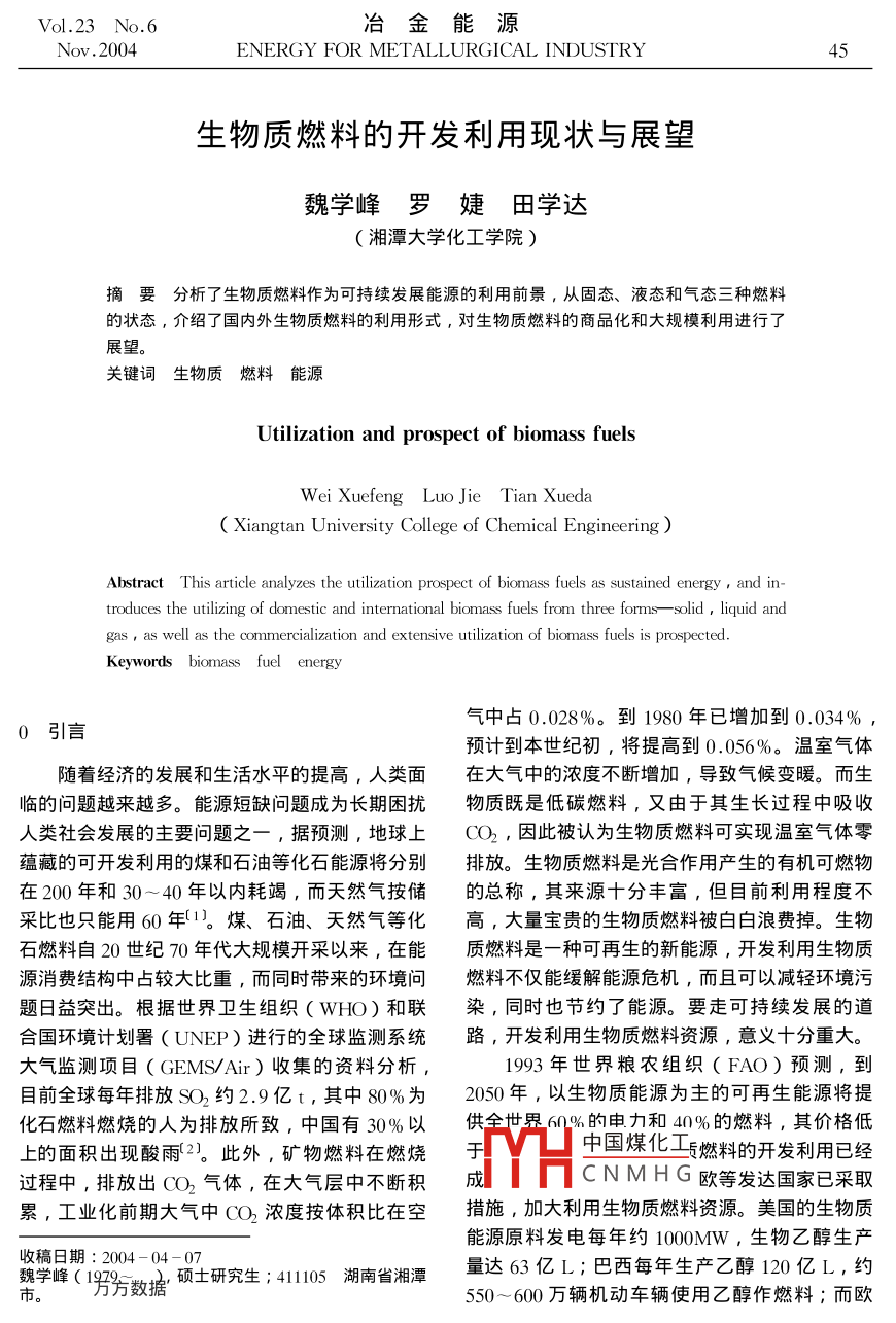 Vol 23 No 6冶金能源Nov.2004ENERGY FOR METALLURGICAL INDUSTRY4生物質(zhì)燃料的開發(fā)利用現(xiàn)狀與展望魏學(xué)峰羅婕田學(xué)達(dá)湘潭大學(xué)化工學(xué)院)摘要分析了生物質(zhì)燃料作為可持續(xù)發(fā)展能源的利用前景,從固態(tài)、液態(tài)和氣態(tài)三種燃料的狀態(tài),介紹了國(guó)內(nèi)外生物質(zhì)燃料的利用形式,對(duì)生物質(zhì)燃料的商品化和大規(guī)模利用進(jìn)行了展望。關(guān)鍵詞生物質(zhì)燃料能源Utilization and prospect of biomass fuelsWei Xuefeng Luo Jie Tian XuedaXiangtan University College of Chemical EngineeringAbstract This article analyzes the utilization prospect of biomass fuels as sustained energy and introduces the utilizing of domestic and international biomass fuels from three forms--solid liquid andgas as well as the commercialization and extensive utilization of biomass fuels is prospectedKeywords biomass fuel energy氣中占0.028%。到1980年已增加到0.034%引言預(yù)計(jì)到本世紀(jì)初,將提高到0.056%。溫室氣體隨著經(jīng)濟(jì)的發(fā)展和生活水平的提高,人類面在大氣中的濃度不斷增加,導(dǎo)致氣候變暖。而生臨的問題越來(lái)越多。能源短缺問題成為長(zhǎng)期困擾物質(zhì)既是低碳燃料,又由于其生長(zhǎng)過(guò)程中吸收人類社會(huì)發(fā)展的主要問題之一,據(jù)預(yù)測(cè),地球上OO2,因此被認(rèn)為生物質(zhì)燃料可實(shí)現(xiàn)溫室氣體零蘊(yùn)藏的可開發(fā)利用的煤和石油等化石能源將分別排放。生物質(zhì)燃料是光合作用產(chǎn)生的有機(jī)可燃物在200年和30~40年以內(nèi)耗竭,而天然氣按儲(chǔ)的總稱,其來(lái)源十分豐富,但目前利用程度不采比也只能用60年(1)。煤、石油、天然氣等化高,大量寶貴的生物質(zhì)燃料被白白浪費(fèi)掉。生物石燃料自20世紀(jì)70年代大規(guī)模開采以來(lái),在能質(zhì)燃料是一種可再生的新能源,開發(fā)利用生物質(zhì)源消費(fèi)結(jié)構(gòu)中占較大比重,而同時(shí)帶來(lái)的環(huán)境問燃料不僅能緩解能源危機(jī),而且可以減輕環(huán)境污題日益突出。根據(jù)世界衛(wèi)生組織(WHO)和聯(lián)染,同時(shí)也節(jié)約了能源。要走可持續(xù)發(fā)展的道合國(guó)環(huán)境計(jì)劃署(UNP)進(jìn)行的全球監(jiān)測(cè)系統(tǒng)路,開發(fā)利用生物質(zhì)燃料資源,意義十分重大。大氣監(jiān)測(cè)項(xiàng)目((EMsS/Air)收集的資料分析1993年世界糧農(nóng)組織(FAO)預(yù)測(cè),到目前全球每年排放SO約2.9億t,其中80%為2050年,以生物質(zhì)能源為主的可再生能源將提化石燃料燃燒的人為排放所致,中國(guó)有30%以供全世果%的由力和40%的燃料,其價(jià)格低上的面積出現(xiàn)酸雨2)此外,礦物燃料在燃燒于中國(guó)煤化工燃料的開發(fā)利用已經(jīng)過(guò)程中,排放出O2氣體,在大氣層中不斷積成CNMHG歐等發(fā)達(dá)國(guó)家已采取累,工業(yè)化前期大氣中(O’濃度按體積比在空措施,加大利用生物質(zhì)燃料資源。美國(guó)的生物質(zhì)能源原料發(fā)電每年約1000MW,生物乙醇生產(chǎn)收稿日期:2004-04-07魏學(xué)峰(19男為數(shù)接碩士研究生;411105湖南省湘潭量達(dá)63億L;巴西每年生產(chǎn)乙醇120億L,約市550~600萬(wàn)輛機(jī)動(dòng)車輛使用乙醇作燃料;而歐冶金能源Vol 23 No 6ENERGY FOR METALLURGICAL INDUSTRYNov.2004淵、瑞典、丹麥、奧地利、芬蘭、波蘭和英國(guó),在,綠色植物光合作用就不會(huì)停止,因此,生物在生物質(zhì)能源生產(chǎn)和利用領(lǐng)域走在前列,消費(fèi)量質(zhì)燃料是理想的可再生能源3-6。占能源總量的7%~18%。2生物質(zhì)燃料的利用1生物質(zhì)燃料目前,生物質(zhì)燃料的利用方式很多。一般可1.1生物質(zhì)和生物質(zhì)能劃分為固態(tài)、液態(tài)和氣態(tài)生物質(zhì)燃料。生物質(zhì)能是由太陽(yáng)能轉(zhuǎn)化而來(lái),地球上的綠2.1固態(tài)生物質(zhì)燃料色植物、藻類和光合細(xì)菌通過(guò)光合作用(即利用應(yīng)用最早和目前應(yīng)用最多的生物質(zhì)燃料是固空氣中的二氧化碳和土壤中的水,將吸收的太陽(yáng)態(tài)的能轉(zhuǎn)換成碳水化合物的過(guò)程),儲(chǔ)存化學(xué)能。其1)直接燃燒。通過(guò)直接燃燒生物質(zhì)而獲得化學(xué)反應(yīng)式熱能是目前生物質(zhì)能利用的最主要方式。直接燃6CO+6HO-6O2+CH12O3+1840kJ/mol燒所耗用的生物質(zhì)能源主要是農(nóng)作物秸稈和薪生物質(zhì)是生物質(zhì)能量的載體,是一切有生命柴。在牧區(qū)也燃用少量的牲畜糞便。該方法燃料的可以再生的有機(jī)物質(zhì)的總稱,包括動(dòng)植物和微利用效率低,為5%~15%,使得生物質(zhì)燃料被生物。可以為人類提供生物質(zhì)燃料的生物質(zhì)種類認(rèn)為是”貧窮燃料”,節(jié)能爐灶的推廣將效率提繁多,大致可以分為6大類:①木質(zhì)素:木塊、高到了25%~30%。垃圾焚燒技術(shù)屬于直接燃木屑、樹皮、樹根等;②農(nóng)業(yè)廢棄物:秸稈、果燒,目前主要的燃燒方式是改進(jìn)后的鏈條爐排和核、玉米芯、蔗渣等;③水生植物:藻類、水葫馬丁爐排等,循環(huán)流化床垃圾鍋爐等新技術(shù)正處蘆等;④油料作物:棉籽、麻籽、烏柏、油桐在發(fā)展階段,德囯、法國(guó)和美國(guó)等在垃圾的能源等;⑤加工廢棄物:食品加工廠、屠宰場(chǎng)、酒利用方面處于領(lǐng)先地位。廠