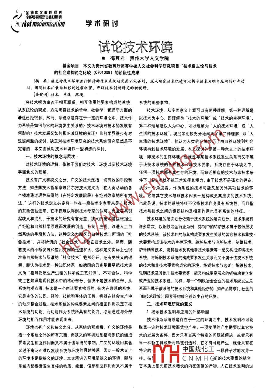 、全國中文核心期刊N寶易經(jīng)濟類聯(lián)心期刊mrket moernizaion學(xué)術(shù)研討試論技術(shù)環(huán)境■梅其君貴州大學(xué)人文學(xué)院 .基金項目:本文為貴州省教育廳高等學(xué)校人文社會科學(xué)研究項目“技術(shù)自主論與技術(shù)的社會建構(gòu)論之比較(0701008) 的階段性成果[摘 要]缺乏對技術(shù)環(huán)境進行探討的技術(shù)系統(tǒng)研究是不完善的,深入研究技術(shù)環(huán)境可以揭示技術(shù)發(fā)明與應(yīng)用的外部動因,闌明技術(shù)擴散與轉(zhuǎn)移的過程機理,開辟技術(shù)創(chuàng)新研究的新視野。[關(guān)鍵詞]技術(shù)系統(tǒng)環(huán)境將技術(shù)視為由若干相互聯(lián)系、相互作用的要素構(gòu)成的系統(tǒng),系 統(tǒng)的那些事物。從系統(tǒng)論的觀點.方法考察技術(shù)的哲學(xué).社會學(xué).管理學(xué)方面的技術(shù)環(huán)境.從字面意義上看可以有兩種理解.第一種理解是著述已經(jīng)很多。然而.系統(tǒng)總是存在于-定的環(huán)境之中. 技術(shù)作.以技術(shù)為中心, 即理解為技術(shù)的環(huán)境” 或"技術(shù)的生存環(huán)境” .為系統(tǒng)是如何與它的環(huán)境發(fā)生關(guān)系的?技術(shù)環(huán)境對技術(shù)的發(fā)展有第二種理解是以人為中心,可以理解為。 人的技術(shù)環(huán)境”或“人何影響?技術(shù)發(fā)展又如何影響其環(huán)境的變遷?目前學(xué)界很少有對生活的技術(shù)環(huán)境”。埃呂爾比較充分地闡明了第二種理解,即“人這些問題的探討.缺乏對技術(shù)環(huán)境研究的技術(shù)系統(tǒng)研究顯然是不生活的技術(shù)環(huán)境”.他認為人類的環(huán)境經(jīng)歷了由自然環(huán)境到社會完善的.本文嘗試對技術(shù)環(huán)境作-些初步的探討。環(huán)境再到技術(shù)環(huán)境的發(fā)展。本文探討的是第-種意義上的技術(shù)環(huán)一、技術(shù)環(huán)境的概念與層次境.即技術(shù)的生存環(huán)境.也就是與某技術(shù)系統(tǒng)發(fā)生關(guān)系而又不屬對技術(shù)環(huán)境的理解.依賴于我們對技術(shù).環(huán)境以及技術(shù)環(huán)境于該技術(shù)系統(tǒng)的各種技術(shù)和非技術(shù)要素。系統(tǒng)存在于環(huán)境之中.字面意義的理解。任何-項技術(shù)都有其生存的環(huán)境而缺乏相應(yīng)的技術(shù)與非技術(shù)條技術(shù)有廣義和狹義之分。廣義的技術(shù)泛指-切有效的手段和件下.該技術(shù)就不能正常發(fā)揮其能力。由于技術(shù)不是孤立的存在.方法.如法國技術(shù)哲學(xué)家埃呂爾把技術(shù)定義為“在人類活動的各從另一個角度看.作為系統(tǒng)的技術(shù)可能又是另外某項技術(shù)的環(huán)個領(lǐng)域通過理性獲得的{在 特定發(fā)展階段}有絕對效率的所有方境,它與其它技術(shù)與非技術(shù)因素一起構(gòu)成更高層次的技術(shù)系統(tǒng)。法。”這樣的技術(shù)定義必定將-些在- 般技術(shù)專 家看來是非技術(shù)也就是說,技術(shù)的系統(tǒng)特征不僅指技術(shù)自身具有系統(tǒng)性.而且指的東西包括進來它不僅難以得到技術(shù)專家的認可.而且容易引技術(shù)與技術(shù)之間的組織結(jié)構(gòu)及相互作用也具有系統(tǒng)的特征。起歧義和混亂,于技術(shù)的研究有害無益。狹義的技術(shù)是指根據(jù)生技術(shù)環(huán)境的層次劃分依賴于技術(shù)系統(tǒng)的層次劃分。技術(shù)系統(tǒng)有產(chǎn)經(jīng)驗和自然科學(xué)原理而發(fā)展的創(chuàng)造.控制.應(yīng)用.改進人工自許多層次,以鋼鐵冶金行業(yè)為例.煉鋼中的轉(zhuǎn)爐技術(shù)屬于較低層次然系統(tǒng)的手段和方法。這種定義力圖區(qū)分自然技術(shù)與所謂的”社的技術(shù)系統(tǒng).該技術(shù)外的與其構(gòu)成要索發(fā)生關(guān)系的其它技術(shù)和非技.會技術(shù)”,并將所謂的。 社會技術(shù)”排除在技術(shù)之外。然而,隨術(shù)要素構(gòu)成該技術(shù)的生存環(huán)境。轉(zhuǎn)爐技術(shù)與電爐技術(shù).制氧技術(shù).著技術(shù)的不斷發(fā)展和應(yīng)用范圍的迅速擴大.這種定義實際上也很爐外精練技術(shù).澆鑄技術(shù)及其他非技術(shù)要素等一起又構(gòu)成煉鋼技術(shù)難將自然技術(shù)與所謂的‘社會技術(shù)”截然分開。還有更狹義的理系統(tǒng)。與煉鋼技術(shù)系統(tǒng)的構(gòu)成要素發(fā)生關(guān)系而又不屬于該技術(shù)系統(tǒng)解,即認為技術(shù)是一種知識體系,如德國的貝克曼最早把技術(shù)定的技術(shù)和非技術(shù)要素構(gòu)成它的環(huán)境。煉鋼技術(shù)與選礦:煉鐵技術(shù).義為” 指導(dǎo)物質(zhì)生產(chǎn)過程的科學(xué)或工藝知識"。不可否認,科學(xué)軋鋼技術(shù)及其他非技術(shù)要素等-起又構(gòu)成更高層次的鋼鐵冶金企業(yè)或工藝知識是現(xiàn)代技術(shù)中的核心部分.但決不是技術(shù)的全部。從或產(chǎn)業(yè)的技術(shù)系統(tǒng)。同樣.與一個鋼鐵冶金企業(yè)的技術(shù)系統(tǒng)發(fā)生關(guān)系統(tǒng)的觀點看.技術(shù)是一個由諸要素構(gòu)成的.有內(nèi)在聯(lián)系的系統(tǒng),系而不屬于該系統(tǒng)的技術(shù)系統(tǒng)和其他經(jīng)濟的{如產(chǎn)品需求).社會的它是主體的知識、經(jīng)驗.技