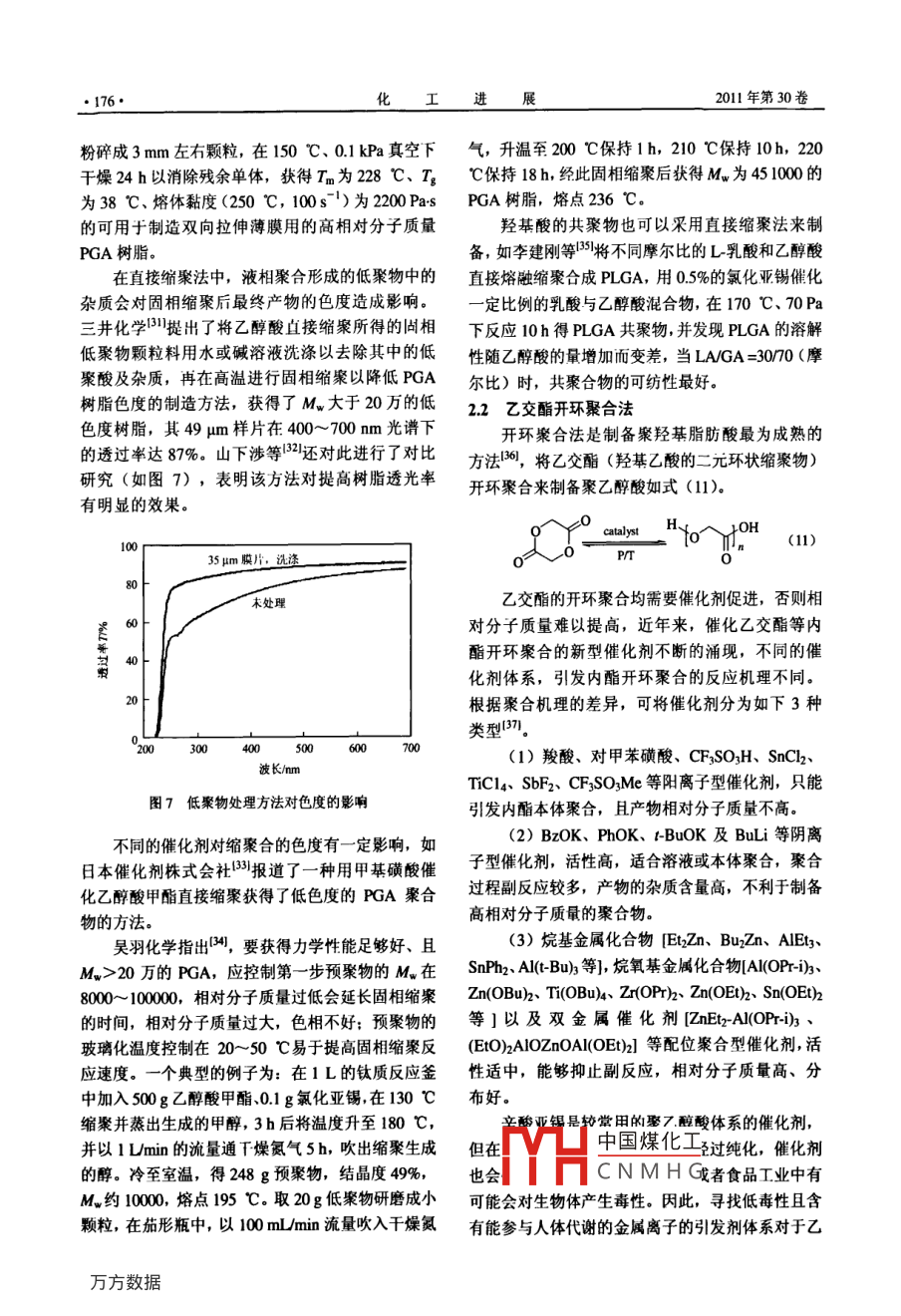 化工進展·172·CHEMICAL INDUSTRY AND ENGINEERING PROGRESS2011年第30卷第1期特約評述煤基聚乙醇酸技術(shù)進展陳許平,崔愛軍(常州大學(xué)化學(xué)化工學(xué)院,江蘇常州213164)要:從煤化工發(fā)展的角度分析了開發(fā)聚乙醇酸產(chǎn)品的重要性,介紹了聚乙醇酸優(yōu)異的阻隔性能、機槭加工生物可降解性、廣泛用途以及工業(yè)化進展狀況。比較了國內(nèi)外聚乙醇酸樹脂的各種制備方法與工藝,重點論逑了直接縮聚法和乙交酯開環(huán)縮聚法兩種工藝路線中催化劑的選擇以及聚合條件的控制,并介紹了聚乙醇酸樹脂的多種改性應(yīng)用方法。此外,結(jié)合我國聚乙酶酸發(fā)展狀況,討論了開發(fā)聚乙醇酸新材桿的緊迫性,同時對其前景進行了展望關(guān)鍵詞:乙醇酸;聚乙醇酸;阻隔材料;聚合物中圖分類號:TQ3234文獻標志碼:A文章編號:1000-6613(2011)01-0172Technology progress of polyarglycolic acid on coal basedCHEN Qun, XU Ping, CUI AijunCollege of Chemical engineering, Changzhou University, Changzhou 213164, Jiangsu, ChinaAbstract: In this paper, the importance of developing polyglycolic acid(PGA) product is presentedin light of the progress of coal chemical industry. The barrier property, machining performancebiodegradation,wide use and commercialization of PGa are introduced. Various preparation methodsabout polyglycolic acid resin are compared according to literature, and two synthesis routes of directolycondensation and ring-opening polymerization are discussed with respect to catalysts andpolymerization conditions, and several modification methods of PGA applications are also reviewedFurthermore, regarding the development trend of new PGA materials in China, the attractive future inthis field is prospKey words: glycolic acid; polyglycolic acid; barrier materialmerco催化偶聯(lián)(草酸酯)法加氫制乙二醇技術(shù)的千噸級草酸二甲酯加氫制乙二醇項目也進行了中廣受國內(nèi)各界關(guān)注2,丹化科技與中科院福建物試,以日本宇部生產(chǎn)的草酸二甲酯為原料加氫,中質(zhì)結(jié)構(gòu)研究所共同開發(fā)的“煤代替石油乙烯合成試乙二醇產(chǎn)品質(zhì)量符合國標GBT4649-200,275乙二醇”項目先后經(jīng)300如a中試、萬噸級乙二醇mUV值大于95%(優(yōu)于國標)。中石化揚子石油合成工程示范后,褐煤年生產(chǎn)200kt乙二醇項目化工有限公司投資11億元,1000a合成氣制乙二于2007年8月16日在內(nèi)蒙古通遼開發(fā)區(qū)開工建醇中試項目也已開工建設(shè)。這一切表明了我國煤設(shè)14,200年12月開始試生產(chǎn)運行。據(jù)中證網(wǎng)制乙二醇技術(shù)已從研究開發(fā)快速進入了工業(yè)化實2010年7月報道,丹化科技在河南安陽永金化工用階段。有限公司、濮陽永金化工有限公司、新鄉(xiāng)永金化中國煤化工進中,行業(yè)關(guān)注度工有限公司、永城永金化工有限公司、洛陽永金化工有限公司連投5套裝置,預(yù)計乙二醇總產(chǎn)能CNMHG將達100y/,東華工程科技股份有限公司(原合校長,研究方向為化工瀵潔催化技術(shù),Em肥化三院)與浙江聯(lián)盛化學(xué)工業(yè)有限公司合作開發(fā)1390123032@ccnu.edu.cn.第1期陳群等:煤聚乙醇酸技術(shù)進展最高的是產(chǎn)品質(zhì)量和生產(chǎn)成本,但隨著乙二醇生產(chǎn)11絕佳的氣體阻隔性的不斷規(guī)模化,大量工藝副產(chǎn)物的開發(fā)利用將成為圖2是PGA樹脂與其它材料的氧透過率與水裝置運行的瓶頸,如乙醇酸酯及低聚乙醇酸的應(yīng)用蒸氣透過率比較,表明了PGA對氧氣和水蒸氣的與深加工將對煤制乙二醇成本帶來影響眾所周知,阻隔性是PET的100倍和PLA的100倍。PGA對煤制乙二醇的原理如式(1)~式(4)所示。氣體的阻隔性基本不受環(huán)境溫度影響,是制造多層2co+2RONO—(C0OR2+2No(1)PET碳酸飲料(啤酒)瓶的優(yōu)先材料,使用PGA2NO+oRo→230o(2)阻隔芯層的PEr瓶可減少2%的PET用料,將成為各類飲料和防腐食品包裝的理想選擇。(COORh+4H2 -(CH2OH)+2 ROH (3)2c0+方O2+4H2+(CH2OH2+H20(4)日本宇部興產(chǎn)和美國聯(lián)合碳化物公司的專Kt-3 EVOH PEEK利對該方法與技術(shù)進行了詳細介紹。通常草酸二甲酯加氫轉(zhuǎn)化率≥98%,乙二醇選擇性≥95%,乙醇酸甲酯及其低聚物的產(chǎn)量與催化劑活性、選擇性及裝置運行負荷有關(guān),平井浩一認為乙醇酸甲E,PVDC酯與加氫深度和加氫選擇性有關(guān)。國內(nèi)還未見就煤法乙二醇工藝中的乙醇酸甲酯副產(chǎn)物如何開發(fā)10100100010000100000OTR/cm. m-2( d, I atm, 30 C,80%RH利用等的報道。長期以來,工業(yè)乙醇酸的生產(chǎn)方法是甲醛與氰化氫酸催化制羥基乙腈冉水解獲得圖2PGA樹脂與其它材料的O2 TR/WVTR對比圖的,如杜邦等用腈水解酶水解羥基乙腈來獲得(膜厚20pm)乙醇酸,在美國建有工業(yè)裝置,但該法工藝過程1.2優(yōu)良的機械性能長,成本高。針對當前我國煤化工發(fā)展現(xiàn)狀,作圖3、圖4列出了PGA樹脂與其它幾種常用合者認為,應(yīng)當充分利用好現(xiàn)有乙二醇技術(shù)及裝置成樹脂的彎曲強度與拉伸強度的對比,表明了它是產(chǎn)能的優(yōu)勢,開發(fā)低成本的乙醇酸甲酯與低聚乙種機械性能出色的合成樹脂,可配合多種其它高醇酸副產(chǎn)物的衍生產(chǎn)品與用途,圍繞聚乙醇酸類分子材料用于擠壓與射出成型。實驗室測定的PGA產(chǎn)品、性能、應(yīng)用、工業(yè)化開發(fā)組織力量進行技樹脂主要性能參數(shù)見表1。術(shù)攻關(guān),以填補我國在高性能