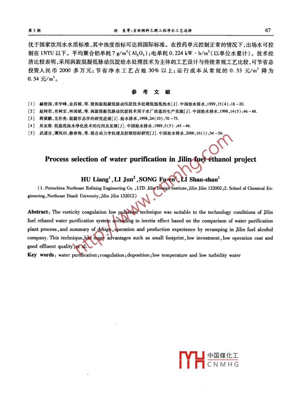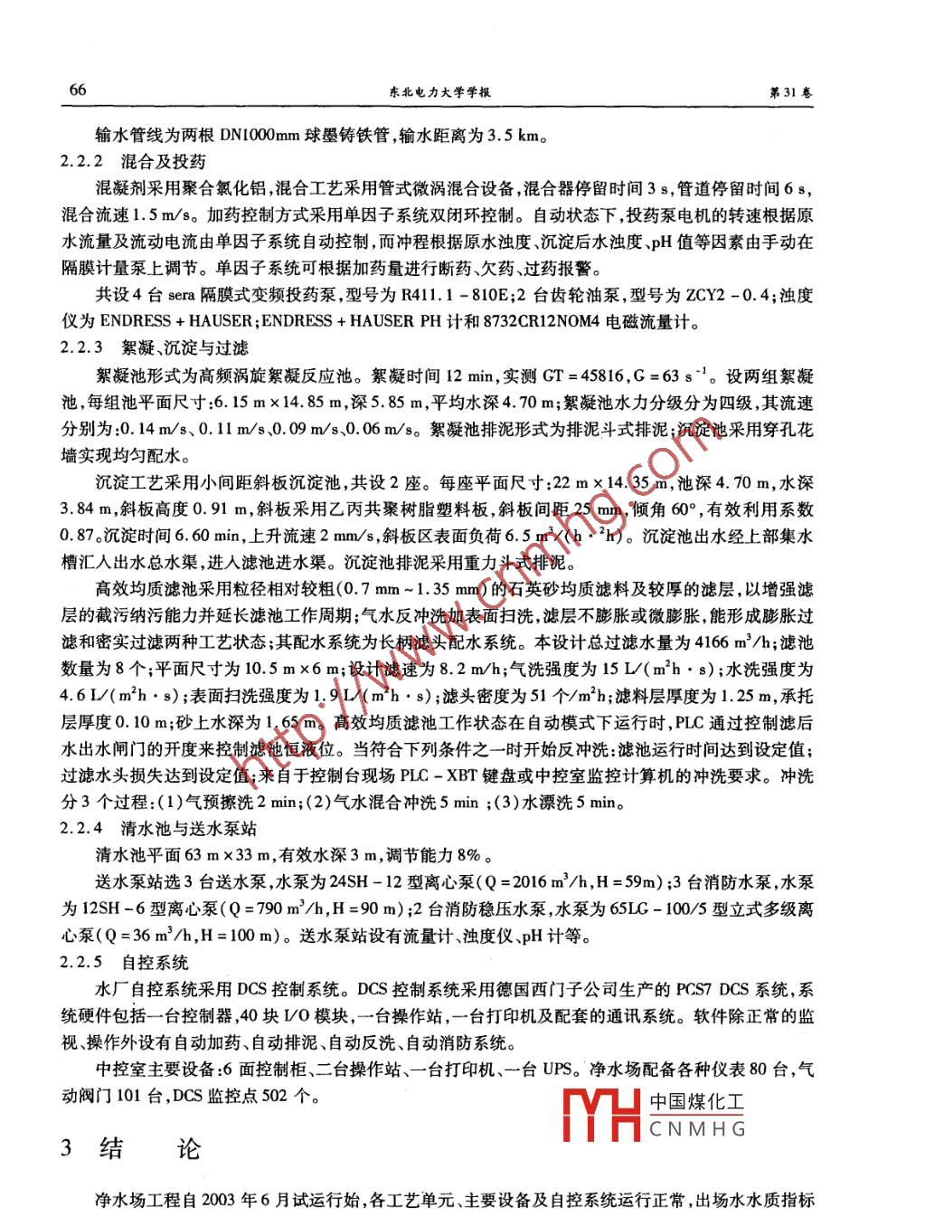 第31卷第3期東北電力大學(xué)學(xué)報(bào)Vol 31. No. 32011年6月Journal Of Northeast Dianli University文章編號(hào):1005-2992(2011)03-0064-04吉林燃料乙醇工程凈水工藝選擇胡良1,李軍2,宋福恩1,李珊珊1.中石油東北煉化工程有限公司吉林設(shè)計(jì)院,吉林吉林132002;2東北電力大學(xué)化學(xué)工程學(xué)院吉林吉林132012)摘要:通過(guò)對(duì)吉林燃料乙醇工程凈水場(chǎng)工藝的選擇比較,以及設(shè)計(jì)、生產(chǎn)運(yùn)行等經(jīng)驗(yàn)的總結(jié),表明依照亞微觀傳質(zhì)慣性效應(yīng)理論發(fā)明的“渦旋混凝低脈動(dòng)沉淀技術(shù)”適合燃料乙醇工程凈水系統(tǒng),具備建設(shè)投資少、占地少、運(yùn)行成本低、出水水質(zhì)好等特點(diǎn)。關(guān)鍵詞:凈水;混凝;沉淀;低溫低濁中圖分類號(hào):TU991.6文獻(xiàn)標(biāo)識(shí)碼:A吉林60萬(wàn)噸/年燃料乙醇工程是新興能源的示范工程,也是國(guó)家2001年十大重點(diǎn)項(xiàng)目之一。凈水場(chǎng)為其配套工程,工程總規(guī)模為20萬(wàn)Ud,采用一次規(guī)劃設(shè)計(jì),分二期建設(shè)的方式。一期建設(shè)規(guī)模為10萬(wàn)td,占地面積為22800m2h,工程費(fèi)用為5257萬(wàn)元。該工程于2002年5月施工,2003年5月驗(yàn)收,2003年5月31日進(jìn)水試生產(chǎn),水力停留時(shí)間為1h59min,沉淀池出水濁度1.0-1.5NTU,濾后水濁度0~0.5NTU。該場(chǎng)以第二松花江水為水源,受地理位置和氣候條件的影響,冬季水溫常在0~5℃,濁度低于10NmU,形成獨(dú)具特色的低溫低濁水,給凈水廠的管理工作帶來(lái)諸多困難包括藥耗高、出水濁度達(dá)標(biāo)難等。在吉林燃料乙醇工程凈水場(chǎng)的設(shè)計(jì)中,本設(shè)計(jì)采用渦旋混凝低脈動(dòng)沉淀給水處理技術(shù)、高效均質(zhì)濾池過(guò)濾的凈水工藝流程口,并對(duì)濾池反沖洗廢水進(jìn)行了回收和處理,以尋求在工程上的最佳處理工藝和方法。原水及出廠水質(zhì)本工程水源為第二松花江水,由取水戽頭、導(dǎo)水管、岸邊泵房經(jīng)長(zhǎng)距離輸水管線至凈水場(chǎng)。取水戽頭位于第二松花江吉林市九站江段,原水水質(zhì)指標(biāo)為正常時(shí)濁度小于40NTU,設(shè)計(jì)最大濁度指標(biāo)小于1000NTU。水源水質(zhì)達(dá)到《地面水環(huán)境質(zhì)量標(biāo)準(zhǔn)》(GB3838-1988)中Ⅲ~V類水質(zhì)標(biāo)準(zhǔn),僅能作為生產(chǎn)用水水源。出場(chǎng)水質(zhì)達(dá)到《國(guó)家生活飲用水衛(wèi)生規(guī)范》(2001年)要求,出場(chǎng)水濁度小于1NTU。水場(chǎng)自用水量按設(shè)計(jì)規(guī)模的5%計(jì)。2凈水工藝原理與設(shè)計(jì)2.1渦旋混凝低脈動(dòng)沉淀技術(shù)機(jī)理與工藝中國(guó)煤化工吉林60萬(wàn)/a燃料乙醇工程凈水場(chǎng)的可行性研究報(bào)告由上海EHCNMHG為20萬(wàn)v收稿日期:2011-04-18作者簡(jiǎn)介:胡良(1‰61-)男,吉林省吉林市人,中石油東北煉化工程有限公司吉林設(shè)計(jì)院高級(jí)工程師,主要研究方向:水處理工藝研究第3期胡良等:吉林燃料乙醇工程凈水工藝選擇d,投資估算為人民幣7000萬(wàn)元。一期建設(shè)規(guī)模為10萬(wàn)Ud。通過(guò)比較、論證分析,具體工藝選擇了哈爾濱工業(yè)大學(xué)提出的“渦旋混凝低脈動(dòng)沉淀給水處理技術(shù)”與高效均質(zhì)濾料濾池相結(jié)合的凈水工藝流程,設(shè)計(jì)工藝流程如圖1所示。渦旋混凝低脈動(dòng)沉淀給水處理技術(shù)是根據(jù)多相工藝研究中心提出的多相流動(dòng)物系反應(yīng)控制慣性效應(yīng)理論結(jié)合給水工程實(shí)踐經(jīng)近10年的研究而發(fā)明2。該技術(shù)涉及了給水處理中混合、絮凝反應(yīng)、沉淀三大主要工藝。從湍流微結(jié)構(gòu)的尺度即亞微觀尺度對(duì)混凝動(dòng)力學(xué)問(wèn)題進(jìn)行了深入的研究,提出了“慣性效應(yīng)”是絮凝動(dòng)力學(xué)致因,湍流剪切力是絮凝反應(yīng)中決定性的動(dòng)力學(xué)因素,并建立了絮凝的動(dòng)力相似準(zhǔn)則);首次指出擴(kuò)散過(guò)程應(yīng)分為宏觀擴(kuò)散和亞微觀擴(kuò)散兩個(gè)不同的物理過(guò)程,而亞微觀擴(kuò)散的動(dòng)力學(xué)致因是慣性效應(yīng),特別是湍流微旋渦的離心慣性效應(yīng)。新理論克服了現(xiàn)有傳統(tǒng)給水處理技術(shù)理論上的缺陷和實(shí)踐上的不足,管式微渦混合設(shè)備、高頻微渦絮凝設(shè)備、小間距斜板沉淀設(shè)備等幾項(xiàng)專利技術(shù)已在大量?jī)羲こ坛晒Φ赝茝V使用,取得了明顯的經(jīng)濟(jì)效益和社會(huì)效益?;炷齽┰苁轿u混合→高頻微渦絮凝反應(yīng)→逆向流小間距斜板沉淀→高效均質(zhì)濾料濾池→出水圖1設(shè)計(jì)工藝流程渦旋混凝低脈動(dòng)沉淀工藝具有如下特點(diǎn):(1)采用管式微渦混合設(shè)備,可形成高比例高強(qiáng)度的微渦旋,利用微小渦旋的離心慣性效應(yīng)使藥劑迅速擴(kuò)散至水體細(xì)部,使膠體顆粒瞬時(shí)脫穩(wěn),既節(jié)省藥耗,亦為完善的反應(yīng)奠定良好的基礎(chǔ)(2)高頻微渦絮凝設(shè)備采用高效微渦翼片折板促進(jìn)析出的小礬花快速有效碰撞,即通過(guò)反應(yīng)池中垂直水流方向設(shè)置的高頻繞流裝置,使水流產(chǎn)生高比例高強(qiáng)度的微渦旋,從而使得藥劑與水中的顆粒充分接觸碰撞,產(chǎn)生密
