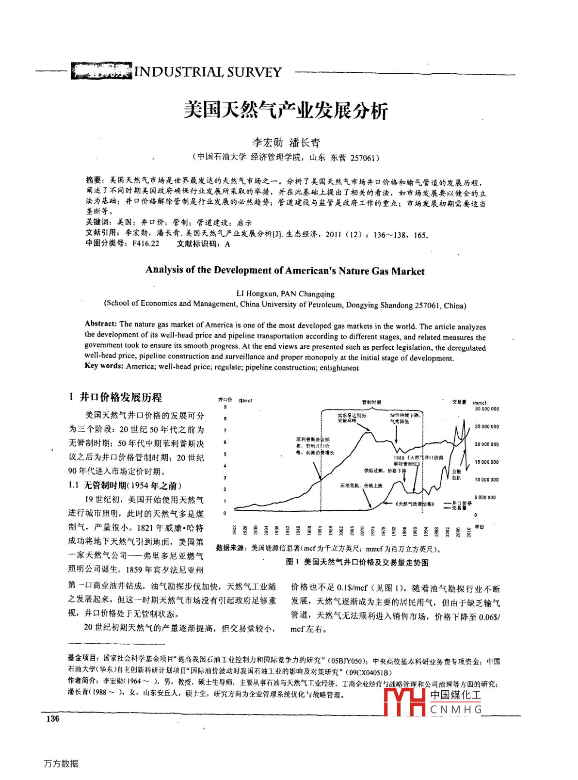 i: INDUSTRIAL SURVEY美國天然氣產(chǎn)業(yè)發(fā)展分析李宏勛潘長青(中國石油大學(xué)經(jīng)濟(jì)管理學(xué)院,山東東營257061)摘要:美國天然氣市場(chǎng)是世界最發(fā)達(dá)的天然氣市場(chǎng)之一。分析了美國天然氣市場(chǎng)井口價(jià)格和輸氣管道的發(fā)展歷程闡述了不同時(shí)期美國政府確保行業(yè)發(fā)展所采取的舉措,并在此基礎(chǔ)上提出了相關(guān)的看法,如市場(chǎng)發(fā)展要以健全的立法為基礎(chǔ);井口價(jià)格解除管制是行業(yè)發(fā)展的必然趨勢(shì);管道建設(shè)與監(jiān)管是政府工作的重點(diǎn);市場(chǎng)發(fā)展初期需要適當(dāng)壟斷等。關(guān)鍵詞:美國;井口價(jià):管制;管道建設(shè):啟示文獻(xiàn)引用:李宏勛,潘長青美國天然氣產(chǎn)業(yè)發(fā)展分析叮生態(tài)經(jīng)濟(jì),2011(12):136~138,165中圖分類號(hào):F41622文獻(xiàn)標(biāo)識(shí)碼:AAnalysis of the Development of Americans Nature Gas MarketLI Hongxun, PAN Changqing( School of Economics and Management, China University of Petroleum, Dongying Shandong 257061, China)Abstract: The nature gas market of America is one of the most developed gas markets in the world. The article analyzesthe development of its well-head price and pipeline transportation according to different stages, and related measures thegovernment took to ensure its smooth progress. At the end views are presented such as perfect legislation, the deregulatedwell-head price, pipeline construction and surveillance and proper monopoly at the initial stage of developmentKey words: America; well-head price; regulate; pipeline construction; enlightment1井口價(jià)格發(fā)展歷程井口價(jià)交易量美國天然氣井口價(jià)格的發(fā)展可分油價(jià)持續(xù)下跌氣需降低為三個(gè)階段:20世紀(jì)50年代之前為725000000無管制時(shí)期:50年代中期菲利普斯決菲利普斯決我蠛布,管制月!價(jià)議之后為井口價(jià)格管制時(shí)期;20世紀(jì)格,刺激泊增長1989《大然7井口價(jià)格解除管制法150000090年代進(jìn)入市場(chǎng)定價(jià)時(shí)期。供給過剩,價(jià)格下降1000000011無管制時(shí)期(1954年之前)石油危機(jī),價(jià)格上漲19世紀(jì)初,美國開始使用天然氣1500進(jìn)行城市照明,此時(shí)的天然氣多是煤0制氣,產(chǎn)量很小。1821年威廉·哈特亙昌墾堅(jiān)昌雖影羹司成功將地下天然氣引到地面,美國第家天然氣公司一一弗里多尼亞燃?xì)鈹?shù)據(jù)來源:美國能源信息署(mcf為千立方英尺;mmcf為百萬立方英尺)圖1美國天然氣井口價(jià)格及交易量走勢(shì)圖照明公司誕生。1859年賓夕法尼亞州第一口商業(yè)油井鉆成,油氣勘探步伐加快,天然氣工業(yè)隨價(jià)格也不足0$mcf(見圖1)。隨著油氣勘探行業(yè)不斷之發(fā)展起來。但這一時(shí)期天然氣市場(chǎng)沒有引起政府足夠重發(fā)展,天然氣逐漸成為主要的居民用氣,但由于缺乏輸氣視,井口價(jià)格處于無管制狀態(tài)。管道,天然氣無法順利進(jìn)入銷售市場(chǎng),價(jià)格下降至0.06$20世紀(jì)初期天然氣的產(chǎn)量逐漸提高,但交易量較小,mcf左右?;痦?xiàng)目:國家社會(huì)科學(xué)基金項(xiàng)目“提高我國石油工業(yè)控制力和國際竟?fàn)幜Φ难芯俊?05BY050);中央高校基本科研業(yè)務(wù)費(fèi)專項(xiàng)資金;中國石油大學(xué)(華東)自主創(chuàng)新科研計(jì)劃項(xiàng)目“國際油價(jià)波動(dòng)對(duì)我國石油工業(yè)的影響及對(duì)策研究”(09CX04051B)作者簡介:李宏勛(1964~),男,教授,碩士生導(dǎo)師,主要從事石油與天然氣T業(yè)經(jīng)濟(jì)、工商企業(yè)經(jīng)背與戰(zhàn)略管理和公司治理等方面的研究;潘長青(1988~),攵,山東安丘人,碩士生,研究方向?yàn)槠髽I(yè)管理系統(tǒng)優(yōu)化與戰(zhàn)略管理中國煤化工CNMHG136《生態(tài)經(jīng)濟(jì)》2011年第12期總第247期ECOLOGICAL ECONOMY隨著天然氣產(chǎn)量的不斷增長以及管道建設(shè)的不斷發(fā)決定先將州內(nèi)天然氣市場(chǎng)納入管制范圍,以緩解州際市場(chǎng)展,美國天然氣交易量迅速增加,二戰(zhàn)初期就突破了200的困境。之后法案為所有天然氣制定了不同的井口價(jià)格上×10m3。二戰(zhàn)之后輸氣管道建設(shè)更是迅猛發(fā)展,交易量限,并以1978年11月8日為界劃分老井和新井,老井價(jià)迅速超過1400×10°m3,井口價(jià)格升至0. S/mcf.格上限較低,新井偏高。法案還制訂計(jì)劃分階段解除天然1.2井口價(jià)格管制時(shí)期(1954~1992年)氣的井口價(jià)格管制,部分州內(nèi)“老氣”價(jià)格1979年解除管天然氣貿(mào)易范圍不斷擴(kuò)大和輸氣管道長度不斷增加使制,部分州際“老氣”和絕大部分“新氣”價(jià)格1985年解除得美國天然氣交易很快突破了州的界限。為了更好地管理管制,其余“新氣”1987年解除井口價(jià)格管制跨州事務(wù),美國政府在1938年《天然氣法案》中設(shè)立了專NGPA頒布的最初幾年,天然氣井口價(jià)格一路上漲門的監(jiān)管機(jī)構(gòu)〔聯(lián)邦電力委員會(huì)),對(duì)管道商跨州銷售天然需求減少。能源危機(jī)過后原油價(jià)格下跌,天然氣需求進(jìn)氣的行為進(jìn)行監(jiān)管并征收一定的管輸費(fèi)率,為井口價(jià)格管步減少,天然氣市場(chǎng)逐漸由供不應(yīng)求變?yōu)楣┻^于求。20世制埋下了伏筆。紀(jì)80年代的經(jīng)濟(jì)危機(jī)也在一定程度上影響了