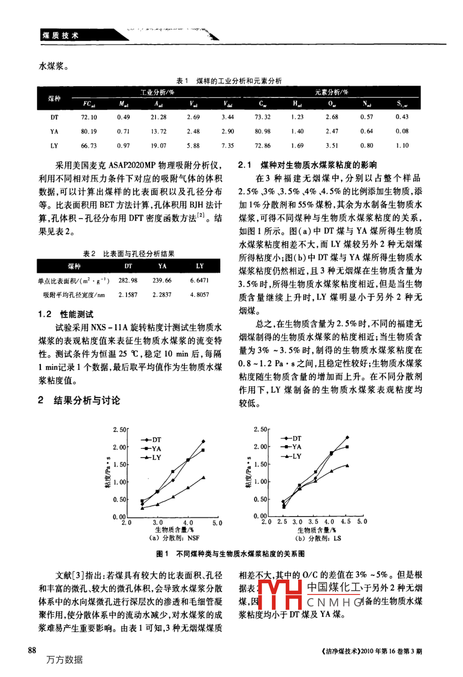 煤質(zhì)技術(shù)一全國(guó)中文核心期刊礦業(yè)類核心期刊《cAcD規(guī)范》執(zhí)行優(yōu)秀期刊生物質(zhì)水煤漿流變特性研究鄧暉,羅祖云,林榮英,林誠(chéng)(福州大學(xué)化學(xué)工程與技術(shù)研究所,福建福州350108)摘要:以福建無(wú)煙煤、水葫蘆、添加劑等制備生物質(zhì)水煤漿,研究了其流變特性。結(jié)果表明:添加3%~3.5%的水葫蘆及1%的分散劑制得的生物質(zhì)水煤漿粘度在0.8~1.2Pa·s之穩(wěn)定性較好。生物質(zhì)含量提高,生物質(zhì)水煤漿的粘度逐漸上升;分散劑含量為1%時(shí),能夠制得流變性較佳的生物質(zhì)水煤漿;攪拌強(qiáng)度的增加能夠使生物質(zhì)水煤漿的粘度降低;當(dāng)溫度低于60℃時(shí)生物質(zhì)水煤漿的粘度隨溫度升高而下降;當(dāng)溫度高于60℃時(shí),生物質(zhì)水煤漿的粘度隨溫度升高而上升。關(guān)鍵詞:生物質(zhì)水煤漿;流變特性;無(wú)煙煤;水葫蘆;分散劑中圖分類號(hào):TQ536文獻(xiàn)標(biāo)識(shí)碼:A文章編號(hào):1006172(2010)03008705隨著石油、天然氣資源的急劇減少,開(kāi)發(fā)以煤目前文獻(xiàn)上查到劉世義提出的生物質(zhì)水煤漿是利代油的新型潔凈燃料已成為大勢(shì)所趨。目前世界用工業(yè)上的污泥制煤漿,還沒(méi)有利用水葫蘆、秸稈各國(guó)開(kāi)發(fā)研制煤漿燃料,主要種類有:油煤漿、水煤等生物質(zhì)制備生物質(zhì)煤漿的研究報(bào)道。漿,油水煤漿,甲醇煤漿,生物質(zhì)水煤漿。已開(kāi)發(fā)的考察了不同的煤種、分散劑種類及添加量攪拌強(qiáng)各種煤漿一般都選用揮發(fā)分含量高、活性好的煤,度和溫度等因素對(duì)生物質(zhì)水煤漿流變特性的影響,以文獻(xiàn)上查到的生物質(zhì)水煤漿是劉世義口提出的利期制得粘度適中穩(wěn)定性良好的生物質(zhì)水煤漿。用工業(yè)上的污泥制煤漿。福建煤炭?jī)?chǔ)量98%均為揮發(fā)分低、灰熔點(diǎn)低、1實(shí)驗(yàn)部分著火點(diǎn)高、燃燒性差、粉碎性強(qiáng)的低活性無(wú)煙煤,限1.1樣品制備制了其在福建省氮肥、水泥、陶瓷、玻璃、建材等工試驗(yàn)煤樣采用福建3種不同產(chǎn)地的無(wú)煙煤:大業(yè)中的直接應(yīng)用。如何合理并有效地利用這些劣田無(wú)煙煤(DT)、永安無(wú)煙煤(YA)、龍巖無(wú)煙煤質(zhì)煤,對(duì)發(fā)展福建地方經(jīng)濟(jì)乃至中國(guó)經(jīng)濟(jì)和環(huán)境保(LY),煤樣的工業(yè)分析和元素分析見(jiàn)表1。試驗(yàn)選護(hù)都具有十分重要的意義。另外以生物質(zhì)作為新用3種陰離子分散劑:聚苯乙烯磺酸鈉(PSS)、亞甲能源的研究工作當(dāng)前已成為國(guó)內(nèi)外研究熱點(diǎn),也是基萘磺酸鹽甲醛縮合物(NSF)、木質(zhì)素磺酸鈉國(guó)家的發(fā)展戰(zhàn)略之一,生物質(zhì)能開(kāi)發(fā)利用技術(shù)則被(LS)。水葫蘆在120℃下干燥24h通過(guò)德國(guó)IKA認(rèn)作是最有效的減碳手段,被列為“世界十大害草”A11分析研磨機(jī)研磨,所得水葫蘆粉狀物作為生物之一的水生植物——水葫蘆還亟待能源開(kāi)發(fā)化利質(zhì)。將無(wú)煙煤用球磨機(jī)研磨至粒度小于0.075mm用。因此。提出利用水葫蘆、福建無(wú)煙煤以及其它占75%,稱取無(wú)煙粉煤55%(質(zhì)量分?jǐn)?shù)),分散劑用助劑制備新型生物質(zhì)水煤漿,作為重油的替代品用量為整個(gè)試樣的1%,將生物質(zhì)按整個(gè)試樣的于燃燒,以降低燃料成本,既提高無(wú)煙煤的燃燒活2.5%、3%3.5%摻人,其余為水,恒溫25℃,攪拌性又降低煤的用量,并且充分利用了生物質(zhì)資源。速率TH擋拌時(shí)間為10min,制得生物質(zhì)中國(guó)煤化工收稿日期:2010-03-30CNMHG基金項(xiàng)目:福建省科技廳青年人才項(xiàng)目資助(20063070)作者簡(jiǎn)介:鄧暉(1983-),男,福建三明人碩士研究生,主要從事可再生資穩(wěn)開(kāi)發(fā)技術(shù)的研究。Emol:Menghu330@hotmail.com;通訊作者林榮英,Emol: linry@ fzu物夯搪變特性研究煤質(zhì)技術(shù)水煤漿。表1煤樣的工業(yè)分析和元素分析工業(yè)分析/%元素分析/%煤種3.4473.320.7113.722.4880.982.470.085.880.80采用美國(guó)麥克ASAP2020MP物理吸附分析儀,2.1煤種對(duì)生物質(zhì)水煤漿粘度的影響利用不同相對(duì)壓力條件下對(duì)應(yīng)的吸附氣體的體積在3種福建無(wú)煙煤中,分別以占整個(gè)樣品數(shù)據(jù),可以計(jì)算出煤樣的比表面積以及孔徑分布2.5%3%、3.5%、4%4.5%的比例添加生物質(zhì),添等。比表面積用BET方法計(jì)算孔體積用BJH法計(jì)加1%分散劑和55%煤粉,其余為水制備生物質(zhì)水算,孔體積-孔徑分布用DFT密度函數(shù)方法。結(jié)煤漿可得不同煤種與生物質(zhì)水煤漿粘度的關(guān)系,果見(jiàn)表2如圖1所示。圖(a)中DT煤與YA煤所得生物質(zhì)水煤漿粘度相差不大,而LY煤較另外2種無(wú)煙煤表2比表面與孔徑分析結(jié)果所得粘度小;圖(b)中DT煤與YA煤所得生物質(zhì)水煤漿粘度仍然相近,且3種無(wú)煙煤在生物質(zhì)含量為單點(diǎn)比表面積/(m2·g1)282.982393.5%時(shí)所得生物質(zhì)水煤漿粘度相近,但是當(dāng)生物吸附平均孔徑寬度/2.28374.8057質(zhì)含量繼續(xù)上升時(shí),LY煤明顯小于另外2種無(wú)1.2性能測(cè)試煙煤。試驗(yàn)采用NXS-11A旋轉(zhuǎn)粘度計(jì)測(cè)試生物質(zhì)水總之,在生物質(zhì)含量為2.5%時(shí),不同的福建無(wú)煤漿的表觀粘