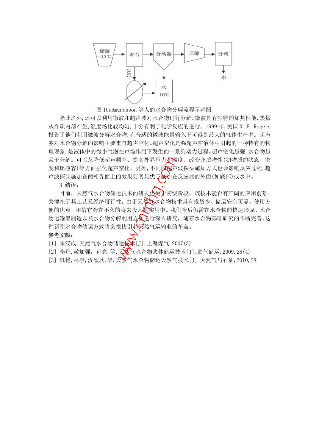 論天然氣水合物儲運天然氣技術(shù)吳劍峰佛山市順德區(qū)港華燃氣有限公司摘要:隨著世界能源需求的不斷增長以及天然氣資源的大力開發(fā)和利用,必然要求不斷完善天然氣儲運技術(shù)。天然氣水合物儲運天然氣技術(shù)具有安全可靠、成本低等優(yōu)勢,備受矚目。從天然氣水合物的制備、儲存、運輸、分解等幾個方面分析了天然氣水合物儲運技術(shù)。關(guān)鍵詞:天然氣;水合物:儲運技術(shù)Abstract: With the development and growing world energy demand and the use of natural gas resources, must constantlyimprove the tehnology of natural gas storage and transportation. Natural gas hydrate storage and transportation technologyhas the advantages of safety and rlabilit, low cost, has ttracted a lot of attention. From the aspects of the preparation ofnatural gas hydrate, storage, transportation, decomposition of natural gas hydrate storage and transportation technology.Key words: natural gas; hydrate; storage and transportation technology中圖分類號: TF526+.4 文獻標(biāo)識碼: A .文章編號:引言:天然氣水合物也稱為在較低的溫度(0°C~10C) 與較高的壓力(> 10MPa)條件下,由天然氣與水結(jié)合成的一種白色結(jié)晶固體,類似于松散的冰或致密的雪。因天然氣中含甲烷分子超過80%~90%,故也有人稱天然氣水合物為甲烷水合物。天然氣水合物多呈白色或淺灰色晶體,外貌類似冰雪,可以像酒精塊一樣被點燃, 故也有人叫它“可燃冰”。1天然氣水合物概述天然氣水合物是在一定溫度、 壓力條件下,由水分子和碳氫氣體分子組成的一種類冰的、可燃的、非固定化學(xué)計量的籠形晶體化合物。它是一種主-客體結(jié)構(gòu):水分子通過氫鍵形成主體結(jié)晶網(wǎng)格,碳氫氣體作為/客0氣體分子填充在網(wǎng)格之間的空穴中,并與水分子通過范德華力穩(wěn)定地相互結(jié)合在一起。目前,已發(fā)現(xiàn)的天然氣水合物結(jié)構(gòu)類型有三種:N型、0型和H型。N型天然氣水合物在自然界分布最廣,而0型和H型水合物更為穩(wěn)定。低溫高壓是NGH穩(wěn)定存在的必要條件,在常溫常壓下,NGH會發(fā)生分解,析出水,釋放碳氫氣體。1 m3飽和天然氣水合物可儲存150^ 180 m3的氣體。NGH的儲氣能力取決于水合物所形成的結(jié)構(gòu)類型,據(jù)報道,H型結(jié)構(gòu)水合物理論上比N型和0型可儲存更多的天然氣。這些結(jié)構(gòu)的形成又取決于天然氣的組成以及所使用的添加劑。2天然氣固態(tài)儲運技術(shù)2.1天然氣水合物的生成技術(shù)盡管不同的研究者提出了不同的天然氣水合物的制備方法,但原理基本相同,即在一定的溫度和壓力下,使天然氣與系統(tǒng)中的液態(tài)水或過飽和水蒸氣接觸,發(fā)生反應(yīng),生成水合物。目前,用于水合物生成的反應(yīng)器大致分為3類,即攪拌式反應(yīng)器、鼓泡式反應(yīng)器和噴淋式反應(yīng)器。但是由于鼓泡式反應(yīng)系統(tǒng)中孔板的孔徑很小,容易被生成的水合物堵塞;噴淋式反應(yīng)器面臨如何將水合物生成過程中的反應(yīng)熱及時排走的技術(shù)難題,所以攪拌式反應(yīng)器占據(jù)了主流研究方向。攪拌式反應(yīng)系統(tǒng)是先在反應(yīng)器中裝入冷卻后的水,天然氣從反應(yīng)器底部的止回閥進入,通過攪拌器的攪拌使天然氣和水充分地接觸,生成天然氣水合物。通過管殼式換熱器,利用乙二醇水溶液作為冷液,把反應(yīng)熱以及轉(zhuǎn)動部件(如循環(huán)泵和攪拌器)所產(chǎn)生的熱量及時帶走。在整個水合物生成過程中,晶核的形成比較困難,一般需要一 定的誘導(dǎo)期, 晶核受氣體的組分、水合物形成的溫度和壓力條件及天然氣與水的接觸面積等因素的影響。2. 2天然氣水合物的儲存和運輸2.2.1天然氣水合物儲運基本原理天然氣水合物儲運的基本原理是利用天然氣水合物的巨大儲氣能力,通過一定的工藝將天然氣制成固態(tài)的水合物,然后將水合物運送到儲氣站,在儲氣站氣化成天然氣供用戶使用,天然氣水合物儲運一-般基 于兩方面的考慮:-是開采海上氣田或遠洋進口天然氣,天然氣在氣田或出口國加工成水合物,再通過輪船運往需要的地方氣化后使用;二是內(nèi)陸儲運,主要是在沒有必要鋪設(shè)專用管道的情況下使用。2.2. 2天然氣水合物儲存條件天然氣水合物可以在一-定的溫度和壓力條件下實現(xiàn)穩(wěn)定儲存。生成的天然氣水合物在常壓和- 5°C、-10'C及-18C的冷庫中儲存10天仍保持穩(wěn)定。一.方面,因為在上述條件下,天然氣水合物只是發(fā)生表面分解,分解出來的水在水合物表面形成一層冰膜; 另一方面, 天然氣水合物導(dǎo)熱系數(shù)為18. 7W/ (m●°C),比一-般的隔熱材料還低,具有良好的自我儲存能力。所以,除非外部繼續(xù)加熱,否則它將很難進一步分解。根據(jù)天然氣水合物的這一-特點, 可將天然氣水合物儲存在隔熱較好的普通鋼制儲罐中,且儲罐不需要承壓。除了上述的常壓低溫的儲存條件外,還可以通過提高儲存壓力,實現(xiàn)天然氣水合物在常溫下的穩(wěn)定儲存。例如,在壓力為2~5MPa 的管道中儲輸,或儲存于承壓儲罐中裝車外運。2. 2.3天然氣水合物運輸技術(shù)不同的天然氣水合物生產(chǎn)工藝可以制備出不同形態(tài)的天然氣水合物,相對地會有不同的運輸方式,主要表現(xiàn)為以下3種:一是, 對于干水合物,可用類似LNG運輸船的輪船運輸。到達目的地后,在船