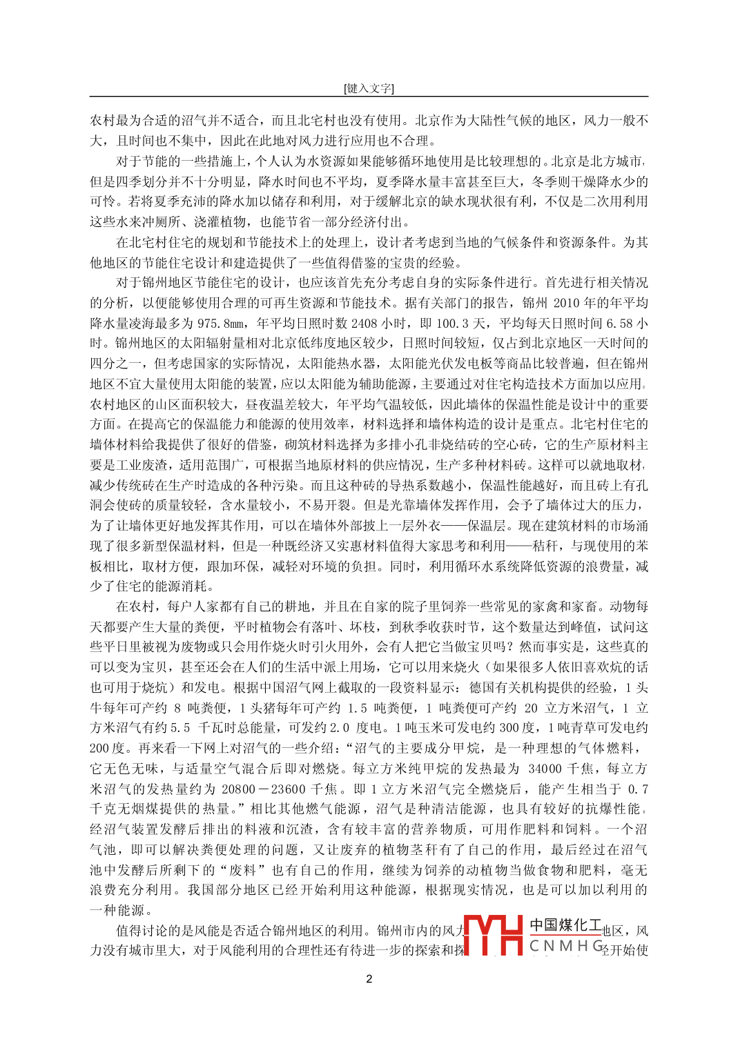 [鍵入文字]環(huán)境對(duì)于節(jié)能住宅節(jié)能方式選擇的影響王悅(沈陽(yáng)建筑大學(xué)建筑與規(guī)劃學(xué)院遼寧沈陽(yáng)110168)摘要:伴隨經(jīng)濟(jì)文化的發(fā)展,人類開始對(duì)自己當(dāng)下的生存的環(huán)境有了更深的理解和要求,并開始從關(guān)注自己怎么生存向如何留給子孫后代更好的生存環(huán)境轉(zhuǎn)變。在這樣的情況下,建筑也開始了它的轉(zhuǎn)變,節(jié)能建筑也漸漸岀現(xiàn),但是人們對(duì)這類建筑節(jié)能方式的運(yùn)用并不是十分明確。因此對(duì)現(xiàn)有采用節(jié)能技術(shù)的建筑的調(diào)硏硏究,是解決新建建筑節(jié)能采用形式的最好方法之關(guān)鍵詞:農(nóng)村節(jié)能住宅;太陽(yáng)能;風(fēng)能;沼氣;能源的選擇原則中圖分類號(hào):TE08文獻(xiàn)標(biāo)識(shí)碼:A文章編號(hào):普遍意義上的節(jié)能概念是:首先是節(jié)約能源,即充分利用太陽(yáng)能,采用節(jié)能的建筑圍護(hù)結(jié)構(gòu)以及采暖和空調(diào)。根據(jù)夏季的主導(dǎo)風(fēng)向,以自然通風(fēng)為原則來設(shè)置有效的風(fēng)冷系統(tǒng)。建筑的平面形式及總體布局應(yīng)適應(yīng)當(dāng)?shù)貧夂驐l件。同時(shí)要節(jié)約資源,即在建筑設(shè)計(jì)和建筑材料的選擇上,要考慮資源的合理使用和處置,在建造的過程中,降低對(duì)資源的浪費(fèi)和消耗。力求使資源可再生循環(huán)利用。大都市的建筑開始注重節(jié)能,自然農(nóng)村的住宅也會(huì)漸漸受到些影響。中國(guó)有一個(gè)很大的特點(diǎn)就是喜歡“跟風(fēng)”,自然在建筑方面也一樣,于是越來越多的農(nóng)村開始出現(xiàn)“綠色農(nóng)村住宅”或“節(jié)能農(nóng)村住宅”。這些建筑相比較普通的住宅,是否具有節(jié)能的效果,以及帶來其他的效益呢,在《東北農(nóng)村住宅節(jié)能設(shè)計(jì)與研究》可持續(xù)建筑設(shè)計(jì)實(shí)踐項(xiàng)目中,針對(duì)兩處實(shí)際情況大不相同的地區(qū)進(jìn)行了調(diào)研,調(diào)研的結(jié)果引起了我們的一些思考。首先是自然和人文條件比較原生態(tài)的錦州溫滴樓鄉(xiāng)滿家溝一個(gè)村落,人口較少,住戶比較分散。普通住戶的環(huán)境條件都較好,一般北向是山,南向?yàn)槠教沟牡貏?shì)并有道路,東南向不遠(yuǎn)處有水塘,東西兩向是較大的農(nóng)作物及水果的種植地區(qū)。但村中住宅為普通的磚砌小房,冬季自已燒煤炭取暖,夏季也沒有什么特殊的遮陽(yáng)措施。但相對(duì)節(jié)能條件比較好的北京市懷柔區(qū)橋梓鎮(zhèn)北宅村,根據(jù)特殊的節(jié)能住宅形式的優(yōu)勢(shì),搞起了生態(tài)旅游,使整個(gè)村子富裕起來。同樣的農(nóng)村,北宅村無論是道路還是戶與戶之間的綠化都建設(shè)的較好。整個(gè)村子分為南北兩部分,南面有幾棟新建的多層住宅,從外觀上可以看到太陽(yáng)能熱水器,對(duì)面為別墅區(qū),中心地帶為公共活動(dòng)區(qū)域,北向則是傳統(tǒng)的農(nóng)村住宅。南北形成鮮明對(duì)比,針對(duì)別墅進(jìn)行調(diào)硏發(fā)現(xiàn):每個(gè)住戶的屋頂都安裝了太陽(yáng)能熱水器。窗戶的上方設(shè)計(jì)有遮陽(yáng)板,西側(cè)的墻上幾乎不開窗,開窗的話面積也都較小。房間中心位置都會(huì)較高的通風(fēng)管道高于住宅的屋頂,室內(nèi)通風(fēng)條件提高。小區(qū)中的一些住戶還將陽(yáng)臺(tái)屋頂改為了植被屋頂。宅間小路兩旁的路燈的燈罩后方,也都按照一定的角度傾斜地放置了一塊太陽(yáng)能電池板。跟當(dāng)?shù)鼐用窳私?住宅的墻體采用空心磚砌筑,這種磚的蓄熱能力強(qiáng),在冬天保持室內(nèi)的溫度。整體房屋以太陽(yáng)能為主要生活能源。村子的規(guī)劃情況在這里就不做具體闡述了北宅之所以采用太陽(yáng)能為主要生活使用能源,是有一定根據(jù)的:在北宅村,太陽(yáng)能是節(jié)能應(yīng)用中使用率最高使用最廣泛的可再生能源。對(duì)于這個(gè)利用是否合理,數(shù)據(jù)才是最好驗(yàn)證,先來看下北京年平均日照時(shí)間—2780.2小時(shí),即115.84天,平均每天約7小時(shí)40分鐘。從數(shù)據(jù)看出,一年的三分之一時(shí)間中,北京是處于日照的狀態(tài)下,創(chuàng)除太陽(yáng)在地平中國(guó)煤化x間比較充裕,因此使用利用太陽(yáng)能的相關(guān)設(shè)備還是很合適的。由于北宅村HCNMHG的距離不近,因此每家住戶并不像改造地那樣有充足的空間放各種秸稈、寺哥尖水四,囚此使用在[鍵入文字]農(nóng)村最為合適的沼氣并不適合,而且北宅村也沒有使用。北京作為大陸性氣候的地區(qū),風(fēng)力一般不大,且時(shí)間也不集中,因此在此地對(duì)風(fēng)力進(jìn)行應(yīng)用也不合理。對(duì)于節(jié)能的一些措施上,個(gè)人認(rèn)為水資源如果能夠循環(huán)地使用是比較理想的。北京是北方城市,但是四季劃分并不十分明顯,降水時(shí)間也不平均,夏季降水量豐富甚至巨大,冬季則干燥降水少的可憐。若將夏季充沛的降水加以儲(chǔ)存和利用,對(duì)于緩解北京的缺水現(xiàn)狀很有利,不僅是二次用利用這些水來沖廁所、澆灌植物,也能節(jié)省一部分經(jīng)濟(jì)付出。在北宅村住宅的規(guī)劃和節(jié)能技術(shù)上的處理上,設(shè)計(jì)者考慮到