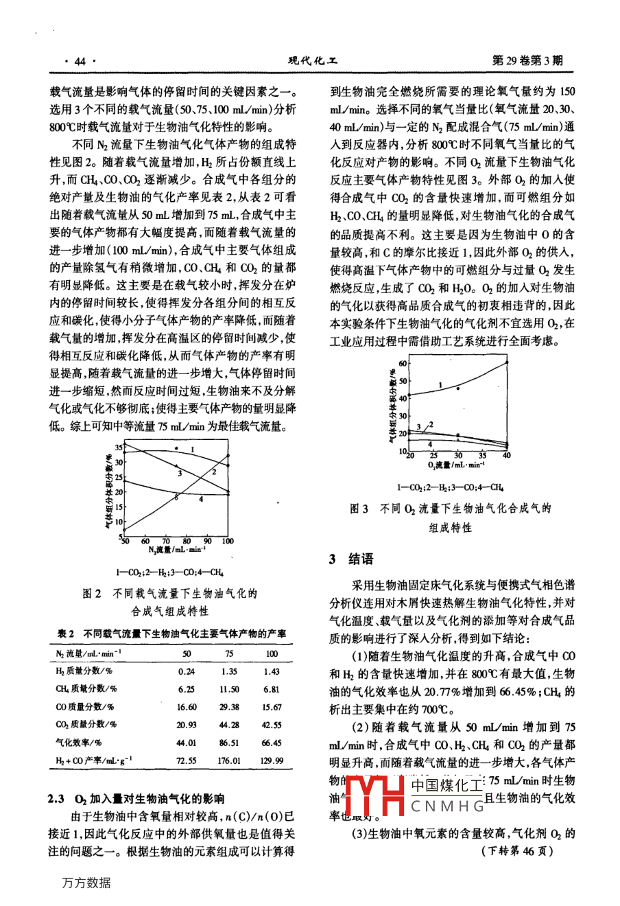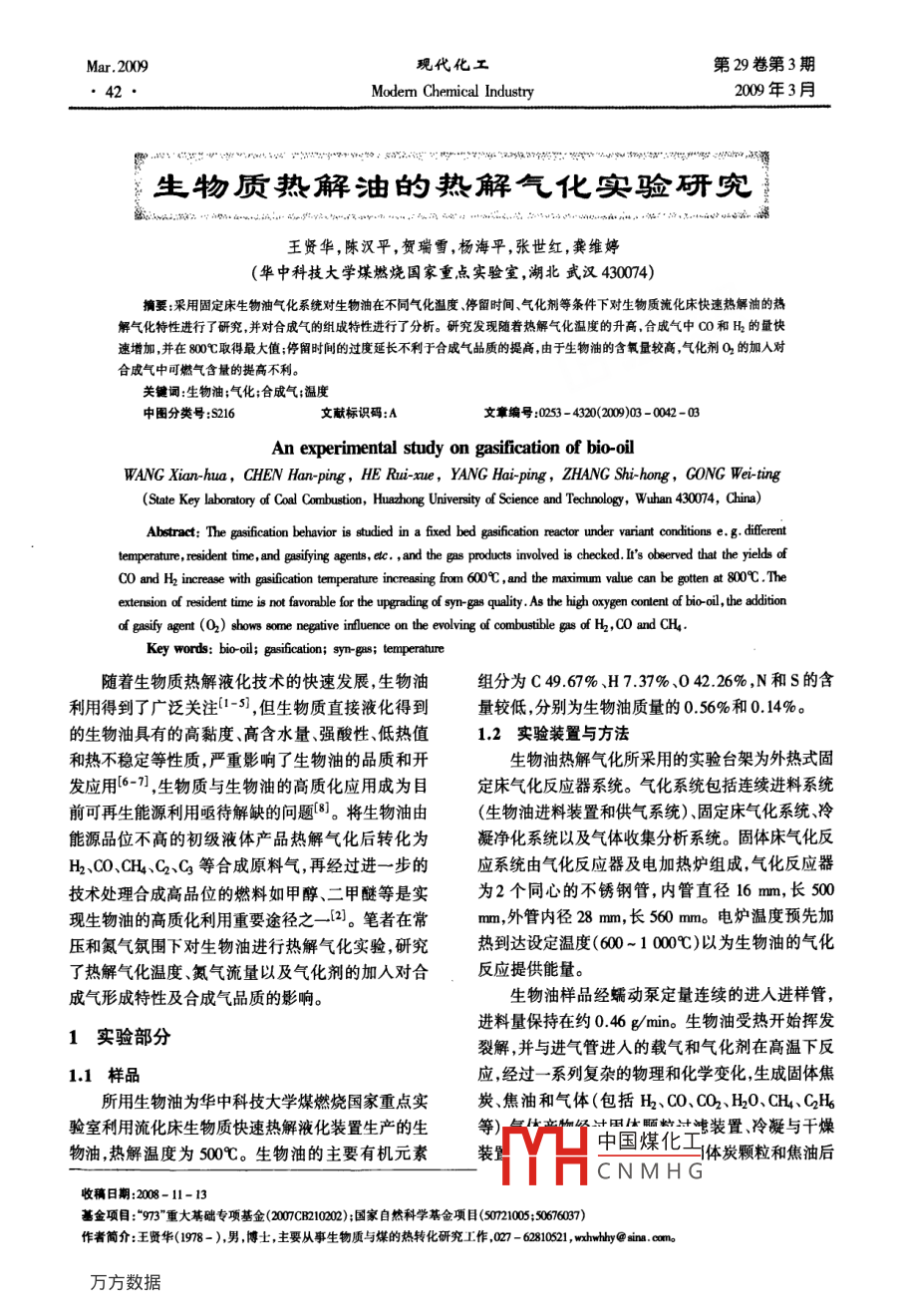 現(xiàn)代化工第29卷第3期42·Modern Chemical Industry200年3月生物質(zhì)熱解油的熱解氣化奧驗(yàn)研究王賢華,陳漢平,賀瑞雪,楊海平,張世紅,龔維婷(華中科技大學(xué)煤燃燒國(guó)家重點(diǎn)實(shí)驗(yàn)室,湖北武漢430074)摘要:采用固定床生物油氣化系統(tǒng)對(duì)生物油在不同氣化溫度、停留時(shí)間、氣化劑等條件下對(duì)生物質(zhì)流化床快速熱解油的熱解氣化特性進(jìn)行了研究并對(duì)合成氣的組成特性進(jìn)行了分析。研究發(fā)現(xiàn)隨著熱解氣化溫度的升高,合成氣中CO和H的量快速增加,并在800℃取得最大值;停留時(shí)間的過度延長(zhǎng)不利于合成氣品質(zhì)的提高由于生物油的含氧量較高,氣化劑O2的加入對(duì)合成氣中可燃?xì)夂康奶岣卟焕?。關(guān)鍵詞:生物油;氣化;合成氣;溫度中圖分類號(hào):S216文獻(xiàn)標(biāo)識(shí)碼:A文章編號(hào):0253-4320(200)03-0042-03An experimental study on gasification of bio-oilWANG Xian-hua, CHEN Han-ping, HE Rui-xue, YANG Hai-ping, ZHANG Shi-hong, GONG Wei-ting(State Key laboratory of Coal Combustion, Huazhong University of Science and Technology, Wuhan 430074, China)Abstract: The gasification behavior is studied in a fixed bed gasification reactor under variant conditions e. g. differenttemperature,resident time, and gasifying agents, etc., and the gas products imvolved is checked. It's observed that the yields ofCO and H2 increase with gasification temperature increasing from 600, and the maximum value can be gotten at 800C.Theextension of resident time is not favorable for the upgrading of syn-gas quality. As the high oxygen content of bio-oil, the additionof gasify agent(O)shows some negative influence on the evolving of combustible gas of H2, Co and CH4Key words: bio-oil; gasification; syn-gas; temperature隨著生物質(zhì)熱解液化技術(shù)的快速發(fā)展,生物油組分為C49.67%、H737%、042.26%,N和S的含利用得到了廣泛關(guān)注-3),但生物質(zhì)直接液化得到量較低分別為生物油質(zhì)量的056%和014%。的生物油具有的高黏度、高含水量、強(qiáng)酸性、低熱值1.2實(shí)驗(yàn)裝置與方法和熱不穩(wěn)定等性質(zhì),嚴(yán)重影響了生物油的品質(zhì)和開生物油熱解氣化所采用的實(shí)驗(yàn)臺(tái)架為外熱式固發(fā)應(yīng)用6-7,生物質(zhì)與生物油的高質(zhì)化應(yīng)用成為目定床氣化反應(yīng)器系統(tǒng)。氣化系統(tǒng)包括連續(xù)進(jìn)料系統(tǒng)前可再生能源利用亟待解缺的問題。將生物油由(生物油進(jìn)料裝置和供氣系統(tǒng))固定床氣化系統(tǒng)、冷能源品位不高的初級(jí)液體產(chǎn)品熱解氣化后轉(zhuǎn)化為凝凈化系統(tǒng)以及氣體收集分析系統(tǒng)。固體床氣化反H2、CO、CH4C2、C等合成原料氣再經(jīng)過進(jìn)一步的應(yīng)系統(tǒng)由氣化反應(yīng)器及電加熱爐組成氣化反應(yīng)器技術(shù)處理合成高品位的燃料如甲醇、二甲醚等是實(shí)為2個(gè)同心的不銹鋼管,內(nèi)管直徑16m,長(zhǎng)50現(xiàn)生物油的高質(zhì)化利用重要途徑之_2]。筆者在常m,外管內(nèi)徑28m,長(zhǎng)560mm。電爐溫度預(yù)先加壓和氮?dú)夥諊聦?duì)生物油進(jìn)行熱解氣化實(shí)驗(yàn),研究熱到達(dá)設(shè)定溫度(60-100℃0)以為生物油的氣化了熱解氣化溫度、氮?dú)饬髁恳约皻饣瘎┑募尤雽?duì)合反應(yīng)提供能量。成氣形成特性及合成氣品質(zhì)的影響。生物油樣品經(jīng)蠕動(dòng)泵定量連續(xù)的進(jìn)入進(jìn)樣管進(jìn)料量保持在約0.46g/min。生物油受熱開始揮發(fā)1實(shí)驗(yàn)部分裂解,并與進(jìn)氣管進(jìn)入的載氣和氣化劑在高溫下反11樣品應(yīng),經(jīng)過一系列復(fù)雜的物理和化學(xué)變化生成固體焦所用生物油為華中科技大學(xué)煤燃燒國(guó)家重點(diǎn)實(shí)炭焦油和氣體(包括五2、CO、CO2、H20、CH4、C2驗(yàn)室利用流化床生物質(zhì)快速熱解液化裝置生產(chǎn)的生等計(jì)田曬計(jì)濾裝置、冷凝與干燥物油,熱解溫度為500℃。生物油的主要有機(jī)元素裝中國(guó)煤化工體炭顆粒和焦油后CNMHG收稿日期:2008-11-13基金項(xiàng)目:“973”重大基礎(chǔ)專項(xiàng)基金(2007CB2100);國(guó)家自然科學(xué)基金項(xiàng)目(50m21005:50676037)作者簡(jiǎn)介:王賢華(19078-),男博士,主要從事生物質(zhì)與煤的熱轉(zhuǎn)化研究工作,027-62810521, hwhh@ sina. c2009年3月王賢華等:生物質(zhì)熱解油的熱解氣化實(shí)驗(yàn)研究由氣袋進(jìn)行收集,以做進(jìn)一步分析之用。氣體產(chǎn)物的體積含量采用4通道的 agilent3000微型氣相色譜儀進(jìn)行分析。由于生物油中氧元素含量較高,在無(wú)氧條件下生物油中大部分組分可發(fā)生內(nèi)部氣化,因此首先研究生物油的無(wú)氧氣化實(shí)驗(yàn)。為了了解生物油的熱解氣化機(jī)理,對(duì)生物油在不同溫度(600、700、800、9001000℃)下的氣化特性進(jìn)行分析,其中載氣N2的流-C0: 2-H: 3--C0: 4-CH4量保持在100mL/min左右;為了了解氣體產(chǎn)物的停圖1不同溫度下生物油氣化合成氣主要產(chǎn)物留時(shí)間對(duì)生物油氣化特性的影響,對(duì)不同載氣(N2)組成特性(無(wú)N2和H2O)流量(50、75、100mL)下生物油的氣化特性;同時(shí)為了了解氧元素的存在對(duì)氣體產(chǎn)物品質(zhì)的影響,引入喪1生物油氣化的主要產(chǎn)物的氣化率氣化劑O2,通過不同添加量分析合成氣中主要?dú)怏w60070080090產(chǎn)物的析出特性。最后
