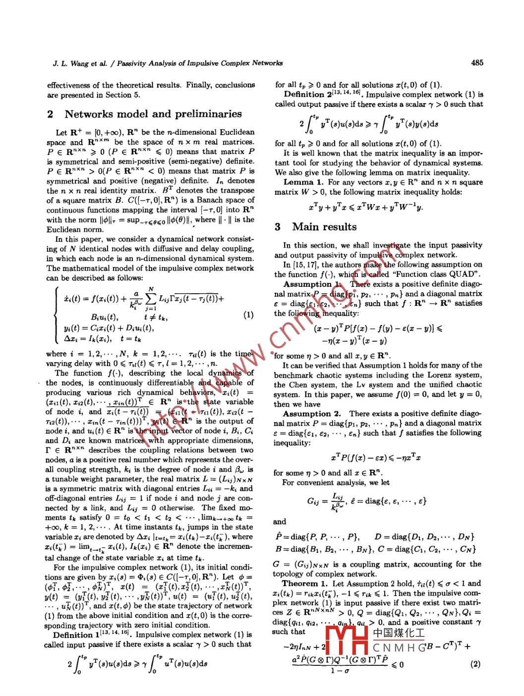 International Journal of Automation and Computing8(4), November 2011, 484-489DOI: 10.1007/811633-011-0607-zPassivity Analysis of Impulsive Complex NetworksJin-Liang Wang'Huai-Ning Wu1Zhi-Chun Yang2Science and Technology on Aircraft Control Laboratory, School of Automation Science and Electrical Engineering, Beihang University,Beijing 100191, PRC2College of Mathematice Science, Chongqing Normal Universit, Chongqing 400047, PRCAbstract: In this paper, we first investigate input passivity and output passivity for a class of impulsive complex networks withtime varying delays. By constructing suitable Lyapunov functionals, some input passivity and output passivity conditions are derivedfor the impulsive complex networks. Finally, an example is given to show the effectiveness of the proposed criteria.Keywords: Impulsive complex networks, time varying delays, input p88sive, output passive, Lyapunov functional.1 Introductionsystems and neural networks, and many interesting resultshave been derived!5-12. Song et al.l8l investigated the pas-In the past ten years, there have been much activity tosivity for a cla8s of discrete-time stochastic neural networkswards studying the topology and dynamical behavior ofwith time varying delays. A generalized activation functioncomplex networks across manyfields of science and enwas considered, where the traditional assumptions on thegineering, such as power grids, communication networks,boundedness, monotony and differentiability of the activa-and Internet, the World Wide Web, metabolic systems,tion functions were removed. A delay-dependent pa88ivityfood webs, etc. One of the most remarkable phenomenacondition was derived in terms of linear matrix inequali-in the dynamics of complex networks is their spontaneousties (LMIs) by constructing a proper Lyapunov-Krasovskiisynchronizationl, which has been extensively investigated.functional and stochastic analysis technique. To our knowl-It is well known that impulsive effects are common pheedge, there are few studies on the passivity of complex dy-nomena in many systems such as computer networks, au-namical networks(13,14, in which Yao et al. obtained sometomatic control systems, signal processing systems andsuficient conditions on passivity properties for linear (ortelecommunications. Therefore, the study of complex netlinearized) complex dynamical networks with and withoutworks with impulsive effects is important for understandingcoupling delays (constant delay). However, in the practi~the dynamical behaviors of real networks. Recently, syn-cal evolutionaryprocesses of networks, absolute constantchronization of impulsive complex dynamical networks hasdelay may be scarce and delays frequently vary with time.been investigated by researchers. For instance, Cai et al.lTherefore, such simplifcation does not match the peculiari-investigated robust impulsive synchronization of complexties of real networks in many circumstances, and it is neces-delayed dynamical networks with nonsymmetrical couplingsary to further investigate the passivity properties of com-from the view point of dynamics and control. Some criplex delayed dynamical networks. In [11], Chen and Leeteria for robust impulsive synchronization were establishedfirst developed input passivity to study both input-outputand internal stability problems for feedback connections ofsystems. In [3], Li and Lai studied the adaptive impulsivediscrete-time linear descriptor systems. By applying thesynchronization of uncertain complex dynamical networks.input passivity and Lyapunov theory, Chang et al.L2] de-On the basis of the stability analysis of impulsive system,rived the relaxed stability conditions to guarantee the sta-several network synchronization criteria for local and globalbility and passivity property of closed-loop systems. Toadaptive-impulsive synchronization were established. Zhouthe best of our knowledge, the input passivity of impul-et al.(4) investigated the synchronization of complex delayeddynamical networks with impulsive effects. Some criteriabeen established. Therefore, it is important and interestingwere derived for global synchronization based on the im-to study the input passivity of impulsive complex networkspulsive stability theory.with time-varying delays.On the other hand, passivity is also an important conceptMotivated by the above discussions, we investigate theof system theory and plays an important role in both elec-input passivity of complex delayed dynamical networks withtrical networks and nonlinear control systems, and providesimpulsive effects. As a natural extension of input passivity,a nice tool for analyzing the stability of systems. Therefore,we also introduce the output passivity in order to studythe passivity theory has received a lot of attention. In recentthe dynamical behavior of impulsive complex networks in ayears, some researchers have studied the passivity of fuzzymuch better way.The rest of thThis work was supported by National Natural Science FaSection 2, ou中國煤化工opulsive complexdation. of. China_ (No. 10971240,No. 6100404,No 61074057),networks withCN M H Gsented and some(No. CSTC2008BB2364),F(xiàn)oundation of Science and Technologypreliminaries ac g:YH∈ai ipui auu output passivityProject of Chongqing Education Commission(No. KJ080806), Fun-criteria are established in Section 3. In Section 4, a numer-nd& for the Central Universities, China(No. YWF- 10-01-A19).ical example and its simulation are given to illustrate theJ. L. Wang et al. / Passivity Analysis of Impulsive Complex Networks485effectiveness of the theoretical results. Finally, conclusionsfor all tp≥0 and for all solutions x(t,0) of (1).are presented in Section 5.Definition 2Impulsive complex network (1) iscalled output passive if there exists a scalar ry > 0 such that2 Networks model and preliminariesLet R+ = [0, +∞), R" be the n-dimensional Euclideanspace and rnxm be the space of nx m real matrices.P∈Rnxn≥0(P∈R"xn≤0)meansthatmatrixPI