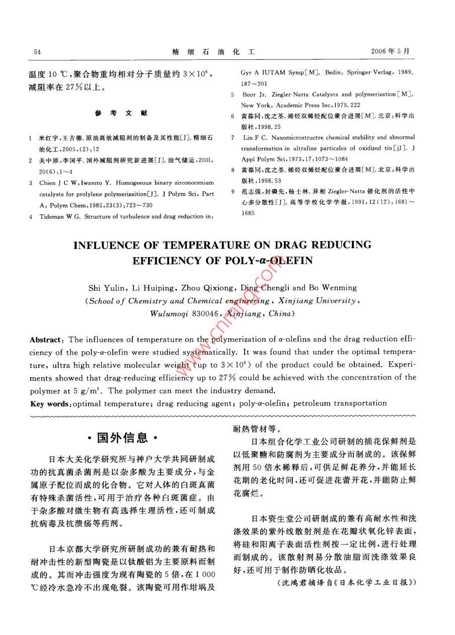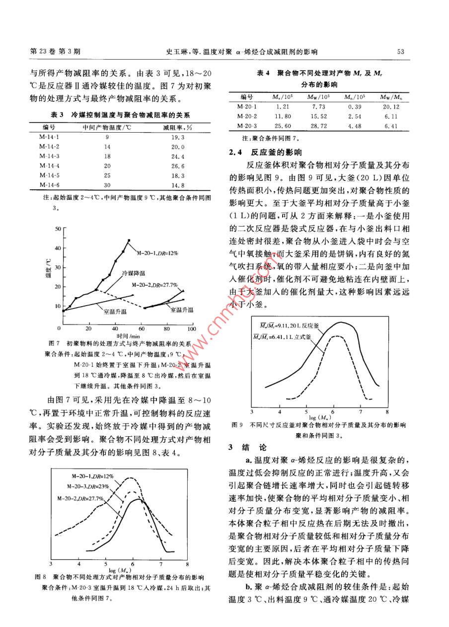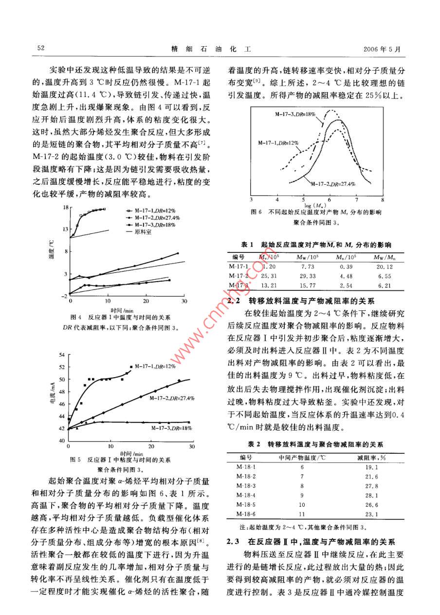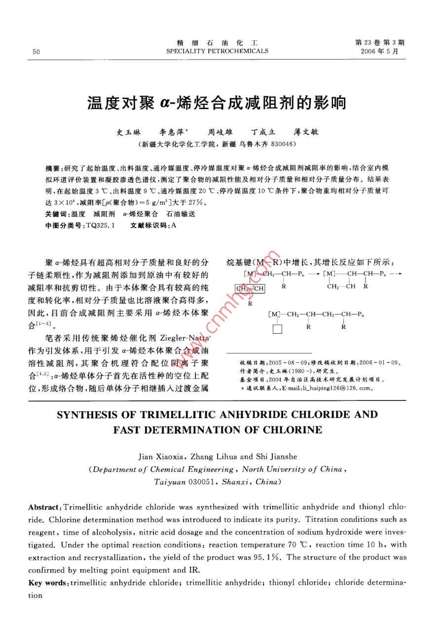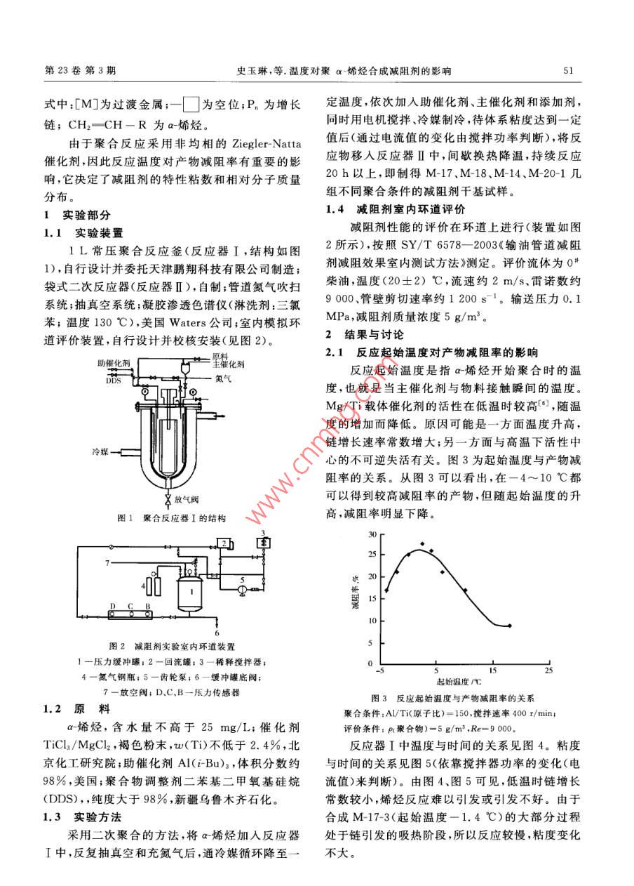 肖細(xì)石油化工第23卷第3期50SPECIALITY PETROCHEMICALS2006年5月溫度對聚a-烯烴合成減阻劑的影響史玉琳李惠萍"周岐雄丁成立薄文敏(新疆大學(xué)化學(xué)化工學(xué)院,新疆烏魯木齊830046)摘要:研究了起始溫度、出料溫度、通冷媒溫度、停冷媒溫度對聚a烯烴合成減阻劑減阻率的影響,結(jié)合室內(nèi)模擬環(huán)道評價(jià)裝置和凝膠滲透色譜儀,測定了聚合物的減阻性能及相對分子質(zhì)量和相對分子質(zhì)量分布。結(jié)果表明,在起始溫度3 C、出料溫度9 C、通冷媒溫度20 C、停冷媒溫度10 C條件下,聚合物重均相對分子質(zhì)量可達(dá)3X10* ,減阻率[p(聚合物)= 5 g/m]大于27%。關(guān)鍵詞:溫度減阻劑a烯烴聚合 石 油輸送中圖分類號:TQ325.1文獻(xiàn)標(biāo)識碼:A聚a-烯烴具有超高相對分子質(zhì)量和良好的分烷基鍵(M- R)中增長,其增長反應(yīng)如下所示:子鏈柔順性,作為減阻劑添加到原油中有較好的[M]- CH2- CH -P。一. M-_-.H CH-P,一.減阻率和抗剪切性。由于本體聚合具有較高的純CH-CHCH--CH R度和轉(zhuǎn)化率,相對分子質(zhì)量也比溶液聚合高得多,R因此,目前合成減阻劑主要采用a-烯烴本體聚[M]- CH2-CH- -CHz-CH- -P。合1~3]。口筆者采用傳統(tǒng)聚烯烴催化劑Ziegler Natta作為引發(fā)體系,用于引發(fā)a-烯烴本體聚合合成油溶性減阻劑,其聚合機(jī)理符合配位陰離子聚收稿日期:2005 -08 -09;修改稿收到日期:2006 -01 -09。作者簡介:史玉琳(1980 -),研究生。合1.5]:a-烯烴單體分子首先在活性種的空位上配基金項(xiàng)目:2004年自治區(qū)高技術(shù)研究發(fā)展計(jì)劃項(xiàng)目。位,形成絡(luò)合物,隨后單體分子相繼插人過渡金屬*通訊聯(lián)系人,E mail:li. .huipingl26@ 126. com.SYNTHESIS OF TRIMELLITIC ANHYDRIDE CHLORIDE ANDFAST DETERMINATION OF CHLORINEJian Xiaoxia, Zhang Lihua and Shi Jianshe(De partment of Chemical Engineering,North University of China,Taiyuan 030051, Shanxi, China)Abstract: Trimellitic anhydride chloride was synthesized with trimellitic anhydride and thionyl chlo-ride. Chlorine determination method was introduced to indicate its purity. Titration conditions such asreagent, time of alcoholysis, nitric acid dosage and the concentration of sodium hydroxide were inves-tigated. Under the optimal reaction conditions: reaction temperature 70 C,reaction time 10 h, withextraction and recrystallization, the yield of the product was 95.1%. The structure of the product wasconfirmed by melting point equipment and IR.Key words: trimellitic anhydride chloride; trimellitic anhydride; thionyl chloride; chloride determina-tion第23卷第3期史玉琳,等.溫度對聚a烯烴合成減阻劑的影響51式中:[M]為過渡金屬;-口為 空位;P。為增長定溫度,依次加入助催化劑、主催化劑和添加劑,同時(shí)用電機(jī)攪拌冷媒制冷,待體系粘度達(dá)到-定鏈; CH2- CH- R為a-烯烴。由于聚合反應(yīng)采用非均相的Ziegler Natta值后(通過電流值的變化由攪拌功率判斷),將反催化劑,因此反應(yīng)溫度對產(chǎn)物減阻率有重要的影應(yīng)物移入反應(yīng)器I中,間歇換熱降溫,持續(xù)反應(yīng)響,它決定了減阻劑的特性粘數(shù)和相對分子質(zhì)量20 h以上,即制得M-17、M-18、M-14、M-20-1幾組不同聚合條件的減阻劑干基試樣。分布。1實(shí)驗(yàn)部分1.4減阻劑室內(nèi)環(huán)道評價(jià)減阻劑性能的評價(jià)在環(huán)道上進(jìn)行(裝置如圖1.1 實(shí)驗(yàn)裝置1L常壓聚合反應(yīng)釜(反應(yīng)器I,結(jié)構(gòu)如圖2所示),按照SY/T 6578- -2003《輸 油管道減阻1),自行設(shè)計(jì)并委托天津鵬翔科技有限公司制造;劑減阻效果室內(nèi)測試方法》測定。評價(jià)流體為0# .袋式二次反應(yīng)器(反應(yīng)器[),自制;管道氮?dú)獯祾卟裼?溫度(20士2) C,流速約2 m/s、雷諾數(shù)約系統(tǒng);抽真空系統(tǒng);凝膠滲透色譜儀(淋洗劑:三氯9 000、管壁剪切速率約1 200 s-'。輸送壓力0.1苯;溫度130C),美國Waters公司;室內(nèi)模擬環(huán)MPa,減阻劑質(zhì)量濃度5 g/m'。道評價(jià)裝置,自行設(shè)計(jì)并校核安裝(見圖2)。2結(jié)果與討論2.1反應(yīng)起始溫度對產(chǎn)物減阻率的影響助催化劑:主催化劑反應(yīng)起始溫度是指a-烯烴開始聚合時(shí)的溫DS度,也就是當(dāng)主催化劑與物料接觸瞬間的溫度。15TMg/Ti載體催化劑的活性在低溫時(shí)較高[0,隨溫度的增加而降低。原因可能是一方面溫度升高,鏈增長速率常數(shù)增大;另- -方面與高溫下活性中心的不可逆失活有關(guān)。圖3為起始溫度與產(chǎn)物減可阻率的關(guān)系。從圖3可以看出,在一4~10 C都文放氣闞可以得到較高減阻率的產(chǎn)物,但隨起始溫度的升高,減阻率明顯下降。圖1 聚合反應(yīng)器I的結(jié)構(gòu)圖2001510 ts圖2減阻劑實(shí)驗(yàn) 室內(nèi)環(huán)道裝置1一壓力緩沖罐; 2-回流罐; 3-稀釋攪拌器;254-氤氣鋼瓶;5-齒輪泵;6 -縵沖罐底閥;起始溫度1心C7-放空閥: D.C、B一壓力傳感器圖3 反應(yīng)起始溫度與產(chǎn)物喊阻率的關(guān)系1.2原料聚合條件:Al/Ti(原子比)= 150,攪拌速率400 r/min;a-烯烴,含水量不高于25mg/L;催化劑評價(jià)條件: p聚合物)=5 g/m2 ,Re=9 00。TiCl/MgCl2 ,褐色粉末,w(Ti)不低于2.4% ,北反應(yīng)器I中溫度與時(shí)間的關(guān)系見圖4。粘度京化工研究院;助催化劑Al(i-Bu)s, 體積分?jǐn)?shù)約與時(shí)間的關(guān)系見圖5(依靠攪拌器功率的變化(電98%,美國;聚合物調(diào)整劑二苯基二甲氧基硅烷流值)來判斷)。 由圖4、圖5可見,低溫時(sh