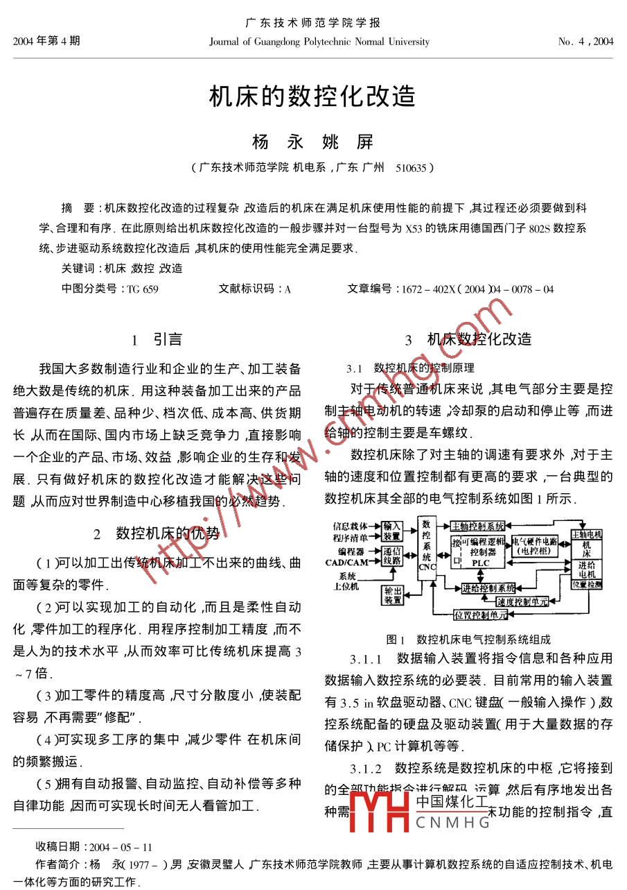 廣東技術(shù)師范學(xué)院學(xué)報(bào)2004年第4期Journal of Guangdong Polytechnic Normal UniversityNo.4,2004機(jī)床的數(shù)控化改造楊永姚屏廣東技術(shù)師范學(xué)院機(jī)電系,廣東廣州510635)摘要∶機(jī)床數(shù)控化改造的過程復(fù)雜改造后的機(jī)床在滿足機(jī)床使用性能的前提下其過程還必須要做到科學(xué)、合理和有序,在此原則給岀機(jī)床數(shù)控化改造的一般步驟并對(duì)一臺(tái)型號(hào)為X53的銑床用德國西門子802s數(shù)控系統(tǒng)、步進(jìn)驅(qū)動(dòng)系統(tǒng)數(shù)控化改造后其機(jī)床的使用性能完全滿足要求關(guān)鍵詞:機(jī)床漖控改造中圖分類號(hào):TG659文獻(xiàn)標(biāo)識(shí)碼:A文章編號(hào):1672-402X(2004)4-0078-041引言3機(jī)床數(shù)控化改造我國大多數(shù)制造行業(yè)和企業(yè)的生產(chǎn)、加工裝備3.1數(shù)控機(jī)床的控制原理絕大數(shù)是傳統(tǒng)的機(jī)床.用這種裝備加工出來的產(chǎn)品對(duì)于傳統(tǒng)普通機(jī)床來說其電氣部分主要是控普遍存在質(zhì)量差、品種少、檔次低、成本高、供貨期制主軸電動(dòng)機(jī)的轉(zhuǎn)速冷卻泵的啟動(dòng)和停止等而進(jìn)長(zhǎng)從而在國際、國內(nèi)市場(chǎng)上缺乏競(jìng)爭(zhēng)力,直接影響給軸的控制主要是車螺紋個(gè)企業(yè)的產(chǎn)品、市場(chǎng)、效益影響企業(yè)的生存和發(fā)數(shù)控機(jī)床除了對(duì)主軸的調(diào)速有要求外對(duì)于主展.只有做好機(jī)床的數(shù)控化改造才能解決這些問軸的速度和位置控制都有更高的要求,一臺(tái)典型的題從而應(yīng)對(duì)世界制造中心移植我國的必然趨勢(shì)數(shù)控機(jī)床其全部的電氣控制系統(tǒng)如圖1所示2數(shù)控機(jī)床的優(yōu)勢(shì)程清單敵人數(shù)→控系紉信息載體一麗控了編程逐租屬氣硬件電離小班編程器→系控制器L(電控柜)以加工出傳統(tǒng)機(jī)床加工不出來的曲線、曲 CAD/CAM面等復(fù)雜的零件上位機(jī)除輸出(2)以實(shí)現(xiàn)加工的自動(dòng)化而且是柔性自動(dòng)速度挖制的示一位置控制單辦化零件加工的程序化.用程序控制加工精度而不圖1數(shù)控機(jī)床電氣控制系統(tǒng)組成是人為的技術(shù)水平隊(duì)從而效率可比傳統(tǒng)機(jī)床提高3數(shù)據(jù)輸入裝置將指令信息和各種應(yīng)用7倍數(shù)據(jù)輸入數(shù)控系統(tǒng)的必要裝.目前常用的輸入裝置(3加工零件的精度高尺寸分散度小使裝配有3.5m軟盤驅(qū)動(dòng)器、CNC鍵盤一般輸入操作)數(shù)容易不再需要”修配”控系統(tǒng)配備的硬盤及驅(qū)動(dòng)裝置(用于大量數(shù)據(jù)的存(4河實(shí)現(xiàn)多工序的集中減少零件在機(jī)床間儲(chǔ)保護(hù)P℃計(jì)算機(jī)等等的頻繁搬運(yùn)3.1.2數(shù)控系統(tǒng)是數(shù)控機(jī)床的中樞,它將接到(5有自動(dòng)報(bào)警自動(dòng)監(jiān)控自動(dòng)補(bǔ)償?shù)榷喾N的全部功能傘行算然后有序地發(fā)出各自律功能因而可實(shí)現(xiàn)長(zhǎng)時(shí)間無人看管加工中國煤化種需CNM功能的控制指令直收稿日期:2004-05-11作者簡(jiǎn)介:楊永19〗77-)男安徽靈璧人廣東技術(shù)師范學(xué)院教師主要從事計(jì)算機(jī)數(shù)控系統(tǒng)的自適應(yīng)控制技術(shù)、機(jī)電一體化等方面的研究工作至運(yùn)動(dòng)和功能結(jié)束的節(jié)距精度所以系統(tǒng)的位移精度較低3.1.3可編程邏輯控制器是機(jī)床各項(xiàng)功能的3.2.2步電動(dòng)機(jī)或直流電機(jī)拖動(dòng)光柵測(cè)量反邏輯控制中心.它將來自CNC的眢種運(yùn)動(dòng)及玏能指饋旳閉環(huán)數(shù)控系統(tǒng)令進(jìn)行邏輯排序使它們能夠準(zhǔn)確地、協(xié)調(diào)有序地安該系統(tǒng)與開環(huán)系統(tǒng)的區(qū)別是油光柵、感應(yīng)同步全運(yùn)行同時(shí)將來自機(jī)床的各種信息及工作狀態(tài)傳器等位置檢測(cè)裝置測(cè)得的實(shí)際位置反饋信號(hào)隨時(shí)送給CNC使CNC能及時(shí)準(zhǔn)確地發(fā)岀進(jìn)一步的控制與給定值進(jìn)行比較將兩者的差值放大和變換驅(qū)動(dòng)指令如此實(shí)現(xiàn)對(duì)整個(gè)機(jī)床的控制執(zhí)行機(jī)構(gòu)以給定的速度向著消除偏差的方向運(yùn)動(dòng),3.1.4主軸驅(qū)動(dòng)系統(tǒng)接受來自CNC的驅(qū)動(dòng)指直到給定位置與反饋的實(shí)際位置旳差值等于零為令經(jīng)速度與轉(zhuǎn)短(功率)調(diào)節(jié)輸岀驅(qū)動(dòng)信號(hào)驅(qū)動(dòng)主止.閉環(huán)進(jìn)給系統(tǒng)在結(jié)構(gòu)上比開環(huán)進(jìn)給系統(tǒng)復(fù)雜,電動(dòng)機(jī)轉(zhuǎn)動(dòng)同時(shí)接受速度反饋實(shí)施速度閉環(huán)控制.成本也高對(duì)環(huán)境室溫要求嚴(yán).設(shè)計(jì)和調(diào)試都比開它還通過PC將主軸的各種現(xiàn)實(shí)工作狀態(tài)通告CNC環(huán)系統(tǒng)難.但是可以獲得比開環(huán)進(jìn)給系統(tǒng)更高的精用以完成對(duì)主軸的各項(xiàng)功能控制度更快的速度驅(qū)動(dòng)功率更大的特性指標(biāo).可根據(jù)3.1.5進(jìn)給伺服系統(tǒng)接受來自CNC對(duì)每個(gè)運(yùn)產(chǎn)品技術(shù)要求決定是否采用這種系統(tǒng)動(dòng)坐標(biāo)軸分別提供的速度指令經(jīng)速度與電流(轉(zhuǎn)3.2.3直流伺服電機(jī)拖動(dò