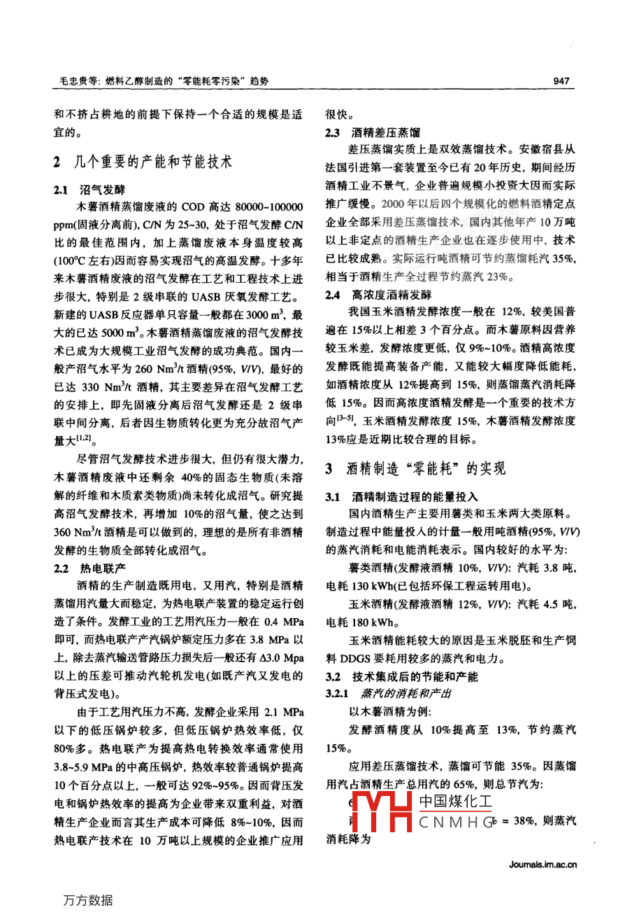 生物工程學(xué)報(bào)Chin J Biotech 2008, June 25: 24(6): 946-949journals. imaccnChinese Journal of Biotechnology IssN 1000-3061cjb e imaccn@2008 Institute of Microbiology, CAs& CSM, All rights reserved綜述燃料乙醇制造的“零能耗零污染”趨勢(shì)毛忠貴,張建華江南大學(xué)生物工程學(xué)院,無錫214122摘要:酒精蒸餾廢液有充足的非淀粉生物質(zhì)可供沼氣轉(zhuǎn)化,沼液營(yíng)養(yǎng)肀富可作酵母發(fā)酵工藝用水。通過酒精髙濃度發(fā)酵、沼氣高效轉(zhuǎn)化、沼氣熱電聯(lián)產(chǎn)、差壓蒸餾、環(huán)形過程工藝等產(chǎn)能、節(jié)能、無廢技術(shù)的研發(fā)和集成,將最終完成木薯原料燃料酒精制造向“零能耗、零污染”生產(chǎn)技術(shù)的轉(zhuǎn)型鍵詞:酒精發(fā)酵,木薯,沼氣發(fā)酵,零能耗,零污染Trend of"Zero Energy Consumption and Wastewater"in FuelEthanol productionZhonggui Mao, and Jianhua ZhangJiangnan University, College of Biotechnology, Wuxi 214122, ChinaAbstract: The energy consumption in a Chinese ethanol manufacturer with cassava as the feedstock, has been reduced to azero-closed level. If the r& d on technical integration of high ethanol concentration fermentation, methane fermentation technique,steam and electricity co-generation system, new distillation technology, and the wastewater reutilization, is camied out continuously,the proposed"zero energy consumption and wastewater"technique could be realized in fuel ethanol production process.Keywords: alcohol fermention, cassava, methane fermention, zero energy consumption, zero wastewater“非糧、無污染、低能耗”是我國(guó)燃料乙醇發(fā)1木薯原料展的先決條件,它既是一個(gè)重要的技術(shù)發(fā)展方向,也是下一輪燃料酒精產(chǎn)業(yè)順利發(fā)展必須建立的技術(shù)木薯是目前我國(guó)主要的非糧酒精發(fā)酵原料,也平臺(tái)。是世界上最大的能源作物之一。木薯是亞熱帶作物在“政產(chǎn)學(xué)”多方努力下,近年來我國(guó)酒精制進(jìn)我國(guó)自產(chǎn)約600多萬(wàn)噸。東南亞年產(chǎn)4000多萬(wàn)噸,是世界木薯主要產(chǎn)區(qū)之一,因需求拉動(dòng),近年來產(chǎn)技術(shù)已取得較大的進(jìn)展,特別是木薯酒精的實(shí)際制量增幅較大。2005年我國(guó)與東盟達(dá)成的186項(xiàng)“零造過程已接近“零能耗”??偨Y(jié)、提高、優(yōu)化并集成關(guān)稅”貿(mào)易協(xié)定中就有一項(xiàng)是木薯,一定規(guī)模的來先進(jìn)制造工藝和過程技術(shù),集中力量合作攻克幾個(gè)源是有保障的。技術(shù)關(guān)鍵,在國(guó)際上率先形成“無污染、零能耗”以木薯為原料生產(chǎn)酒精在我國(guó)已有幾十年歷史,的非糧生物質(zhì)能源制造產(chǎn)業(yè)化樣板,對(duì)推動(dòng)我國(guó)生目前10n多萬(wàn)咖枯術(shù)相對(duì)成熟,成本物質(zhì)能源產(chǎn)業(yè)健康發(fā)展有重要意義。也較YHE中國(guó)煤化工不消耗國(guó)內(nèi)糧食CNMHGReceIved: January 4, 2008: Accepted: March 12, 2008CorrespondingauthorZhongguiMaoE-mail:maozg@vip.163.com忠貴等:燃料乙醇制造的“零能耗零污染”趨勢(shì)947和不擠占耕地的前提下保持一個(gè)合適的規(guī)模是適很快。宜的。23酒精差壓蒸餾差壓蒸餾實(shí)質(zhì)上是雙效蒸餾技術(shù)。安徽宿縣從2幾個(gè)重要的產(chǎn)能和節(jié)能技術(shù)法國(guó)引進(jìn)第一套裝置至今已有20年歷史,期間經(jīng)歷21沼氣發(fā)酵酒精工業(yè)不景氣,企業(yè)普遍規(guī)模小投資大因而實(shí)際木薯酒精蒸餾廢液的COD高達(dá)80001000推廣緩慢。2000年以后四個(gè)規(guī)模化的燃料酒精定點(diǎn)ppm固液分離前),CN為25-30,處于沼氣發(fā)酵CN企業(yè)全部采用差壓蒸餾技術(shù),國(guó)內(nèi)其他年產(chǎn)10萬(wàn)噸比的最佳范圍內(nèi),加上蒸餾廢液本身溫度較高以上非定點(diǎn)的酒精生產(chǎn)企業(yè)也在逐步使用中,技術(shù)(100C左右因而容易實(shí)現(xiàn)沼氣的高溫發(fā)酵。十多年已比較成熟。實(shí)際運(yùn)行噸酒精可節(jié)約蒸餾耗汽35%,來木薯酒精廢液的沼氣發(fā)酵在工藝和工程技術(shù)上進(jìn)相當(dāng)于酒精生產(chǎn)全過程節(jié)約蒸汽23%。步很大,特別是2級(jí)串聯(lián)的UASB厭氧發(fā)酵工藝。2.4高濃度酒精發(fā)酵新建的UASB反應(yīng)器單只容量一般都在3000m3,最我國(guó)玉米酒精發(fā)酵濃度一般在12%,較美國(guó)普大的已達(dá)500m3。木薯酒精蒸餾廢液的沼氣發(fā)酵技遍在15%以上相差3個(gè)百分點(diǎn)。而木薯原料因營(yíng)養(yǎng)術(shù)已成為大規(guī)模工業(yè)沼氣發(fā)酵的成功典范。國(guó)內(nèi)一較玉米差,發(fā)酵濃度更低,僅9%-10%。酒精高濃度般產(chǎn)沼氣水平為260Nm3酒精(∞5%,W,最好的發(fā)酵既能提高裝備產(chǎn)能,又能較大幅度降低能耗,已達(dá)330Nm/t酒精,其主要差異在沼氣發(fā)酵工藝如酒精濃度從12%提高到15%,則蒸餾蒸汽消耗降的安排上,即先固液分離后沼氣發(fā)酵還是2級(jí)串低15%。因而高濃度酒精發(fā)酵是一個(gè)重要的技術(shù)方聯(lián)中間分離,后者因生物質(zhì)轉(zhuǎn)化更為充分故沼氣產(chǎn)向”,玉米酒精發(fā)酵濃度15%,木薯酒精發(fā)酵濃度量大1213%應(yīng)是近期比較合理的目標(biāo)。盡管沼氣發(fā)酵技術(shù)進(jìn)步很大,但仍有很大潛力木薯酒精廢液中還剩余40%的固態(tài)生物質(zhì)(未溶3酒精制造“零能耗”的實(shí)現(xiàn)解的纖維和