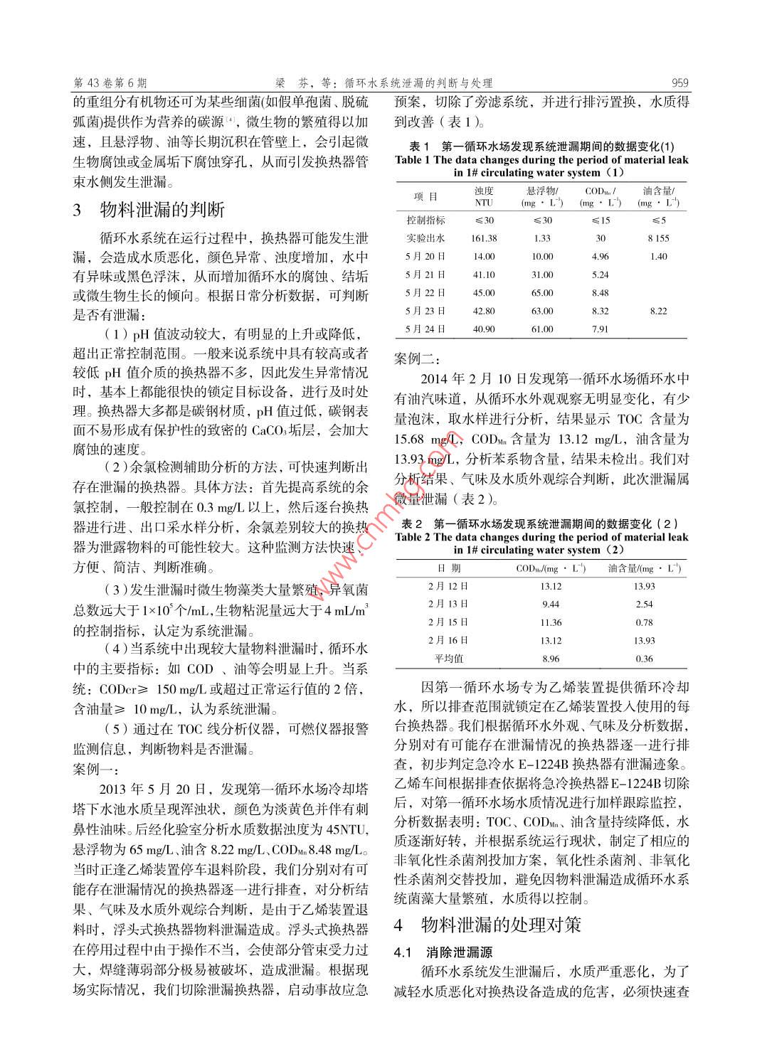 第43卷第6期當(dāng)代化工o1.43,No.62014年6月Contemporary Chemical IndustryJune, 2014循環(huán)水系統(tǒng)泄漏的判斷與處理梁芬,王爽中國(guó)石油撫順石化公司,遼寧撫順113008)的空幾為與眾用的次進(jìn)行使6年水長(zhǎng)的明的心,換熱發(fā)生關(guān)鍵詞:循環(huán)水系統(tǒng);泄漏:判斷;處理中圖分類號(hào):TE68文獻(xiàn)標(biāo)識(shí)碼:A文章編號(hào):1671-0460(2014)06-0958-03Diagnosis and Treatment of leakageAccidents in Circulating Cooling Water SystemLIANG Fen, WANG Shue( Petro China Fushun Petrochemical Company, Liaoning Fushun 113008, China)Abstract: Based on the reasons of the leakage of heat exchanger, according to the present situation of circulating watersystem, judging and treating methods of heat exchanger leakage accident were discussedKey words: Circulating water system; Leakage; Judgment; Treatment化工企業(yè)生產(chǎn)裝置重要的設(shè)備組成部分—換熱器,在長(zhǎng)周期運(yùn)行過(guò)程中,因受循環(huán)水水質(zhì)較差、換熱器泄漏的原因分析工藝介質(zhì)具有腐蝕性等原因的影響,很容易引發(fā)泄在生產(chǎn)裝置長(zhǎng)周期運(yùn)行和停車檢修過(guò)程中,換漏情況。系統(tǒng)一旦出現(xiàn)工藝介質(zhì)泄漏進(jìn)入,就會(huì)使熱器泄漏現(xiàn)象是普遍存在的。易發(fā)生泄漏的泄漏點(diǎn)整個(gè)循環(huán)水系統(tǒng)水質(zhì)發(fā)生異常、惡化,造成換熱效主要集中在換熱器管束、墊片、密封圈、小鍋等部率下降,能耗增加,成本升高的后果,嚴(yán)重時(shí)會(huì)導(dǎo)位。引發(fā)泄漏的主要原因有:管束腐蝕穿孔泄漏、致循環(huán)水系統(tǒng)停運(yùn)和生產(chǎn)裝置非計(jì)劃停工,造成墊片磨損泄漏、靜密封失效泄漏等,即有工藝方面較大的經(jīng)濟(jì)損失。因此,優(yōu)化循環(huán)水水質(zhì),做好預(yù)存在的問(wèn)題,也有設(shè)備先天不足的原因,還有施工防因水質(zhì)原因造成系統(tǒng)泄漏和泄漏后能準(zhǔn)確判斷漏質(zhì)量管理等方面的原因。點(diǎn)并及時(shí)切除泄漏換熱器,是保證循環(huán)水水質(zhì)平穩(wěn)21裝置工藝介質(zhì)有腐蝕性運(yùn)行的重要手段。換熱介質(zhì)腐蝕性較強(qiáng),如在乙烯裂解汽油加氫系統(tǒng)中,HS副產(chǎn)物會(huì)對(duì)換熱器產(chǎn)生腐蝕,引起1循環(huán)水系統(tǒng)概況換熱器管束介質(zhì)側(cè)發(fā)生泄漏。中國(guó)石油撫順石化公司共建兩個(gè)循環(huán)水場(chǎng),即22裝置生產(chǎn)負(fù)荷調(diào)整第一循環(huán)水場(chǎng)和第二循環(huán)水場(chǎng),于2011年建成,都因進(jìn)行工藝調(diào)整增減負(fù)荷,在操作過(guò)程中,介是由泵房、吸水間、冷卻塔、現(xiàn)場(chǎng)機(jī)柜室及變電所質(zhì)的溫度、壓力等突然發(fā)生變化,引起換熱器短期組成。冷卻塔為機(jī)械抽風(fēng)逆流式、采用背靠背設(shè)計(jì)。內(nèi)小鍋部位的泄漏。2.3換熱器檢修施工質(zhì)量不合格第一循環(huán)水場(chǎng)位于廠區(qū)西南部,單塔處理能力5000在檢修施工過(guò)程中,因施工人員圖省時(shí)省力,m/h,設(shè)計(jì)總規(guī)模6000,保有水量大約:2800未按要求安裝,換熱器小鍋的安裝不到位,施工質(zhì)m3,為乙烯裝置、汽油加氫裝置提供循環(huán)冷卻水量差等原因造成換熱器投用時(shí)發(fā)生泄漏現(xiàn)象。第二循環(huán)水場(chǎng)位于廠區(qū)東北部,單塔處理能力45024配件質(zhì)量差m/h,設(shè)計(jì)總規(guī)模45000m/h,保有水量大約:24000密封圈、墊片等質(zhì)量不合格,運(yùn)行一段時(shí)間后m,為丁苯橡膠裝置、高密度聚乙烯裝置、線性低因磨損會(huì)發(fā)生換熱器泄漏的情況密度聚乙烯裝置、芳烴裝置、丁二烯裝置、丁烯24循環(huán)水水質(zhì)差裝置、空分空壓裝置、儲(chǔ)運(yùn)裝置提供循環(huán)冷卻水。循環(huán)水系統(tǒng)發(fā)生泄漏后,水質(zhì)較差,泄漏物中收稿日期:2014-04作者簡(jiǎn)介:梁芬(1980-遼寧撫順人,助理工程師,2009年畢業(yè)于遼寧石油化工大學(xué)化工工藝專業(yè),研究方向;從事給排水技術(shù)管理工n@petrochina.com.cn。第43卷第6期梁芬,等:循環(huán)水系統(tǒng)泄漏的判斷與處理的重組分有機(jī)物還可為某些細(xì)菌(如假單孢菌、脫硫預(yù)案,切除了旁濾系統(tǒng),并進(jìn)行排污置換,水質(zhì)得弧菌提供作為營(yíng)養(yǎng)的碳源“,微生物的繁殖得以加到改善(表1)速,且懸浮物、油等長(zhǎng)期沉積在管壁上,會(huì)引起微表1第一循環(huán)水場(chǎng)發(fā)現(xiàn)系統(tǒng)泄漏期間的數(shù)據(jù)變化(1)生物腐蝕或金屬垢下腐蝕穿孔,從而引發(fā)換熱器管 Table 1 The data changes during the period of material leak束水側(cè)發(fā)生泄漏。in 1# circulating water system (1)CODM3物料泄漏的判斷項(xiàng)目控制指標(biāo)循環(huán)水系統(tǒng)在運(yùn)行過(guò)程中,換熱器可能發(fā)生泄實(shí)驗(yàn)出水1,338155漏,會(huì)造成水質(zhì)惡化,顏色異常、濁度增加,水中5月20日1410.00有異味或黑色浮沫,從而增加循環(huán)水的腐蝕、結(jié)垢5月21日4.1·3-0524或微生物生長(zhǎng)的傾向。根據(jù)日常分析數(shù)據(jù),可判斷5月22日是否有泄漏:5月23日(1)pH值波動(dòng)較大,有明顯的上升或降低5月24日40.90791超出正常控制范圍。一般來(lái)說(shuō)系統(tǒng)中具有較高或者案例較低pH值介質(zhì)的換熱器不多,因此發(fā)生異常情