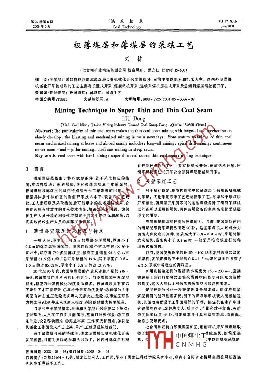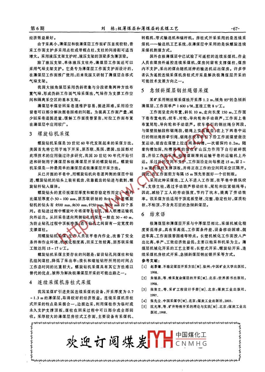 第27卷第6期‘煤炭技術(shù)Vol.27 ,No.62008年6月Coal TechnologyJun,2008極薄煤層和薄煤層的采煤工藝劉棟(七臺河礦業(yè)精煤集團公司新富煤礦,黑龍江七臺河154600)摘要:薄煤層開采的特 殊性造成薄煤層長壁機械化開采發(fā)展緩慢,目前主要以炮采和機采為主。國內(nèi)外薄煤層.機械化開采較成熟的工藝主要有長壁式開采、螺旋鉆機開采、連續(xù)采煤機房柱式開采及急傾斜煤層鋼絲鋸開采。關(guān)鍵詞:難采煤層;極薄煤層;薄煤層;采煤工藝中圖分類號:TD823文獻標識碼:A文章編號:1008 - 8725(2008)06 - 0066 - 02Mining Technique in Super Thin and Thin Coal SeamLIU Dong(Xinfu Coal Mine , Qitaihe Mining Industry Cleaned Coal Group Comp. ,Qitaihe 154600 ,China)Abstract: The particularity of thin coal seam makes the thin coal seam mining with longwall and mechanizationslowly develop, the blasting and mechanized mining is main nowadays. More mature technique of thin coalseam mechanized mining at home and abroad mainly includes: longwall mining, spiral drill mining , continuousminer room - and - pillar mining, steel saw mining in steep seam.Key words :coal seam with hard mining; super thin coal seam; thin coal seam; mining technique化開采較成熟的工藝主要有長壁式開采、螺旋鉆機開采、連0前言續(xù)采煤機房柱式開采及急傾斜煤層鋼絲鋸開采。難采煤層是指由于特殊賦存條件,若不采取相應(yīng)的措2長壁采煤工藝施,難以有效地開采的煤層,薄和極薄煤層屬于難采煤層。極薄煤層和薄煤層的賦存特點給開采工作帶來的困難。應(yīng)對于賦存穩(wěn)定、地質(zhì)構(gòu)造簡單的薄煤層可采用長壁機械根據(jù)具體條件和礦區(qū)的當前開采技術(shù)水平、裝備和工藝現(xiàn)化采煤。無論采用綜采工藝還是普采工藝,與厚和中厚煤層狀、工人素質(zhì)以及采取措施后可能帶來的技術(shù)經(jīng)濟效果,合開采相比,薄煤層開采所不同的是破煤設(shè)備除了滾筒采煤機理地選擇有針對性的開采技術(shù)措施,解決難采的問題。為保以外還可以采用刨煤機,兩種破煤設(shè)備的空間高度都受煤層護生產(chǎn)人員開采的積極性應(yīng)制定不同的生產(chǎn)指標和政策,以厚度的限制。真實地反映生產(chǎn)人員的實際工作貢獻。滾簡采煤機具有較高的破謀能力。目前,我國研制使用的薄煤層滾簡采煤機已有近20種。這些采煤機大致可分為1薄煤層資源及開采狀況與特點騎溜式和爬底式兩種,當采高大于0.8~0.9 m時,采用騎溜一般認為,厚度小于1.3 m的煤層為薄煤層,厚度小于式采煤機;當采高小于0.8 m時,一般采用沿底板運行的爬0.8 m的煤層屬極薄煤層。我國在近80個礦區(qū)中的400多個底板式采煤機。礦井中,賦存著750多層薄煤層,保有工業(yè)儲量98.3億1,可目前,我國使用最多的是BM-100型薄煤層騎溜式滾筒采儲量61.5億t,約占總可采儲量的19%,其中摩度在0.8~采煤機,該采煤機適應(yīng)于采高0.8-1.3 m,煤的堅固性系數(shù)f1.3m的占86.02% ,厚度小于0.8 m的占13.98%?!?.5,頂板中等穩(wěn)定的薄煤層。20世紀90年代,我國薄煤層的產(chǎn)量只占總產(chǎn)量的8% ~礦用刮板輸送機的溜槽最小高度為150~ 200 mm,直接10% ,極薄煤層產(chǎn)量所占的比例更少。與厚煤層和中厚煤層在底板上運行的爬底式滾簡采煤機空間高度可以減去溜槽相比,相應(yīng)的采煤機械化程度要低得多。極薄煤層只有在以的高度,這大大降低了對采煤機采煤空間的高度要求。下條件下才可能開采:①屬特殊需要的優(yōu)質(zhì)煤;②相鄰的主采煤層開采的另外-種破煤設(shè)備是刨煤機。刨煤機用沿煤層有沖擊地壓危險或有煤與瓦斯突出危險,極薄煤層可作煤層切削的刨刀刨落煤炭,刨下的煤靠犁形板裝人刮板輸送為解放層;③礦井或采區(qū)尚未報廢,剩余的儲量為極薄煤層。機,其驅(qū)動裝置設(shè)于工作面端部的平巷。刨煤機在生產(chǎn)中具與厚和中厚煤層相比,極薄和薄煤層開采存在以下特點:有破煤能耗少、煤的塊度大、粉塵少、產(chǎn)量和效率較高、勞動①采商低,人員在工作面只能爬行,甚至以臥姿作業(yè);②工作強度低等優(yōu)點;另外,刨煤機本身還具有結(jié)構(gòu)簡單、造價低、條件差,設(shè)備移動困難;③掘進率高,工作面接昝困難;④長壁檢修方便等優(yōu)點。機械化工作面投入產(chǎn)出比高,單產(chǎn)、工效及經(jīng)濟效益低。七臺河和雙鴨山等薄煤層礦區(qū),用刨煤機開采薄煤層取由于薄煤層開采的特殊性,造成薄煤層長璧機械化開采得了中國煤化工-土截煤機、滾筒采煤發(fā)展緩慢,目前主要以炮采和機采為主。國內(nèi)外薄煤層機械機、沖以刨媒機采煤的YHCNMHG收稿日期:2008 -01- 16;修訂日期:2008 -04-08作者簡介:劉棟(1964-),男,黑龍江勃利人,工程師,畢業(yè)于黑龍江科技學院采礦專業(yè),現(xiàn)在七臺河礦業(yè)精煤集團公司新富煤礦從事采煤技術(shù)工作。第6期劉棟:極薄煤層和薄煤層的采煤工 藝●67.經(jīng)濟效益最好。轉(zhuǎn)載機、帶式輸送機和錨桿機。房柱式開采采用的是連續(xù)采由于采高小,薄煤層和極薄煤層工作面礦壓顯現(xiàn)較輕,普.煤機-- 輸送機工藝系統(tǒng),在薄煤層中采用的是縱螺旋連續(xù)采工作面支護多采用點柱或帶帽點柱,支柱的間排距可適當采煤機割煤方式。增大。采用液壓支架支護時,液壓支架的頂梁多為薄頂梁。國外在極薄煤層中已試驗了可遙控的連續(xù)采煤機,作業(yè)除了液壓支架、單