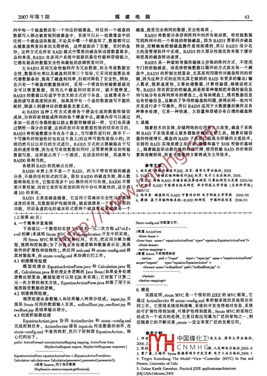 _42福建電腦2007年第7期RAID技術(shù)研究方文平(新疆建設(shè)職業(yè)技術(shù)學院新疆烏魯木齊830054 )[摘要]:計算機的發(fā)展,對信息的存儲技術(shù)提出了更高的要求。但是磁盤的I0性能始終成為提升的瓶頸。為了解決這一問題,提出了RAID陣列。RAID陣列采用數(shù)據(jù)分塊技術(shù),在多個磁盤上交叉存儲使得多盤可平行操作,I0響應(yīng)時間得到改善,同時利用冗余容錯技術(shù),極大提高了磁盤陣列的可靠性和安全性。[關(guān)鍵詞]: RAID 存儲陣列冗余1.前言.余保證了用戶數(shù)據(jù)的安全性。隨著網(wǎng)絡(luò)技術(shù)和計算機技術(shù)的迅猛發(fā)展,網(wǎng)絡(luò)帶寬與處理輔助技術(shù):因為RAID系統(tǒng)在操作用戶數(shù)據(jù)時需要花費時器性能基本上保持了同步增長,但磁盤I0性能的增長卻是嚴間來產(chǎn)生 和檢查"核查"數(shù)據(jù),這樣就產(chǎn)生了操作瓶頸,使整個系重滯后的。在過去10年,局域網(wǎng)的帶寬平均每16個月就增長一統(tǒng)的性 能受到重大影響。為了克服它,RAID系統(tǒng)融入了一些輔倍;而在1984年到1999年這15年間,磁盤的容量雖然增長了助技術(shù),如:高速緩存、并行處理、助寫盤和數(shù)據(jù)映射技巧等,它.1000倍,但傳輸速率僅增長了40倍,亦即每年僅增長20%多。們都在不同程度上減小了瓶頸, 提高了性能。未來每10年,磁盤的容量將增長100倍,而傳輸速率僅會增長正是以上這些功能的加入才使得RAID系統(tǒng)性能越來越完10倍。目前,硬盤典型容量為160 GB ,典型IO性能為30MB/s,善,使普通的磁盤陣列上升為智能RAID系統(tǒng),從基本上解決了將整個硬盤的數(shù)據(jù)讀出需要1.5h。到2020年,單條網(wǎng)絡(luò)鏈接的-直以來阻礙計算機發(fā)展的"I/O"瓶頸,并且在許多其它方面也帶寬可以達到400 Tbps,單個硬盤的容量可達到1IPB, 而那時磁發(fā)揮了 巨大的作用,主要表現(xiàn)為:盤的I/0性能只能達到2.5Gbps,將整個硬盤數(shù)據(jù)讀出居然需要I/O性能:RAID系統(tǒng)有效提高了IO性能,這主要是因為系932h!磁盤I0性能的滯后會成為計算機系統(tǒng)乃至網(wǎng)絡(luò)傳輸整統(tǒng)對數(shù)據(jù)所做的操作使系統(tǒng)中各成員盤的數(shù)據(jù)流的輸人輸出和體性能提升的瓶頸。隨機的1I0請求達到平衡。同時,系統(tǒng)所采用的映射方式也提高為了克服I0瓶頸問題,美國加州大學Berkeley 分校提出了 數(shù)據(jù)的傳輸效率,如:-些映射方式把用戶數(shù)據(jù)分成許多小部了廉價冗余磁盤陣列RAID (redundant aray of inexpensive diske)分 ,然后把它們同時寫到不同的盤上,從而提高寫數(shù)據(jù)的效率。的概念,后來改為獨立冗余磁盤陣列RAID (redundant aray of數(shù)據(jù)安全:RAID系統(tǒng)大大提高了數(shù)據(jù)存儲的安全性。如果independent disks),目前己成為數(shù)據(jù)存儲的主流技術(shù)。存有用戶數(shù)據(jù)的磁盤出現(xiàn)故障,系統(tǒng)會通過使用"核查"數(shù)據(jù)對2. RAID技術(shù)原理用戶數(shù)據(jù)進行恢復。當然,RAID系統(tǒng)對數(shù)據(jù)所做的處理不同,得RAID系統(tǒng)由兩個主要部件組成:控制器及磁盤陣列??刂频降陌踩砸簿筒煌?。 但總的來說,RAID系統(tǒng)普遍地提高了數(shù)器是RAID系統(tǒng)的"大腦" ,負責路由、緩沖以及管理主機(或網(wǎng)據(jù)的安全性。絡(luò))和磁盤陣列之間的數(shù)據(jù)流。磁盤陣列是把多個磁盤組織起存儲管理:RAID系統(tǒng)簡化了存儲系統(tǒng)的管理。磁盤陣列將來,由陣列管理程序進行統(tǒng)一管理,而給用戶看到的是一個或多多個物 理磁盤"結(jié)合"成一個虛擬磁盤,這樣就使得原來對多個個虛擬盤。當用戶對這個虛擬磁盤進行操作時,這些操作經(jīng)過管存 儲單元的管理轉(zhuǎn)化為對單個存儲單元的管理,從而減少了管理程序的處理,最終由物理磁盤執(zhí)行,并將結(jié)果告訴給用戶,這理的工作量,使管理更為方便。些處理對用戶來說是完全透明的,用戶不必知道數(shù)據(jù)是如何存總之,RAID系統(tǒng)就是將大量磁盤通過陣列管理系統(tǒng)組織起儲的,-切工作都由程序執(zhí)行,用戶對磁盤陣列的操作與對一-般來,形成磁盤陣列,從而提高存儲系統(tǒng)的安全性和I/0性能。硬盤進行的操作沒有區(qū)別。4. RAID級別分類及比較RAID使用一組磁盤同時進行I0操作從而獲得更大的I0RAID從概念的提出到現(xiàn)在,已經(jīng)出現(xiàn)了多個級別,有明確吞吐量,并依靠存儲冗余信息來保障數(shù)據(jù)的安全性。RAID可以標準的級別分別是0.1.2.3.4.5 等。但是最常用的是0、1.3.5連接SAN、NAS網(wǎng)絡(luò)或直接連到主機服務(wù)器上,以網(wǎng)絡(luò)連接存儲四個級別。 現(xiàn)在簡述一下各個級別的工作方式和特點:系統(tǒng)的方式提供服務(wù)。1) RAIDO:又稱為集帶(Sriping)工作方式,是N個磁盤同時3. RAID系統(tǒng)的特點工作。系統(tǒng)傳輸來的數(shù)據(jù),經(jīng)過RAID控制器平均分配到N個磁RAID系統(tǒng)的一個明顯優(yōu)勢是擴大了磁盤的容量。除容量盤中 。從系統(tǒng)的角度看,N個硬盤是- -個容量為N個硬盤容量之外,RAID在可管理性、可靠性及其它性能方面都有其優(yōu)勢。其特和的“大"硬盤。 RAIDO 的主要目的是獲得更大的“單個"磁盤容點主要表現(xiàn)在:量。另一方面就是多個硬盤同時讀取,從而獲得更高的存取速數(shù)據(jù)冗余:將用戶數(shù)