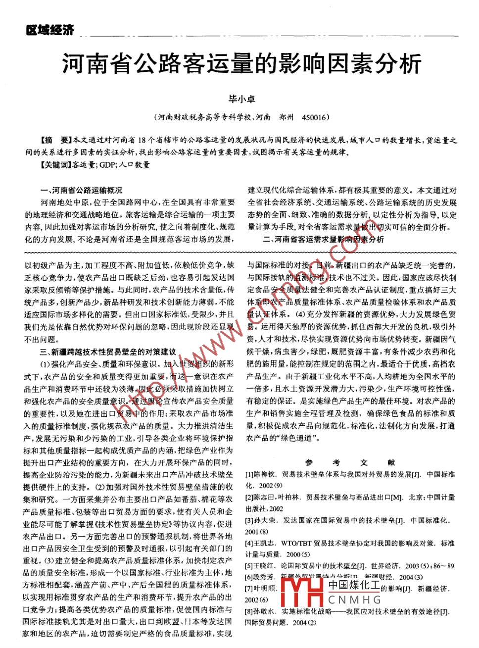 區(qū)域經(jīng)濟(jì)河南省公路客運量的影響因素分析畢小卓(河南財政稅務(wù)高等??茖W(xué)校,河南鄭州450016)[摘要]本文通過對河南省 18個省轄市的公路客運量的發(fā)展?fàn)顩r與國民經(jīng)濟(jì)的快速發(fā)展,城市人口的數(shù)量增長,貨運量之間的關(guān)系進(jìn)行多因素的實證分析,找出影響公路客運量的重要因素,試圖揭示有關(guān)客運量的規(guī)律。[關(guān)鍵詞]客運量;GDP;人口數(shù)量一、河南省公路運輸概況建立現(xiàn)代化綜合運輸體系,都有極其重要的意義。本文通過對河南地處中原,位于全國路網(wǎng)中心,在全國具有非常重要全省社會經(jīng)濟(jì)系統(tǒng)、交通運輸系統(tǒng)、公路運輸系統(tǒng)的歷史發(fā)展的地理經(jīng)濟(jì)和交通戰(zhàn)略地位。旅客運輸是綜合運輸?shù)囊豁椫饕獞B(tài)勢的全面、細(xì)致、準(zhǔn)確的數(shù)據(jù)分析,以定性分析為指導(dǎo),以定內(nèi)容,因此加強(qiáng)對客運市場的分析研究,使之向著制度化、規(guī)范量計算為手段,對全省客運需求量做出切實可信的全面分析?;姆较虬l(fā)展,不論是河南省還是全國規(guī)范客運市場的發(fā)展,二、河南省客運需求量影響因素分析以初級產(chǎn)品為主,加工程度不高、附加值低,依賴低價競爭,缺與國際標(biāo)準(zhǔn)的對接。目前,新疆出口的農(nóng)產(chǎn)品缺乏統(tǒng)-完善的,乏核心競爭力,使衣產(chǎn)品出口既缺乏后勁.也容易引起發(fā)達(dá)國與國際接軌的監(jiān)測標(biāo)準(zhǔn),技術(shù)也不過關(guān)。因此,國家應(yīng)該盡快制家采取反傾銷等保護(hù)措施。與此同時,農(nóng)產(chǎn)品的技術(shù)含量低,傳定 食品安全質(zhì)量法健全和完善農(nóng)產(chǎn)品認(rèn)證制度,重點搞好三大統(tǒng)產(chǎn)品多,創(chuàng)新產(chǎn)品少,新品種研發(fā)和技術(shù)創(chuàng)新能力薄弱,不能體系即農(nóng)產(chǎn)品質(zhì)量標(biāo)準(zhǔn)體系、農(nóng)產(chǎn)品質(zhì)量檢驗體系和農(nóng)產(chǎn)品質(zhì)適應(yīng)國際市場多樣化的需要。但出口國家標(biāo)準(zhǔn)低,受限少,并且量認(rèn)證體系。 (4) 充分發(fā)揮新疆的資源優(yōu)勢,大力發(fā)展綠色貿(mào)我們光是依靠自然優(yōu)勢對環(huán)保問題的忽略,因此現(xiàn)階段還顯現(xiàn)易。運用得天獨厚的資源優(yōu)勢,抓住西部大開發(fā)的良機(jī).吸引外不出問題。資,人才和技術(shù),盡快實現(xiàn)資源優(yōu)勢向市場優(yōu)勢轉(zhuǎn)變.新疆因氣三、新疆跨越技術(shù)性貿(mào)易壁壘的對策建議候干燥,病蟲害少,綠肥,廄肥資源豐富,有條件減少農(nóng)藥和化(1)強(qiáng)化產(chǎn)品安全、質(zhì)量和環(huán)保意識。加入世貿(mào)組織的新形肥的施 用量,能控制在規(guī)定的范圍之內(nèi),最適合于優(yōu)質(zhì),高檔農(nóng)式下,農(nóng)產(chǎn)品的安全和質(zhì)量變得更加重要,而這一意識在農(nóng)產(chǎn)產(chǎn) 品生產(chǎn)。由于新疆工業(yè)化水平不高,人均耕地為全國水平的品生產(chǎn)和消費環(huán)節(jié)中還較為淡薄,因此必須采取措施加快樹立一倍多,且水土資源開發(fā)潛力大,污染少,生產(chǎn)環(huán)境可控性強(qiáng),和強(qiáng)化農(nóng)產(chǎn)品的安全質(zhì)量意識。通過輿論宣傳農(nóng)產(chǎn)品安全質(zhì)量有 穩(wěn)定的保證。是實施綠色產(chǎn)品生產(chǎn)的最佳環(huán)境。對農(nóng)產(chǎn)品的的重要性,以及她在進(jìn)出口貿(mào)易中的作用;采取農(nóng)產(chǎn)品市場準(zhǔn)生產(chǎn)和銷售實施全程管理及檢測,確保綠色食品的標(biāo)準(zhǔn)和質(zhì)入的質(zhì)量標(biāo)準(zhǔn)制度,強(qiáng)化規(guī)范農(nóng)產(chǎn)品的質(zhì)量。大力推進(jìn)清潔生量, 積極促成農(nóng)產(chǎn)品向規(guī)范化標(biāo)準(zhǔn)化.法制化方向發(fā)展,打通產(chǎn),發(fā)展無污染和少污染的工業(yè),引導(dǎo)各類企業(yè)將環(huán)境保護(hù)指農(nóng)產(chǎn) 品的“綠色通道”。標(biāo)和其他質(zhì)量指標(biāo)一-起構(gòu)成優(yōu)質(zhì)產(chǎn)品的內(nèi)涵,把綠色產(chǎn)業(yè)作為提升出口產(chǎn)業(yè)結(jié)構(gòu)的重要方向,在大力開展環(huán)保產(chǎn)品的同時,參文獻(xiàn)提高企業(yè)防治污染的能力為新疆未來出口產(chǎn)品沖破技術(shù)璧壘[]陳柳欽. 貿(mào)易技術(shù)壁壘體系與我國對外貿(mào)易的發(fā)展[].中國標(biāo)準(zhǔn)提供硬件.上的支持。(2) 加強(qiáng)對國外技術(shù)性貿(mào)易壁壘措施的收化. 2002(9)集和研究。一方面采集并公布主要出口產(chǎn)品如番茄、棉花等農(nóng)(2陳志田,葉柏林. 貿(mào)易技術(shù)壁壘與商品進(jìn)出口M.北京:中國計量產(chǎn)品質(zhì)量標(biāo)準(zhǔn)、包裝等出口貿(mào)易方面的要求,使有關(guān)人員和企出版社,2002業(yè)能盡可能了解掌握技術(shù)性貿(mào)易壁壘協(xié)定》等協(xié)議內(nèi)容,促進(jìn)(3]孫大果. 發(fā)達(dá)國家在國際貿(mào)易中的技術(shù)壁壘[I.中國標(biāo)準(zhǔn)化.農(nóng)產(chǎn)品出口。另-方面完善出口的預(yù)警通報機(jī)制,將世界各地200 (8)[4]王凱志、WTO/TBT 貿(mào)易技術(shù)壁壘協(xié)定對我國的影響及對策.標(biāo)準(zhǔn)出口產(chǎn)品因安全衛(wèi)生受到的預(yù)警及時通報,以引起有關(guān)部門的計量與質(zhì)量.2000(