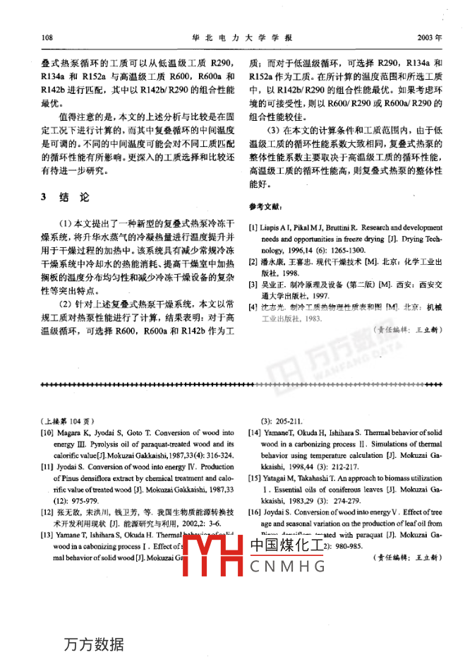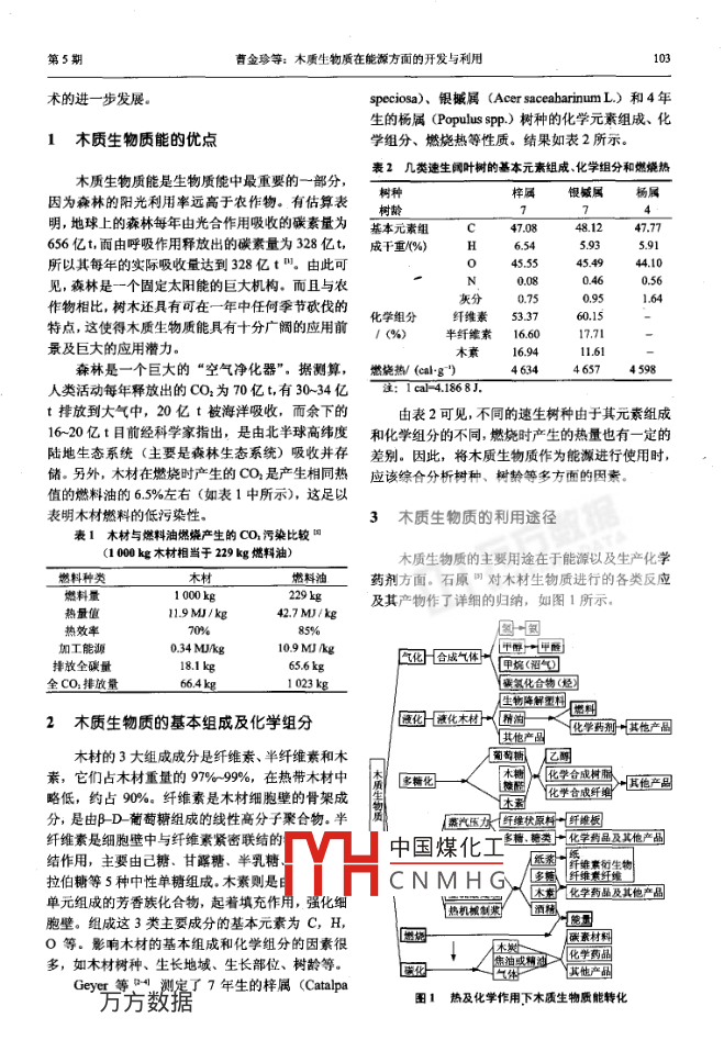 第30卷第5期華北電力大學(xué)學(xué)報Vol30. No, 52003年9月Journal of North China Electri Power University2003文章編號:1007-2691(2003)050102403木質(zhì)生物質(zhì)在能源方面的開發(fā)與利用曹金珍,張壁光,趙廣杰(北京林業(yè)大學(xué)工學(xué)院,北京100083)要:針對目前的能源形勢,從木質(zhì)生物質(zhì)能的儲存以及木質(zhì)生物質(zhì)能與化石能源產(chǎn)生污染的比較出發(fā)提出了木質(zhì)生物質(zhì)在未來能源領(lǐng)域的應(yīng)用潛力及應(yīng)用前景介紹了木質(zhì)生物質(zhì)的基本組成和化學(xué)組分,木質(zhì)生物質(zhì)作為能源的利用途徑——直接燃燒、氣化,液化和碳化等,以及在其利用技術(shù)方面的最新研究進(jìn)展。日在引起對木質(zhì)生物質(zhì)的能源潛力和木質(zhì)生物質(zhì)能轉(zhuǎn)化技術(shù)的普遍關(guān)注,從而促進(jìn)該技術(shù)的進(jìn)一步發(fā)關(guān)鍵詞:木村;生物質(zhì);能源中圖分類號:TK6文獻(xiàn)標(biāo)識碼:ADevelopment and application of wooden biomassCAO Jin-zhen, ZHANG Bi-guang, ZHAO Guang-jie(School of Technology, Beijing Forestry University, Beijing 100083, China)Abstract: In regard to present situation of energy source, this article started from the accumalation of woodenbiomass energy and the comparison of the pollution produced by wooden biomass energy and fossil energy, andfurther put forward the application potential and expectation of wooden biomass in future energy source, Alsetroduced briefly in this article are the essential composition and chemical constitucnts of wooden biomass. theplication methods of wooden biomass as energy.direct combustion, gasification, liquidation, and carbonization,and the novelist research progress that has been made on these application technologies. The purpose of this erticleis to provide a basic introduction of the potential of wood biomass as an energy source, atartof researchers to the exchanging technologies from wooden biomass to energy, and finally further improve theseKey words: wood; biomass;: energy source近年來,圍繞著生物質(zhì)能研究者們開展了廣泛而深入的研究,尤其是在木質(zhì)生物質(zhì)能方面。目前,生物質(zhì)燃料在歐洲已經(jīng)受到非常的重視,例如自從1972年的石油危機以來,人類開始意識瑞典、荷蘭等。但是,在我國,生物質(zhì)能的開發(fā)與到尋找其他可再生能源來代替煤,石油和天然氣等利用還處在起步階段,特別是對木質(zhì)生物質(zhì)能還沒化石能源的必要性和緊迫性,另外,中國煤化工這種情況,本文將從木材的基燒時釋放出大量的CO,CE和NO一介紹木質(zhì)生物質(zhì)能的生產(chǎn)途徑環(huán)境和氣候造成了嚴(yán)重的不良影響,CNMHG一氣化、液化,碳化等方面研種可再生、低污染的能源形式,生物質(zhì)能在未來的究者們的最新研究進(jìn)展,旨在引起國內(nèi)研究者們對源中占有不可估量的地位,木質(zhì)生物質(zhì)能轉(zhuǎn)化技術(shù)的普遍關(guān)注,從而促進(jìn)該技收稿日期:200304-30.作者簡介:曹金珍(1978-),女,北京林業(yè)人學(xué)工學(xué)院研究生第5期曹金珍等:木質(zhì)生物質(zhì)在能源方面的開發(fā)與利用術(shù)的進(jìn)一步發(fā)展。speciosa)、銀槭屬( Acer saccharinum L)和4年生的楊屬( Populus sp)樹種的化學(xué)元素組成、木質(zhì)生物質(zhì)能的優(yōu)點學(xué)組分、燃燒熱等性質(zhì)。結(jié)果如表2所示表2幾類速生闊葉樹的基本元素組成化學(xué)組分和燃燥熱木質(zhì)生物質(zhì)能是生物質(zhì)能中最重要的一部分,因為森林的陽光利用率遠(yuǎn)高于農(nóng)作物。有估算表明,地球上的森林每年由光合作用吸收的碳素量為基本元素組C47034812477656億t而由呼吸作用釋放出的碳素量為328億t,成干重%)所以其每年的實際吸收量達(dá)到328億t。由此可HoN見,森林是一個固定太陽能的巨大機構(gòu)。而且與農(nóng)0.56作物相比,樹木還具有可在一年中任何季節(jié)砍伐的0.75特點,這使得木質(zhì)生物質(zhì)能具有十分廣閣的應(yīng)用前(%半纖維素16017.71景及巨大的應(yīng)用潛力。木素1694森林是一個巨大的“空氣凈化器”。據(jù)測算,燃燒熱/(cal-g4657人類活動每年釋放出的CO2為70億有3034億注:1cl-41868.t排放到大氣中,20億t被海洋吸收,而余下的由表2可見,不同的速生樹種由于其元素組成16-20億t目前經(jīng)科學(xué)家指出,是由北半球高緯度和化學(xué)組分的不同,燃燒時產(chǎn)生的熱量也有一定的陸地生態(tài)系統(tǒng)(主要是森林生態(tài)系統(tǒng))吸收并存差別。因此,將木質(zhì)生物質(zhì)作為能源進(jìn)行使用時儲。另外,木材在燃燒時產(chǎn)生的CO2是產(chǎn)生相同熱應(yīng)該綜合分析樹種、樹齡等多方面的因素。值的燃料油的6.5%左右(如表1中所示),這足以表明木材燃料的低污染性3木質(zhì)生物質(zhì)的利用途徑表1木材與燃料油燃燒產(chǎn)生的CO污染比較(1000kg木材相當(dāng)于229kg燃料油木質(zhì)生物質(zhì)的主要用途在于能源以及生產(chǎn)化學(xué)燃料種藥劑方面。石原田對木材生物質(zhì)進(jìn)行的各類反應(yīng)燃料量1000kg及其產(chǎn)物作了詳細(xì)的歸納,如圖1所熱量值11.9 MJ/kg42.7M/kg0.34 M/kg10.9 M /kg排放全碳量656kg化合域氣體CO排放量合物(烴習(xí)2木質(zhì)生物質(zhì)的基本組成及化學(xué)組分化液化本材學(xué)藥劑十其愾產(chǎn)木村的3大組成成分是纖維素、半纖維素和木素,它們占木材重量的%9%,在熱幫木材中略低,約占
