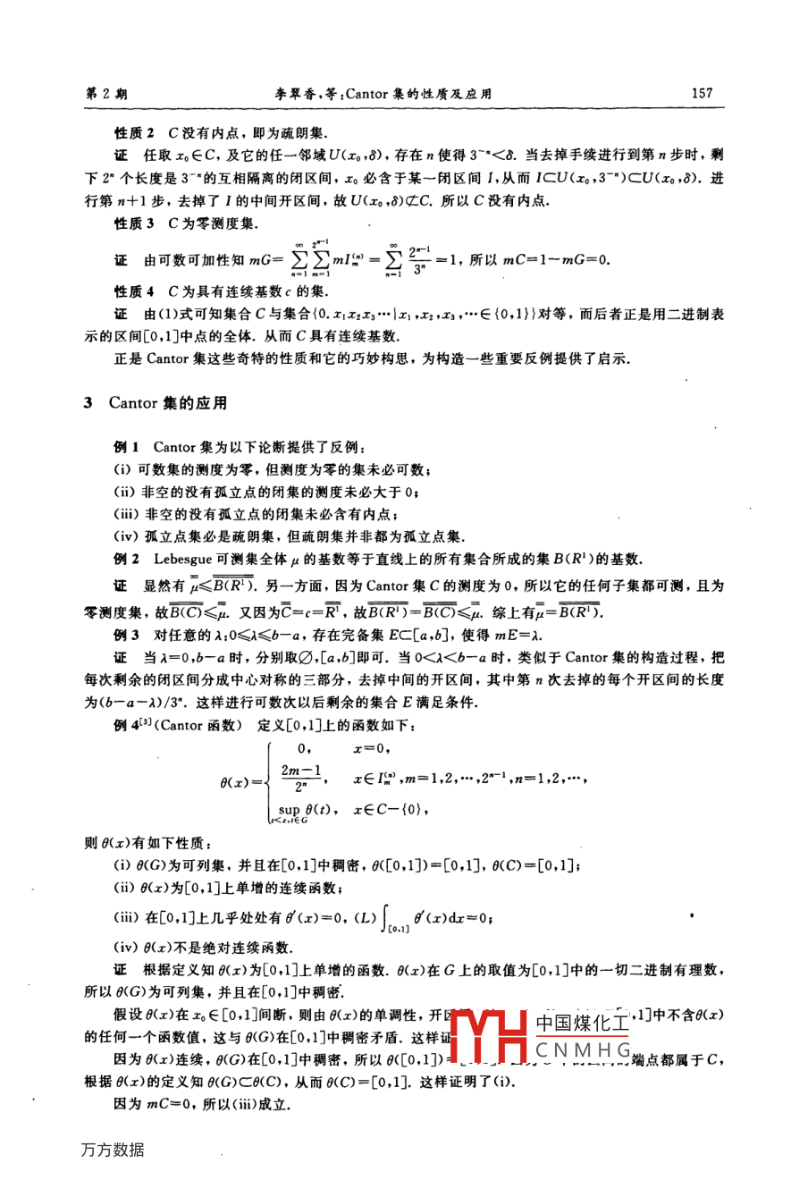 第27卷第2期大學(xué)數(shù)學(xué)vo.27,№,22011年4月COLLEGE MATHEMATICSApr.2011Cantor集的性質(zhì)及應(yīng)用李翠香,石凌,劉麗霞(河北師范大學(xué)數(shù)學(xué)與信息科學(xué)學(xué)院,河北石家莊050016)[摘妻] Cantor集是實(shí)函數(shù)論中一類重要的集合.本文從定義、性質(zhì)及應(yīng)用三方面研究了 Cantor集.目的是幫助初學(xué)者對 Cantor集有一個(gè)較全面的認(rèn)識[關(guān)鍵詞] Cantor集; Cantor函數(shù);反例[中圖分類號]O174.1[文獻(xiàn)標(biāo)識碼]C[文章編號]1672-1454(201)020156-03Cantor集是德國著名數(shù)學(xué)家 Cantor構(gòu)造的一類特殊的點(diǎn)集.,它的特殊的構(gòu)造過程使它有許多奇特的性質(zhì),這些性質(zhì)常常是數(shù)學(xué)工作者構(gòu)造反例的基礎(chǔ).它的巧妙構(gòu)思也為我們解決某些數(shù)學(xué)問題提供了方法和思路.對它進(jìn)行全面深人地研究,對學(xué)好實(shí)變函數(shù)論及相關(guān)課程有重要的促進(jìn)作用1 Cantor集的定義第1步,將區(qū)間[0,1]三等分去掉中間的開區(qū)間(,2);第2步,再將剩下的兩個(gè)閉區(qū)間.3][分別三等分,各去掉中間的開區(qū)間(3)和(3)一般地,在第n步時(shí),對第n1步剩下的2-個(gè)閉區(qū)間分別三等分,各去掉中間的開區(qū)間,如此繼續(xù)下去,就從[0,1]中去掉了可數(shù)個(gè)互不相交的開區(qū)間,剩下的集稱為康托爾集C.設(shè)G=[o,1-c,則G=0r,其中P為第n步去掉的第m個(gè)區(qū)間區(qū)間長為由作法可知,{I=}為一列互不相交的且沒有公共端點(diǎn)的開區(qū)間,G是開集令F表示第n步剩下的2”個(gè)閉區(qū)間的并集,則由定義可知C=∩Fn另外由p進(jìn)制的表數(shù)法可知C可用下列3進(jìn)制來表示2雜xx…,∈0,2)}={2232x1,x,…,…”∈01)}2 Cantor集的性質(zhì)性質(zhì)1C為沒有孤立點(diǎn)的閉集,即為完備集證因?yàn)镃=[0,1]-G,G是開集,所以C為閉集中國煤化工)沒有公共端點(diǎn),所以C沒有孤立點(diǎn)CNMHG[收稿日期]2009-1228[基金項(xiàng)目]國家自然科學(xué)基金項(xiàng)目(10771049);河北師范大學(xué)精品課建設(shè)項(xiàng)目(JPKc0807)第2期李翠香,等: Cantor集的性質(zhì)及應(yīng)用157性質(zhì)2C沒有內(nèi)點(diǎn),即為疏朗集證任取x0∈C,及它的任一鄰域U(x0,8),存在n使得3<8.當(dāng)去掉手續(xù)進(jìn)行到第n步時(shí),剩下2個(gè)長度是3的互相隔離的閉區(qū)間,x0必含于某一閉區(qū)間I,從而IcU(x,3-")cU(x0,8),進(jìn)行第n+1步,去掉了I的中間開區(qū)間,故U(x0,8)C.所以C沒有內(nèi)點(diǎn)性質(zhì)3C為零測度集證由可數(shù)可加性知mG=∑∑m=∑3=1,所以mC=1-mG=0性質(zhì)4C為具有連續(xù)基數(shù)c的集.證由(1)式可知集合C與集合{0.x1x2x3…x1,x2,x3,…∈{0,1》對等,而后者正是用二進(jìn)制表示的區(qū)間[0,1]中點(diǎn)的全體.從而C具有連續(xù)基數(shù)正是 Cantor集這些奇特的性質(zhì)和它的巧妙構(gòu)思,為構(gòu)造一些重要反例提供了啟示3 Cantor集的應(yīng)用例1 Cantor集為以下論斷提供了反例:(i)可數(shù)集的測度為零,但測度為零的集未必可數(shù);(i)非空的沒有孤立點(diǎn)的閉集的測度未必大于0;(i)非空的沒有孤立點(diǎn)的閉集未必含有內(nèi)點(diǎn);(iⅳv)孤立點(diǎn)集必是疏朗集,但疏朗集并非都為孤立點(diǎn)集例2 Lebesgue可測集全體μ的基數(shù)等于直線上的所有集合所成的集B(R)的基數(shù)證顯然有≤B(R).另一方面,因?yàn)?Cantor集C的測度為0,所以它的任何子集都可測,且為零測度集,故B(C)≤P.又因?yàn)镃=c=R,故B(R)=B(C≤綜上有=B(R)例3對任意的A:0≤A≤b-a,存在完備集EC[a,b],使得mE=A證當(dāng)λ=0,b-a時(shí),分別取,[a,b即可.當(dāng)0<λ