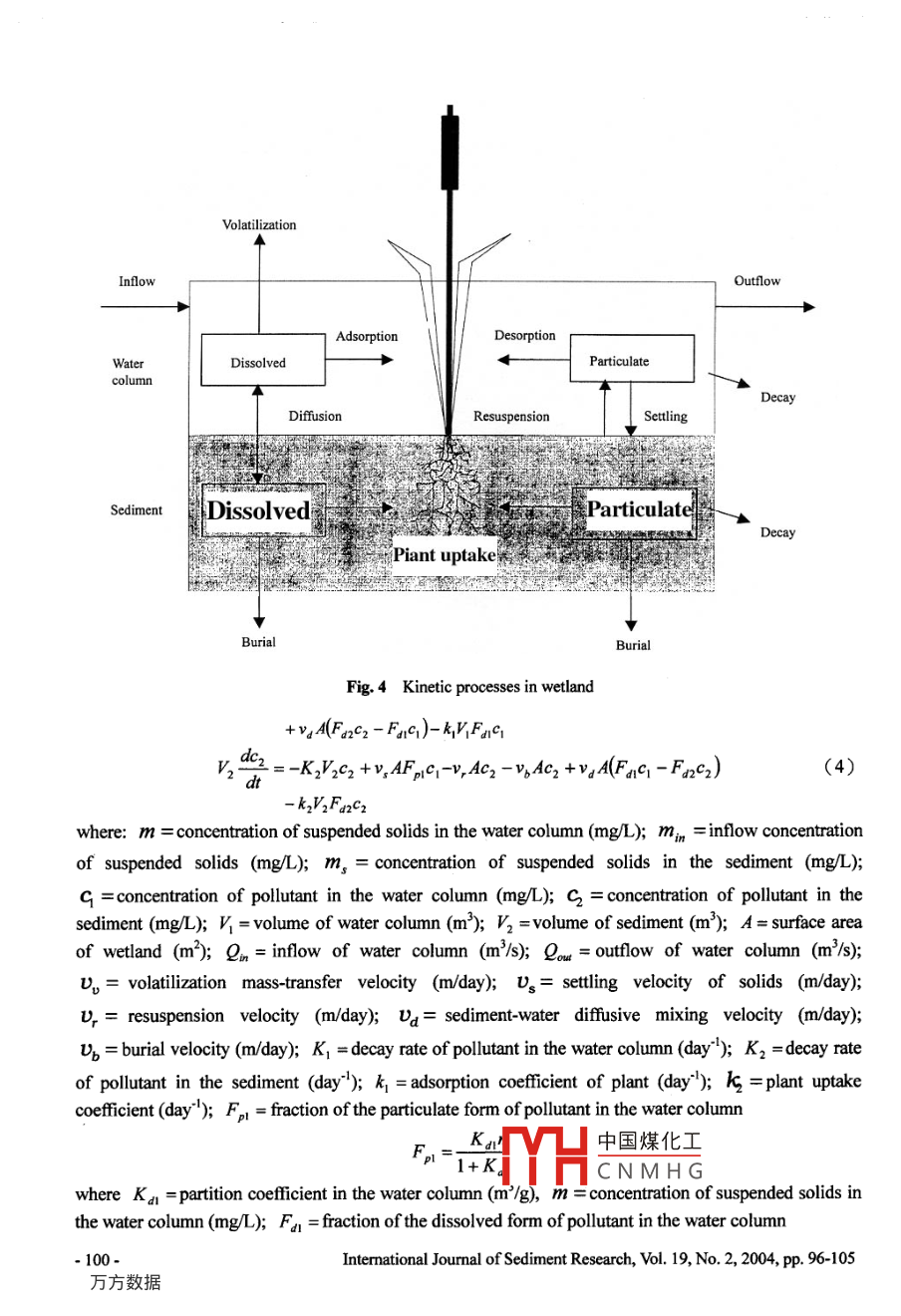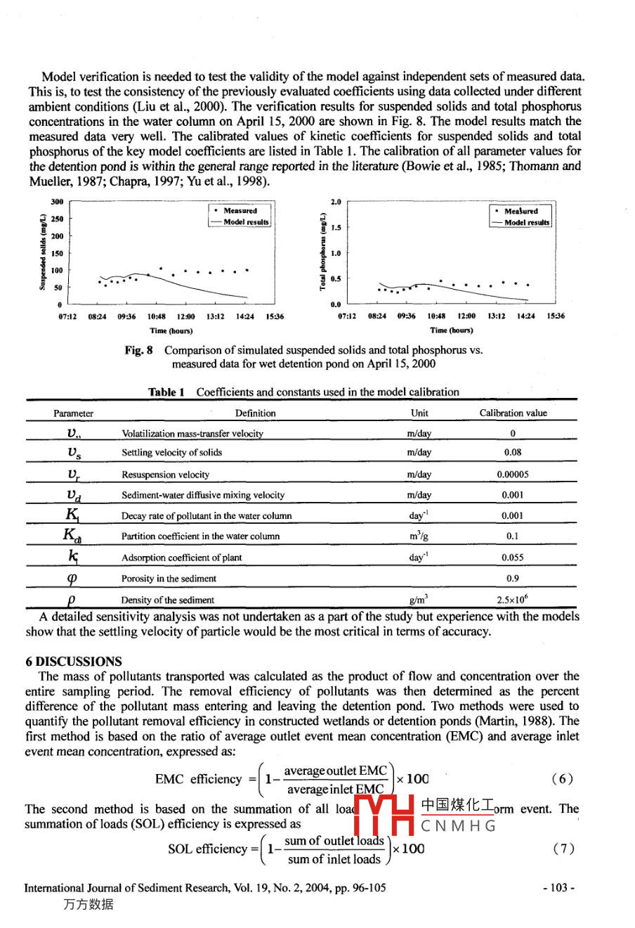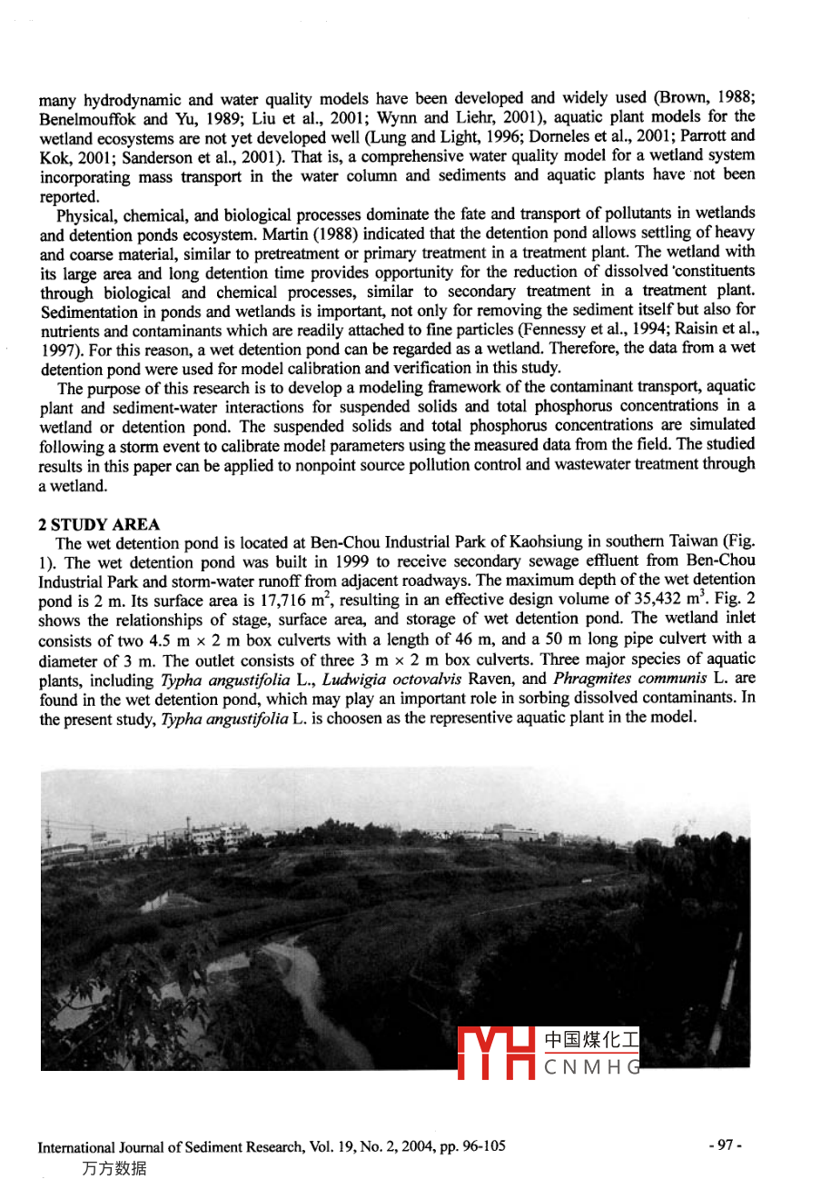 A SIMPLIFIED WATER QUALITY MODEL FOR WETLANDSJan- Tai KU0', Jihn-Sung LAP, Wu-Seng LUNG' and Chou-Ping YANG*ABSTRACTThe purpose of this study is to develop a simplified mathematical model to simulate suspendedsolids and total phosphorus concentrations in a wetland or detention pond. Field data collectedfrom a wet detention pond during storms were used to demonstrate the application of this model.Favorable agreements between the model results and data were achieved. The ratio of averageoutlet method and summary of loads method were used to quantify the removal efficiency ofpollutants, reflecting the efficiencies are very close. The results of this study can be used fornonpoint source pollution control, wastewater treatment or best management practices (BMPs)through the wetland.Key Words: Wetland, Detention pond, Water quality model, Nonpoint source pollution control,BMPs1 INTRODUCTIONModels are becoming increasingly important as a scientific basis for environmental management, yetmodelers hold a variety of opinions as to the proper approach to modeling natural systems. In particular,there is an ongoing debate about the relative merits of simple models which ft statistically to simulatechemical, physical, and biological processes (Reckhow and Chapra, 1999). Wetlands are among the mostimportant ecosystems on the earth because of their unique hydrologic conditions and their role asecotones between terrestrial and aquatic systems. Historically, wetlands were called swamps, marshes,bogs, fens, or sloughs, depending on the existing plant and water conditions and on the geographic setting.Wetlands are sometimes described as“the kidneys of the landscape” because it functions as thedownstream receivers of waste from both natural and human resources. The major functions of a wetlandgenerally include pollution control, flood storage and conveyance, erosion reduction and sediment control,groundwater recharge/discharge, wildlife habitats, recreation and enjoyment (Novotny and Olem, 1994;Kadlec and Knight, 1996; Mitsch and Gosselink, 2000).Wetlands constructed as the wastewater treatment system are considered more cost effective than theadvanced wastewater treatment systems in the world. Past research has shown that the wetland ordetention pond ecosystems are efficient to remove suspended solids, nutrients (phosphorus and nitrogen),chemical oxygen demand (COD), and heavy metals (Boyt et al, 1977; Martin, 1988; Holler, 1989; Wu etal., 1996; Odum, 2000; Jing et al., 2001; Yang et al, 2001; Walk and Hurl, 2002). Recently, constructedwetlands and detention ponds are being used increasingly for best management practices (BMPs) inaddressing nonpoint source pollution control problems (Raisin and Mithell, 1995; Kuo et al, 1997;Earles, 1999; Wen et al, 2000; Carleton et al., 2001).In recent years, hydrodynamic models have been developed for the calculation of flow characteristicsin wetlands or detention ponds. Hydrodynamic simulations provide the flow infrmation such as watersurface level and flow fieid as well as salinity distribution (Guardo and Tomasello, 1995; Feng and Molz,1997; Hsu et al, 1998; Somes et al, 1999; Moustafa and Hamrick, 2000; Liu et al., 2003). Althoughmany hydrodynamic and water quality models have been developed and widely used (Brown, 1988;Professor, Department of Civil Engineering and Hydrotech Research Istitute, National Taiwan University, No.1,Sect. 4, Roosevelt Road, Taipei 106, Taiwan, China, E-mail: khri@nhi du tw2Assistant Researcher, Hydrotech Research Institute, Nationa中國煤化工)6, Taiwan, China3 Professor, Department of Civil Engineering, University ofVMH. Cn M H C6, Taiwan, ChinaJia 22904 4742, U.S.A4Ph.D. Candidate, Department of Civil Engineering, NationalNote: The original manuscript of this paper was eceived in Nov. 2003. The revised version was received inMarch 2004. Discussion open until June 2005.-96-Intermational Jourmal of Sediment Research, Vol. 19, No.2, 2004, pp. 96-105many hydrodynamic and water quality models have been developed and widely used (Brown, 1988;Benelmouffok and Yu, 1989; Liu et al, 2001; Wynn and Liehr, 2001), aquatic plant models for thewetland ecosystems are not yet developed well (Lung and Light, 1996; Dormeles et al, 2001; Parrott andKok, 2001; Sanderson et al, 2001). That is, a comprehensive water quality model for a wetland systemincorporating mass transport in the water column and sediments and aquatic plants have not beenreported.'Physical, chemical, and biological processes dominate the fate and transport of pollutants in wetlandsand detention ponds ecosystem. Martin (1988) indicated that the detention pond allows settling of heavyand coarse material, similar to pretreatment or primary treatment in a treatment plant. The wetland withits large area and long detention time provides opportunity for the reduction of dissolved 'Constituentsthrough biological and chemical processes, similar to secondary treatment in a treatment plant.Sedimentation in ponds and wetlands is important, not only for removing the sediment itself but also fornutrients and contaminants which are readily attached to fine particles (Fennessy et al, 1994; Raisin et al,1997). For this reason, a wet detention pond can be regarded as a wetland. Therefore, the data from a wetdetention pond were used for model calibration and verification in this study.The purpose of this research is to develop a modeling framework of the contaminant transport, aquaticplant and sediment- water interactions for suspended solids and total phosphorus concentrations in awetland or detention pond. The suspended solids and total phosphorus concentrations are simulatedfollowing a storm event to calibrate model parameters using the measured data from the field. The studiedresults in this paper can be applied to nonpoint source pollution control and wastewater treatment througha wetland.2 STUDY AREAThe wet detention pond is located at Ben-Chou Industrial Park of Kaohsiung in southerm Taiwan (Fi
