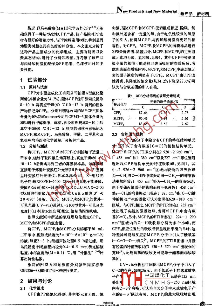 ew Products and New Material新產(chǎn)品新材料互性氨化臉的性能氣應(yīng)口李瑜,李紅波,朱一韋,顧一平2井新利(1西安交通大學(xué)能源與動力工程學(xué)院化學(xué)工程系,西安7100492浙江省德清縣明遠油脂有限公司浙江德清313202)摘要:氯化聚丙烯CP被廣泛用作聚丙烯(P)塑料上涂層的附著力促進劑。向PP中引入含氧的極性基團可以大幅度提高其與丙烯酸樹脂的棡客性,改善涂層對PP底材的附著力。通過魟外光譜、紫外可見光譜、Ⅹ一射線光電子能譜和X-射線衍射方法分析了一種新型的基于CP的附著力促進劑,并與市場上普遍使用的同奏產(chǎn)品進行了比較,考察了由此新型附著力促選劑制備的P底漆、色漆和金屬涂料的性能關(guān)鍵詞:氯化聚丙烯;馬來酸酐;丙烯酸樹脂;涂料中圖分類號:T0630文獻標識碼:A文章編號:1006-2556(2009)040052-05Performance and use of modified chlorinatedpolypropyleneLY, Li Hongbo’, Zhu yiwei, Gu Yingping2, Jing Xin‖Xi'an 710049, Shanxi Province; 2. Deqing Mingyuan Oil Co, Ltd, Deqing 313202, Zhejiang Province& University,(I. Department of Chemical Engineering, College of Energy Resource and Power Engineering, Xi'an JiaoAbstract: Chlorinated polypropylene( CPP) is widely used as adhesion promoter for polypropylene plastic coating. Introducingoxygen-containing polar group onto CPP can greatly increase the compatibility with acrylic resin and can improve the adhesion on PPtbstrate. a new adhesion promoter based on CPP is analyzed by the means of infrared spectrum, ultraviolet-visible spectrum, X-rayphotoelectron spectroscopy and X-ray diffraction; and is compared with the product of the same type in current market. And then PPprimer, colored paint and metal coatings containing the new adhesion promoter are investigated.Keywords: chlorinated polyethylene, maleic anhydride, acrylic resin,coatings0引言烯酸樹脂基涂料)附著力促進劑時,樹脂在長期存氯化聚丙烯(CPP)被廣泛用作聚丙烯(PP)塑料放過程中會發(fā)生分相,制備的色漆顏料分散也不均與樹脂基涂層之間的附著力促進劑,以提高涂料勻。制備鋁粉涂料時,鋁粉排列欠佳,難以獲得高質(zhì)與P之間的粘結(jié)性能優(yōu)化PP的涂裝工藝。PP量的涂層。目前市場上也有一些性能較為優(yōu)越的PP涂裝時,一般先涂覆一層CPP再涂覆涂料;或者將附著力促進劑,可以很好地滿足PP的涂裝要求,如cPP與涂料用樹脂(如丙烯酸樹脂)相混合,制成可直 East的系列產(chǎn)品該些產(chǎn)品不僅對PP的附接涂覆的PP用涂料。后一種方法不僅保證了涂料對著性中國煤化工性也很好,可制P底材較好的附著力,還可簡化涂裝工序廣泛用于成光CNMH(漆以及金屬涂PP塑料制品的涂裝。但是,CPP與丙烯酸等樹脂的料等。其最大的不足是產(chǎn)品價格偏高廣泛應(yīng)用受相容性很差,使用普通的CPP作為PP用涂料多為丙到一定限制1ew Products and New Material新產(chǎn)品新材料最近以馬來酸酐MAH)化學(xué)改性CPP引為基和氯而McPP和MCPP2元素組成相近除碳、氫礎(chǔ)獲得了一種新型改性CPP產(chǎn)品該產(chǎn)品除對PP底和氯外還含有一定量的氧,由于電負性較強的氧原材有很好的附著力外,與PP涂料常用樹脂特別是丙子的引入,使得MCPP1與丙烯酸樹脂有更好的相烯酸類樹脂也具有良好的相容性。本文重點分析了容性。對CPP、MCPP1及MCPP的薄膜樣品進行這種產(chǎn)品主要成分的化學(xué)組成、主要官能團以及XPS分析表明除氫以外,MCP1和MCPP2的主要組聚集態(tài)結(jié)構(gòu),進行了分析和表征,并考察了該產(chǎn)品成元素均為碳、氯和氧,見表1。其中CPP中檢測出與丙烯酸樹脂復(fù)配作為PP底漆、色漆使用時的主極少量的氧很可能是樣品表面吸附的雜質(zhì)所致,考要性能。慮到表面雜質(zhì)吸附外,MCPP和McPP2中表層氧元素的原子濃度仍明顯高于 CPPo MCPP由CPP改1試驗部分性得到,其降低的氯含量(從34.2%下降至276%)可1.1原料與試劑認為與含氧基團的引入有關(guān)。cPP為東莞金成化工有限公司油墨A型氯化聚丙烯(其氯含量為34.2%),固體CPP經(jīng)甲醇索氏提取r表1XPS分析得到的表層元素組成10h,再真空干燥(60℃)10-12h,得到的固體樣品代號元素的原子濃度/%產(chǎn)物標記為CPP。分別對明遠公司的 MYCPP固體9.57含量為40%0和 Eastman公司的CP3433固體含量為McPp1:86.437.94563350‰%)進行甲醇洗滌、沉淀,再經(jīng)索氏提取8-10b后McP83.858.527.62真空干燥(60℃)10-12h,得到的固體分別標記為McPP和MCPP2。馬來酸酐、甲醇、二甲苯和四22官能團與結(jié)構(gòu)氫呋喃均為西安化學(xué)試劑廠分析純產(chǎn)品MCPP的分子中除含有CPP的特征結(jié)構(gòu)單元1.2分析與測試外,還引入了含有羰基(C=0)的極性結(jié)構(gòu)單元將CPP、MCPP1和MCPP分別溶解于適量二MCP和cPP的FTR分別在2926-2960cm甲苯中,澆鑄于聚四氟乙烯薄膜上,真空干燥(60℃)1458cm-和1380cm以及727cm-等位置附10~12h后剝離得到三者的薄膜狀樣品。該薄膜可近出現(xiàn)CPP結(jié)構(gòu)單元的特征吸收峰,見圖1。其直接用于傅里葉變換紅外光譜 PRestige-21型傅中,2926-2960cm區(qū)域內(nèi)較鈍的強吸收峰里葉變換紅外光譜儀,日本島津公司)、X-射線光為一CH3與C—H的伸縮振動與一CH2的伸縮振電子能譜( XPSPH1-5400型X一射線光電子能譜儀,動疊加所致:1460cm處為CH2的彎曲振動,美國PE公司)和X一射線衍射(XRD,DMAX-2400由于受鄰近氯原子的影響而移至低波數(shù)1458cm型X射線衍射儀,日本理學(xué)公司,CuKa射線,3°≤處;CH3的彎曲振動出現(xiàn)在1381cm處,CCl鍵26≤90°)分析。