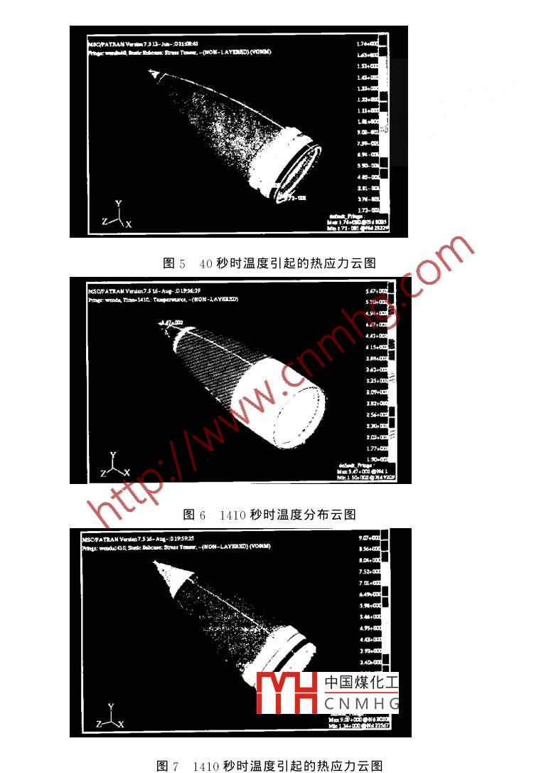強度與環(huán)境,2001(3)Structure &. Environment Engineering, 2001(3)導(dǎo)彈天線罩靜熱聯(lián)合試驗及其熱強度分析王端志高萬鏞(北京強度環(huán)境研究所,北京,100076)摘要:本文介紹了導(dǎo)彈天線罩地面模擬試驗的技術(shù)與方法,并采用有限元素法求解某型號天線罩結(jié)構(gòu)在熱流與機械載荷的作用下,結(jié)構(gòu)內(nèi)部隨時間變化的溫度場及應(yīng)力場。計算時主要是依據(jù)模擬試驗中所施加的邊界條件和載荷條件進(jìn)行的關(guān)鍵詞:天線罩;熱試驗;熱強度;有限元法中圖分類號:V416.4文獻(xiàn)標(biāo)識碼:A文章編號:1006-3919(2001)03-0001-091前隨著型號的不斷發(fā)展,導(dǎo)彈以高馬赫數(shù)在大氣層中飛行時,氣動加熱問題日趨嚴(yán)重,結(jié)構(gòu)熱問題越來越受到人們的重視,熱環(huán)境”已作為結(jié)構(gòu)設(shè)計的外載荷條件列入了設(shè)計規(guī)范結(jié)構(gòu)熱試驗作為研究結(jié)構(gòu)熱問題的有效方法,目前已成為彈(箭)結(jié)構(gòu)設(shè)計、強度及可靠性分析、產(chǎn)品性能檢驗和鑒定的重要手段之一。但是由于飛行器的飛行環(huán)境十分復(fù)雜,單純地靠地面試驗是不可能全真模擬這種環(huán)境條件,只能在簡化的基礎(chǔ)上近似模擬,加上試驗本身的誤差,不可避免地要借助多種手段。為配合熱結(jié)構(gòu)試驗的研究,印證試驗的合理性以及彌補試驗的不足,從而促進(jìn)結(jié)構(gòu)熱試驗技術(shù)向更高的水平發(fā)展,對試驗件進(jìn)行理論分析與計算工作是至關(guān)重要的同時,對試驗中的問題進(jìn)行準(zhǔn)確地分析和計算也是開發(fā)計算機仿真技術(shù)的必要前提,仿真技術(shù)與結(jié)構(gòu)熱試驗技術(shù)的密切結(jié)合,必將成為解決結(jié)構(gòu)熱問題很有前途的發(fā)展方向天線罩結(jié)構(gòu)是導(dǎo)彈型號設(shè)計、研制階段的重要部件,由于飛行時天線罩受氣動加熱較為嚴(yán)重,機動飛行時要承受復(fù)雜的氣動載荷以及為了透過電磁波采用非金屬材料而承載能力較差等原因,其強度、剛度是否合格直接影響到型號的設(shè)計定型。目前研制單位一般要進(jìn)行熱強度試驗來考核其是否合格。2靜熱聯(lián)合試驗中國煤化工結(jié)構(gòu)熱試驗是以設(shè)計部根據(jù)彈道和氣yHCNMHG件為依據(jù),進(jìn)行試驗設(shè)收稿日期:2000-12-04作者簡介:王端志,男,1972年6月生,漢族,江蘇連云港人,碩土,工程師(100076)北京強度環(huán)境研究所;高萬鏞,男,1942年3月生,漢族,北京人,研究員(100076)北京強度環(huán)境研究所計。天線罩的靜熱聯(lián)合試驗包括高溫?zé)釠_擊試驗、靜力載荷試驗、靜熱聯(lián)合試驗。試驗安裝示意圖如圖1所示。根據(jù)設(shè)計部給定的數(shù)據(jù)和要求,采用溫度控制進(jìn)行加熱。由于天線罩結(jié)構(gòu)各個部位的氣動加熱狀態(tài)不同,各部位表面所吸收的熱流密度呈非均勻分布狀態(tài),要在大面積上實現(xiàn)一個非均勻分布的熱場,最有效的方法是把整個加熱器進(jìn)行離散化控制,即將整個加熱器劃分為多個溫區(qū)。理論上講,溫區(qū)劃分得愈多,加熱模擬的效果愈真實,在可能的條件下應(yīng)當(dāng)遵循“區(qū)小域多”的原則,但與此同時增加了設(shè)計和試驗的復(fù)雜程度,在當(dāng)前條件下難于實現(xiàn)。因此在天線罩靜熱聯(lián)合試驗中主要根據(jù)試驗大綱的要求優(yōu)化設(shè)計合理布局,將加熱器劃分六個控溫區(qū),并且兩兩對應(yīng)一致??販攸c分別位于天線罩上、中、下三段的典型點上,三點控溫數(shù)據(jù)如表所示。由于外表面需要進(jìn)行加熱,所以機械載荷的施加采用內(nèi)加載,加載頭用橡膠纏繞起緩沖作用,以施加面力的方式防止集中力對試件產(chǎn)生破壞天線罩結(jié)構(gòu)近似于錐體(具體結(jié)構(gòu)見圖1),主體是陶瓷段,底部通過膠層與殷鋼環(huán)連接。用豎直的安裝方式將天線罩固定在鑄塊上。采用碘鎢石英燈輻射加熱器進(jìn)行加熱,加熱器由兩個錐狀半圓柱合并而成,共分上、中、下三排燈,分別對應(yīng)六個溫區(qū)。通常控制方式主要有熱流控制、溫度控制二種方式,其中以熱流控和溫度控較為常見。熱流控一般由設(shè)計部提供熱壁熱流數(shù)據(jù),試驗前要作損失項與位置系數(shù)旳修正,中間環(huán)節(jié)較多,相對麻煩,但比較成熟。在此試驗中,由于只給定邊界溫度曲線,所以采用溫度控制方式,并保證加熱與機械載荷在時域、空間域上合理疊加2。3相關(guān)理論與方程求解般的非線性瞬態(tài)熱傳導(dǎo)方程是div (kgradT)+q= pCp在直角坐標(biāo)系中表示為”a d(k)+,(k中國煤化工亞(2)CNMHG邊界條件在S1邊界上t>0在S2邊界上t>0g=gr+其中萬為數(shù)瓣射換熱熱流,為對流換熱熱流,q為給定熱流。一般來說、9的表達(dá)式分別為ge =h(T-T式中T。為周圍環(huán)境溫度,h為對流換熱系數(shù)初始條件為T(x,y,z,0)=Tn,t=0,(x,y,)∈9利用有限元素法對導(dǎo)熱微分方程的邊值問題進(jìn)行求解般有兩種解法,一種對其直接求解,選取試探函數(shù)利用加權(quán)余數(shù)法。另一種是利用微分方程的邊值問題與泛函求極值問題的等價性原理,即變分有限元法3與方程(2)及邊界條件(3)、(4)對應(yīng)的泛函可寫成JqT'ds +0.5h(T"2-T.T)ds將求解域離散成ne個單元,每個單元有r個節(jié)點,任意一