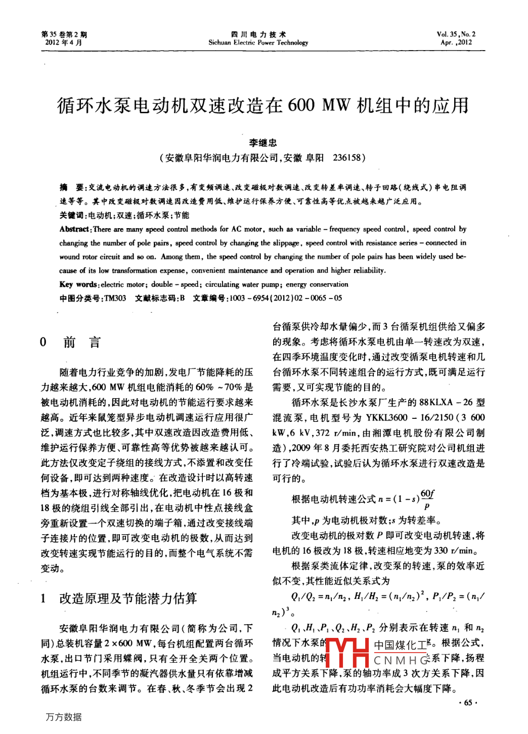 循環(huán)水泵電動機雙速改造在600MW機組中的應(yīng)用