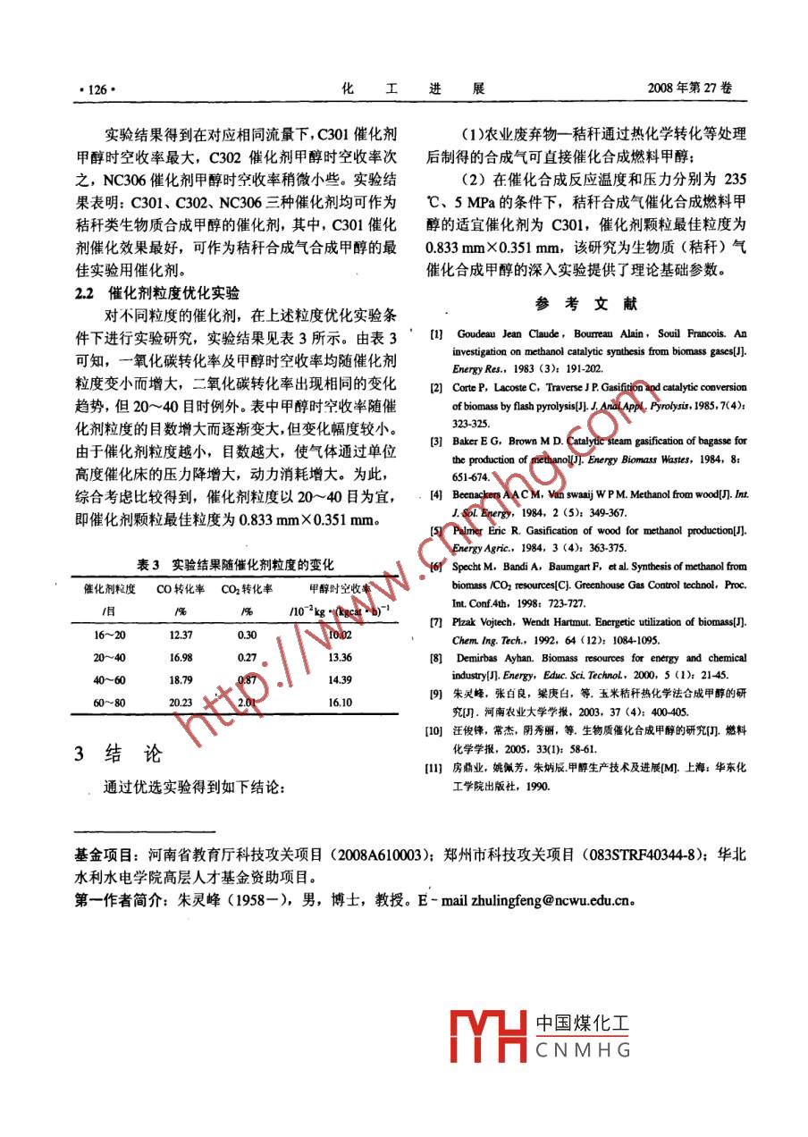 化工進(jìn)CHEMICAL INDUSTRY AND ENGINEERING PROGRESS2008年第27卷增刊秸稈合成氣催化合成甲醇催化劑優(yōu)化實驗朱靈峰,吳波,明海濤,王哲,張玉萍(華北水利水電學(xué)院環(huán)境與市政工程學(xué)院,河南鄭州450011)擴(kuò)要:生物質(zhì)能是一種可再生能源,為了研究秸稈類生物質(zhì)(農(nóng)業(yè)廢棄物)轉(zhuǎn)化為燃料甲醇和有效的利用,采用熱化學(xué)方法在下吸式固定床氣化爐中生產(chǎn)了低熱值秸稈燃?xì)?對該燃?xì)膺M(jìn)行脫硫、脫氧、焦油催化分解、純亻配等優(yōu)化實驗,制備出秸稈合成氣。在直流流動等溫積分反應(yīng)器中進(jìn)行了催化合成甲醉的催化實驗,在235℃和5MPa條件下進(jìn)行了催化劑種類及粒度對甲醇合成的影響實驗,實驗結(jié)果表明:合成甲醇的適宜催化劑型號為C301,最優(yōu)化顆粒粒度為0.833mmx0.351mm,該研究為生物質(zhì)(秸稈)氣催化合成甲醇的深入研究提供了基礎(chǔ)數(shù)據(jù)關(guān)鍵詞:催化劑;秸稈;合成氣;粒度;甲醇合成生物質(zhì)作為可再生能源,不僅具有資源豐富、江蘇海安石油科研儀器廠;zK-50可控硅電壓調(diào)整無污染、可再生等特點,而且是可再生能源中唯一器,云南儀表廠;TCS-A智能溫度測控儀(控溫精可以轉(zhuǎn)化為液態(tài)燃料和化學(xué)品的碳資源。生物質(zhì)催度為士01℃),南京攀達(dá)電子儀器廠;GC90C型化合成甲醇等化學(xué)品和液態(tài)燃料技術(shù)是生物質(zhì)能高氣相色譜儀,中科院天樂精密科學(xué)儀器有限公司(上品位開發(fā)利用技術(shù)之一,發(fā)達(dá)國家合成甲醇的生物海);G2vs200隔膜壓縮機(jī),北京第一通用機(jī)械廠質(zhì)主要是木材碎片、甘蔗渣等,采用氧氣和水蒸氣12實驗材料為氣化劑,氣化工藝技術(shù)復(fù)雜,設(shè)備昂貴,制備出1.21秸稈原料氣高熱值合成氣后再催化合成甲醇。中國是一個農(nóng)選用鄭州東郊當(dāng)年新收獲的玉米秸稈為原材業(yè)大國,生物質(zhì)資源極為豐富,僅秸稈一項年產(chǎn)量料,經(jīng)曬干并粉碎至2~3cm,在JMQ系列秸稈氣即達(dá)六億多噸。但這些秸稈僅有一少部分被利用,化機(jī)組上,以空氣為氣化劑,制備出秸稈原料氣。大部分被廢棄或隨意焚燒,嚴(yán)重污染環(huán)境,造成巨1.2.,2秸稈合成氣大的資源浪費。目前,全國已建成數(shù)百處秸稈氣化將秸稈原料氣經(jīng)脫硫、除氧、分解焦油、凈化、站,生物質(zhì)氣化主要設(shè)備為上吸式及下吸式固定床配氫等處理后,制備出秸稈合成氣(見表1)。氣化爐,用空氣做氣化劑,生產(chǎn)工藝技術(shù)及設(shè)備簡單價廉,生物質(zhì)燃?xì)鉃楹倭拷褂偷牡蜔嶂等細(xì)?、表1生物質(zhì)合成氣組成(質(zhì)量分?jǐn)?shù))單位:該氣體中氮氣及二氧化碳含量較高氫氣含量較低,必須經(jīng)過變換處理制得合成氣后才能進(jìn)行甲醇合4661-304112-116598-984076-1163273-4538成,低熱值秸稈燃?xì)庵饕糜谥苯尤紵鲲?少量①CHCH,C2H2,CH,CHb用于取暖和發(fā)電,生物質(zhì)能利用率較低。需求較大的C1能源甲醇的生產(chǎn)原料主要是天然氣、石油、煤13實驗流程與實驗條件等不可再生資源,利用生物質(zhì)合成甲醇技術(shù)的研究實驗流程見圖1所示。生物質(zhì)合成氣自鋼瓶經(jīng)尚處于實驗室階段10。為使數(shù)量巨大的生物質(zhì)資穩(wěn)壓閥將壓力控制到主反應(yīng)壓力后進(jìn)入反應(yīng)器,反源得到充分、高效的利用,加快實現(xiàn)生物質(zhì)合成甲應(yīng)后氣體經(jīng)冷凝器分離出甲醇和水,不凝氣體經(jīng)減醇的工業(yè)化步伐,作者等進(jìn)行了秸稈合成氣合成甲壓閥降至常壓。由流量計計量后,一部分氣體放空,醇的催化劑實驗研究另一部分去氣相色譜儀,由色譜工作站及電腦自動1實驗部分采用中國煤化工組分,在催化劑作11實驗主要儀器設(shè)備CNMHGH2合成甲醇及CO2JMQ系列秸稈氣化機(jī)組,河南省宏越秸稈氣化加H2的逆變換3個主要反應(yīng)。前兩個反應(yīng)分子數(shù)目技術(shù)有限公司;JA-五槽直流流動等溫積分反應(yīng)器,變小且放熱,最后一個反應(yīng)吸熱且反應(yīng)前后分子數(shù)增刊朱靈峰等:秸稈合成氣催化合成甲醇催化劑優(yōu)化實驗125·H24661%;催化劑粒度優(yōu)化實驗條件為:催化劑型號為C301,催化劑質(zhì)量為49246g,催化劑粒度(目)為16~20、20~40、40~60、60~80,進(jìn)口合成氣組成為CO1316%、CO29.84%、N245.38%、CnH1.16%、H2304%。催化劑的活化和實驗方法見文獻(xiàn)(9]。2結(jié)果與討論圖1試驗裝置系統(tǒng)2.1催化劑的優(yōu)化實驗生物質(zhì)原料氣:②甲醇反應(yīng)釜:③穩(wěn)壓閥:④產(chǎn)物收集器:⑤冷凝器對每種催化劑采用改變進(jìn)口氣流量進(jìn)行實流量計:②壓縮機(jī):@溫度控制:@總開關(guān):⑨溫度顯示:①氣相色驗,實驗結(jié)果見表2所示。由表2可知,對C301譜儀;②載氣:①數(shù)據(jù)處理器:④計算機(jī)C302催化劑來說,一氧化碳轉(zhuǎn)化率隨合成氣進(jìn)口流量的逐漸增大而逐漸變小,但NC306催化劑例目相同。由化學(xué)反應(yīng)理論可知叫,增加壓力、降外,一氧化碳轉(zhuǎn)化率隨著合成氣進(jìn)口流量的逐漸低溫度對前兩個合成反應(yīng)有利,但考慮到設(shè)備投資增大,先升高后逐漸降低:二氧化碳轉(zhuǎn)化率隨著和催化劑活性,反應(yīng)壓力控制為5MPa,反應(yīng)操作進(jìn)口合成氣流量的不斷增大,C301催化劑的變化溫度23