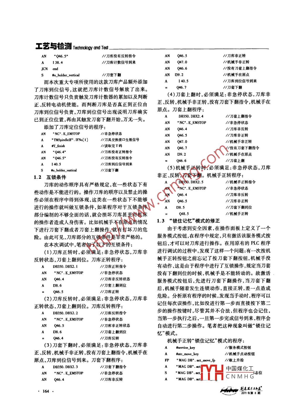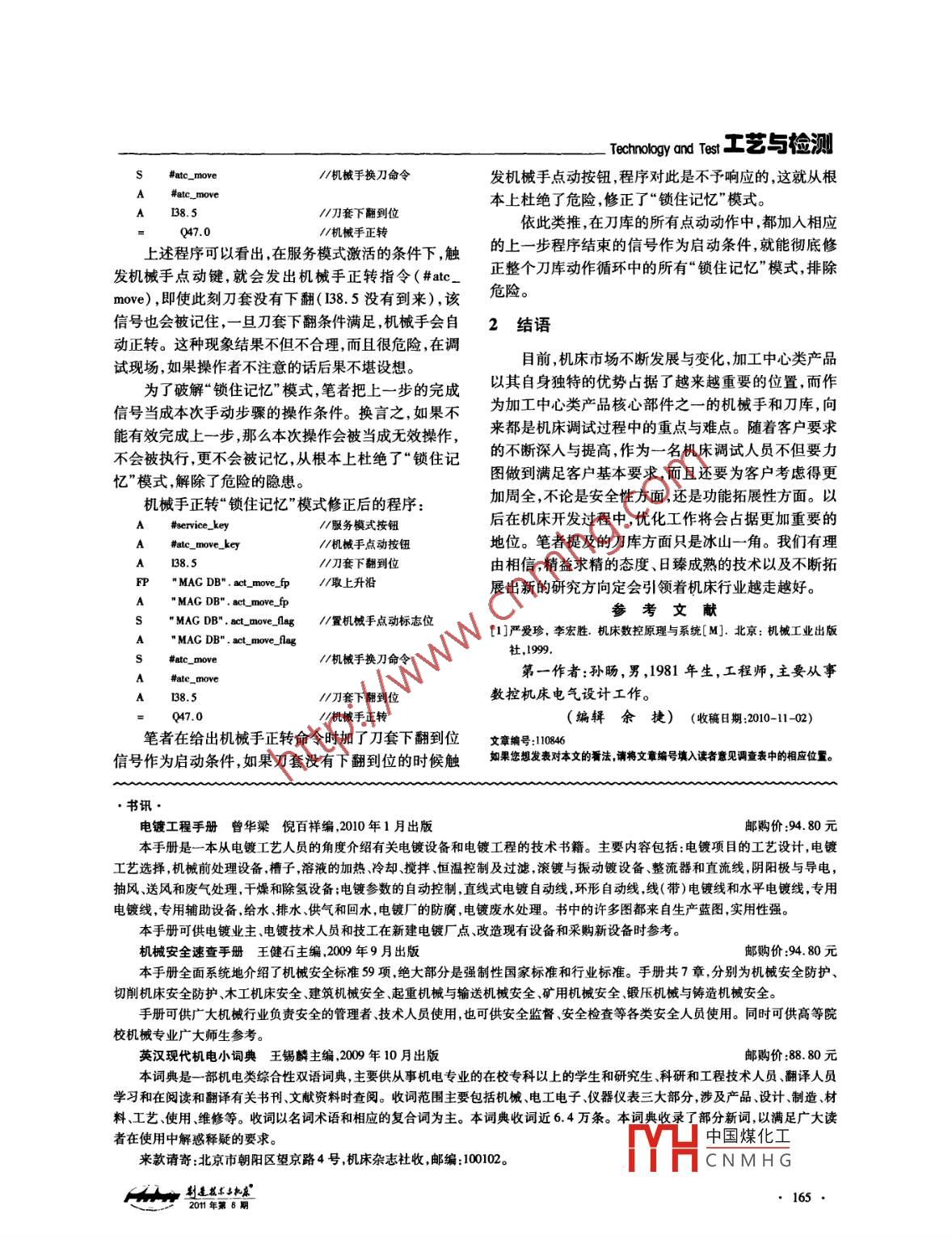 . Tennologv and Test工藝與檢測刀庫的調(diào)試及優(yōu)化孫旸化春雷李焱(沈陽機(jī)床(集團(tuán))有限責(zé)任公司,遼寧沈陽110142)摘要:針對重大專項(xiàng)機(jī)床產(chǎn) 品刀庫部分的調(diào)試,概括總結(jié)了在刀庫調(diào)試過程中可能出現(xiàn)的問題,分析了所述問題的成因,在此基礎(chǔ)上給出了各種問題的解決方法并對程序進(jìn)行優(yōu)化。關(guān)鍵詞:定位信號互鎖“鎖住記憶” 模式中圖分類號:TH39文獻(xiàn)標(biāo)識碼:BThe debugging and optimization of tool storageSUN Yang, HUA Chunlei, LI Yan(Shenyang Machine Tool( group) Co. , Ld. , Shenyang 110142, CHN)Abstract: In allusion to the debugging of tool storage in specific projects , this paper generalizes several probableproblems during the debugging process , analyses the reasons, and then brings forward the solutions ofthe mentioned problems , makes optimization finally.Keywords: Orientation Signals ;Interlock ;Locking Memory Mode刀庫系統(tǒng)是提供自動(dòng)化加工過程中所需的儲刀及累加。與此同時(shí),它實(shí)際上還有其他兩個(gè)額外的附加換刀需求的一種裝置,其自動(dòng)換刀機(jī)構(gòu)及可以儲放多功能:一是作為刀庫剎車信號,在刀庫真正到位之前來把刀具的特色改變了傳統(tǒng)以人為主的生產(chǎn)方式。其由臨,PLC讀取到該信號后,斷刀庫電動(dòng)機(jī)正、反轉(zhuǎn)使能,電腦程式的控制,可以完成各種不同的加工需求,如銑從而使得刀庫停下;二是作為刀庫到位檢測信號,來激削、鉆孔、鏜孔、攻牙等。根據(jù)刀庫的容量外形和取刀活刀套下翻電磁閥的啟動(dòng)。這是因?yàn)槿缜八?,它在方式可概分為斗笠式刀庫、圓盤式刀庫和鏈條式刀庫。刀庫真正到位之前到來,然后刀庫電動(dòng)機(jī)停止轉(zhuǎn)動(dòng),一本次重大專項(xiàng)所采用的是圓盤式刀庫。般認(rèn)為這個(gè)緩沖時(shí)間剛好能確保刀庫停在正位位置。但有時(shí)這也會出現(xiàn)偏差,造成的結(jié)果就是刀庫還沒轉(zhuǎn)1調(diào)試中容 易出現(xiàn)的問題及解決方法到正位刀套就開始下翻,易造成刀套受損。1.1刀庫定位信號的應(yīng)用利用刀庫計(jì)數(shù)信號充當(dāng)?shù)稁斓轿恍盘柕某绦?在以往所接觸到的刀庫中,在檢測刀庫是否轉(zhuǎn)到AN " NC". E. EMSTOP//非急停狀態(tài)位的方面,大多只有一個(gè)刀庫計(jì)數(shù)信號。所謂刀庫計(jì)"TMSpindlelF" . IFNo[1]1/刀具交換接口生效信號#T_ finish//讀取完T碼數(shù),顧名思義,就是刀庫每轉(zhuǎn)到下一工位的時(shí)候,由其AN " Q46.4"http://刀庫沒有正轉(zhuǎn)指令提供-一個(gè)信號,告訴PLC應(yīng)該把所記載的工位數(shù)隨之程序可移植性更高。結(jié)合實(shí)驗(yàn)室現(xiàn)有圓柱度儀通過大2004(11):54-56.量測量實(shí)例證明了該方法的正確性。這種方法還可以[4]Matlab COM Builder user' s guide [Z] . TheMathworks Ine ,2002.推廣到圓柱度、直線度、平面度等形狀誤差的評定計(jì)算[5]方沁林,徐振高.圓度誤差評定的算法研究與軟件設(shè)計(jì)[D].幗優(yōu)秀碩七學(xué)位論文全文數(shù)據(jù)庫,009(3).過程中。.[6]周劍平.基于MATLAB的圓度評定方法[J].計(jì)量與測試技術(shù),2005參考文獻(xiàn)(32).[1]岳玉芳,尤忠生,張玉雙.基于COM的VB與Matlab混合編程[J].第一作者:曾浩然,男,1985年生,碩士研究生,主計(jì)算機(jī)工程與設(shè)計(jì),2005(1) .61-65.要從事精度設(shè)計(jì)、GPS應(yīng)用技術(shù)等領(lǐng)域的研究。[2]王夢蛟,王麗莉基于COM組件的VB與Malab混合編程在醫(yī)學(xué)影中國煤化工像處理中的應(yīng)用[J].醫(yī)院數(shù)字化2009(24) :32-33.文章編號:110845[3]管亮,馮新滬. VB6. 0調(diào)用Matlab6. 5編程的實(shí)現(xiàn)[J].控制工程,如果您想發(fā)表對本文的看法,請IYHCNMHG相應(yīng)位置。2011年第8期, 163.工藝與檢測Tetnovy andTest .AN "Q46.5"http://刀庫沒有反轉(zhuǎn)指令I(lǐng)N Q46.5//刀]庫非正轉(zhuǎn)38.4//刀庫計(jì)數(shù)信號到來IN Q47.0//機(jī)械手非正轉(zhuǎn)JCN endN Q46.6//沒有]套上翻指令s物. holder- verical1/刀套下翻//機(jī)械手在原點(diǎn)而本次重大專項(xiàng)所使用的這款刀庫產(chǎn)品額外添加140.5//刀庫到位信號到來了刀庫到位信號,這就把刀庫計(jì)數(shù)信號解放了出來。Q46.7刀庫計(jì)數(shù)信號負(fù)責(zé)觸發(fā)刀庫計(jì)數(shù)器的累加以及判斷(4)刀套上翻時(shí),必須滿足:非急停狀態(tài),刀庫非正、反轉(zhuǎn)電動(dòng)機(jī)使能。而判斷刀庫是否真正到正位由正、反轉(zhuǎn),機(jī)械手非正轉(zhuǎn),沒有刀套下翻指令,機(jī)械手在刀庫到位信號負(fù)責(zé),刀庫到位信號出現(xiàn)說明刀庫確實(shí)原點(diǎn)。刀套上翻程序:DB350. DBX2.41/刀套上翻指令已到正位位置,再由其觸發(fā)刀套下翻開始,萬無- -失。.ANNC". E_ EMSTOP//非急停狀態(tài)添加了刀庫定位信號的程序:AN 0Q46.4//刀庫非反轉(zhuǎn)//刀J庫非E轉(zhuǎn)"TMSpindleIF" . IFNo[1]//刀具交換接口生效信號#T_ finish//讀取完T碼AN Q46.7//沒有刀套下翻指令A(yù)N "Q46.4"http://刀庫沒有正轉(zhuǎn)指令A(yù)N 139.2//刀]庫沒有反轉(zhuǎn)指令Q46.6//刀套上翻//刀庫到位信母到來(5)機(jī)械手正轉(zhuǎn)時(shí),必須滿足:非急停狀態(tài),刀庫#o_ holder. vertical//刀]套下翻1.2 互鎖條件非正、反轉(zhuǎn),刀套下翻。機(jī)械手正轉(zhuǎn)程序:DB350. DBX2.5//機(jī)械手正轉(zhuǎn)指令刀庫的動(dòng)作順序具有