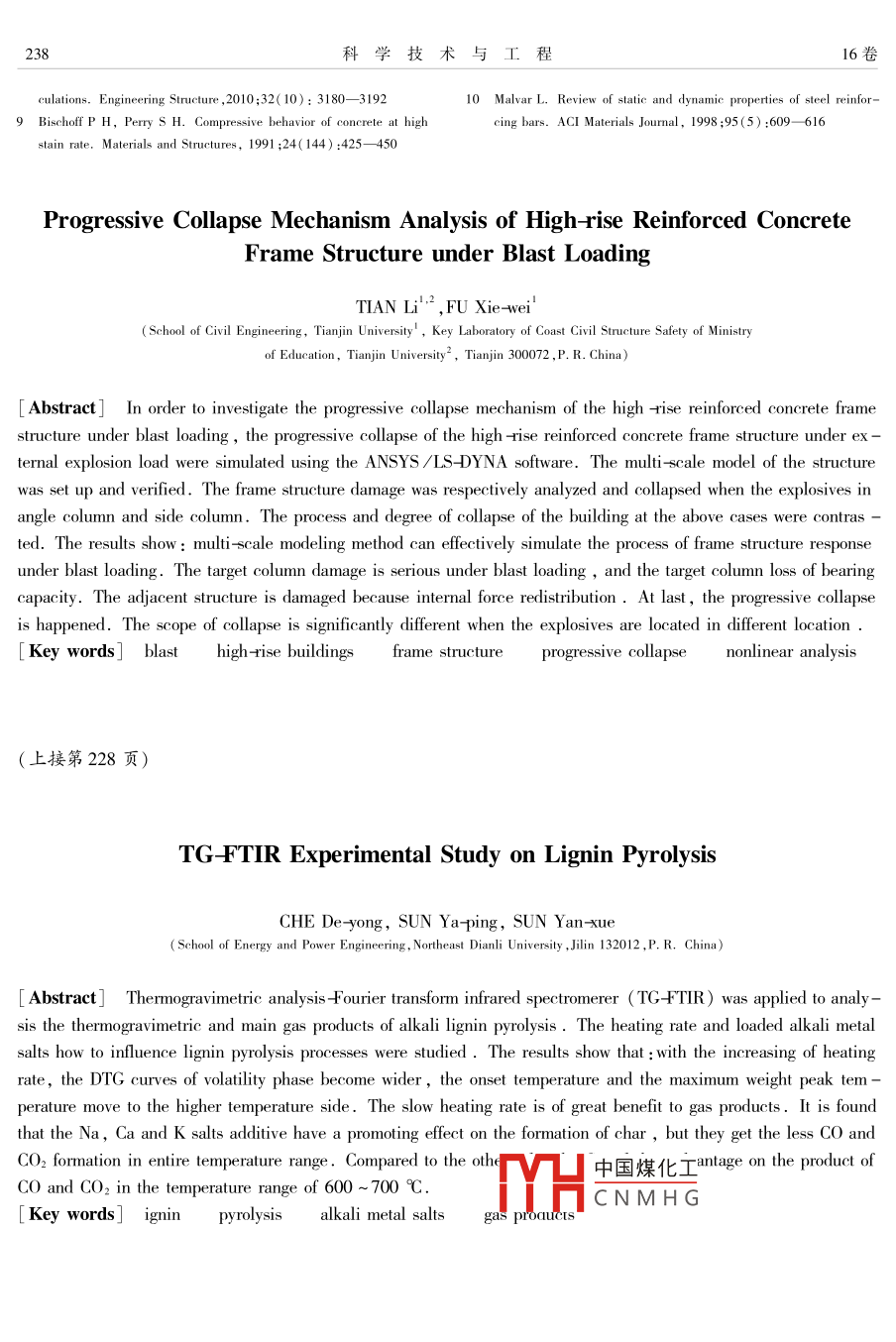 第16卷第3期2016年1月科學(xué)技術(shù)與工程Vol 16 No. 3 Jan. 20161671-1815(2016)03-0225-0Science Technology and EngineeC 2016 Sci. Tech engrg化學(xué)工業(yè)木質(zhì)素?zé)峤獾臒嶂丶t外分析儀實(shí)驗(yàn)研究車德勇孫亞萍孫艷雪(東北電力大學(xué)能源與動(dòng)力工程學(xué)院,吉林132012)摘要利用熱重紅外分析儀( TG-FTIR)對(duì)木質(zhì)素進(jìn)行熱重分析及主要?dú)庀喈a(chǎn)物分析;并探討了升溫速率和堿金屬鹽對(duì)木質(zhì)素?zé)峤膺^(guò)程的影響規(guī)律。結(jié)果表眀:隨著升溫速率的增加,揮發(fā)分析岀階段DTG曲線的峰型變寬,熱解起始溫度、最大失重峰溫均向高溫側(cè)移動(dòng);且較髙的升溫速率不利于氣相產(chǎn)物的析岀。添加碳酸鈉、碳酸鈣和碳酸鉀對(duì)木質(zhì)素?zé)峤庵鞣磻?yīng)區(qū)反應(yīng)速率的影響較小,相比堿金屬鹽的加λ量而言,最終熱解固體產(chǎn)物略有増加;同時(shí)堿金屬鹽的添加對(duì)氣相產(chǎn)物的析岀有明顯抑制作用。與其他兩種堿金屬鹽相比,碳酸鈣的加入對(duì)600~700℃溫度區(qū)間內(nèi)木質(zhì)素?zé)峤猱a(chǎn)生的CO和CO2產(chǎn)量有一定的促進(jìn)作用關(guān)鍵詞木質(zhì)熱解堿金屬鹽氣相產(chǎn)物中圖法分類號(hào)TQ351.635文獻(xiàn)標(biāo)志碼B化石燃料的迅速消耗導(dǎo)致全球能源危機(jī),而生素?zé)峤獾姆侄翁卣?。潭洪?對(duì)木質(zhì)素?zé)峤膺^(guò)程物質(zhì)作為潔凈能源和高附加值化學(xué)品的原料受到廣中的焦油產(chǎn)物進(jìn)行考察,得到焦油產(chǎn)物的生成機(jī)理。泛關(guān)注。生物質(zhì)具有儲(chǔ)量豐富、對(duì)環(huán)境污染小目前,關(guān)于木質(zhì)素?zé)峤膺^(guò)程中氣體產(chǎn)物的釋低溫室效應(yīng)等優(yōu)點(diǎn)。然而,要實(shí)現(xiàn)生物質(zhì)能源的充放機(jī)理的硏究還較少,本實(shí)驗(yàn)采用TG-TIR聯(lián)用分利用,熱裂解是重要的技術(shù)手段之一。作為生物技術(shù),對(duì)木質(zhì)素的熱解過(guò)程及主要?dú)庀喈a(chǎn)物進(jìn)行質(zhì)三組分之一的木質(zhì)素雖然含量不高,但熱解過(guò)程分析,并深入探討了升溫速率、堿金屬鹽等因素對(duì)相對(duì)復(fù)雜,且可能與生物質(zhì)其余組分有相互作用,所木質(zhì)素?zé)峤馐е靥匦约爸饕獨(dú)庀喈a(chǎn)物的釋放規(guī)律以對(duì)木質(zhì)素?zé)峤膺^(guò)程及其產(chǎn)物析出的研究具有重要的影響。意義。而熱重傅里葉紅外光譜聯(lián)用技術(shù)(TGTIR)不僅可獲得物質(zhì)熱分解的失重與溫度關(guān)系,還1實(shí)驗(yàn)可實(shí)時(shí)檢測(cè)物質(zhì)熱分解氣相產(chǎn)物的組成,因而越來(lái)1實(shí)驗(yàn)樣品越受到研究者的重視,廣泛應(yīng)用于化工、能源、材料實(shí)驗(yàn)用原料為 Sigma Aldrich公司提供的高純等領(lǐng)域°8度脫堿木質(zhì)素。將原料破碎篩分0.1mm以下,以針對(duì)木質(zhì)素的熱解,已有大量文獻(xiàn)進(jìn)行了硏究,消除熱解試驗(yàn)中粒徑對(duì)熱擴(kuò)散的影響。在60℃帶姚燕等”利用熱重紅外聯(lián)用儀對(duì)木質(zhì)素?zé)峤馐е赝L(fēng)的烘箱中烘干16h,用密封袋封好,于5℃冰箱過(guò)程及析出氣體進(jìn)行研究,分析得到木質(zhì)素?zé)峤膺^(guò)中保存待用。樣品的元素分析、工業(yè)分析見(jiàn)表1程的活化能等。程輝等研究了木質(zhì)素?zé)峤膺^(guò)程為考察堿金屬對(duì)木質(zhì)素?zé)峤馓匦缘挠绊?將樣品與中產(chǎn)物半焦官能團(tuán)的演化規(guī)律,進(jìn)一步證明了木質(zhì)Na2CO3、CaCO3和K2CO3物理?yè)交?摻混比為5%。表1木質(zhì)素的元素分析和工業(yè)分析Table 1 Proximate and ultimate analf lignin and cellul工業(yè)分析/WAD%元素分析/WAD%vad18.3345.65中國(guó)煤化工1.2CNMHG實(shí)驗(yàn)主要釆用熱重差熱綜合熱分析儀(瑞土生2015年9月17日收到產(chǎn)的 METTLER TGA/STD1)和紅外光譜儀(美國(guó)生第一作者簡(jiǎn)介:車德勇(1975-),女,教授,博士。研究方向:生物質(zhì)產(chǎn)的 NICOLET IS10)。采用程序升溫,分別采用5氣化技術(shù)及煤的潔凈利用技術(shù)。 E-mail: chedeyongy@16310、20、40℃/min的升溫速率將木質(zhì)素從50℃升溫科學(xué)技術(shù)與工程16卷到900℃,采用高純N2作為保護(hù)氣體,流量設(shè)置為2.2不同升溫速率下木質(zhì)素?zé)峤馓匦约皻怏w產(chǎn)物50m/min,試樣質(zhì)量在15mg左右析出規(guī)律2結(jié)果與討論將木質(zhì)素按照不同升溫速率(5℃/min、10℃/min、20℃/min、40℃/min)進(jìn)行熱解實(shí)驗(yàn),得到的2.1木質(zhì)素?zé)峤馓匦约皻怏w產(chǎn)物析出規(guī)律TG曲線和DTG曲線。圖1為木質(zhì)素在10℃/min升溫速率下單獨(dú)熱由圖3可知,不同升溫速率下,木質(zhì)素?zé)崃呀獾慕獾腡G和DTG曲線。由圖可以看出木質(zhì)素?zé)峤獯骉G和DTG曲線具有一致的演化趨勢(shì)。升溫速率為致分為三個(gè)失重階段,脫除自由水階段、揮發(fā)分析出5℃/min時(shí),熱解的主失重區(qū)內(nèi)DTG曲線的峰型不階段和深度熱裂解階段,其三個(gè)階段失重率分別為明顯,特別是在熱解后期。隨升溫速率的增加,在揮6%、36%、12%,總失重為54%。在揮發(fā)分析出階發(fā)分析出階段DTG曲線的峰型也隨之變寬,熱解起段可以看岀DTG曲線呈現(xiàn)不對(duì)稱的肩峰和拖尾,說(shuō)始溫度、最大失重峰溫均向高溫側(cè)移動(dòng),這是因?yàn)樯鞔诉^(guò)
