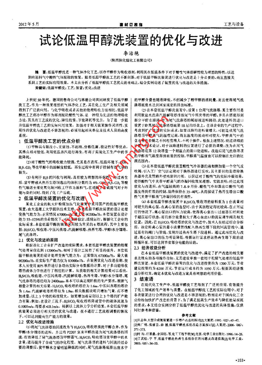 2012年5月建時日裝飾工藝與設(shè)備試論低溫甲醇洗裝置的優(yōu)化與改進李治艷(陜西陜化煤化工有限公司)摘要:低溫甲醇洗是一種氣體凈化 T藝,以冷甲醇作為吸收溶劑,利用其在低溫條件下對于酸生氣體溶解性較為理想的特性,以達(dá)到將原料氣中酸性氣體脫除的效果。隨著低溫甲醇洗工藝的不斷創(chuàng)新.對于低溫甲醇洗裝置進行優(yōu)化與改進是1分必要的,而且直接關(guān)系到⊥藝的實際應(yīng)用效果。木文在分析了低溫甲醇洗I藝優(yōu)點的塔礎(chǔ)上,結(jié)合實例論述了裝置優(yōu)化與改進的具體措施。關(guān)鍵詞:低溫甲醇沈:工藝:裝置:優(yōu)化:改進上世紀(jì)50年代,德國的魯奇公司與林德公司共同研發(fā)了低溫甲醇|的甲醇含 量也隨著降低,不但減少了精甲醇的消耗量,而且使得尾氣洗洗工藝,作為一種效果理想的氣體凈化工藝,其在化工生產(chǎn)及相關(guān)領(lǐng)城|滌塔底廢 水達(dá)到國家規(guī)定的排放標(biāo)準(zhǔn)。得到了廣泛的成用。與化學(xué)吸收或者其他的物理吸收方法相比,低澀甲(2)在本套低溫甲醇洗裝置中,設(shè)置1臺尾氣洗絳塔,其主要作用是醇洗工藝將冷甲醇作為溶劑脫除酸性氣體,是種較為先進的物理吸收|利用脫 鹽水洗滌汽提解吸塔排放尾氣中所交帶的甲醇,#月在塔底得到方法,其具有工I藝流程優(yōu)化、降低投資、節(jié)能洚耗等優(yōu)點。為了進步提部分 申醇水溶液,作為尾氣洗滌塔的稀溶液進料路徑,此處進料的進口升低溫中郎洗工藝的實際應(yīng)用效果,加強對于相關(guān)裝翼操作靈活性、實設(shè)置 f跑離尾弋洗滌塔塔底第18 層的塔盤上。在該企業(yè)的生產(chǎn)過程中,用性的優(yōu)化與改進是不容忽視的,必須引起相關(guān)單位及技術(shù)人員的幽度考慮到擴產(chǎn) 改造的實際需米。如果該路的進料最增大,叮能造成尾氣洗滌塔項甲醉燕氣的溫度過高,而且溫度的波動相對較大,甲醇蒸氣中的1低溫甲醇洗工藝的優(yōu)點分析含水量也會隨之不同程度增大,不利于操作。根據(jù)上述情況,經(jīng)過詳細(xì)的(1)甲醇具有點度小無廣蝕、不起泡、價格低廉、穩(wěn)定性好等優(yōu)點,計算與技術(shù)論證,對于該路進料的位置進行了必要的調(diào)繁:改為在尾氣其沸點相對較低,利用低壓惠汽進行再生,有利F實現(xiàn)化工生產(chǎn)中的節(jié)洗燒塔底第 12塊塔盤一個劉溫點的接I處進料。改道后展飛洗滌塔項能降耗。的甲醇然氣溫度得到有效的控制,甲醇蒸氣溫度也可以控制在允許的比(2)對于酸性氣的吸收能力較強,尤其是在高壓、低溫環(huán)境下.cos.HS.CO,等在甲醇中的溶解度較低,再生過程中有利于控制有效氣體的(3)在本套低溫甲醇洗裝置酸性氣冷卻器的液相側(cè)加裝-一個空氣反損失。吹閥,引入工^空氣以定期對于換熱器進行反吹。其主要H的足清除換(3)有利于ns的同收與利用,具有較為理想的環(huán)保性。經(jīng)過再生熱器外充及臂路外壁殘留 的污垢,以你證對于酸性氣的實際冷凝效果,后,富甲醇波從熱再生塔頂逸出的體積分?jǐn)?shù)約為4%.COs.HS.CO2等酸使得酸性 氣中夾帶甲醇蒸氣的冷凝回收效果理想。實踐表明:經(jīng)過此項性氣輸送全催化氧化硫回收工序作為原料氣,在消除了含硫廢氣對于環(huán)優(yōu)化與改進后. 在氣溢較高的7.8.9 H份.酸性氣冷卻器出口酸性氣的境污染的同時。得到了化[.產(chǎn)品硫。溫度得到有效的控制.始終保持在35-40,從而保證了熱再生塔出酸2低溫甲醇洗裝置的優(yōu)化與改進性氣夾帶甲醇熊氣冷凝回收的有效性。某化. I企業(yè)的航大爐粉煤加壓氣化裝黨中采用國產(chǎn)的低溫甲醇洗(4)本套低溫甲醇洗裝置中HSICO2吸收塔的給料泵為1臺流最相裝置,由大連理I大學(xué)提供技術(shù)支持。本奩低溫甲醉洗裝置的設(shè)計處理對較大的離心泵,在離心泵的選型時,由于其揚程定得比較高,在正常運變換氣能力為:正常情況6000m/h最大值90200m'h,本套裝置在設(shè)計行的情況下.離心泵出口的壓力較商.使得離心架出口過濾器長時間處能力S5~125%的負(fù)荷情況下,可以保持穩(wěn)定、連續(xù)運行。根據(jù)化I企業(yè)的于超壓運行狀態(tài),而幾部分能量損失于離心泉出u的流鼠調(diào)節(jié)閥及相關(guān)實際需求。本犯低溫甲醇洗裝置采用較為常見的6塔流稱,其中主復(fù)包位置。因此,在IsCO,吸收塔的優(yōu)化與改進中,技術(shù)人員經(jīng)過綜合分析括:HS/CO,吸收塔、中壓內(nèi)蒸塔、汽提解吸塔熱再生塔、甲醇/水分館塔、后,決定將離心泵的最小流量管線配入熱冉生塔下段的問流管線中,通過原有的閥門與管線,實現(xiàn)經(jīng)過熱冉生塔F段進料。通過此項優(yōu)化與改尾氣洗滌塔。進,離心泵出口的壓力明顯降低,根據(jù)運行需求停運熱冉生塔下段的進2.1優(yōu)化與改進的原因根據(jù)該化工企業(yè)擴產(chǎn)改造的實際需求,本衰低溫甲醉洗裝置的粗煤料循環(huán)泵,可以達(dá)到節(jié)省部分電能的目的。氣處理民應(yīng)達(dá)到1000mn.柑對于設(shè)計工況有了明顯的提升。本套低2.3經(jīng)濟效益分析溫甲醇洗裝置的設(shè)計處理變換氣能力為:正常情況67000m'h,最大值在本會低溫甲醇洗裝置的優(yōu)化與改進中,滿足了擴產(chǎn)改造的相關(guān)要90200m'h.而實際生產(chǎn)能力儀為83000m/h.在裝置優(yōu)化與改進前期,技求及現