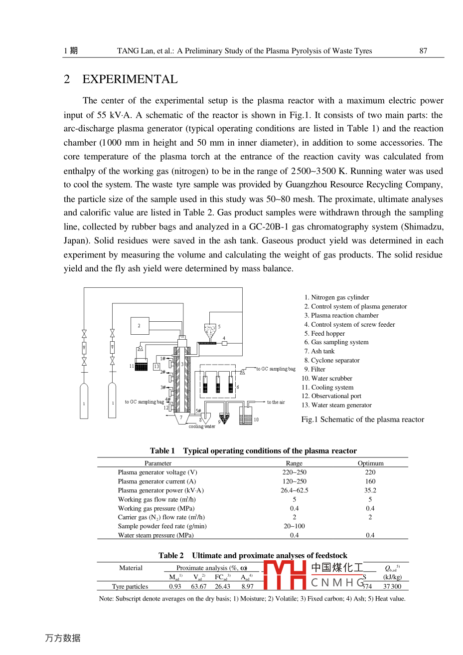 第3卷第1期過程工程學報VoL3 No.12003年2月The Chinese Jourmal of Process EngineeringFeb. 2003A Preliminary Study of the Plasma Pyrolysis of W aste TyresTANG Lan (唐蘭),HUANG Hai-tao (黃海濤),ZHAO Zeng-li (趙增立),WU Chuang- zhi (吳創(chuàng)之)(Guangzhou Institute of Energy Conversion,Chinese Academy of Sciences, Guangzhou, Guangdong 510070, China)Abstract: Thermal plasma pyrolysis of waste tyres for recovering energy was performed in a nitrogenplasma reactor. The main gaseous products were identified by chromatography as H, CO, CH, C2H2 andso on. From a series of experiments, the effects of the process parameters of thermal plasma pyrolysiswere investigated. Under our experimental conditions with steam injection, the total contents of H2 andCO reached up to 38.3% in the gas product, C2H2 up to 4%, and the maximum calorific value of thepyrolysis gas was 8.96 MJ/m'. The results indicate that plasma-assisted thermal decomposition of wastetyre particles may be a useful way for recovering energy and useful chemicals.Key words: thermal plasma; pyrolysis; waste tyres; waste recyclingCLC No: TQ352Document Code: AArticle ID: 1009 -606X(2003)01-0086-05INTRODUCTIONMotor vehicle tyres are nondurable goods, neither fusible nor soluble under normal conditionsand cannot be remoulded into other shapes without serious degradation. Common treatments suchas land illing or direct incineration (without recovery of value) not only waste the resources butalso increase the area of land with pollution. The increasing production of tyres has causedconsiderable disposal problem. To explore the real potential of waste tyres for possible material andenergy recovery, an efficient strategy should be found.Thermal treatment and resource recovery seem to be among the most advanced and significantdisposal methods. Pyrolysis has the potential of transforming solid wastes into useful recyclableproducts, but conventionally leads to a wide spectrum of pyrolysis products which are difficult to beseparated and utilized. Recently, attention has been paid to plasma -assisted pyrolysisl[1-3]. Thepyrolysis gas, having an appreciable calorific value, can be used for combustion; similar viewpointhas been reported by other authors; Chang et al!" used old tyres as the raw material for productionof syngas by thermal plasma pyrolysis, and the combustible heat value of the produced gas was 4~7MJ/m'. Compared with the conventional pyrolysis, plasma pyrolysis has a number of uniqueadvantages. For example, it provides a circumstance of high temperature and high energy forreaction, the reaction sample is heated up to a high temperature rapidly, and some reactions will takeplace which would not appear in conventional pyrolysis. It is an appropriate method for polymerpyrolysis. The main objective of the research work中國煤化工study the conversionand to characterize the gaseous product in N2 plasma:MYHCNMHG.Received date: 2002-08- 13, Accepted date: 2002- 10- 14Biography: Tang Lan (1977-), female, native of Guiyang city, Guizhou Province, majoring in heat energy engineering.1期TANG Lan, et al: A Preliminary Study of the Plasma Pyrolysis of W aste Tyres372 EXPERIMENTALThe center of the experimental setup is the plasma reactor with a maximum electric powerinput of 55 kV.A. A schematic of the reactor is shown in Fig.1. It consists of two main parts: thearc-discharge plasma generator (typical operating conditions are listed in Table 1) and the reactionchamber (1 000 mm in height and 50 mm in inner diameter), in addition to some accessories. Thecore temperature of the plasma torch at the entrance of the reaction cavity was calculated fromenthalpy of the working gas (nitrogen) to be in the range of 2500~3 500 K. Running water was usedto cool the system. The waste tyre sample was provided by Guangzhou Resource Recycling Company,the particle size of the sample used in this study was 50~80 mesh. The proximate, ultimate analysesand calorific value are listed in Table 2. Gas product samples were withdrawn through the samplingline, collected by rubber bags and analyzed in a GC-20B-1 gas chromatography system (Shimadzu,Japan). Solid residues were saved in the ash tank. Gaseous product yield was determined in eachexperiment by measuring the volume and calculating the weight of gas products. The solid residueyield and the fly ash yield were determined by mass balance.1. Nitrogen gas cylinder2. Control system of plasma generator3. Plasma reaction chamber4. Control system of screw feeder5. Feed hopper6. Gas sampling system7. Ash tank8. Cyclone separatorer ~uoCC amplingbag 9. Filter十十10. Water scrubber11. Cooling system12. Observational portto GC smpling bag.t tothe air13. Water steam generator10Fig.1 Schematic of the plasma reactorcooling waterTable 1 Typical operating conditions of the plasma reactorParameterRangeOptimumPlasma generator voltage (V)220-250220Plasma generator current (A)120-250160Plasma generator power (kVA)26.4-62.535.2Working gas flow rate (m/h)Working gas pressure (MPa)0.4Carrier gas (N2) flow rate (m/h)Sample powder feed ratle (g/min)20-100Water steam pressure (MPa)0.4 .Table 2 Ultimate and proximate analyses of feedstockMaterialProximate analysis (%,∞)中國煤化工__M.”V2 FC” A4(J/kg)Tyre particles0.93 63.67 26.43 8.97HCNMHG743730Note: Subscript denote averages on the dry basis; 1) Moisture; 2) Volatile; 3) Fixed carbon; 4) Ash; 5) Heat value.88過程工程學報3卷3 RESULTS AND DISCUSSION3.1 Product DistributionUnlike conventional pyrolysis, which has gaseous, liquid and solid products, waste tyreparticles are transformed only into gaseous and solid products in the process of thermal plasmapyrolysis. The key process parameters likely to affect the yields of product are power input, feedrate and steam injection, as illustrated in Figs.2 to 4.It can be seen from Figs.2 and 3 that due to the heat transfer and system energy, the yield of gasincreases as the input power is increased. From 30.8 to 48.4 k