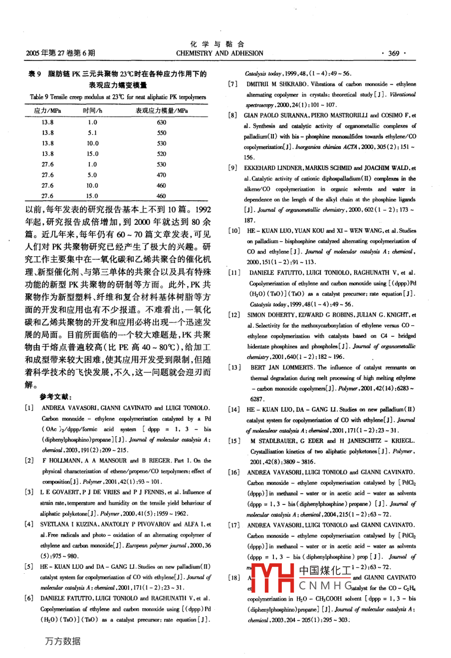 ●366張恩天等,聚酮的合成與性質(zhì)Vol.27. No.6,2005聚酮的合成與性質(zhì)張恩天',格.別洛夫”, 陳維君,李剛',石娜1(1.黑龍江省石油化學(xué)研究院,黑龍江哈爾濱150040;2. 俄羅斯科學(xué)院化學(xué)物理問(wèn)題研究所,莫斯科142432)摘要:介紹了以一氧化碳和乙烯為主要原料經(jīng)過(guò)催化共聚合,合成聚酮共聚物的方法以及聚酮共聚物的主要物理、化學(xué)性能。與結(jié)構(gòu)相似的聚乙烯相比,聚酮共聚物具有熔點(diǎn)高.黏附力強(qiáng).較好的光和生物降解性能等優(yōu)點(diǎn)??衫霉簿畚镏麈溕系聂驶男跃弁簿畚?制成功能高分子材料和具有光活性的高聚物。優(yōu)異的物理、化學(xué)性能和便宜的原材料來(lái)源使得聚酮共聚物的研究和應(yīng)用受到越來(lái)越多的關(guān)注。關(guān)鍵詞:聚酮;-氧化碳;乙烯;洽成;性能中圖分類號(hào):TQ 224.23文獻(xiàn)標(biāo)識(shí)碼:A文章編號(hào):100 - 0017(2005)06 - 0366 -04Synthesis Method and Properties of PolyketonesZHANC En- tian', C. Belor. CHEN Wei - jun', LI Geang' and SHI Na'(1. Heilongjiang Research Instiute of Petrochemistry, Harbin 150040, China;2. Intitue of Problers of Chemical Physics, RAS, 142432, Chemogoloka, Mosoo Region, Prospect Semenoa,1, Russia)Abstract: Using carbon monoxide and ethylene as raw materials , the synthesis methods and the phyical and chemical properties of polyketones (PK) wereintoduced in this paeper. Carparing with PE, PK copolymers had a lot of advanced propertie such的higher melting termperahure, better adhesion, the psibilityof photo- and bioderadation, the posibility of modifying the copolymerns on the carbonyl groups to prepare functional polymens and 8o on. The authors indicatedthet since the low cot for carbon monoxide and ethylene and the better properties, the inveigation and pplicaion of PK copolymers would be paid muchattention.Key words:polyketone; curbon monoxide; ethylene; aynthesis; property.學(xué)、物理性質(zhì)發(fā)生了很大變化。聚乙烯的性能具有前言許多不足之處,例如熔點(diǎn)較低(≤160C)表面黏附聚酮(Polyketone,簡(jiǎn)為PK) ,這里主要是指分子性差、光或生物降解能力差,而PK共聚物則具有熔主鏈?zhǔn)怯梢蚁┗汪驶湺谓M成的一類高聚物。從點(diǎn)較高 (200 ~ 260C)、較好的表面黏附性和較好的主鏈結(jié)構(gòu)的組成上看,PK共聚物可分為交替共聚物光或生物降解性能,可利用PK共聚物主鏈上的羰和無(wú)規(guī)共聚物兩類,系采用不同的催化劑和反應(yīng)條基改性PK共聚物,制成功能高分子材料和具有光件合成出來(lái)的。PK的合成工藝的研究,早在上個(gè)世活性的高聚物或制成聚螺旋狀縮酮( polyspiroketal)。紀(jì)50年代初即已開始,可通過(guò)乙烯和一氧化碳的自另外,由于PK共聚物的原料采用了價(jià)格便宜、來(lái)源由基共聚、輻照共聚基本流程和催化共聚三種方法充足的一氧化碳,使PK產(chǎn)品的價(jià)格比PE進(jìn)-步降制備。近年來(lái),研究較多的是催化共聚,在釩、鈦催低,為進(jìn)-一步市場(chǎng)開發(fā),創(chuàng)造了良好條件?;瘎┐呋饔孟碌臒o(wú)規(guī)共聚和在鈀催化劑催化作用鑒于PK共聚物具有一系列的優(yōu)點(diǎn),可以將其下的交替共聚。制成纖維、薄膜涂料、工程塑料,也可用作基體樹脂PK交替共聚物結(jié)構(gòu)式如下:制成復(fù)合材料,還可以作為制備其他類型功能高分- (CHCH2CO- CHCH2CO- CH2CH2C0- CH,CH2CO) -子材料的起始材料,其進(jìn)一步的開發(fā)必將具有良好PK無(wú)規(guī)共聚物結(jié)構(gòu)式如下:的經(jīng)濟(jì)效益和社會(huì)效益。- (CH2CH.CH.CHcO - CH.CH2CHCH.CH.CH2CH2CH2CO) -和分子主鏈主要為乙烯基鏈段的聚乙烯、聚丙1 PK共聚物的合成烯相比,由于PK共聚物的主鏈上嵌人了羰基,其化1.1中國(guó)煤化工YHCNMHG收稿日期:2005-05-08作者簡(jiǎn)介:張恩天(1941- ),男,北京市人,研究員,從事合成高分子結(jié)構(gòu)膠黏劑近40年.發(fā)表專業(yè)技術(shù)文獻(xiàn)30余篇.多次成果獲國(guó)家級(jí)省部級(jí)獎(jiǎng)勵(lì)?;瘜W(xué)與黏合2005年第27卷第6期CHEMISTRY AND ADHESION合成PK共聚物的原料主要有一氧化碳和乙以乙烯和一氧化碳交替共聚為例,其反應(yīng)條件烯。可和一氧化碳共聚的單體除了乙烯外還有丙為:聚合溫度40~ 100C,壓力1.0~ 10.0 MPa;反應(yīng)烯異丁烯、高級(jí)a-烯烴、環(huán)戊烯.4-乙烯基環(huán)已釜內(nèi)的漿料由溶劑和均相催化劑組成。溶劑主要為烯苯乙烯和取代苯乙烯。此外還可以采用的共聚甲醇、二氯乙烷、甲苯和少量的水;氣相的成份主要單體有甲基丙烯酸酯、w-十- -烯醇、5-己烯-1-是乙烯和一氧化碳還有少量催化劑、聚酮和--些其醇、3-丁烯-1-醇;w-十一烯酸.6-庚烯酸;己二他成份。烯-1,5、庚二烯-1,6、辛二烯- 1,7;降冰片二烯,乙烯和一氧化碳交替共聚合的基本流程示意圖雙環(huán)戊二烯等。見圖1。1.2合成 PK共聚物的催化劑科學(xué)家從1930年起就開始了乙烯和一氧化碳2 PK共聚物的性能催化共聚合的研究,已經(jīng)研制出--系列共聚合用的2.1PK共聚物中一氧化碳含量對(duì)共聚物熔點(diǎn)的催化劑。交替共聚和無(wú)規(guī)共聚采用的催化劑的種類影響是不一樣的。交替共聚一般采用鈀系催化劑;無(wú)規(guī)PK共聚物中一氧化碳含量對(duì)共聚物熔點(diǎn)的影共聚一般采用釩鈦或鋁系催化劑。各種催化劑、共響,總的來(lái)說(shuō)是--氧化碳含量越高,共聚物的熔點(diǎn)聚反應(yīng)條件和產(chǎn)率見表1