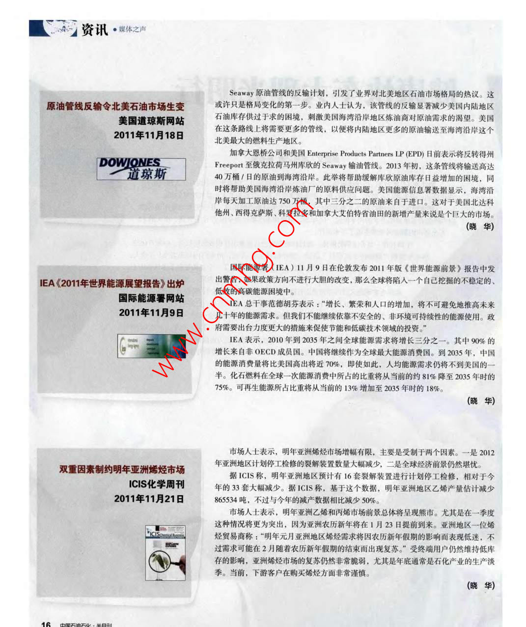 I0資訊●媒體之聲Seaway原油管線的反輸計(jì)劃,引發(fā)了業(yè)界對(duì)北美地區(qū)石油市場(chǎng)格局的熱議。這原油管線反輸令北美石油市場(chǎng)生變或許只是格局變化的第一步。業(yè)內(nèi)人士認(rèn)為,該管線的反輸顯著減少美國(guó)內(nèi)陸地區(qū)美國(guó)道瓊斯網(wǎng)站石油庫(kù)存供過(guò)于求的困境,刺激美國(guó)海灣沿岸地區(qū)煉油商對(duì)原油需求的渴望。美國(guó)2011年11月18日在這條路線上將需要更多的管線,以便將內(nèi)陸地區(qū)更多的原油輸送至海灣沿岸這個(gè)北美最大的燃料生產(chǎn)地區(qū)。加拿大恩橋公司和美國(guó)Enterprise Products Partners LP (EPD)日前表示將反轉(zhuǎn)得州DOWIONESFreeport 至俄克拉荷馬州庫(kù)欣的Seaway輸油管線。2013 年初,這條管線將輸送高達(dá)L道瓊斯40萬(wàn)桶1日的原油到海灣沿岸。此舉將幫助緩解庫(kù)欣原油庫(kù)存日益增加的困境,同時(shí)將幫助美國(guó)海灣沿岸煉油廠的原料供應(yīng)問(wèn)題。美國(guó)能源信息署數(shù)據(jù)顯示,海灣沿岸每天加工原油達(dá)750萬(wàn)桶,其中三分之二的原油來(lái)自于進(jìn)口。 這對(duì)于美國(guó)北達(dá)科他州、西得克薩斯、科羅拉多和加拿大艾伯特省油田的新增產(chǎn)量來(lái)說(shuō)是個(gè)巨大的市場(chǎng)。(曉華國(guó)際能源署(IEA) 11月9日在倫敦發(fā)布2011年版《世界能源前景》報(bào)告中發(fā)IEA《2011年世界能源展望報(bào)告》出爐出警告,如果政策方向不進(jìn)行大膽的改變,那么全球?qū)⑾萑胍粋€(gè)自己挖掘的不穩(wěn)定的、國(guó)際能源署網(wǎng)站低效的高碳能源困境中。IEA總干事范德胡芬表示:“增長(zhǎng)、繁榮和人口的增加,將不可避免地推高未來(lái)2011年11月9日幾十年的能源需求。但我們不能繼續(xù)依靠不安全的、非環(huán)境可持續(xù)性的能源使用。政府需要出臺(tái)力度更大的措施來(lái)促使節(jié)能和低碳技術(shù)領(lǐng)域的投資?!盜EA表示,2010年到2035年之間全球能源需求將增長(zhǎng)三分之一。其中90%的增長(zhǎng)來(lái)自非OECD成員國(guó)。中國(guó)將繼續(xù)作為全球最大能源消費(fèi)國(guó)。到2035年,中國(guó)的能源消費(fèi)量將比美國(guó)高出將近70%,即使如此,人均能源需求仍將不到美國(guó)的一半。化石燃料在全球-次能源消費(fèi)中所占的比重將從當(dāng)前的約81%降至2035年時(shí)的75%??稍偕茉此急戎貙漠?dāng)前的13%增加至2035年時(shí)的18%。(曉華)市場(chǎng)人士表示,明年亞洲烯烴市場(chǎng)增幅有限,主要是受制于兩個(gè)因素。-是2012雙重因素制約明年亞洲烯烴市場(chǎng)年亞洲地區(qū)計(jì)劃停工檢修的裂解裝置數(shù)量大幅減少,二是全球經(jīng)濟(jì)前景仍然堪憂。據(jù)1CIS稱,明年亞洲地區(qū)預(yù)計(jì)有16套裂解裝置進(jìn)行計(jì)劃停工檢修,相對(duì)于今ICIS化學(xué)周刊年的33套大幅減少。據(jù)ICIS稱,基于這個(gè)數(shù)據(jù),明年亞洲地區(qū)乙烯產(chǎn)量估計(jì)減少2011年11月21日865534噸,不過(guò)與今年的減產(chǎn)數(shù)據(jù)相比減少50%。市場(chǎng)人士表示,明年亞洲乙烯和丙烯市場(chǎng)前景總體將呈現(xiàn)熊市。尤其是在一-季度這種情況將更為突出,因?yàn)閬喼揶r(nóng)歷新年將在I月23日提前到來(lái)。亞洲地區(qū)-位烯烴貿(mào)易商稱:“明年元月亞洲地區(qū)烯烴需求將因農(nóng)歷新年假期的影響而表現(xiàn)低迷,不過(guò)需求可能在2月隨著農(nóng)歷新年假期的結(jié)束而出現(xiàn)復(fù)蘇?!笔芙K端用戶仍然維持低庫(kù)存的影響,亞洲烯烴市場(chǎng)的復(fù)蘇仍然非常脆弱,尤其是年底通常是石化產(chǎn)業(yè)的生產(chǎn)淡季。當(dāng)前,下游客戶在購(gòu)買(mǎi)烯烴方面非常謹(jǐn)慎。