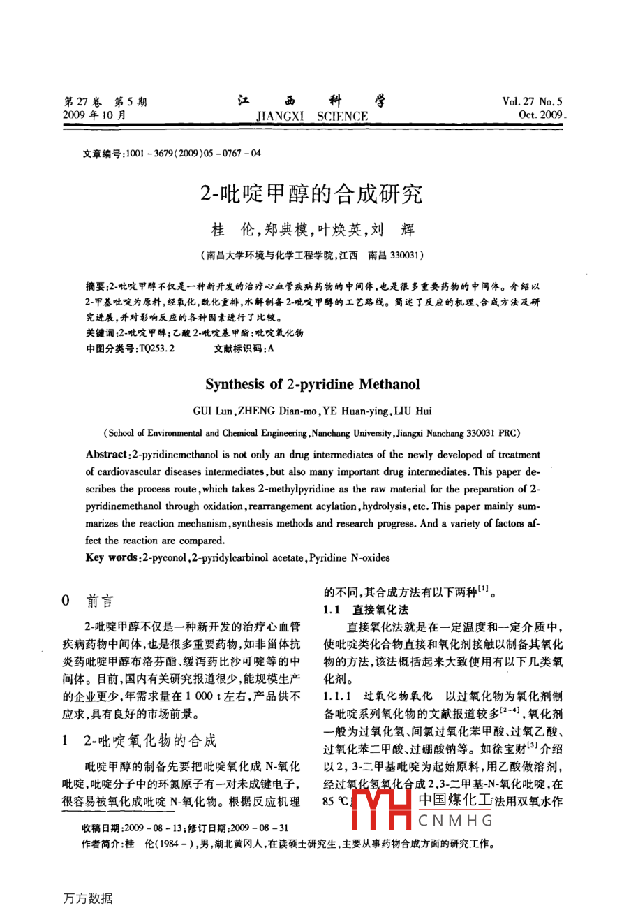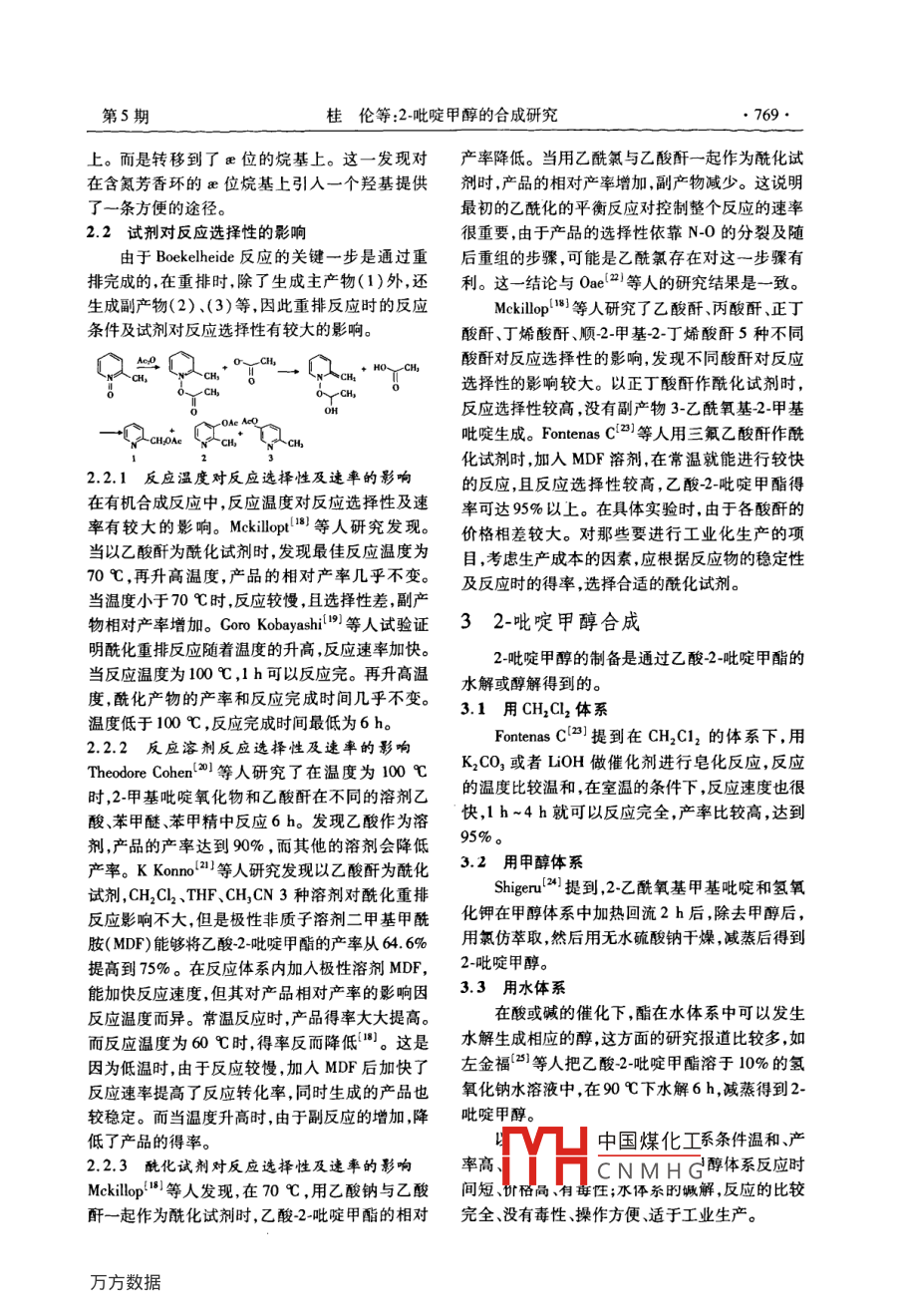 第27卷第5期江西科學Vol. 27 No 52009年10月JIANGXI SCIENCEOct.2009文章編號:1001-3679(2009)05-0767-042-吡啶甲醇的合成研究桂倫,鄭典模,葉煥英,劉輝(南昌大學環(huán)境與化學工程學院江西南昌330031)摘要:2-吡啶甲酵不僅是一種新開發(fā)的治療心血管疾病藥物的中間體,也是很多重要藥物的中間體。介紹以2-甲基吡啶為原料,經(jīng)氧化,?;嘏?水解制備2-吡啶甲醇的工藝路線。簡迷了反應的機理、合威方法及研究進展,開對彩響反應的各種因素進行了比較。關(guān)鍵詞:2-吡啶甲醇;乙酸2吡啶基甲酯;吡啶氧化物中圖分類號:TQ253.2文獻標識碼:ASynthesis of 2-pyridine MethanolGUI Lun, ZHENG Dian-mo, YE Huan-ying, LIU Hui(School of Environmental and Chemical Engineering, Nanchang University, Jiangxi Nanchang 330031 PRC)of cardiovascular diseases intermediates, but also many important drug intermediates. This papeo?Abstract: 2-pyridinemethanol is not only an drug intermediates of the newly developed of treatmescribes the process route, which takes 2-methylpyridine as the raw material for the preparation of 2-pyridinemethanol through oxidation, rearrangement acylation, hydrolysis, etc. This paper mainly sum-marizes the reaction mechanism, synthesis methodsand reseanAnd a varietyfect the reaction are comparedKey words: 2-pyconol, 2-pyridylcarbinol acetate, Pyridine N-oxides0前言的不同,其合成方法有以下兩種1.1直接氧化法2吡啶甲醇不僅是一種新開發(fā)的治療心血管直接氧化法就是在一定溫度和一定介質(zhì)中,疾病藥物中間體,也是很多重要藥物,如非甾體抗使吡啶類化合物直接和氧化劑接觸以制備其氧化炎藥吡啶甲醇布洛芬酯緩瀉藥比沙可啶等的中物的方法,該法概括起來大致使用有以下幾類氧間體。目前,國內(nèi)有關(guān)研究報道很少,能規(guī)模生產(chǎn)化劑。的企業(yè)更少,年需求量在1000t左右,產(chǎn)品供不1.1.1過氧化物氧化以過氧化物為氧化劑制應求,具有良好的市場前景。備吡啶系列氧化物的文獻報道較多2,氧化劑2-吡啶氧化物的合成一般為過氧化氫、間氯過氧化苯甲酸、過氧乙酸過氧化苯二甲酸、過硼酸鈉等。如徐寶財介紹吡啶甲醇的制備先要把吡啶氧化成N氧化以2,3-二甲基吡啶為起始原料,用乙酸做溶劑吡啶吡啶分子中的環(huán)氮原子有一對未成鍵電子,經(jīng)過氧化氫氧化合成23二甲基N·氧化吡啶,在很容易被氧化成吡啶N氧化物。根據(jù)反應機理85℃中國煤化工法用雙氧水作收稿日期:209-08-13;修訂日期:200-08-31CNMHG作者簡介:桂倫(1984-),男湖北黃岡人,在讀碩士研究生,主要從事藥物合成方面的研究工作。768江西科學2009年第27卷氧化劑,對環(huán)境污染小,且原子利用率較高。戰(zhàn)佩僅需4h;(2)同其他催化劑相比,濃硫酸/硫酸氫英等對此氧化反應進行了討論,認為此步反應鈉價格要低得多且容易獲得;(3)后續(xù)反應無需主要與加料順序有關(guān),應以醋酸、過氧化氫,吡啶分離即可進行,不會影響反應產(chǎn)物的性能。楊化合物排列為先后加料次序。切不可先加過氧化民介紹采用稀土雜多酸作為吡啶氧化催化劑氫否則產(chǎn)率明顯下降,分批加入過氧化氫對反應因雜多酸具有酸的性質(zhì),所以反應不需要加人大有利,但過氧化氫首次加入量不得少于1/2且濃量乙酸,也就不需要堿中和乙酸,更無需后處理用度不得低于30%。因為醋酸與過氧化氫反應部氯仿萃取N-氧化吡啶,而是直接減壓蒸餾出產(chǎn)分生成過氧乙酸再與吡啶化合物發(fā)生氧化反應。品,可大大節(jié)省生產(chǎn)成本,產(chǎn)率達到93%。此類方法最大優(yōu)點是工藝簡單,條件溫和。1.2.2錸化合物-雙三甲基硅過氧化物(BTSP)其缺點是:(1)作為介質(zhì)的冰醋酸用量大(一般為體系錸的化合物便宜易得,安全環(huán)保,催化范圍吡啶化合物用量的10倍-15倍)且在反應結(jié)束廣泛。以無機錸化合物如ReO3、Re2O,、 HOReo3時需加入大量的堿中和乙酸;(2)反應耗時太長等為催化劑,BTSP氧化吡啶化合物都能得到相應造成生產(chǎn)效率低下。過氧酸法解決了反應時間過的高產(chǎn)率的N氧化物(產(chǎn)率為90%~98%)。如長和作為介質(zhì)的冰醋酸需求量過大的缺陷,但卻 Christophe把2甲基吡啶(20mmol)、ReO3(1帶來新的問題:過氧酸的穩(wěn)定性差,難以儲存,市mol)和BTsP(6mL)加到10mL二氯甲烷中,反售產(chǎn)品量少,且濃度低。因此,直接氧化法一般只應24h,產(chǎn)率達到93%。此類反應中水的用量也有學術(shù)研究價值而無實際生產(chǎn)價值是至關(guān)重要的,過多或過少對反應都是不利的。1.1.2次氯酸鈉氧化法此方法只需一次性將這種制備吡啶N氧化物的方法是簡單而有效的吡啶、次氯酸鈉氫氧化鈉按比例投入到反應釜1.2.3釕化合物分子氧體系釕化合物是一種中,在100℃反應1.5h,收率為66%。原料簡單多功能的催化劑,并已用于烯烴環(huán)烷烴和醇的氧易得,反應時間短,是一種工藝簡單的制備方法,化,以釕化合物如 RuCl,.nH2O,RuCl2(PPh3)3,但收率較低。RuH2(CO)(PPh3)3作為催化劑,用氧氣可氧化吡1.1.3環(huán)己基二氧丙烷氧化法將吡啶溶于環(huán)啶系列化合物。如 Suman L'161把2甲基吡啶(10己烷中冷卻至-20℃再于攪拌條件下滴加環(huán)己mmol)和RuCl3·nH2O(5%mol)加人二氯甲烷基二氧丙烷和環(huán)己烷混合溶液,加完后繼續(xù)攪拌,(10mL)中,通入氧氣,在20℃下,反應6h,轉(zhuǎn)化約10min即到達反應終點。收率接近100%,該率達到94%。該方法工藝簡單,反應速率快,收方法收率高,反應速率快,但氧化劑價