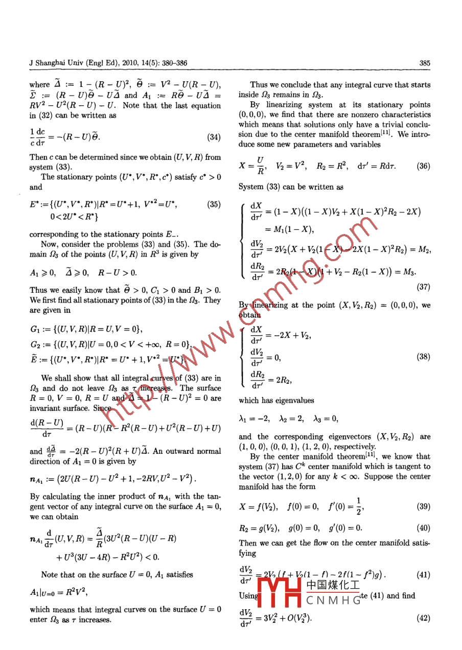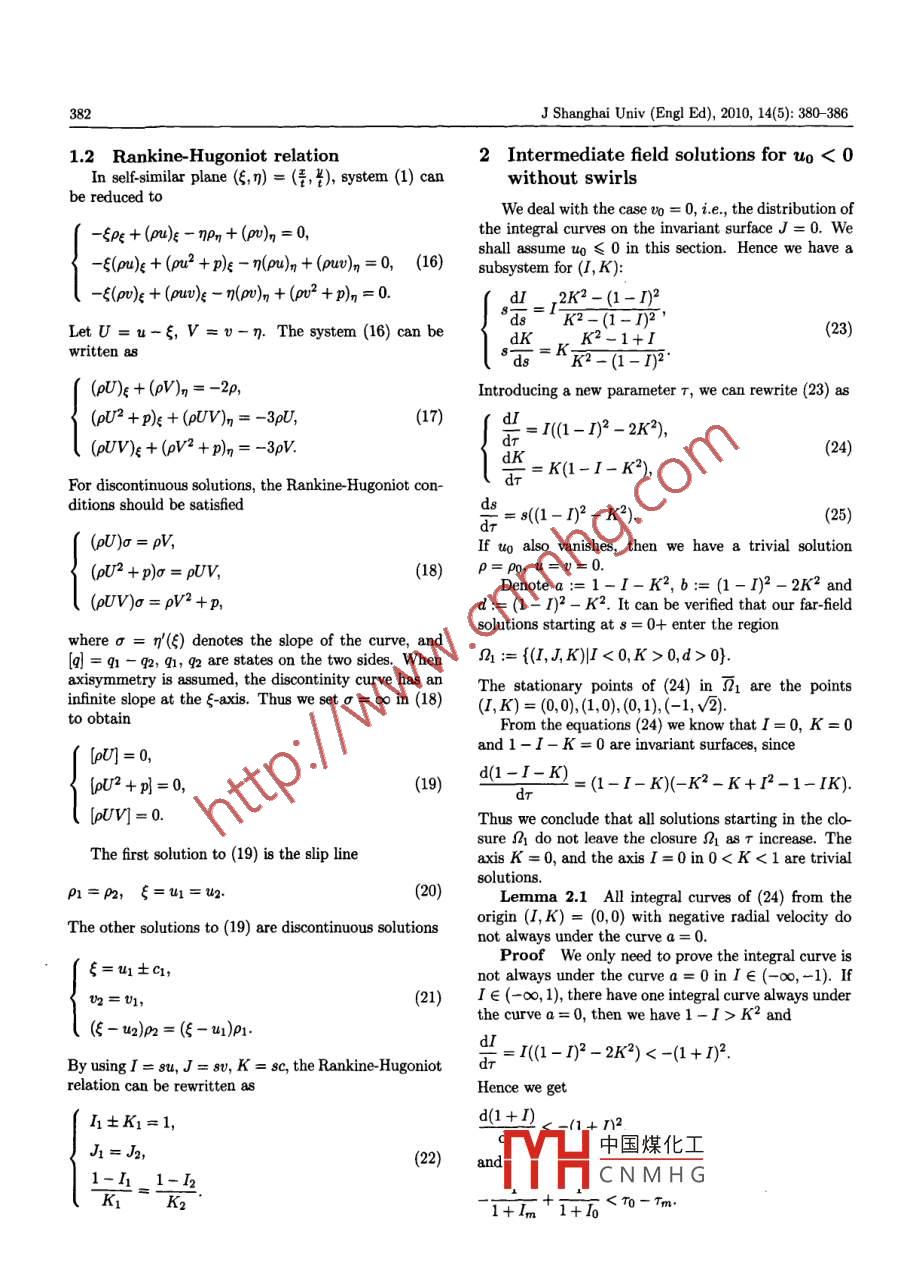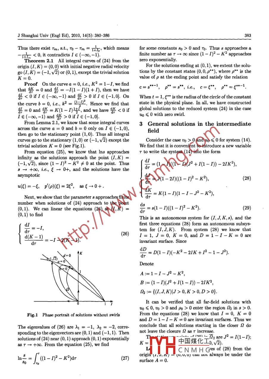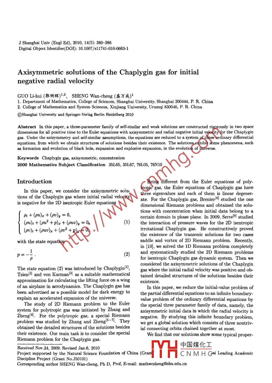 J Shanghai Univ(Engl Ed), 2010, 14(5): 380-386Digital Object Identifier( DoI): 10.1007/ s11741-010-0663Axisymmetric solutions of the Chaplygin gas for initialnegative radial velocityGUO Li-hui(郭俐輝)12, SHENG Wan-cheng(盛萬成)}1. Department of Mathematics, College of Sciences, Shanghai University, Shanghai 200444, P. R. China2. College of Mathematics and System Sciences, Xinjiang University, Urumqi 830046, P. R. China@Shanghai University and Springer-Verlag Berlin Heidelberg 2010Abstract In this paper, a three-parameter family of self-similar and weak solutions are constructed rigorously indimensions for all positive time to the euler equations with axisymmetric and radial negative initial velocity for thegas. Under the axisymmetry and self-similar assumptions, the equations are reduced to a system of three ordinary diequations, from which we obtain structures of solutions besides their existence. The solutions exhibit some phenomena, suchas formation and evolution of black hole, expansion and explosive expansion, in the evolution of universe.Keywords Chaplygin gas, axisymmetric, concentration2000 Mathematics Subject Classification 35L65, 35L67, 76L05, 76N10IntroductionBeing different from the Euler equations of polytiOnsh this paper, we consider the axisymmetric solu- tropic gas, the Euler equations of Chaplygin gas haveIs of the Chaplygin gas where initial radial velocitythree eigenvalues and each of them is linear degeneris negative for the 2D isentropic Euler equationsate. For the Chaplygin gas, Brenier studied the onedimensional Riemann problems and obtained the solu-tions with concentration when initial data belong to aPt+(puz+(ou)y=0,(pu)t+(pu+p)r+(puu)v=0,(1) certain domain in phase plane. In 2009, Serrel9)studied(p0)++(pu)x+(p2+p)y=0,irrotational Chaplygin gas. He constructivelythe existence of the transonic solutions for twowith the state equationsaddle and vortex of 2D Riemann problem. Recently,in(10, we solved the lD Riemann problem completely(2) and systematically studied the 2D Riemann problemsfor isentropic Chaplygin gas dynamic system. Then weThe state equation(2)was introduced by Chaplygin!)ric solutions of the ChaplygiTsien(2 and von Karman(3 as a suitable mathematicalgas where the initial radial velocity was positive and obtained detailed structures of the solutions besides theirexistenceof an airplane in aerodynamics. The Chaplygin gas hasIn this paper, we reduce the initial-value problem ofbeen advertised as a possible model for dark energy to the partial differential equations to an infinite boundaryexplain an accelerated expansion of the universe.value problem of the ordinary differential equations byThe study of 2D Riemann problem to the Euler the special three parameter family of data, namely, theystem for polytropic gas was initiated by Zhang andZheng 4. For the polytropic gas, a special Riemann negative. By studying this infinite boundary problemproblem was studied by Zhang and Zheng 5-7. They we get a global solution which consists of three nontriv-obtained the detailed structures of the solutions besides ial connecting orbits chained together at most.their existence. Our main task is to consider the specialWe find that our solutions show some typical properRiemann problem for the Chaplygin gasReceived Nov. 24. 2009: Revised Jan 6. 2010中國煤化工Project supported by the Natural Science Foundation of China(GraCNMHGai Leading AcademicDiscipline Project(Grant No. J50101)CorrespondingauthorSHENGWan-cheng,PhD,Prof,Email:mathwcsheng@shu.edu.cnhanghai Univ(Engl Ed), 2010, 14(5)ties: There appear discontinuities in the solutionsSince both(4)and initial data(7)remain invariant unsatisfy the Rankine-Hugoniot relations, and theder self-similar transformations, we look for self-similarof back discontinuities is less than that of frontsolutions(p, u, v)which only depend on 5=F. Thus,nuities. This portion of solutions exhibits some phenwe can get the following infinite boundary-value probena in the evolution of universe, such as explosive ex- lem for a system of ordinary differential equationspansion of universe. In addition the solutions with con- dp pe du 12 dvcentration exhibit the formation and evolution of black df54' ds 54' deon The paper is organized as follows: In Section 1, some (00 p, ,0)=(po, o, vo),luminaries are delivered including axisymmetry in-duction, far-field solutions, intermediate equations, and wherethe rankine-Hugoniot relations; The solutions without4:=a2-(u-5)2,6:=v2-u(5-u)swirls while uo <0 are shown in Section 2; In Sections3 and 4. the solutions in the intermediate field and the∑:=(-u)e-u△=2(6-u)-uc2,(10)inner-field solutions for uo <0 are shown respectively.c:=VP(p)=-1 Prreliminariesis the speed of soundWe impose axisymmetry to the system iin the presentIn this paper, the global solutions or their existenceaper, which means that solutions (u, v, p) satisfyare constructed or established for problems(8),(9 )withthe initial data satisfying po>0, u0 <0, Do E R. Sincep(t,r,)=p(t,r,0),the case vo <0 can be transformed by v--v to thecase vo>0, we can assume vo>0u(t, r, 0) cos 8 -sin/u(t, r,0)(3) 1.1 Far-field solutions and intermediatev(t,r,6)e cose/u(t, r, Ofield equationse introduce the variable s =4, the infinitefor allt>0, 8ER, and r>0, where(r, e)are the polar boundary-value problems(8), (9)can be written ascoordinates. Then, for the smooth solutions, system(1)can be written todpp(u(1-u)-82)ds92c2-(1-8u)2Pt+(pu)+du 8uc2-v2(1Pr Uds 92c2(11)dv0,(P, u, v)ls=0=(p0, uo, vo),where p =p(t,r,0),u=u(t, r, 0)and v =v(t, r, 0) which is well-posed and has a unique local solution forrepresent the radial velocities and the pure rotational any initial datum with po>0. Thus the problems(8)velocities in the flow, respectivelyWe consider Riemann problem(4)with the initial(9)has a local solution near E= +oo for any datumdata(Po, uo, vo)(p(0,r,6),u(0,r,6),v(0,r,6)5)I=8u,J=8,K(13)(p0(6),uo(6),to(6)using the state equation(2), system(11)can be rewrit-We