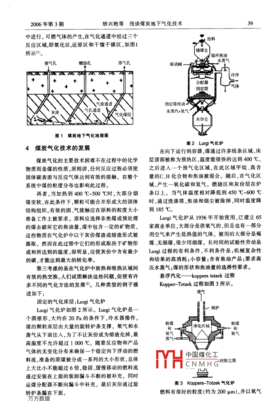 能源技術(shù)與管理2006年第3期淺談煤炭地下氣化技術(shù)矯興艷,齊慶杰,張大明(遼寧工程技術(shù)大學(xué)資源與環(huán)境工程學(xué)院,遼寧阜新123000)[摘要]綜述了煤炭地下氣化技術(shù)的國(guó)內(nèi)外發(fā)展現(xiàn)狀,介紹了煤炭地下氣化技術(shù)的多種方法。通過煤炭地下氣化技術(shù)對(duì)社會(huì)帶來經(jīng)濟(jì)及環(huán)境效益的評(píng)價(jià),闡明了煤炭地下氣化技術(shù)的綜合利用具有廣闊的發(fā)展前景[關(guān)鍵詞]地下氣化技術(shù);經(jīng)濟(jì);環(huán)境;評(píng)價(jià)[中圖分類號(hào)]TD844[文獻(xiàn)標(biāo)識(shí)碼]B[文章編號(hào)]16729943(2006)0300384031國(guó)外煤炭地下氣化技術(shù)果是摸清了氣體成份的變化規(guī)律。該氣化站所獲得氣體的平均成份變化如表2所示1前蘇聯(lián)是進(jìn)行地下氣化現(xiàn)場(chǎng)試驗(yàn)最早的國(guó)對(duì)于煤炭地下氣化技術(shù),在國(guó)外主要是俄羅家也是地下氣化工業(yè)應(yīng)用成功的唯一國(guó)家。南阿斯在應(yīng)用歐美等國(guó)在開發(fā)。美國(guó)的經(jīng)驗(yàn)指出,地賓斯克煤炭地下氣化站至今已試驗(yàn)和運(yùn)行了40a,下氣化與地面氣化生產(chǎn)相同下游產(chǎn)品相比,合成1955-1991年地下氣化站指標(biāo)如表1所示。前蘇氣的成本可下降43%,天然氣代用品的成本可下聯(lián)經(jīng)過長(zhǎng)期實(shí)踐揭示了煤炭地下氣化過程的規(guī)律降10%-18%,發(fā)電成本可下降27%;前蘇聯(lián)列寧性。氣體的熱值隨著煤層厚度降低而降低。過多格勒火力發(fā)電設(shè)計(jì)院公布的資料表明,地下氣化的地下水對(duì)煤炭地下氣化的效果是不利的。這一熱力電廠與燃煤電廠相比,廠房空間可減少點(diǎn)在2~9m厚的煤層中得到證實(shí)。南阿賓斯克煤50%,鍋爐金屬耗量可降低30%,運(yùn)行人數(shù)可減少炭地下氣化站在整個(gè)工業(yè)性試驗(yàn)期間的另一項(xiàng)成37%。地下氣化技術(shù)是十分具有誘惑力的。表11955~1991年南阿賓斯克地下氣化站指標(biāo)地下氣化區(qū)煤層厚度工業(yè)儲(chǔ)量氣化煤量產(chǎn)氣量氣體損失深度/m/1億m315433554821.38~9280.6551.6582761452210730069.810602南阿賓斯克煤炭地下氣化站煤氣成份氣體名稱CO2H2 CnHm CH,O2N2C0H5s含量/%120-15.312.1~16201-0.720400.2-0.25550-60.010.0-14.0001-0.06煤炭地下氣化技術(shù)提供更直接、更可靠的技術(shù)參2我國(guó)的煤炭氣化技術(shù)數(shù)中國(guó)煤化工項(xiàng)目成功的為11958-1962年我國(guó)先后在鶴崗、大同、皖南、萬戶沈北等許多礦區(qū)進(jìn)行過自然條件下煤炭地下氣化氣化CNMHG氣,實(shí)現(xiàn)了地下的試驗(yàn)取得了一定成果。目前我國(guó)許多礦區(qū)都在3煤炭地下氣化原理簡(jiǎn)介積極開展煤炭地下氣化工業(yè)。山西昔陽無煙煤地下氣化及年產(chǎn)6萬t合成氨項(xiàng)目已投入生產(chǎn),可為煤的氣化過程主要是在地下氣化爐氣化通道方數(shù)據(jù)2006年第3期矯興艷等淺談煤炭地下氣化技術(shù)中進(jìn)行??扇?xì)怏w的產(chǎn)生在氣化通道中經(jīng)過三個(gè)給料反應(yīng)區(qū)域即氧化區(qū),還原區(qū)和干餾干燥區(qū),如圖1所示。儲(chǔ)煤倉循環(huán)焦油排氣孔助孔水蒸氣驅(qū)動(dòng)閥冷淬分配器固定篩氣流通道固定篩傳動(dòng)L通道化煤層水蒸汽+氧氣灰份倉圖1煤炭地下氣化地理圖煤炭氣化技術(shù)的發(fā)展圖2Lurg氣化爐在向下運(yùn)行到容器,煤通過許多線條區(qū)域。床煤炭氣化的主要技術(shù)困難不在過程中的化學(xué)層頂部被稱為預(yù)熱區(qū),溫度能很快的達(dá)到400℃物質(zhì)而是煤的性質(zhì)。原則講,任何反應(yīng)過程必須使之后進(jìn)入一個(gè)預(yù)氣化區(qū)域,在此區(qū)域甲烷、高含固體碳表面與反應(yīng)氣體達(dá)到有效的接觸,在整個(gè)量的C、H化合物和焦油被混合。隨后,在氣化區(qū)系統(tǒng)中煤的粒度分布也影響此過程。域,產(chǎn)生一氧化碳和氫氣。燃燒區(qū)和灰份層在爐再者,當(dāng)加熱到400℃-500℃時(shí),大部分煙條以上。當(dāng)氣體溫度相對(duì)降低到40℃-60℃煤變軟,在此條件下,顆??赡芎喜⑿纬纱蟮墓腆w時(shí),通過洗滌塔,焦油和煙塵被除掉,同時(shí)溫度降結(jié)構(gòu)組織。有效的固氣接觸應(yīng)在原料的粒度大小到185℃準(zhǔn)備工作上被要求。原料應(yīng)選擇非焦煤或預(yù)處理Lurgi氣化爐從1936年開始使用,已建立65的煤去破壞它的焦油量煤中包含一定的礦物質(zhì),家商業(yè)單位,大部分是供氧氣的,但是也有一部分這些物質(zhì)在氣化爐中以干灰份煤渣或熔渣形式被用空氣來產(chǎn)生低熱值的氣體。被用的大部分是褐提取。然而在此過程中它們的形成取決于礦物形煤、無煙煤,很少用煙煤。長(zhǎng)時(shí)間的試驗(yàn)性勞動(dòng)是成和所達(dá)到的溫度。很明顯,應(yīng)使灰份中含有最少Iu過程的有利條件,不利條件是:機(jī)械復(fù)雜性的碳,才能達(dá)到最大的轉(zhuǎn)化率。和結(jié)果的高消耗;小容量;含有焦油產(chǎn)品;要求高第三考慮的是在氣化爐中放熱和吸熱區(qū)域間壓水蒸氣;煤的形狀和焦油量的選擇性要求有效的熱交換。人們?cè)噲D解決這些問題,促使有許懸浮汽化— koppers totzek過程多不同的氣化方法的發(fā)展2。幾種類型的例子描Kopper-Totzek過程如圖3所示。述如下固定