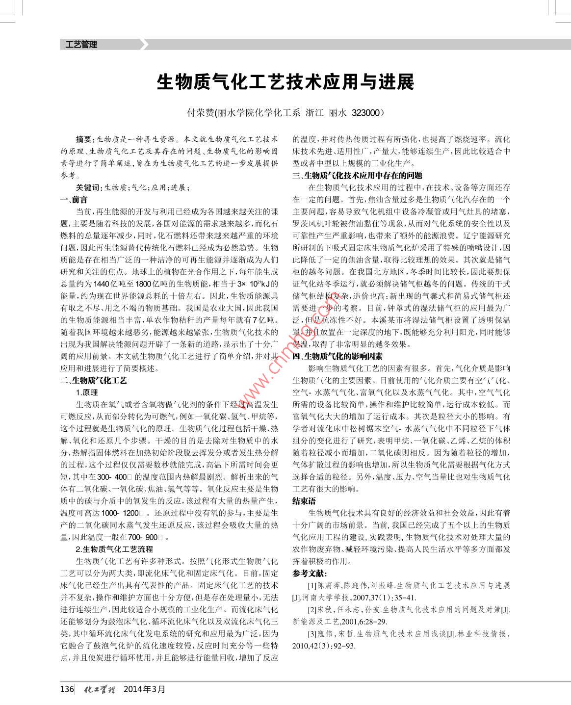 工藝管理生物質(zhì)氣化工藝技術(shù)應(yīng)用與進(jìn)展付榮贊(麗水學(xué)院化學(xué)化工系浙江麗水323000)摘要:生物質(zhì)是一種再生資源。本文就生物質(zhì)氣化工藝技術(shù)的溫度, 并對傳熱傳質(zhì)過程有所強(qiáng)化,也提高了燃燒速率。流化的原理、生物質(zhì)氣化工藝及其存在的問題、生物質(zhì)氣化的影響因床技術(shù) 先進(jìn)、適用性廣,產(chǎn)量大,能夠連續(xù)生產(chǎn),因此比較適合中素等進(jìn)行了簡單闡述,旨在為生物質(zhì)氣化工藝的進(jìn)一步發(fā)展提供型或者中型 以上規(guī)模的工業(yè)化生產(chǎn)。三生物質(zhì)氣化技術(shù)應(yīng)用中存在的問題關(guān)鍵詞:生物質(zhì);氣化;應(yīng)用;進(jìn)展;在生物質(zhì)氣化技術(shù)應(yīng)用的過程中,在技術(shù)、設(shè)備等方面還存一、前言在一一定的問題。首先,焦油含量過多是生物質(zhì)氣化汽存在的--個當(dāng)前,再生能源的開發(fā)與利用已經(jīng)成為各國越來越關(guān)注的課主 要問題,容易導(dǎo)致氣化機(jī)組中設(shè)備冷凝管或用氣灶具的堵塞,題,主要是隨著科技的發(fā)展,各國對能源的需求越來越多,而化石羅茨風(fēng)機(jī)葉輪被焦油黏住等現(xiàn)象,從而對氣化系統(tǒng)的安全性以及燃料的總量逐年減少,同時,化石燃料還帶來越來越嚴(yán)重的環(huán)境可靠性產(chǎn)生嚴(yán)重影響,也帶來了額外的能源浪費(fèi)。遼寧能源研究問題,因此再生能源替代傳統(tǒng)化石燃料已經(jīng)成為必然趨勢。生物所研 制的下吸式固定床生物質(zhì)氣化爐采用了特殊的噴嘴設(shè)計,因質(zhì)能是存在相當(dāng)廣泛的一種潔凈的可再生能源并逐漸成為人們此降低了一-定的焦油含量,取得比較理想的效果。其次就是儲氣研究和關(guān)注的焦點(diǎn)。地球上的植物在光合作用之下,每年能生成柜的越冬 問題。在我國北方地區(qū),冬季時間比較長,因此要想??偭考s為1440億噸至1800億噸的生物質(zhì)能,相當(dāng)于3x 10*kJ的證 氣化站冬季運(yùn)行,就必須解決儲氣柜越冬的問題。傳統(tǒng)的干式能量,約為現(xiàn)在世界能源總耗的十倍左右。因此,生物質(zhì)能源具儲氣柜結(jié)構(gòu)復(fù)雜,造價也高:新出現(xiàn)的氣囊式和簡易式儲氣柜還有取之不盡、用之不竭的物質(zhì)基礎(chǔ)。我國是農(nóng)業(yè)大國,因此我國需要進(jìn)一步的考察。目前,鐘罩式的濕法儲氣柜的應(yīng)用最為廣的生物質(zhì)能源相當(dāng)豐富,單農(nóng)作物秸稈的產(chǎn)量每年就有7億噸。泛,但是抗凍性不好。本溪某市將濕法儲氣柜設(shè)置了透明保溫隨著我國環(huán)境越來越惡劣,能源越來越緊張,生物質(zhì)氣化技術(shù)的罩,并且放置在一-定深度的地下,既能夠充分利用陽光,同時能夠出現(xiàn)為我國解決能源問題開辟了--條新的道路,顯示出了十分廣保溫,取得了非常明顯的越冬效果。闊的應(yīng)用前景。本文就生物質(zhì)氣化工藝進(jìn)行了簡單介紹,并對其四 、生物質(zhì)氣化的影響因素應(yīng)用和進(jìn)展進(jìn)行了簡要概述。影響生物質(zhì)氣化工藝的因素有很多。首先,氣化介質(zhì)是影響二、生物質(zhì)氣化工藝生物質(zhì)氣化的主要因素。目前使用的氣化介質(zhì)主要有空氣氣化、1.原理空氣-水蒸氣氣化、富氧氣化以及水蒸氣氣化。其中,空氣氣化生物質(zhì)在氧氣或者含氧物做氣化劑的條件下經(jīng)過高溫發(fā)生所需的設(shè)備比較簡單,操作和維護(hù)比較簡單,運(yùn)行成本較低。而可燃反應(yīng),從而部分轉(zhuǎn)化為可燃?xì)?例如- - 氧化碳、氫氣、甲烷等,富 氧氣化大大的增加了運(yùn)行成本。其次是粒徑大小的影響。有這個過程就是生物質(zhì)氣化的原理。生物質(zhì)氣化過程包括干燥、熱學(xué) 者對流化床中松樹鋸末空氣-水蒸氣氣化中不同粒徑下氣體解、氧化和還原幾個步驟。干燥的目的是去除對生物質(zhì)中的水組 分的變化進(jìn)行了研究,表明甲烷、一-氧化碳 、乙烯、乙烷的體積分,熱解指固體燃料在加熱初始階段脫去揮發(fā)分或者發(fā)生熱分解隨著粒徑減小而增加,二氧化碳則相反。因?yàn)殡S著粒徑的增加,的過程,這個過程僅僅需要數(shù)秒就能完成,高溫下所需時間會更氣體擴(kuò)散過程的影響也增加,所以生物質(zhì)氣化需要根據(jù)氣化方式短,其中在300- 400的溫度范圍內(nèi)熱解最劇烈。解析出來的氣選擇 合適的粒徑。另外, 溫度、壓力、空氣當(dāng)量比也對生物質(zhì)氣化體有二氧化碳、一-氧化碳、焦油、氫氣等等。氧化反應(yīng)主要是生物工 藝有很大的影響。質(zhì)中的碳與介質(zhì)中的氧發(fā)生的反應(yīng),該過程有大量的熱量產(chǎn)生,結(jié)束語溫度可高達(dá)1000- 12001。還原過程中沒有氧的參與,主要是生生 物質(zhì)氣化技術(shù)具有良好的經(jīng)濟(jì)效益和社會效益,因此有著產(chǎn)的二氧化碳同水蒸氣發(fā)生還原反應(yīng),該過程會吸收大量的熱十分廣闊的市場前景。當(dāng)前,我國已經(jīng)完成了五個以上的生物質(zhì)量,因此溫度一-般在700- 900氣化應(yīng)用工程的建設(shè),實(shí)踐表明,生物質(zhì)氣化技術(shù)對處理大量的2.生物質(zhì)氣化工藝流程農(nóng)作物廢棄物、減輕環(huán)境污染、提高人民生活水平等多方面都發(fā)生物質(zhì)氣