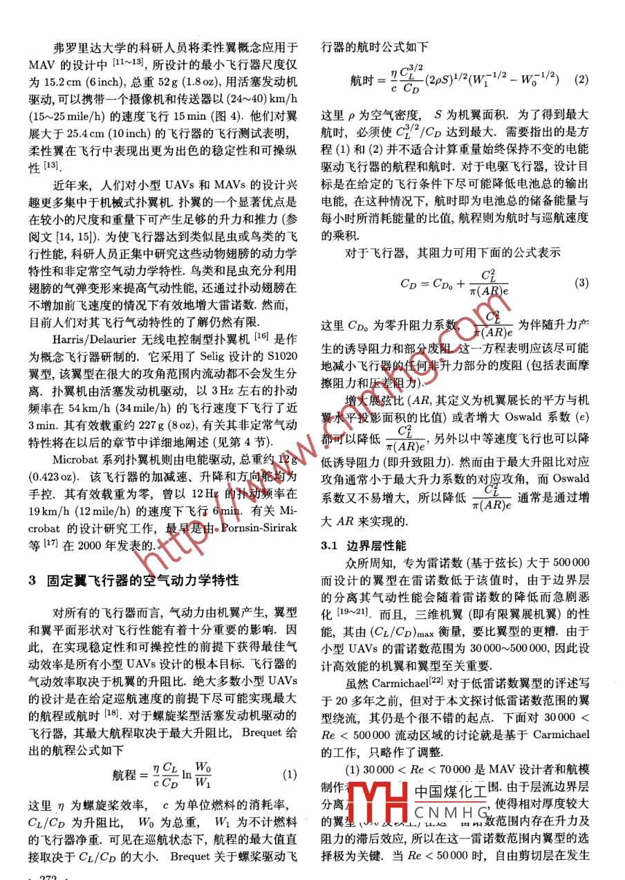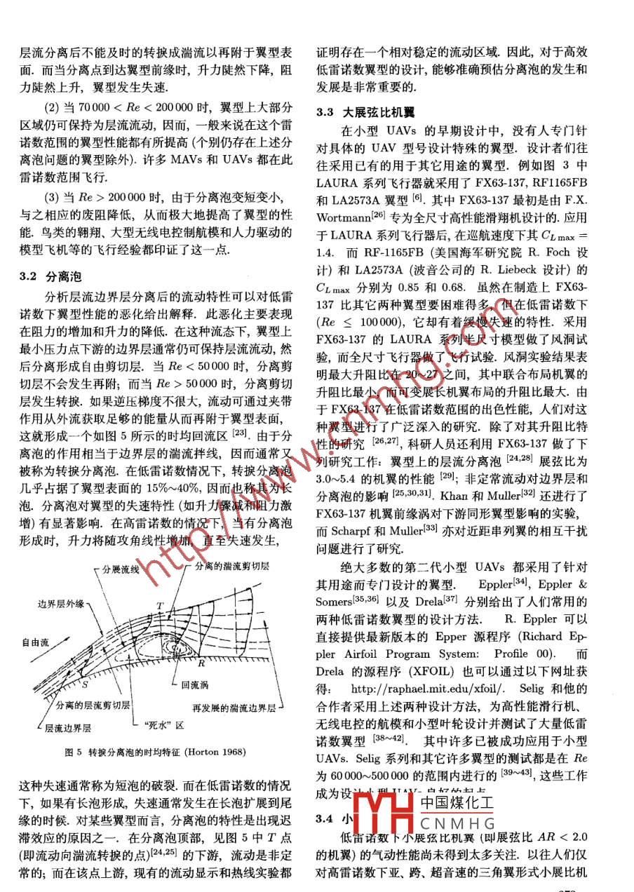 第34卷第2期力學(xué)進展Vol 34 No. 22004年5月ADVANCES IN MECHANICSMay25,2004小型飛行器空氣動力學(xué)omas J. Muller James D. Delaurier21Hessert Center for Aerospace Research, Department of Aerospace and Mechanical Engineering, University of Notre Dame, NotreDame, Indiana 46556: emailr 1@nd. edu2Institute for Aerospace Studies, University of Toronto, Downsview, Ontario, Canada M3H 5T6; email: jdd@utiasutoronto.ca摘要對小型飛行器設(shè)計中涉及的空氣動力學(xué)問題進行了綜述.描述了雷諾數(shù)和展弦比對固定翼飛行器的設(shè)計以及飛行性能的影響.在低雷諾數(shù)飛行范圍,翼型上邊界層的特性對飛行器的設(shè)計尤為關(guān)鍵.本文討論了大量有關(guān)層流邊界層(包括層流分離泡影響)的實驗,作為例子,列舉了幾個此飛行雷諾數(shù)范圍的小型低空無人駕駛飛行器(UAⅤs),此外,對撲動翼推進的理論模型進行了簡述;其范圍涵蓋了早期的準定常附著流模型,以及后來計及非定常尾渦、流動分離以及氣動彈性等效應(yīng)的模型.文中還介紹了那些與理論互補并最終導(dǎo)致?lián)湟頇C設(shè)計成功的實驗關(guān)鍵詞低雷諾數(shù),固定翼,撲翼,小型無人駕駛飛行器1引言限度的降低翼表面積對這類飛行器的封裝、攜帶和預(yù)發(fā)射操作也是非常重要的過去的25年中,小型無人駕駛飛行器(小型UAV)的設(shè)計和發(fā)展得到了越來越多的關(guān)注.其應(yīng)用包括偵察、通訊中繼鏈接、艦船誘餌及生化或者核被音737物質(zhì)探測等,無論遙控型還是自控型小型UAVs都極000CESSNA 180常包括:以2010m1(2~82ml)的速度長10小型U航時飛行;3~300m(10~1000f)的巡航高度;低自重以及全天候的飛行能力.人們對小型UAVs的定義并不十分嚴格,通常把展長小于6m(20f),質(zhì)量o Black widowO Microbat低于25kg(551b)的飛行器都歸為此類.另外,由于10-4足安近年來傳感器、攝像機以及控制硬件的微小型化,質(zhì)量低于80g(280z)且尺度小于15cm(6inch)的微雷諾數(shù)型飛行器(MAVs)業(yè)已研發(fā)成型,并能在一定程度上圖1飛行器質(zhì)量與雷諾數(shù)的關(guān)系執(zhí)行上述特殊任務(wù)低速和小尺度共同決定了小型飛行器的飛行雷盡管人們十分期望小型UAVs可以在強風(fēng)狀態(tài)諾數(shù)很低(1500050000基于機翼弦長的雷諾數(shù)下飛行,但迄今為止仍沒有見到探討該問題的文獻定義為巡航速度與弦長的乘積再除以空氣動力黏性事實上,若不包括撲翼飛行器的有關(guān)研究,則可以系數(shù)圖1為不同飛行器總重與雷諾數(shù)的對應(yīng)關(guān)系,說:與小型UAvs直接相關(guān)的非定常、低雷諾數(shù)氣從中可以看出小型UAV(包括MAVs)的飛行雷諾數(shù)動特性的定量研究是在近幾年才得到關(guān)注的.在范圍要遠低于傳統(tǒng)飛行器而更接近于鳥類和航模.許多情況下,由于產(chǎn)權(quán)問題,一些已經(jīng)完成的風(fēng)洞實這些飛行器所采用的低雷諾數(shù)翼型必須在惡劣環(huán)境驗并中國煤化工有很多有關(guān)翼型定常下仍能保持良好的氣動性能,且對于風(fēng)切變、陣風(fēng)以氣動UAVs的設(shè)計具有重及由降水引起的表面粗糙都不十分敏感.同時,最大要的CNMHG(NRL)一直是固定Annual Review Fluid Mechanics惠允版權(quán)翻譯此文( Published with kind permission from Annual Review Fluid Mechanicsc 2003 by Annual Reviews)270翼小型UAvs的設(shè)計先驅(qū),文中提到的許多飛行器裝備了全球定位系統(tǒng)(GPS),是一種全自控單人便攜皆引自他們發(fā)表的文獻.另外,也出現(xiàn)了不少與撲翼式UAV.設(shè)計要求這種電驅(qū)飛行器應(yīng)有適當(dāng)?shù)某叽鏤Avs有關(guān)的非定??諝鈩恿W(xué)方面的研究.在下面(以便于用標準儲物箱存放)、能攜帶不同的負載,并的章節(jié)中,我們將著重描述幾種成型的固定翼和撲翼以91km/h(56mle/l的巡航速度飛行近2h7.雖飛行器,同時介紹與這些飛行器的設(shè)計和性能有關(guān)的然這種飛行器已成功地飛行,但其輔助系統(tǒng)尚未研制流體力學(xué)問題完成圖4所展列的 Dragon Eye(又名空中傳感系統(tǒng))2小型UAVs和MAvs的范例具有幾項獨特的性能.這種小型UAv可以完全不用工具地組裝和拆卸,并能夠被放置在僅18cm×38cm圖2列出了圖1中所提到的小型UAVs和38cm(7inch×15inch×15inch)的箱子中,像背包MAs的翼展和質(zhì)量的對應(yīng)關(guān)系,其中既包括了固定樣隨身攜帶閃.這種自控型飛行器由單人操作,由翼又包括了撲翼飛行器.雖然在這一范圍還有許多其GPS導(dǎo)航. Dragon Eye系列也是由電能驅(qū)動,可以它種類的飛行器,但是由于資料的匱乏而未能一一列在64km/h(40mile/h)的速度下飛行(30~60)min出.圖2中尺寸最大的是 LAURA系列,這是一種專它還可以使用一些可互換的現(xiàn)存設(shè)備,如日間、低亮門用來作艦船誘餌的長航時小型UAVs26.圖3列度或者紅外線的成像系統(tǒng)和魯棒通訊連接裝置.目舉的4種 LAURA系列飛行器都具有相同的機身、前, Dragon Eye正由 Arro viroment公司和BAI有效載重、起落架和動力推進系統(tǒng),其推進系統(tǒng)由活 ecosystems公司生產(chǎn)塞發(fā)動機和位于機身尾部的推進螺旋槳組成.它們均為試驗機型,主要用于研究機翼的布局和低雷諾數(shù)翼型波音737CESSNA 1801Oo- R UAVs■LAURMAVs&10。0MITE 2Black widow質(zhì)量/kg圖2小型UAvs和MAVs的展長與質(zhì)量的對應(yīng)關(guān)系圖4近期小型固翼UAVs草圖圖4中的MITE2是MAV研發(fā)系列中專為近戰(zhàn)中